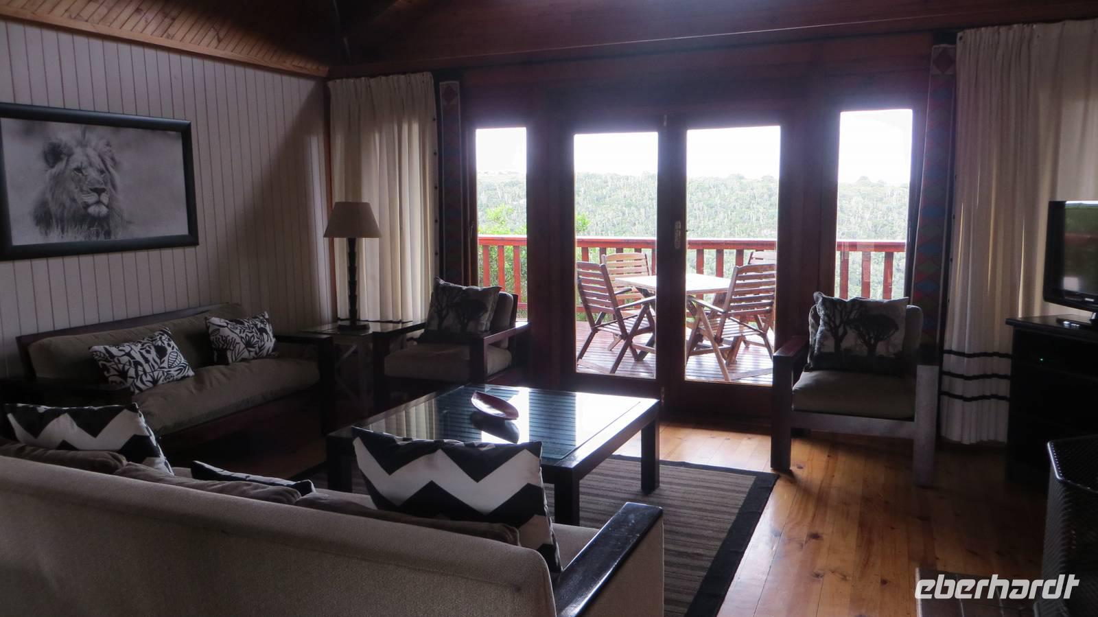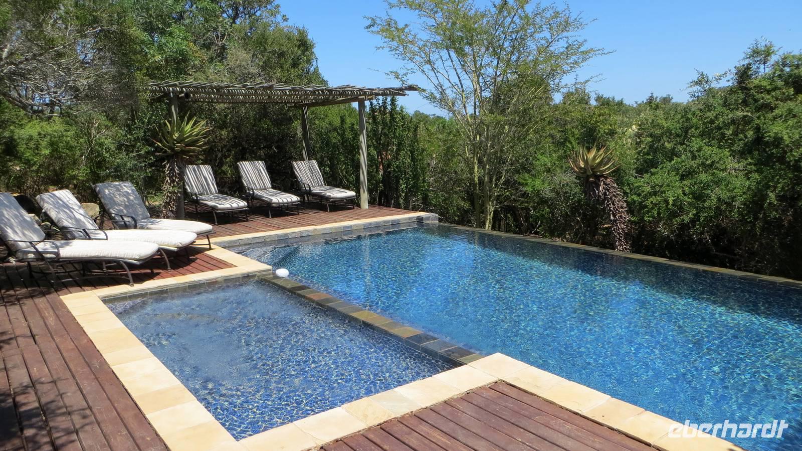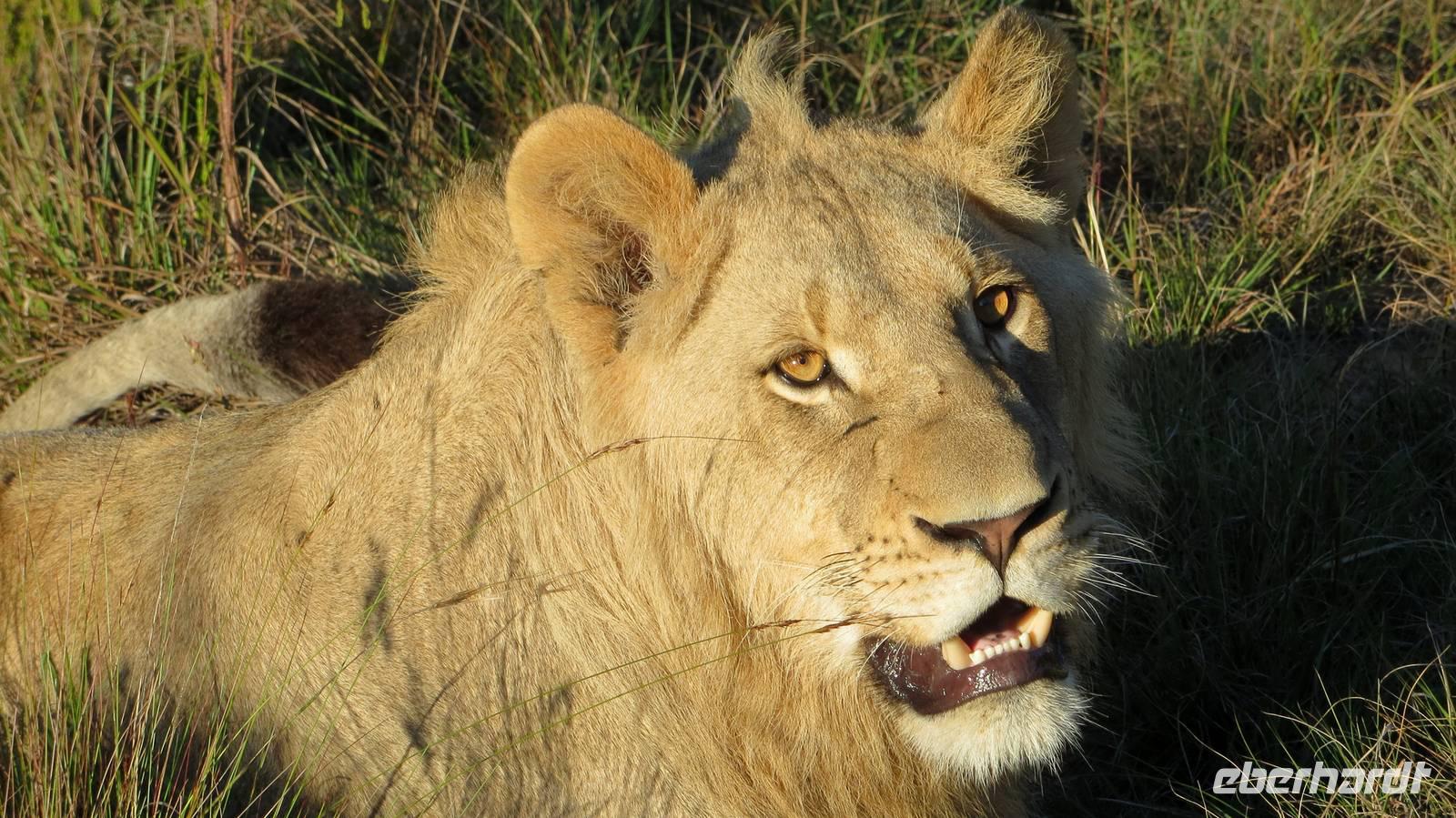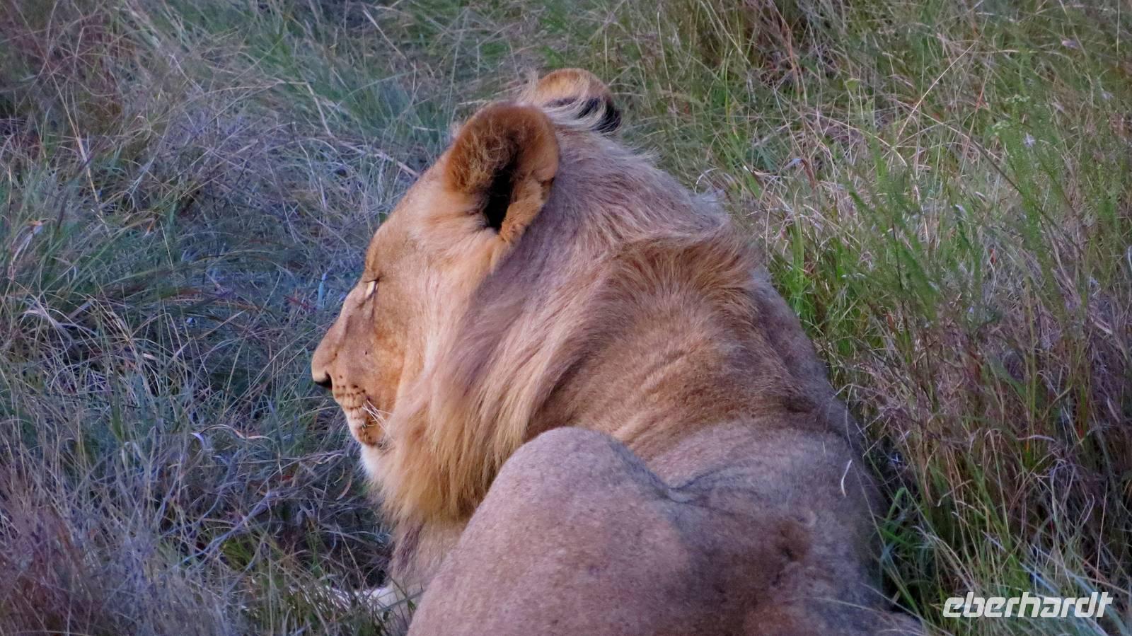 Schon früh am Morgen beginnen wir unsere Safari - heute geht es in das zweite Areal des Parks, wo es auch Löwen gibt! Augen auf... und siehe da, in der Ferne entdecken wir zwei Löwen! Wir fahren näher heran und können die beiden Geschwister beim Rumtollen beobachten. Die Großkatzen kommen ganz nah an den Jeep heran, so dass mir fast ein bisschen mulmig zumute wird. Es ist ein großartiges Erlebnis und wir sind voller Freude! Danach legen wir erstmal eine Kaffeepause ein und stärken uns mit leckeren Muffins. Das Glück ist auf unserer Seite, denn bald darauf sehen wir ein Breitmaulnashorn mit seinem Jungen... ein echtes Riesenbaby. Um die Nashörner vor Wilderern zu schützen, werden ihnen hier kontrolliert die Hörner abgesägt. Was zunächst grausam klingt, ist letztendlich nur zu deren Schutz. Das nächste Highlight lässt nicht lange auf sich warten und wir sehen zwei Elefanten, die aber so schnell verschwunden sind, wie sie aufgetaucht sind. Dafür erfreuen wir uns an den hübschen Impalas, ein paar Zebras und einer Leopardenschildkröte. Zum Abschluss der Pirsch zeigt sich noch ein Hippo in einem kleinen Teich nahe der Rezeption, so kann man sagen, dass wir eine ausgesprochen erfolgreiche Safari hatten! Vier der Big Five sind damit schon „im Kasten"! Nach dem Frühstück können wir die Annehmlichkeiten der wunderschönen Lodge genießen und einfach mal entspannen, bis es nach dem Mittagessen noch einmal auf die Pirsch geht.