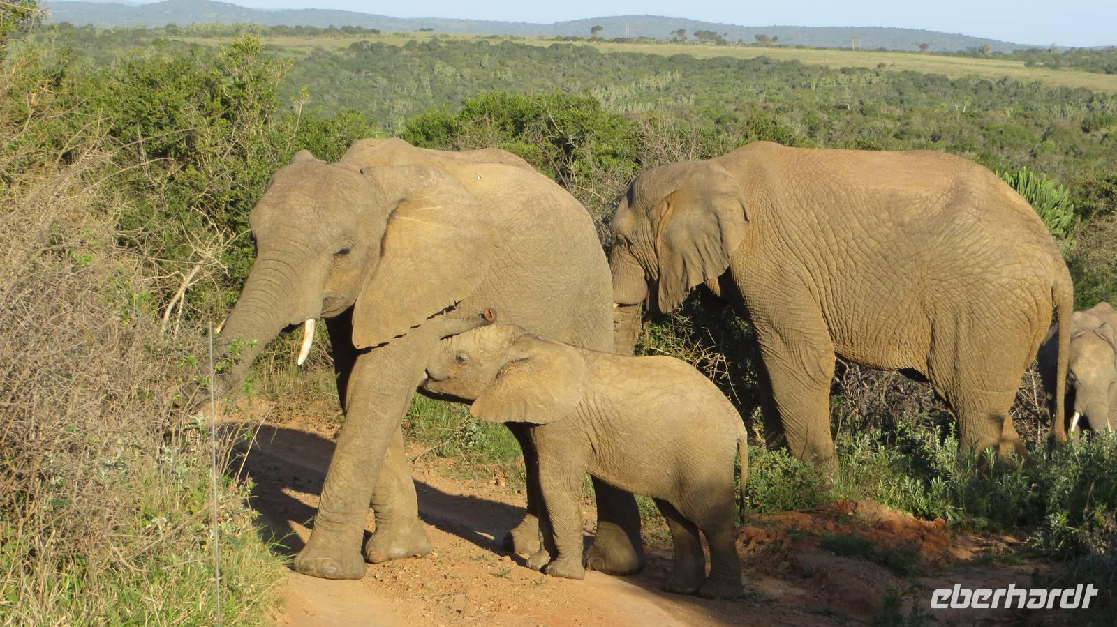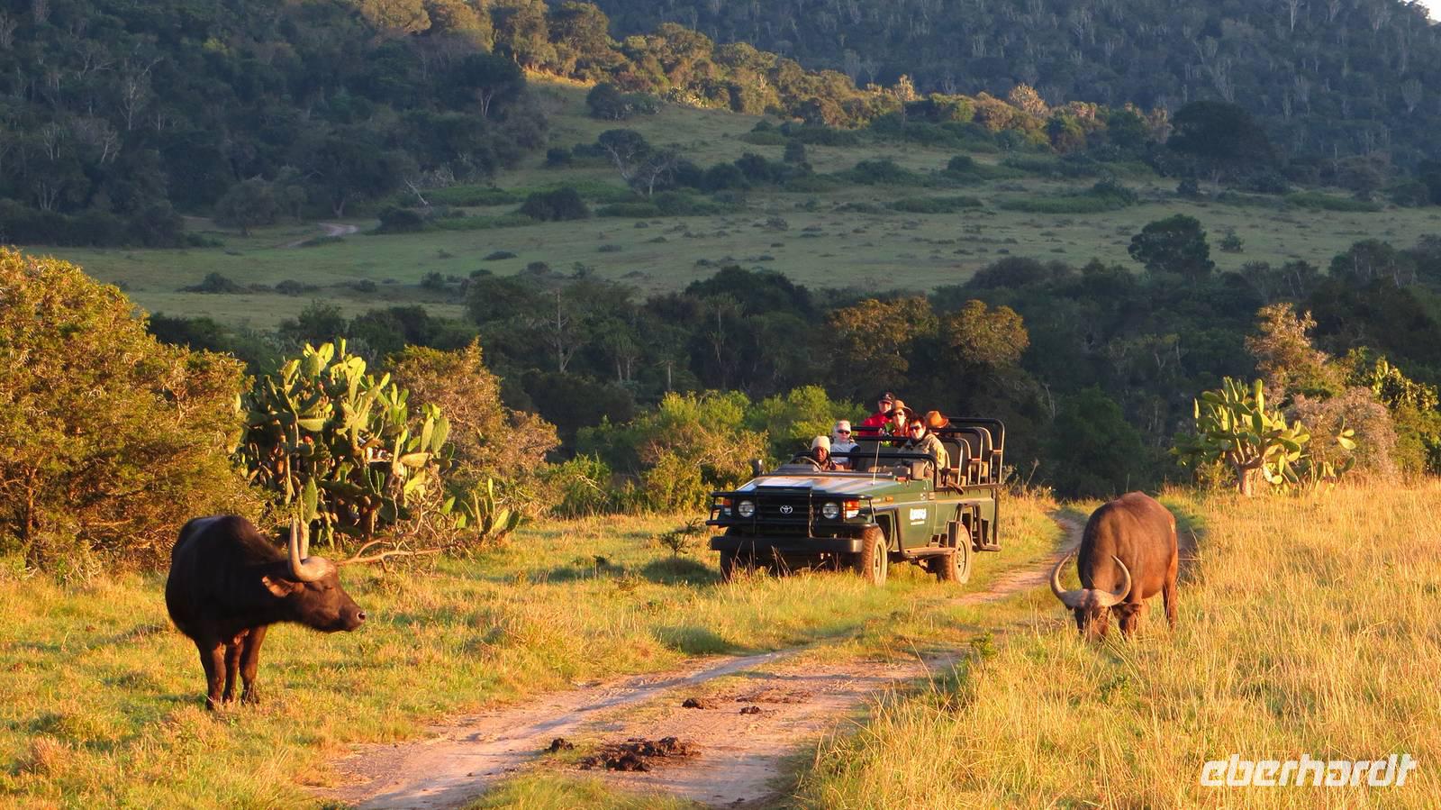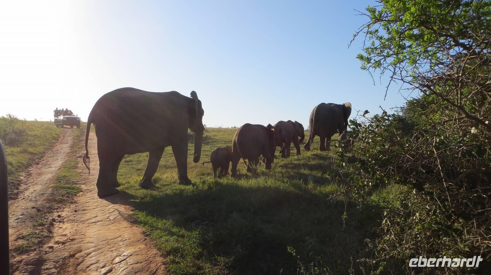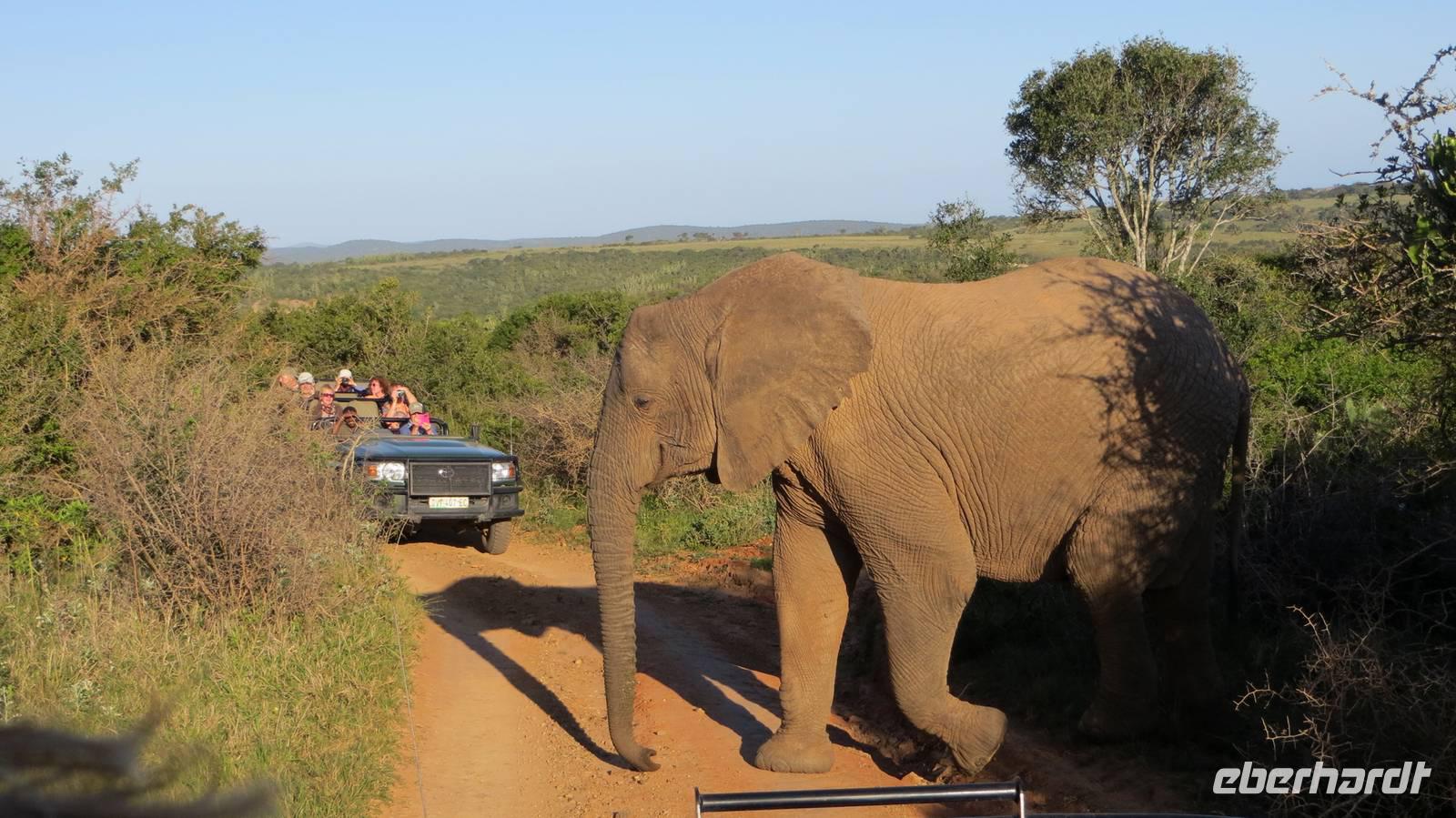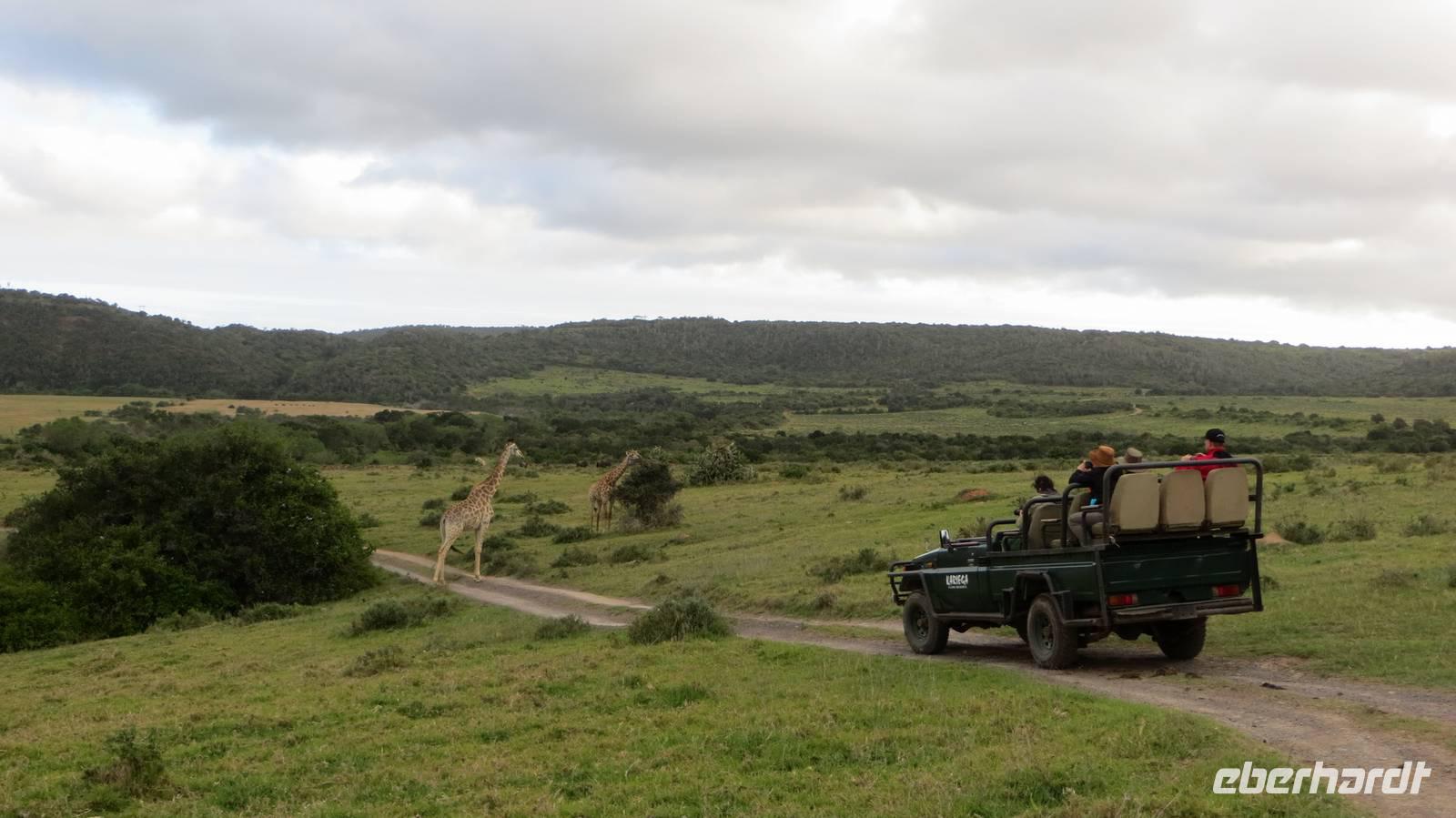 Wir lassen die Drakensberge hinter uns erreichen nach längerer Fahrt schließlich die Hafenstadt Durban. Am Flughafen verabschieden wir uns von unserer Reiseleiterin Michaela und fliegen weiter nach Port Elisabeth. Von hier reisen wir voller Vorfreude in den Kariega Wildpark, denn wir wollen ja endlich wilde Tiere beobachten! Schon am Eingang des Parks begrüßen uns Zebras und Impalas. Die Lodge liegt wunderbar eingebettet in die Natur. Nach einem leckeren Snack beziehen wir unsere gemütlichen Holz-Chalets, ein Ort zum Wohlfühlen mit typisch afrikanischem Flair! Nach kurzer Pause starten wir zu unserer ersten Safari. Mit zwei offenen Jeeps geht es in ein 5.000 Hektar großes Areal, wo wir Giraffen, Gnus, Zebras, Njalas, Buschböcke, Büffel und sogar Nashörner beobachten können. Wow, das ist Afrika, wie man es sich vorstellt! Als i-Tüpfelchen werden uns bei einem Halt noch kalte Getränke und Biltong gereicht - es könnte kaum schöner sein. Nach unserer Rückkehr schlemmen wir vom reichhaltigen Buffet und stoßen auf die fantastischen Erlebnisse an.