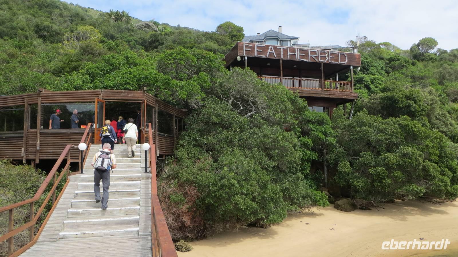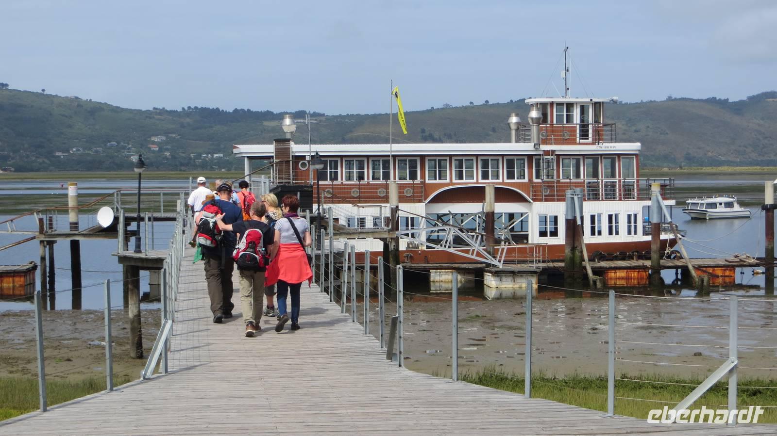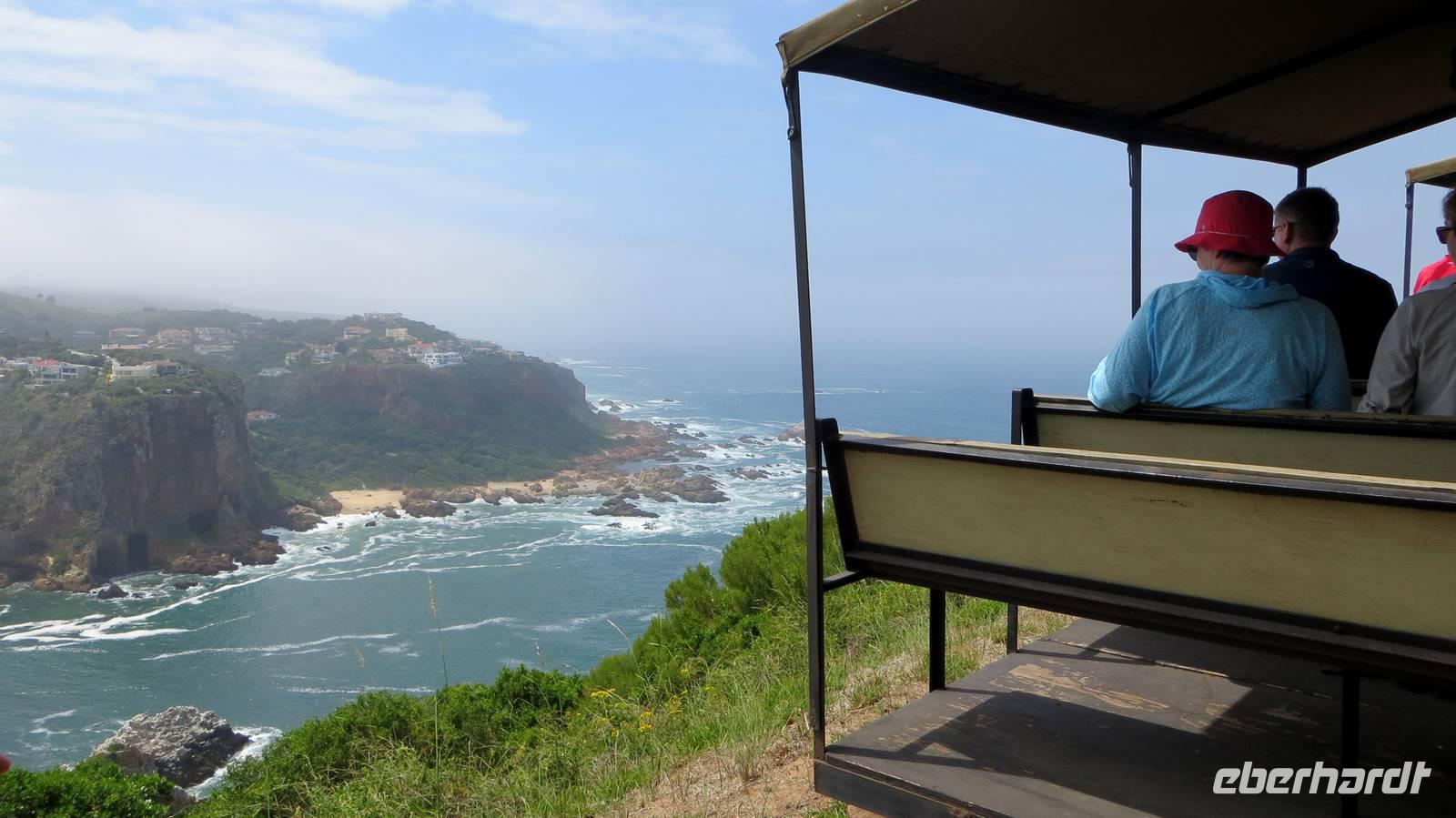 Nach einem guten Frühstück laufen wir zum Bootsanleger in Knysna, von hier legt am Vormittag das Schiff zum Featherbed Nature Reserve ab. Während der Überfahrt haben wir einen tollen Blick auf die Waterfront von Knysna, auf Leisure Island mit den schicken Villen und auf den östlichen und westlichen „Head". Am letzteren legen wir schließlich an und werden mit einem Truck auf den Gipfel gefahren. Hier bietet sich uns ein fantastischer Ausblick auf die wilde Küste und das Meer. Ich finde es immer wieder beeindruckend, wenn man nicht ausmachen kann, wo das Meer endet und der Himmel anfängt. Auf unserer Wanderung bergab bestaunen wir die abwechslungsreiche Flora und die herrlichen Ausblicke auf die Küste. Danach haben wir uns ein schmackhaftes Mittagessen verdient. Nach der Rückkehr zum „Festland" fahren wir zum Knysna Elephant Park. Hier kommen wir den sanften Dickhäutern ganz nah. Wir können sie füttern und anfassen und tolle Fotos machen. Den Abend lassen wir bei typisch afrikanischer Küche im "JJ's Restaurant" an der Waterfront ausklingen.