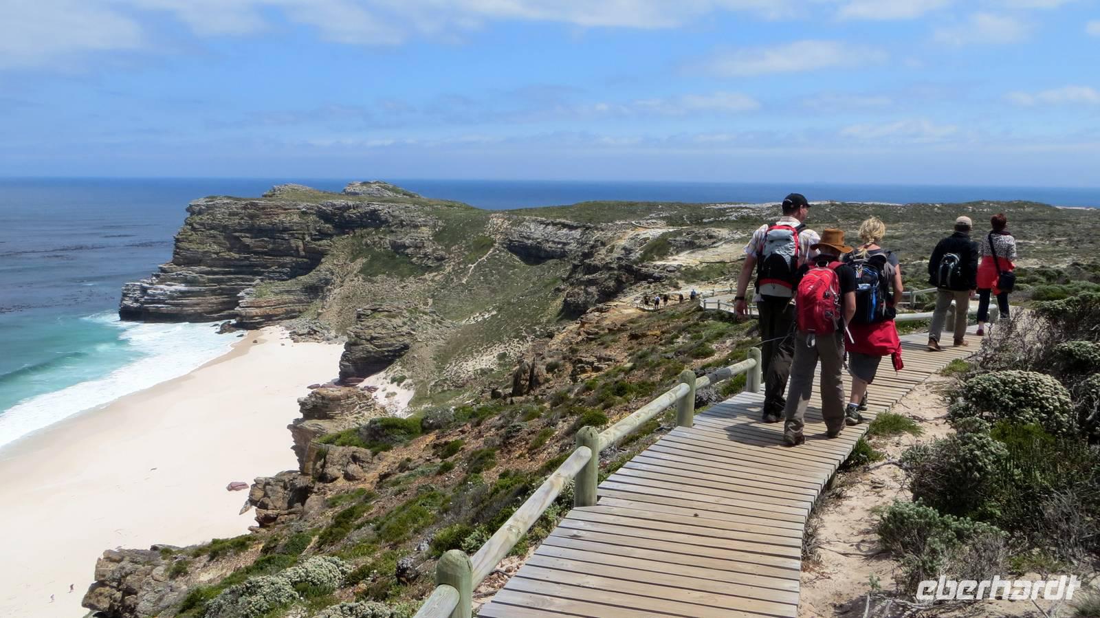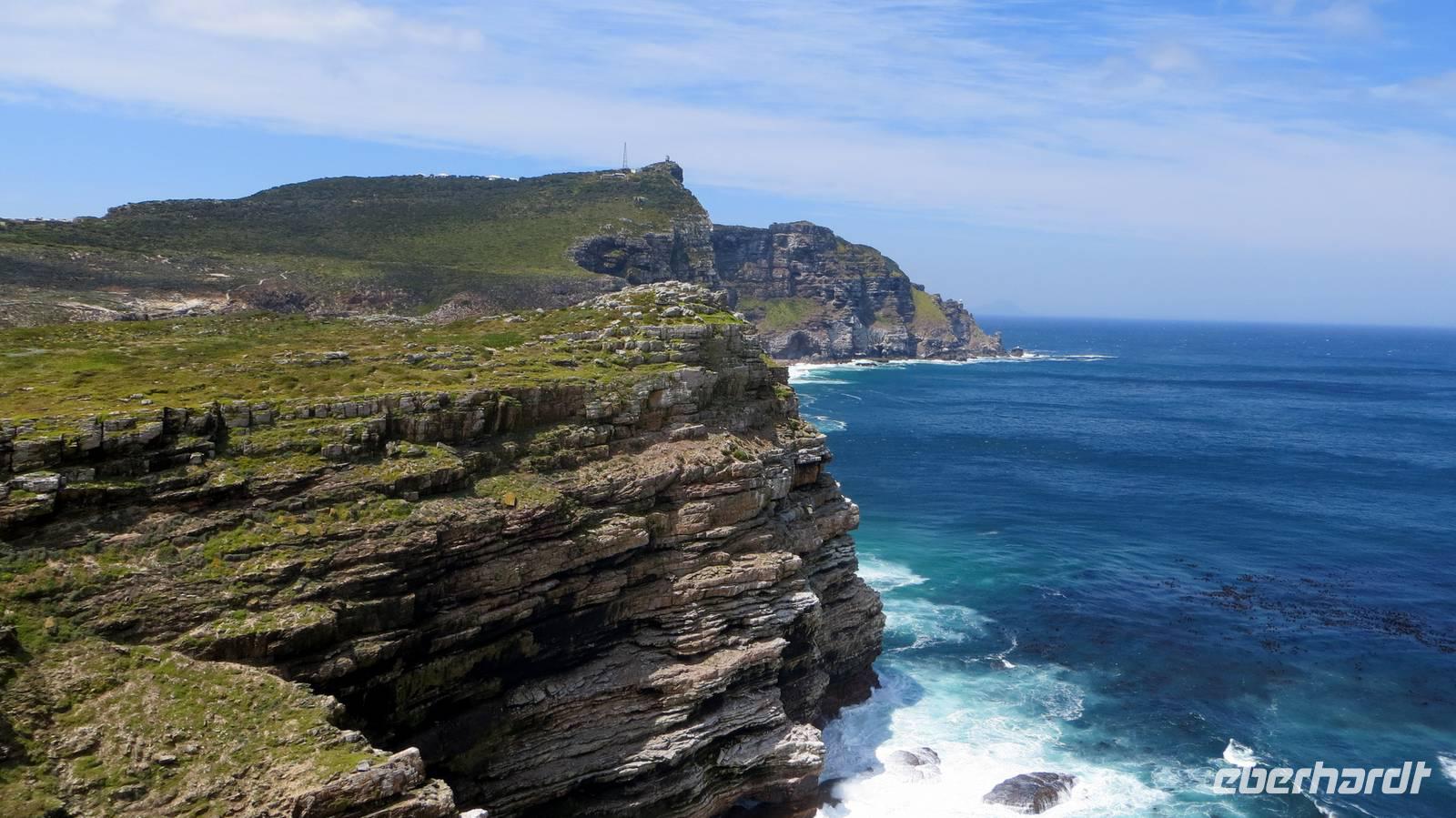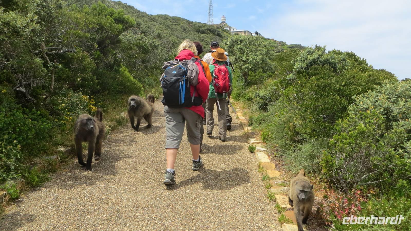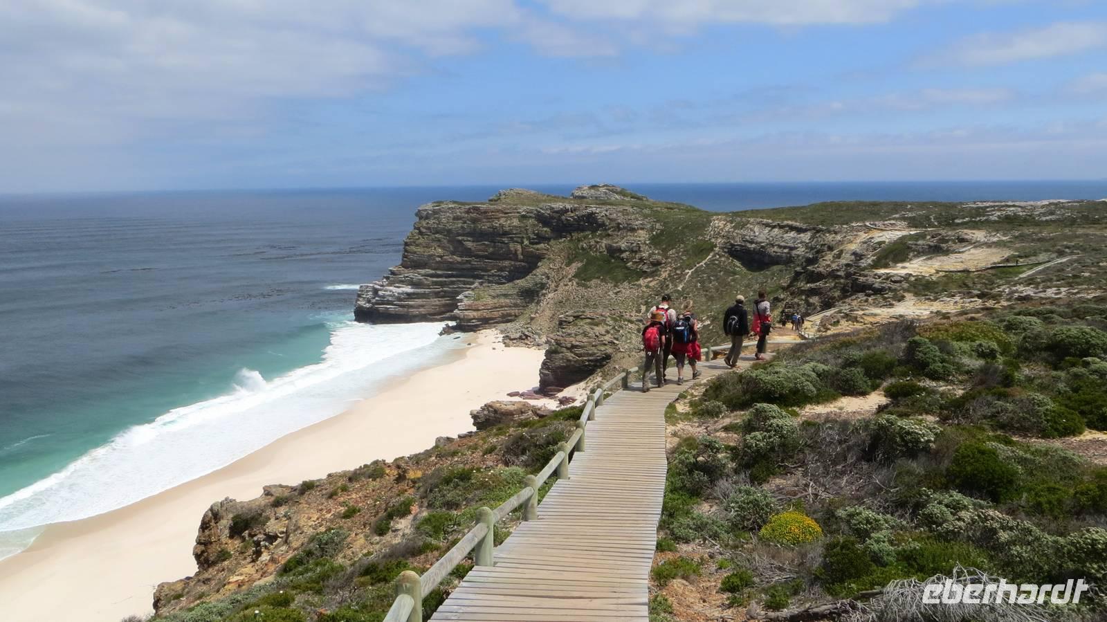Unser erster Stopp ist das kleine Hafenstädtchen Hout Bay, wo wir eine Bootsfahrt unternehmen. Der Blick auf die Küste und die steil aufragenden Felsen ist beeindruckend und schließlich erreichen wir die Felseninseln, wo sich in der Brandung hunderte Robben tummeln. Es ist wirklich ein Schauspiel und man könnte meinen, dass einige gar für unsere Kameras posieren. Weiter führt uns die Route über die spektakuläre Panorama-Straße Chapman's Peak Drive zur Kapspitze. Hier laufen wir zunächst hinauf zum Leuchtturm und haben einen herrlichen Blick zur Kapspitze. Von hier sind es 9.575 Kilometer bis nach Berlin! Danach wandern wir zum Kap der Guten Hoffnung (wir sehen sogar drei wilde Strauße). Unser Ziel ist das Schild, das die berühmte Landmarke ziert. Am Ende der Wanderung erwartet uns Vera mit einem Glas Sekt und der „Kaptaufe". Das haben wir uns verdient! Die gesamte Gruppe posiert noch am „Cape of good Hope" für ein Gruppenfoto, am südwestlichsten Punkt des afrikanischen Kontinents! Zum Abschluss unseres Ausfluges fahren wir noch zum „Boulders Beach", wo wir die putzigen Pinguine am Strand beobachten können. Den letzten Abend unserer Rundreise beschließen wir in geselliger Runde beim Dinner in typisch afrikanischer Atmosphäre im „Africa Café".