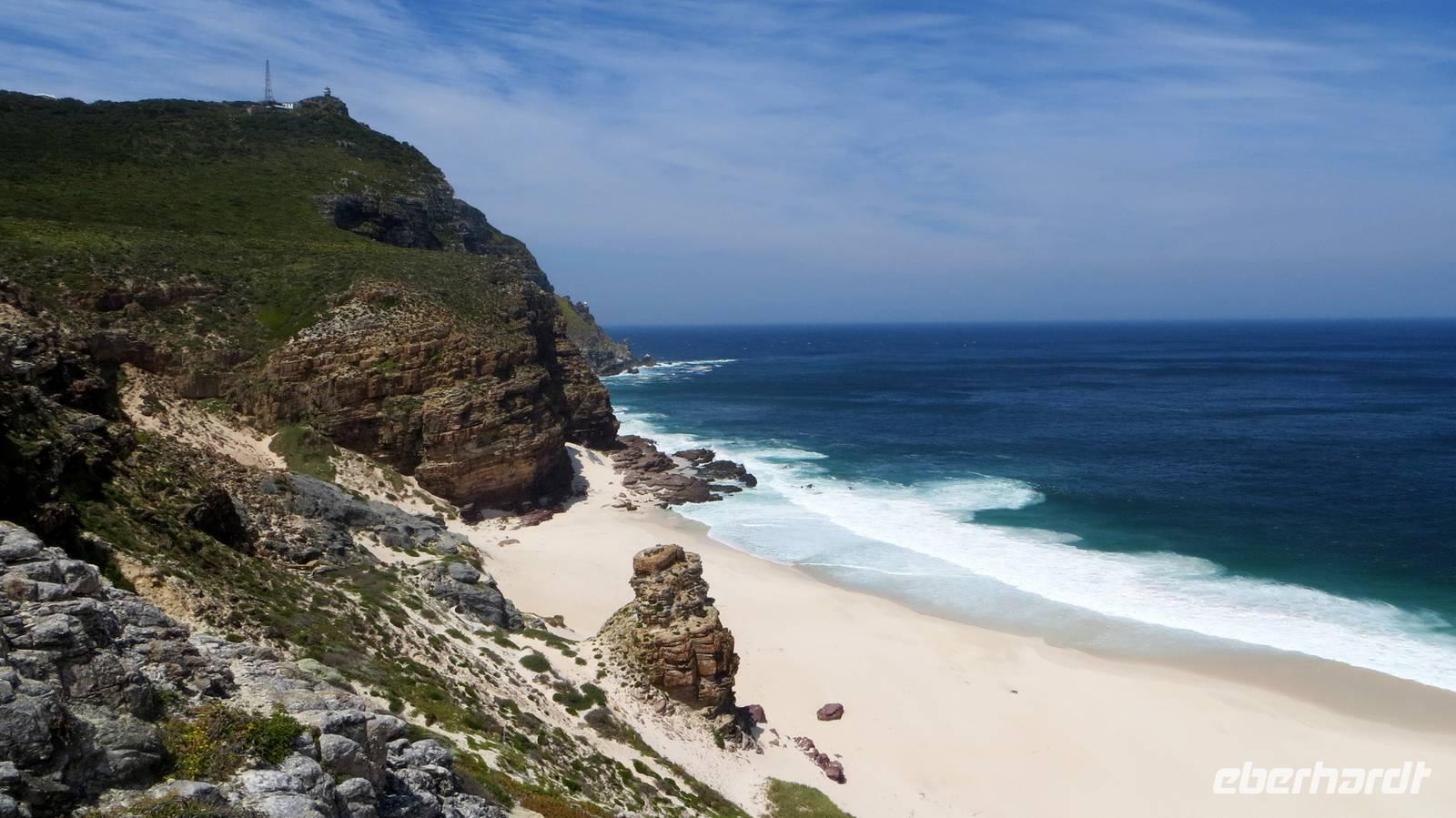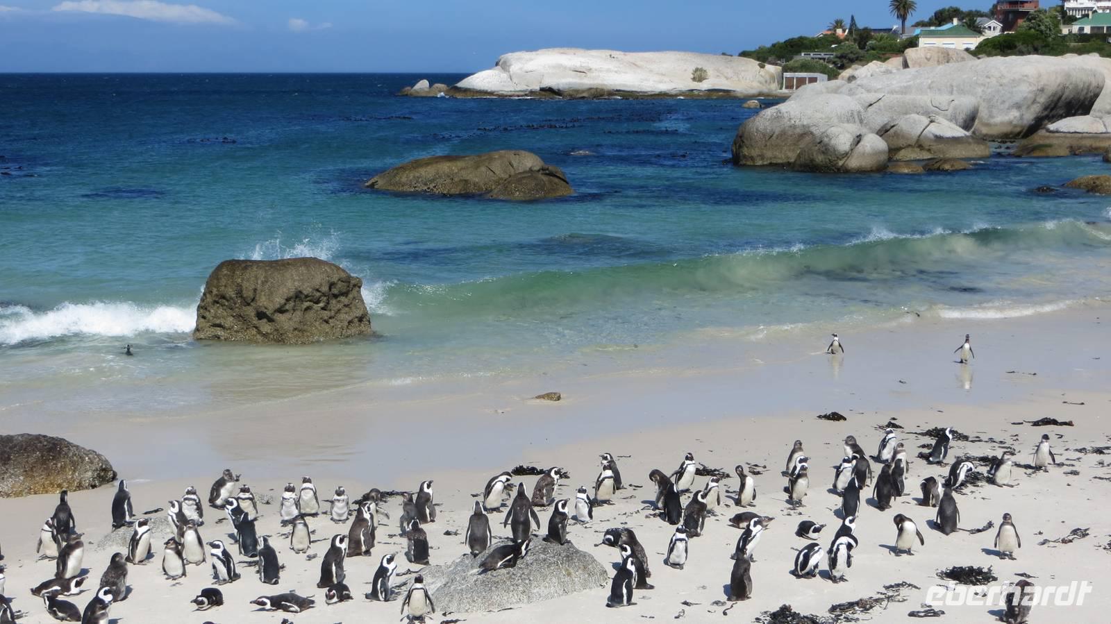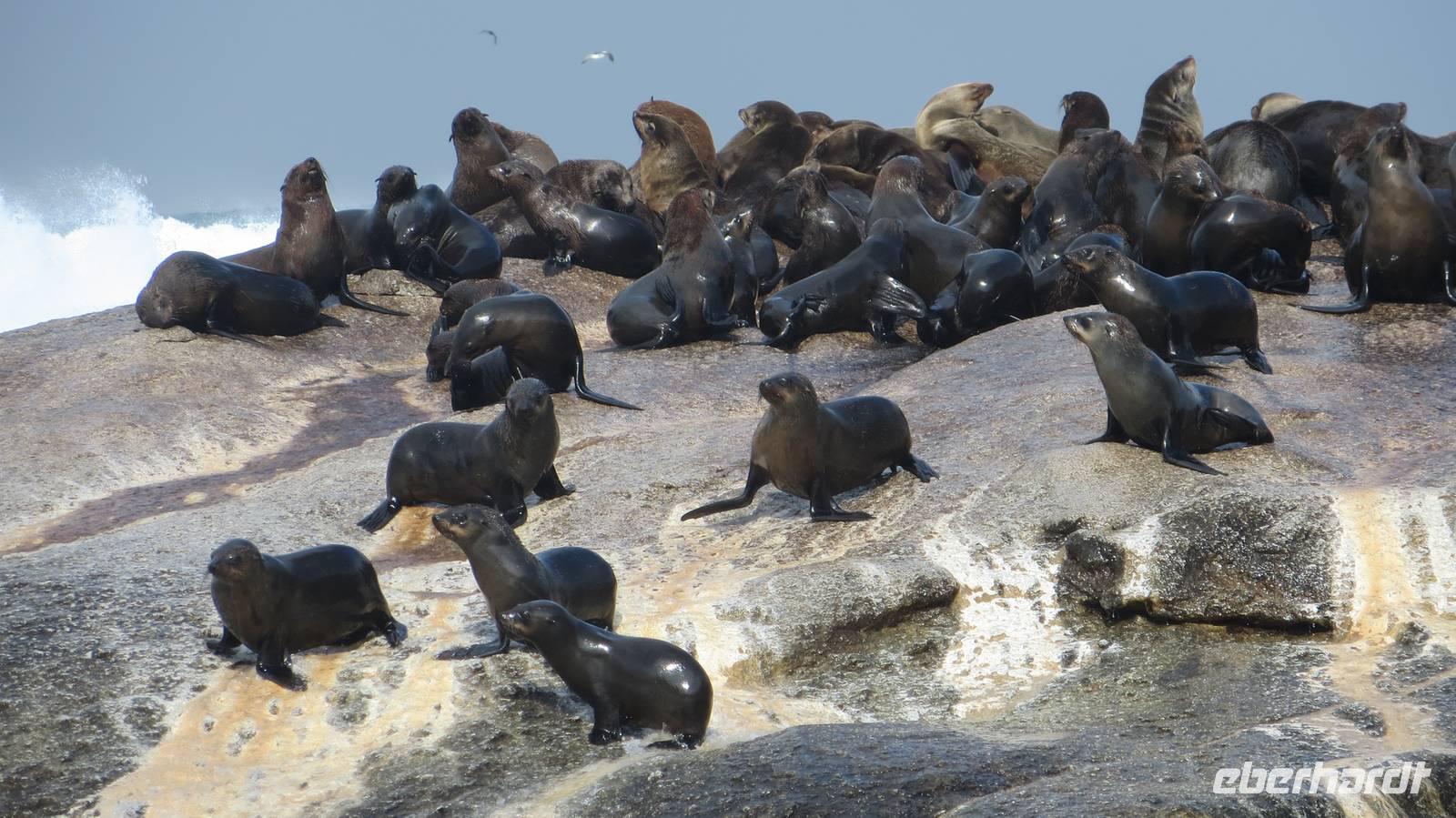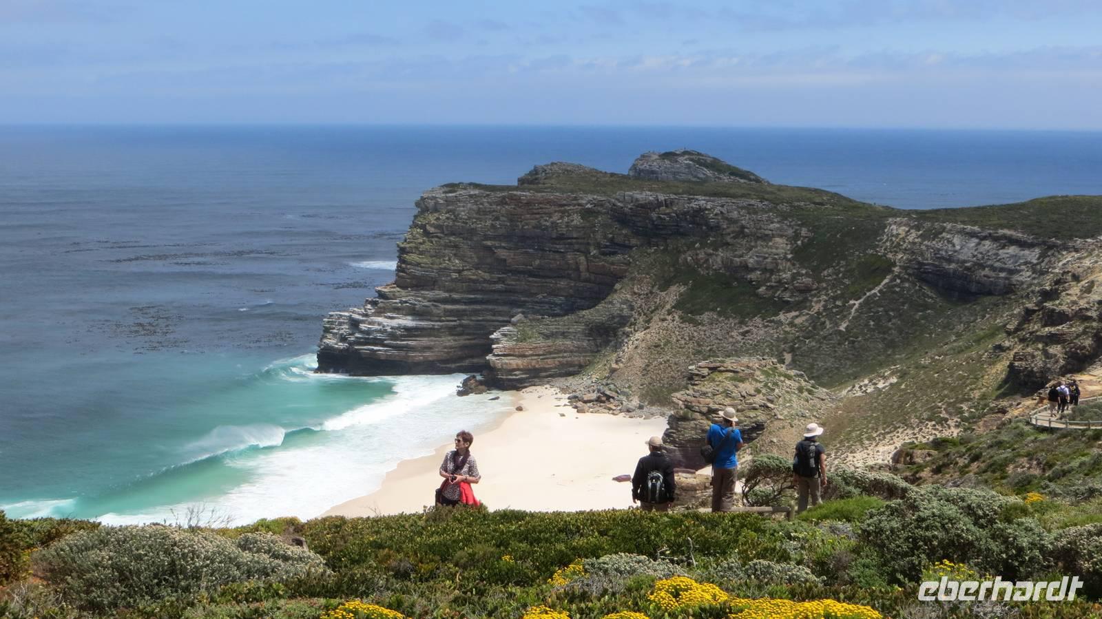 Unser erster Stopp ist das kleine Hafenstädtchen Hout Bay, wo wir eine Bootsfahrt unternehmen. Der Blick auf die Küste und die steil aufragenden Felsen ist beeindruckend und schließlich erreichen wir die Felseninseln, wo sich in der Brandung hunderte Robben tummeln. Es ist wirklich ein Schauspiel und man könnte meinen, dass einige gar für unsere Kameras posieren. Weiter führt uns die Route über die spektakuläre Panorama-Straße Chapman's Peak Drive zur Kapspitze. Hier laufen wir zunächst hinauf zum Leuchtturm und haben einen herrlichen Blick zur Kapspitze. Von hier sind es 9.575 Kilometer bis nach Berlin! Danach wandern wir zum Kap der Guten Hoffnung (wir sehen sogar drei wilde Strauße). Unser Ziel ist das Schild, das die berühmte Landmarke ziert. Am Ende der Wanderung erwartet uns Vera mit einem Glas Sekt und der „Kaptaufe". Das haben wir uns verdient! Die gesamte Gruppe posiert noch am „Cape of good Hope" für ein Gruppenfoto, am südwestlichsten Punkt des afrikanischen Kontinents! Zum Abschluss unseres Ausfluges fahren wir noch zum „Boulders Beach", wo wir die putzigen Pinguine am Strand beobachten können. Den letzten Abend unserer Rundreise beschließen wir in geselliger Runde beim Dinner in typisch afrikanischer Atmosphäre im „Africa Café".