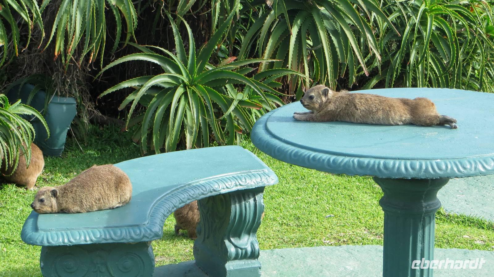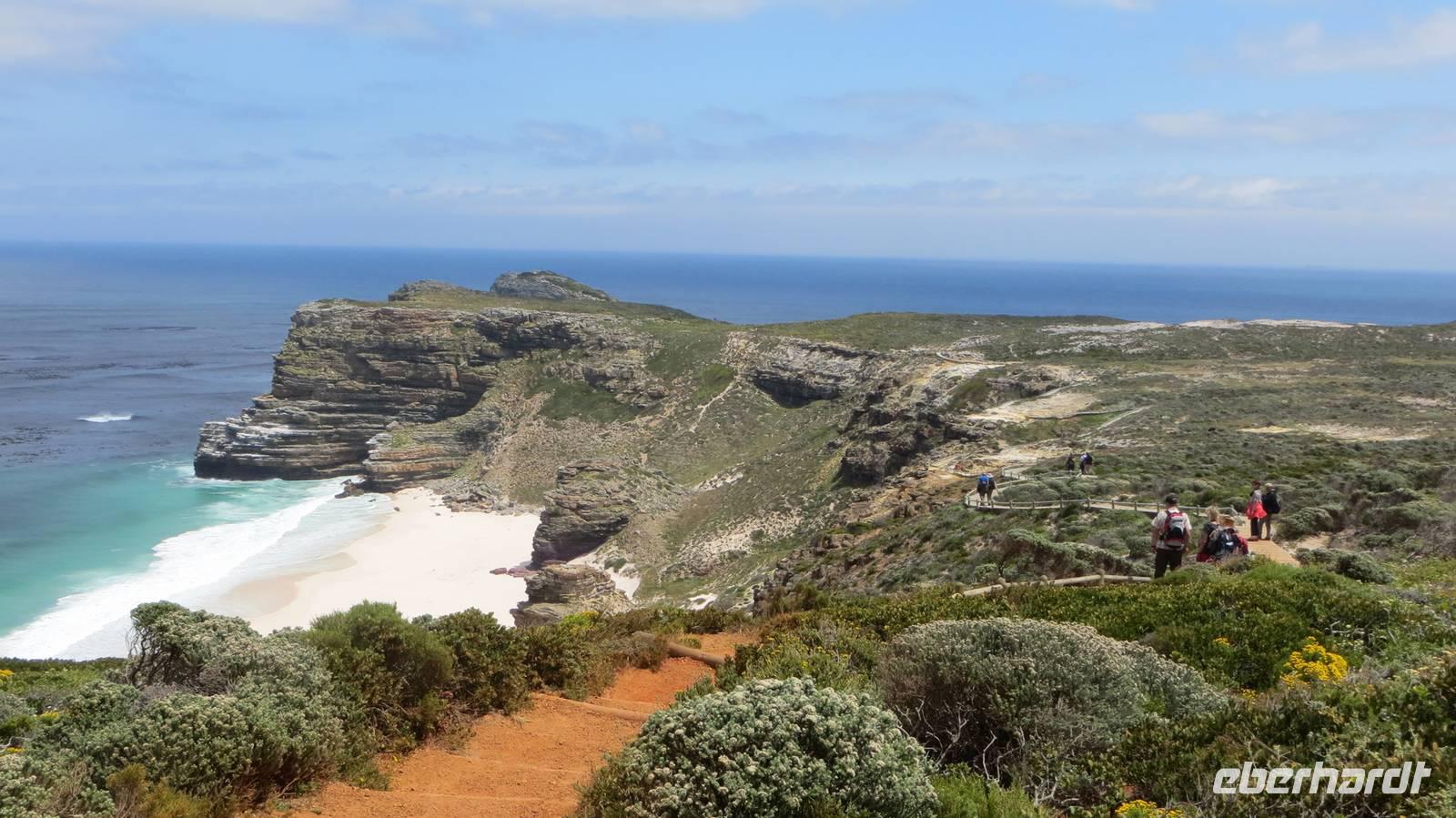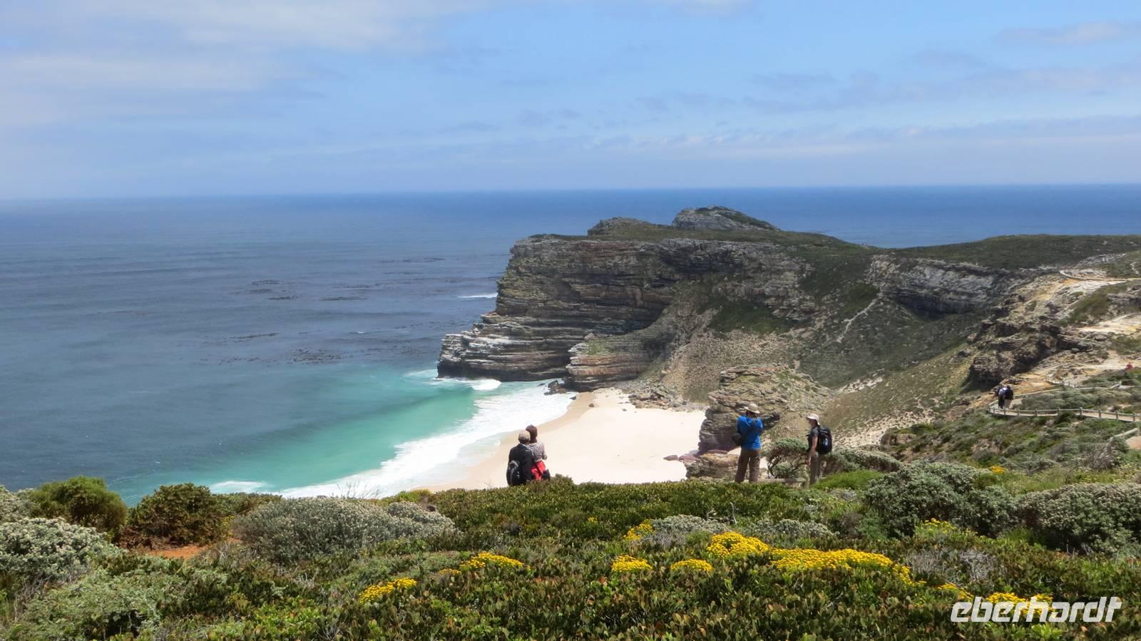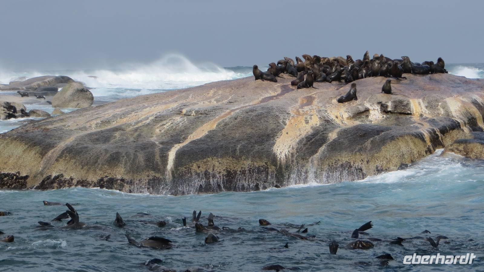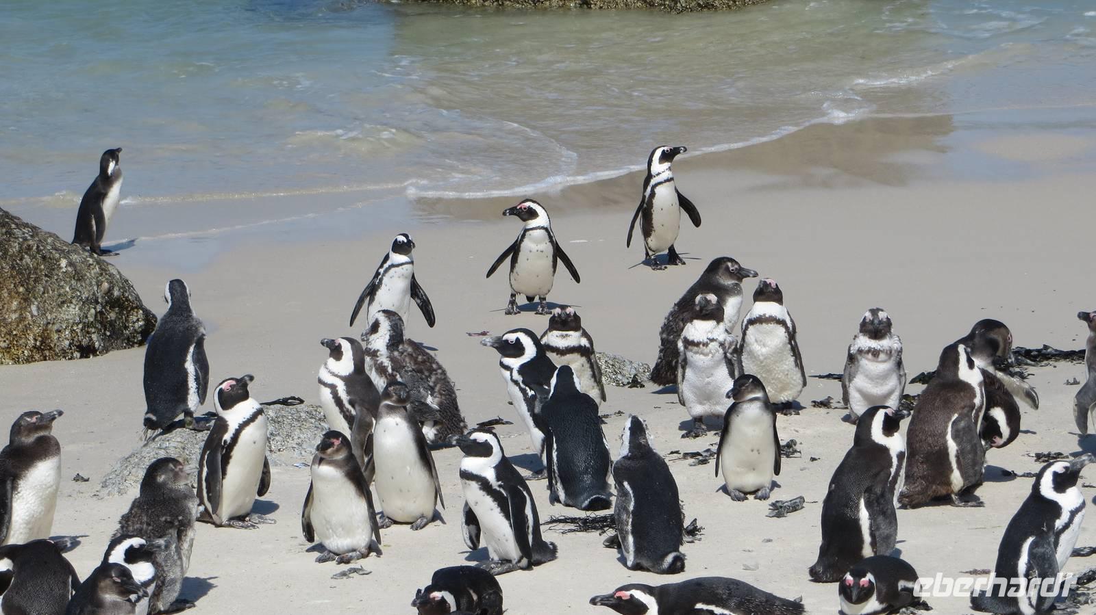 Unser erster Stopp ist das kleine Hafenstädtchen Hout Bay, wo wir eine Bootsfahrt unternehmen. Der Blick auf die Küste und die steil aufragenden Felsen ist beeindruckend und schließlich erreichen wir die Felseninseln, wo sich in der Brandung hunderte Robben tummeln. Es ist wirklich ein Schauspiel und man könnte meinen, dass einige gar für unsere Kameras posieren. Weiter führt uns die Route über die spektakuläre Panorama-Straße Chapman's Peak Drive zur Kapspitze. Hier laufen wir zunächst hinauf zum Leuchtturm und haben einen herrlichen Blick zur Kapspitze. Von hier sind es 9.575 Kilometer bis nach Berlin! Danach wandern wir zum Kap der Guten Hoffnung (wir sehen sogar drei wilde Strauße). Unser Ziel ist das Schild, das die berühmte Landmarke ziert. Am Ende der Wanderung erwartet uns Vera mit einem Glas Sekt und der „Kaptaufe". Das haben wir uns verdient! Die gesamte Gruppe posiert noch am „Cape of good Hope" für ein Gruppenfoto, am südwestlichsten Punkt des afrikanischen Kontinents! Zum Abschluss unseres Ausfluges fahren wir noch zum „Boulders Beach", wo wir die putzigen Pinguine am Strand beobachten können. Den letzten Abend unserer Rundreise beschließen wir in geselliger Runde beim Dinner in typisch afrikanischer Atmosphäre im „Africa Café".