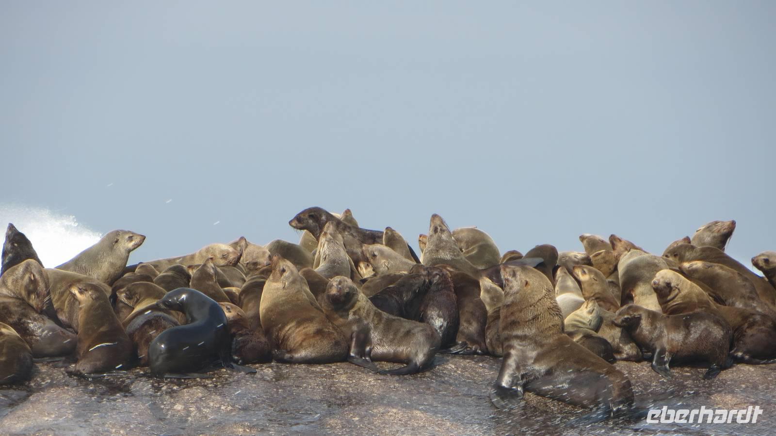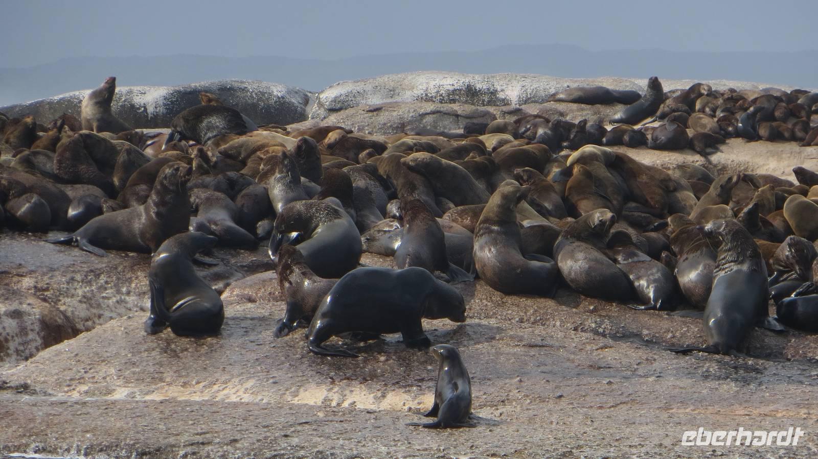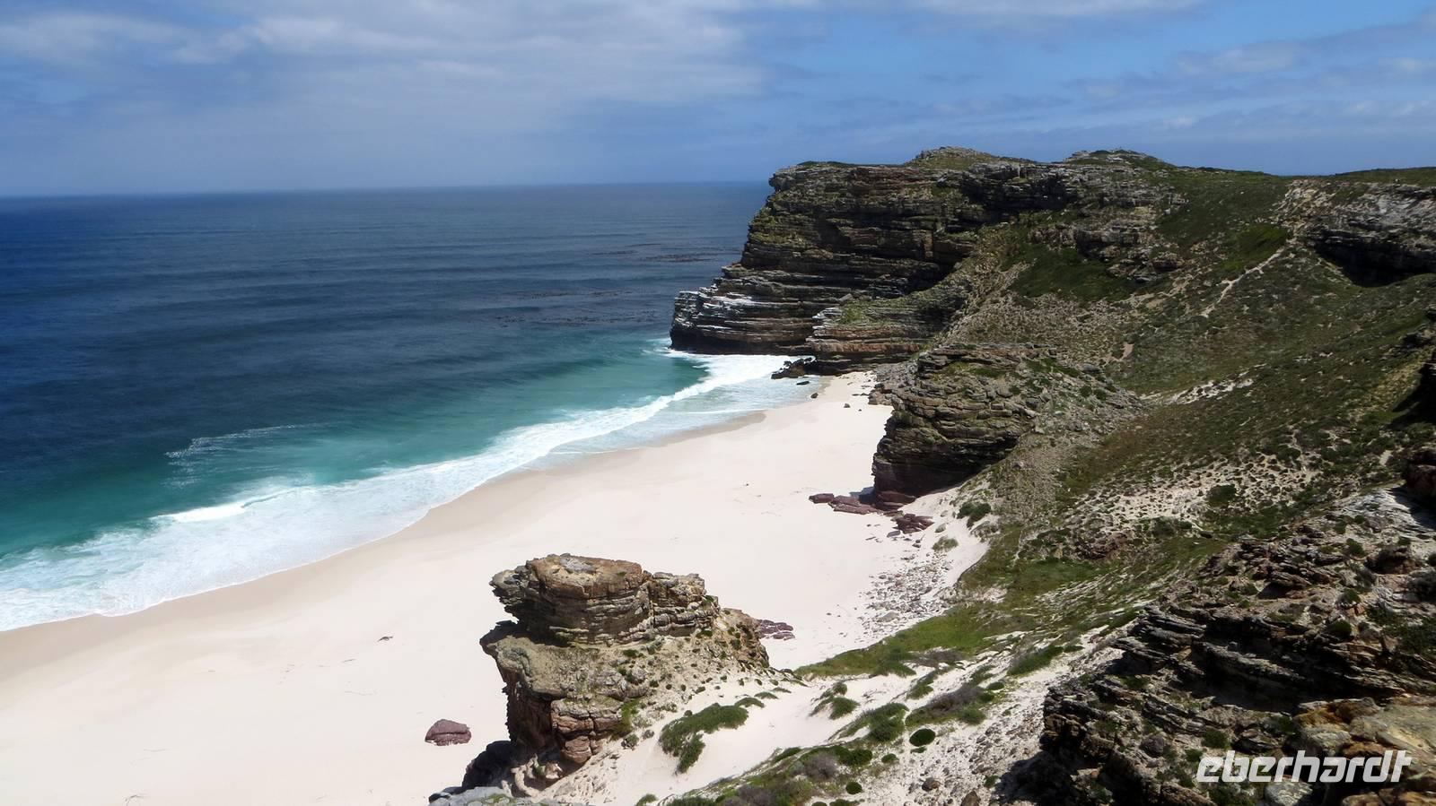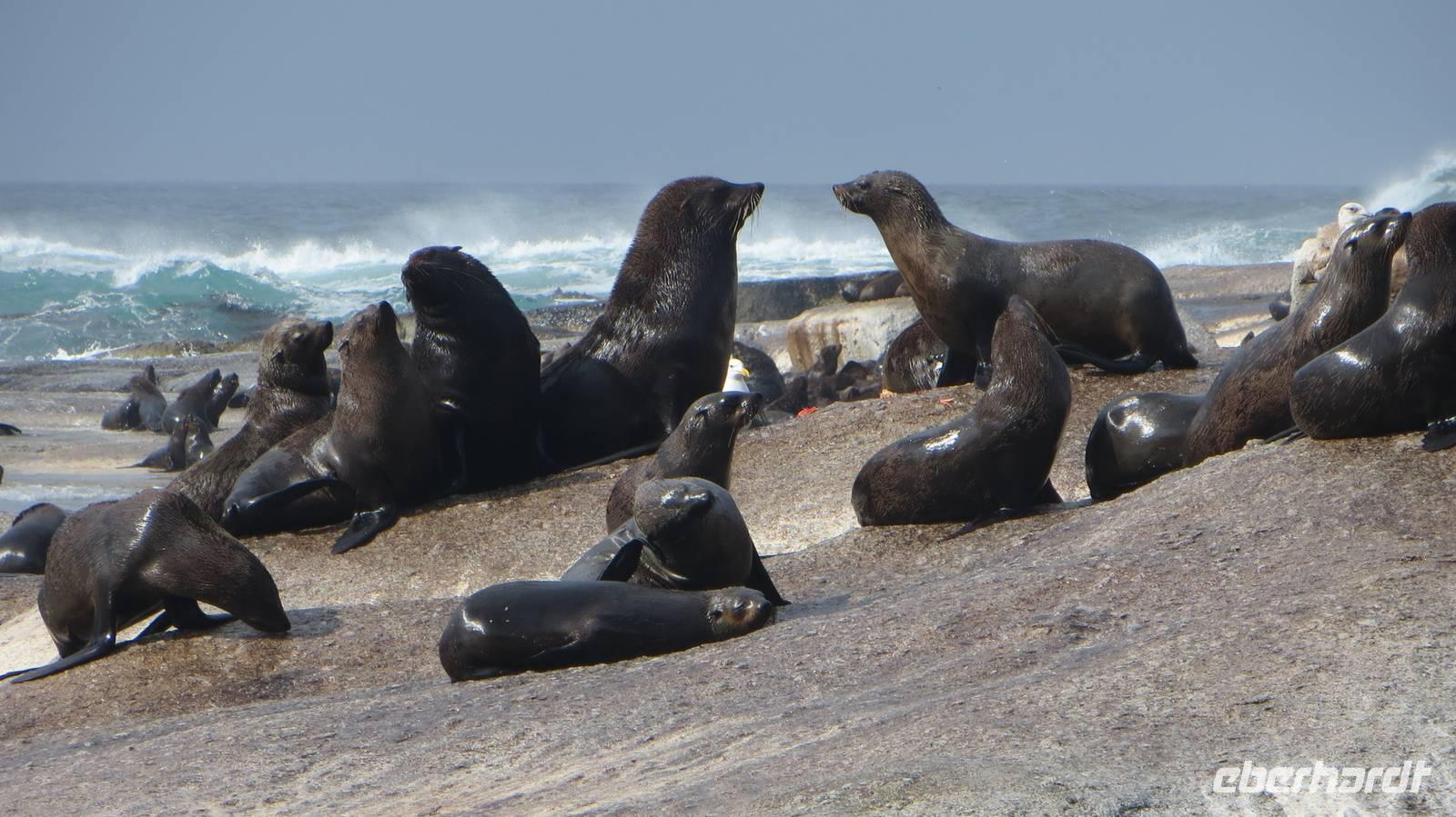 Unser erster Stopp ist das kleine Hafenstädtchen Hout Bay, wo wir eine Bootsfahrt unternehmen. Der Blick auf die Küste und die steil aufragenden Felsen ist beeindruckend und schließlich erreichen wir die Felseninseln, wo sich in der Brandung hunderte Robben tummeln. Es ist wirklich ein Schauspiel und man könnte meinen, dass einige gar für unsere Kameras posieren. Weiter führt uns die Route über die spektakuläre Panorama-Straße Chapman's Peak Drive zur Kapspitze. Hier laufen wir zunächst hinauf zum Leuchtturm und haben einen herrlichen Blick zur Kapspitze. Von hier sind es 9.575 Kilometer bis nach Berlin! Danach wandern wir zum Kap der Guten Hoffnung (wir sehen sogar drei wilde Strauße). Unser Ziel ist das Schild, das die berühmte Landmarke ziert. Am Ende der Wanderung erwartet uns Vera mit einem Glas Sekt und der „Kaptaufe". Das haben wir uns verdient! Die gesamte Gruppe posiert noch am „Cape of good Hope" für ein Gruppenfoto, am südwestlichsten Punkt des afrikanischen Kontinents! Zum Abschluss unseres Ausfluges fahren wir noch zum „Boulders Beach", wo wir die putzigen Pinguine am Strand beobachten können. Den letzten Abend unserer Rundreise beschließen wir in geselliger Runde beim Dinner in typisch afrikanischer Atmosphäre im „Africa Café".