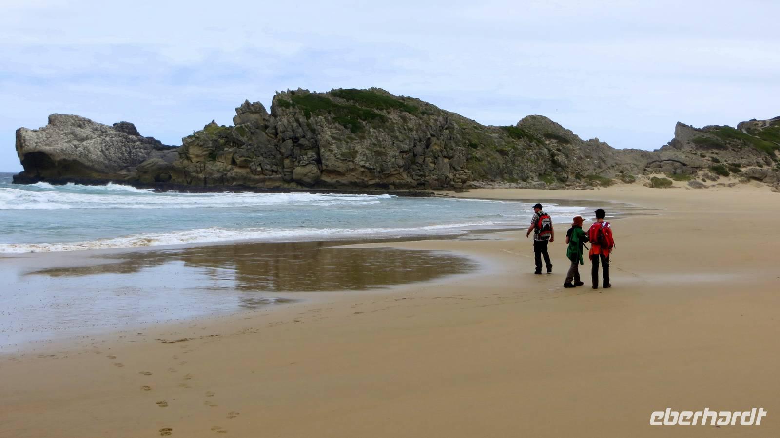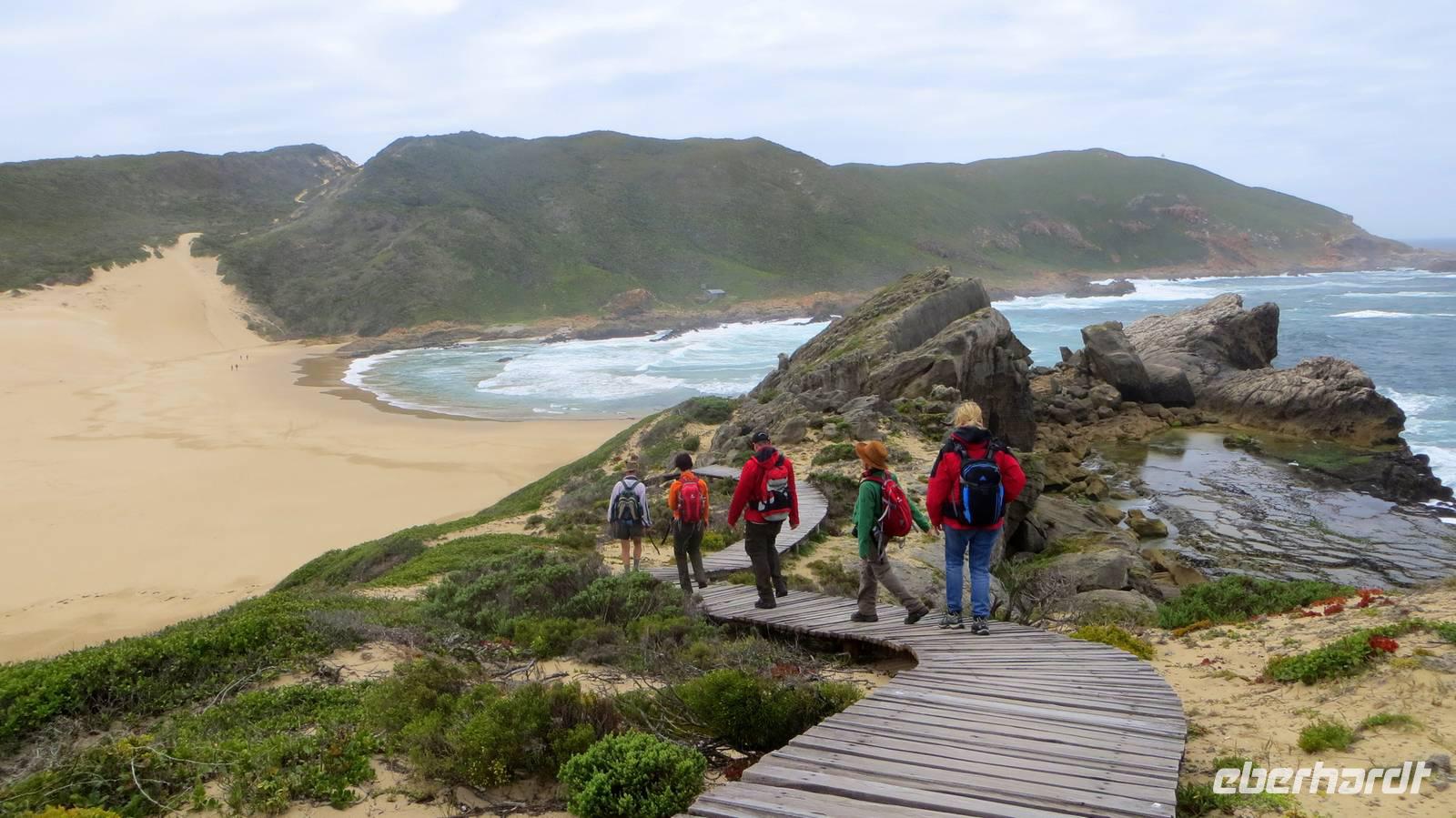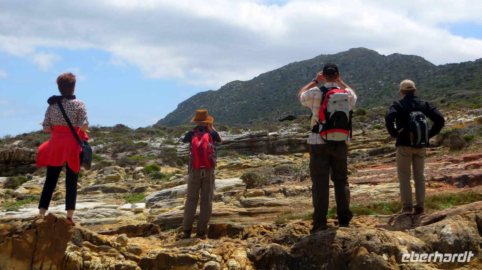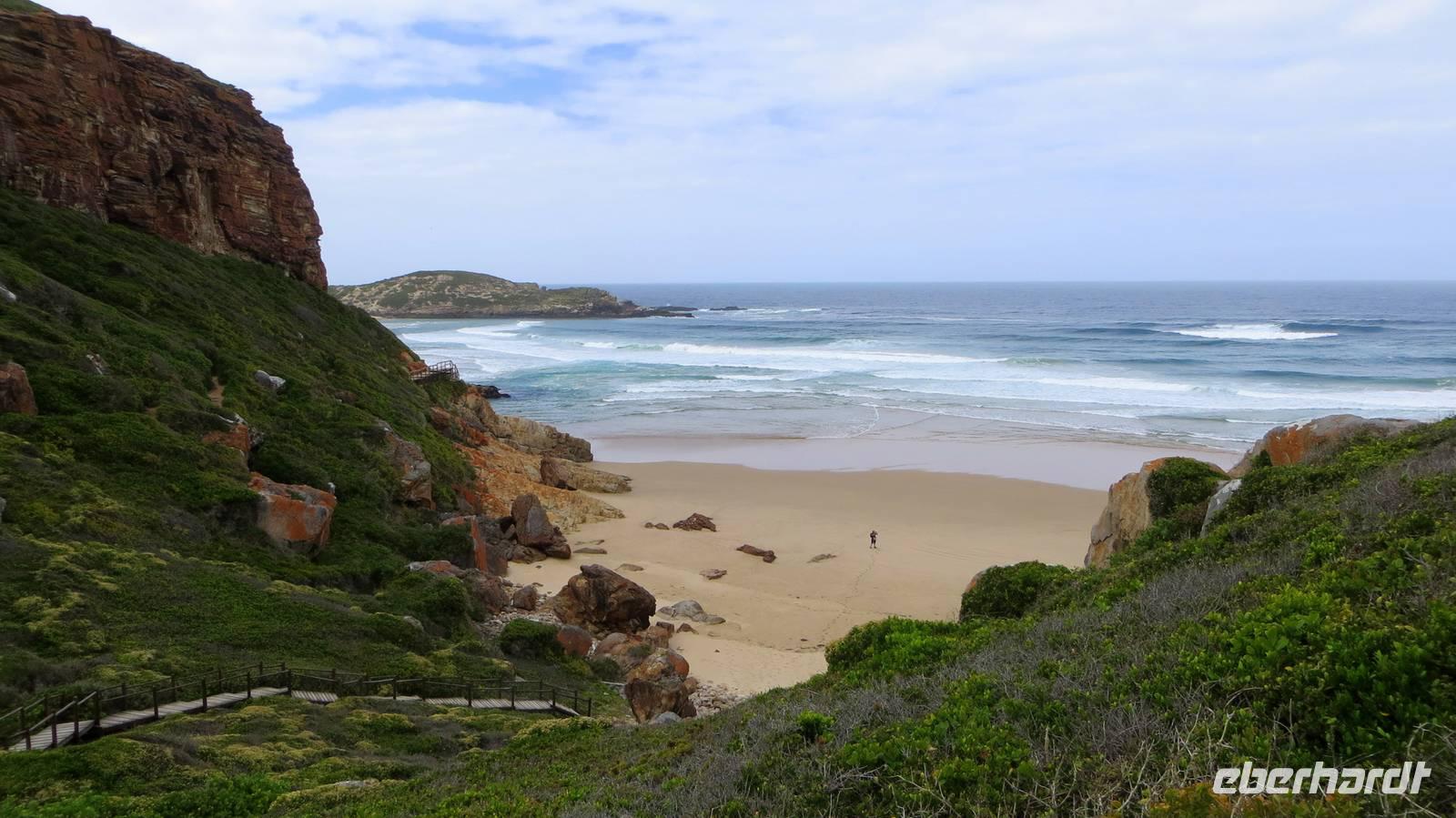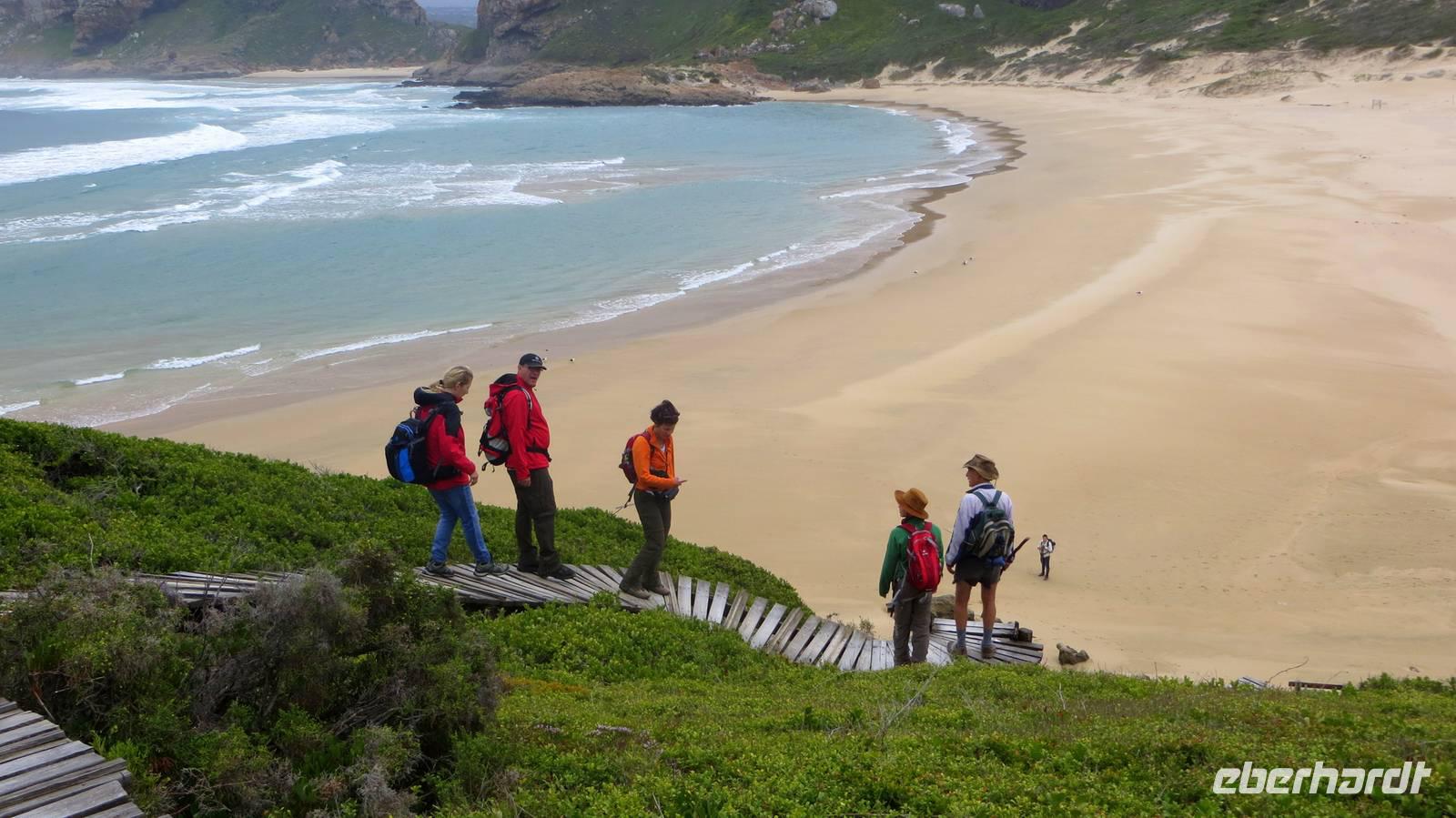 Wir haben offenbar einen guten Draht zum Tokolosh, denn entgegen der Wettervorhersage regnet es glücklicherweise nicht. So können wir während unserer Wanderung im Robberg Naturreservat die herrliche Natur und traumhafte Ausblicke auf die Küste und das Meer voll und ganz genießen. Der Wanderpfad führt uns über Stock und Stein, über goldgelbe Strände ans Meer und wieder über Felsen hinauf. Unterwegs sehen wir die abwechslungsreiche Flora, Seevögel, eine Robbenkolonie und zur Krönung sogar Wale in der Bucht! Nach diesen großartigen Erlebnissen haben wir uns ein Überraschungspicknick verdient. Mit der Aussicht über die weit geschwungene Bucht von Plettenberg gibt es allerlei kleine Leckereien. Ein paar Mutige haben sich abschließend noch das „kleine Seepferdchen" verdient und waren im 18° kalten Wasser baden. Wir beschließen den Tag bei einem Abendessen an der Waterfront von Knysna.