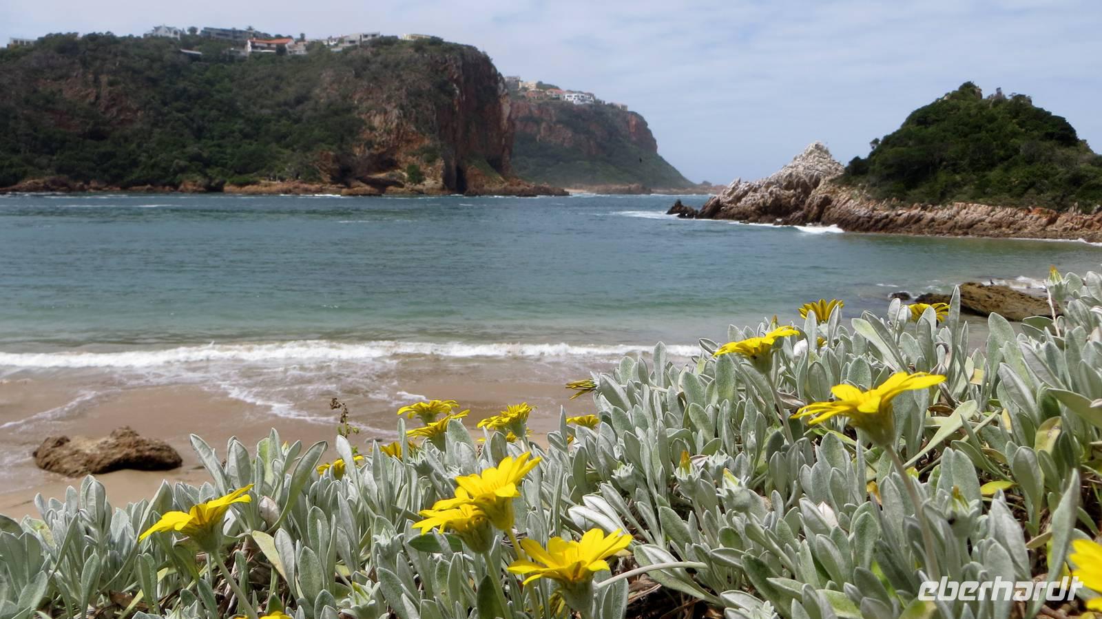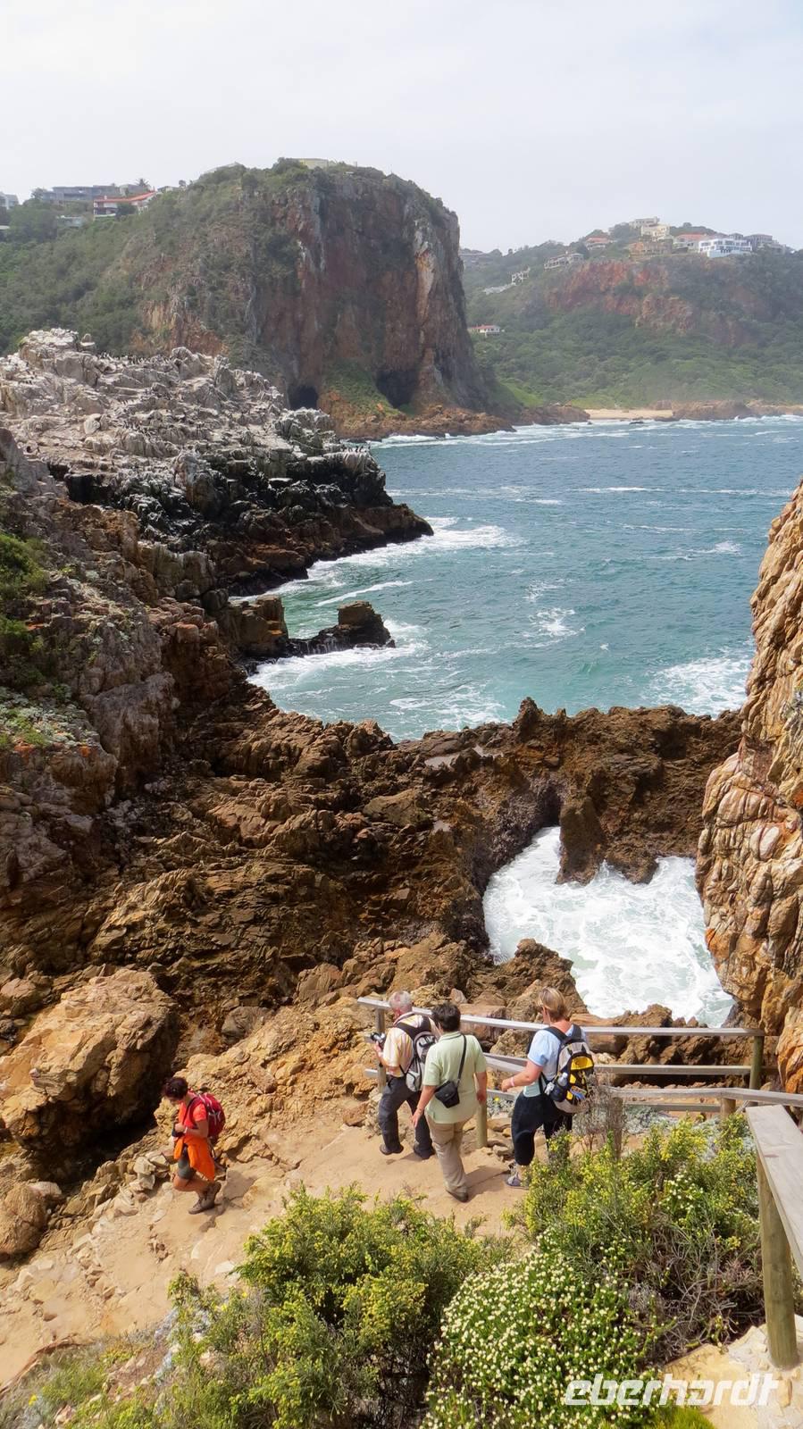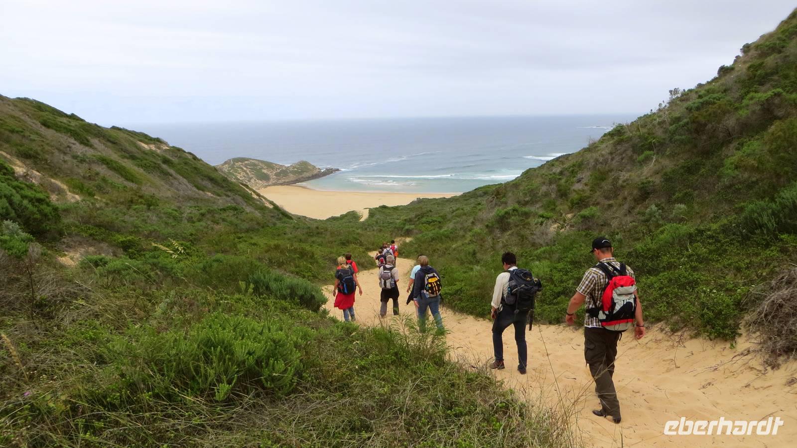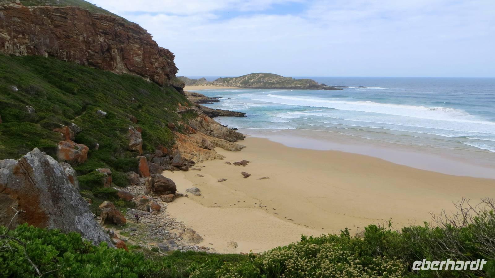 Wir haben offenbar einen guten Draht zum Tokolosh, denn entgegen der Wettervorhersage regnet es glücklicherweise nicht. So können wir während unserer Wanderung im Robberg Naturreservat die herrliche Natur und traumhafte Ausblicke auf die Küste und das Meer voll und ganz genießen. Der Wanderpfad führt uns über Stock und Stein, über goldgelbe Strände ans Meer und wieder über Felsen hinauf. Unterwegs sehen wir die abwechslungsreiche Flora, Seevögel, eine Robbenkolonie und zur Krönung sogar Wale in der Bucht! Nach diesen großartigen Erlebnissen haben wir uns ein Überraschungspicknick verdient. Mit der Aussicht über die weit geschwungene Bucht von Plettenberg gibt es allerlei kleine Leckereien. Ein paar Mutige haben sich abschließend noch das „kleine Seepferdchen" verdient und waren im 18° kalten Wasser baden. Wir beschließen den Tag bei einem Abendessen an der Waterfront von Knysna.
