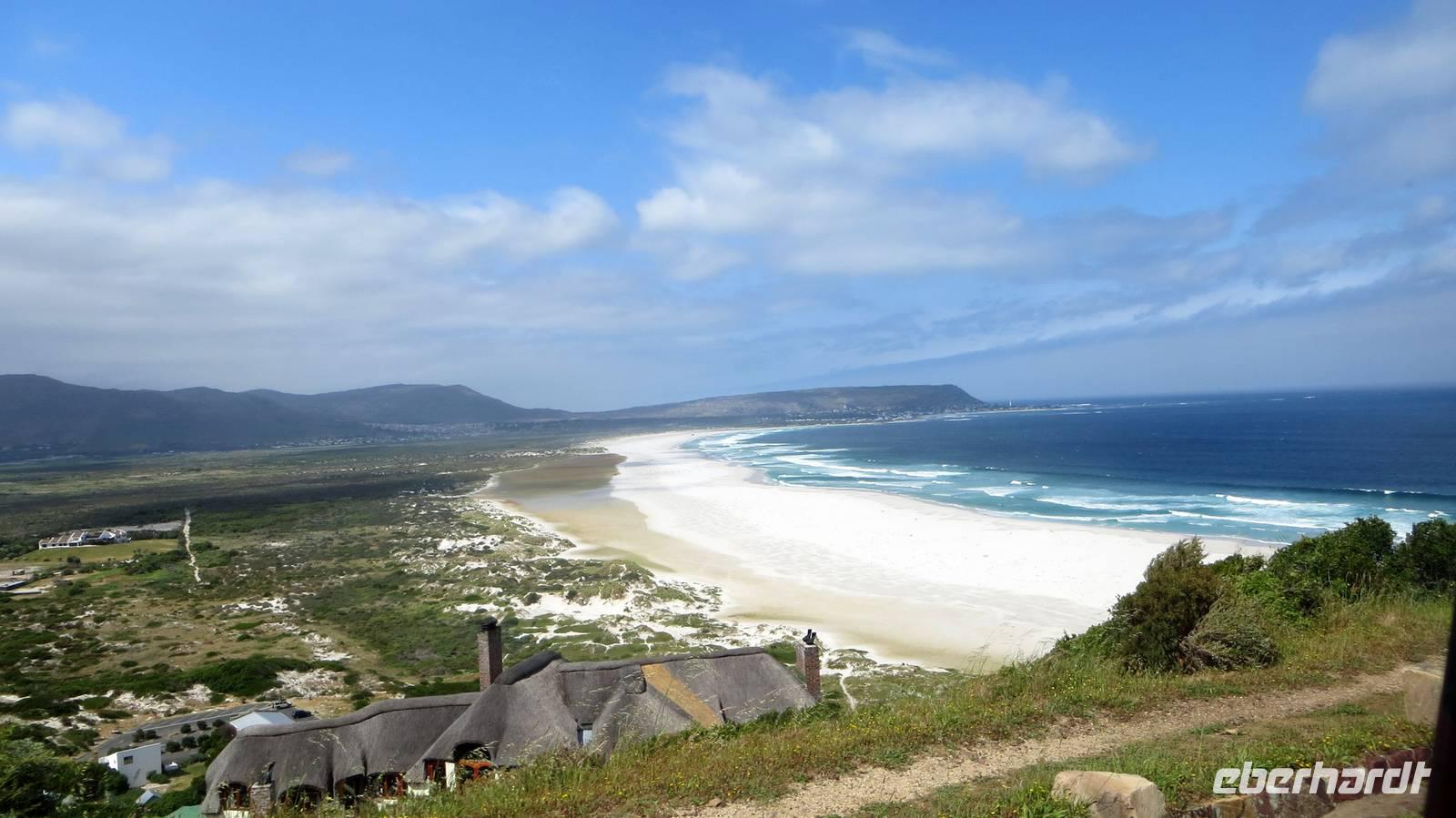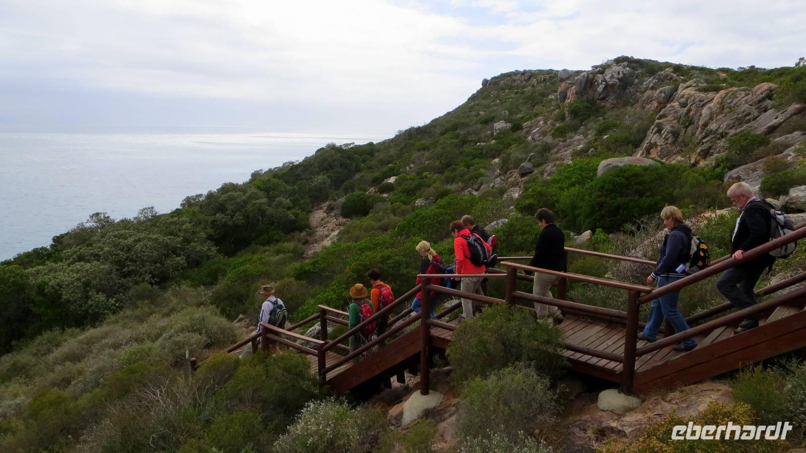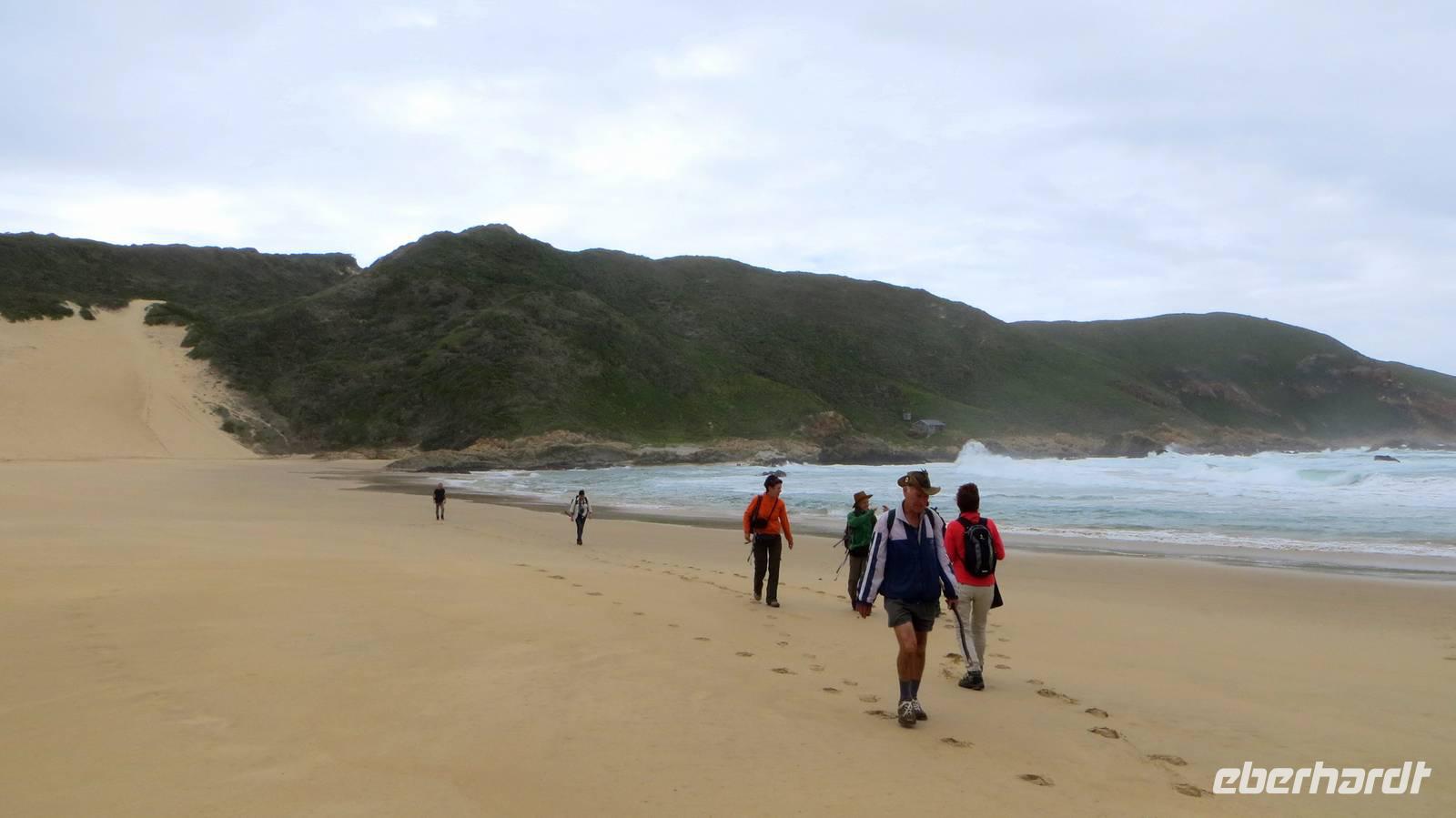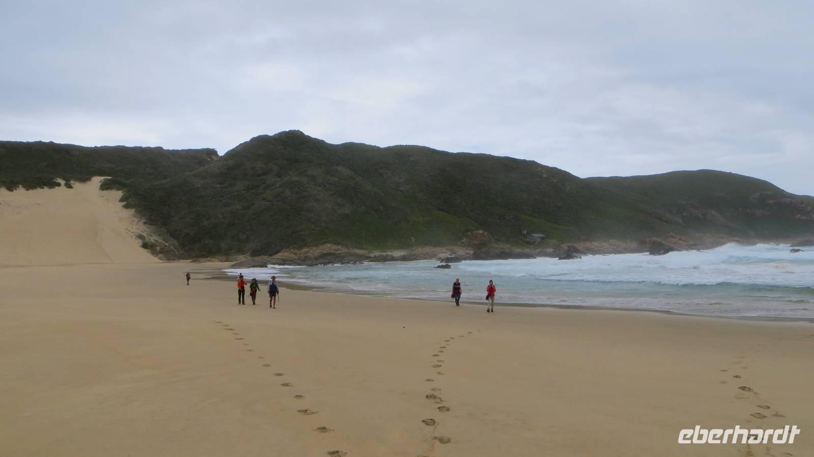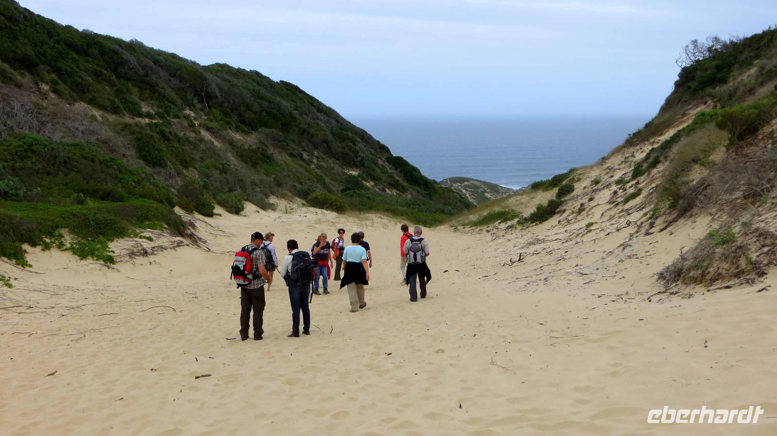Wir haben offenbar einen guten Draht zum Tokolosh, denn entgegen der Wettervorhersage regnet es glücklicherweise nicht. So können wir während unserer Wanderung im Robberg Naturreservat die herrliche Natur und traumhafte Ausblicke auf die Küste und das Meer voll und ganz genießen. Der Wanderpfad führt uns über Stock und Stein, über goldgelbe Strände ans Meer und wieder über Felsen hinauf. Unterwegs sehen wir die abwechslungsreiche Flora, Seevögel, eine Robbenkolonie und zur Krönung sogar Wale in der Bucht! Nach diesen großartigen Erlebnissen haben wir uns ein Überraschungspicknick verdient. Mit der Aussicht über die weit geschwungene Bucht von Plettenberg gibt es allerlei kleine Leckereien. Ein paar Mutige haben sich abschließend noch das „kleine Seepferdchen" verdient und waren im 18° kalten Wasser baden. Wir beschließen den Tag bei einem Abendessen an der Waterfront von Knysna.