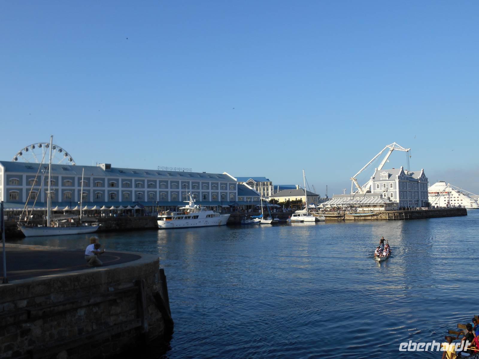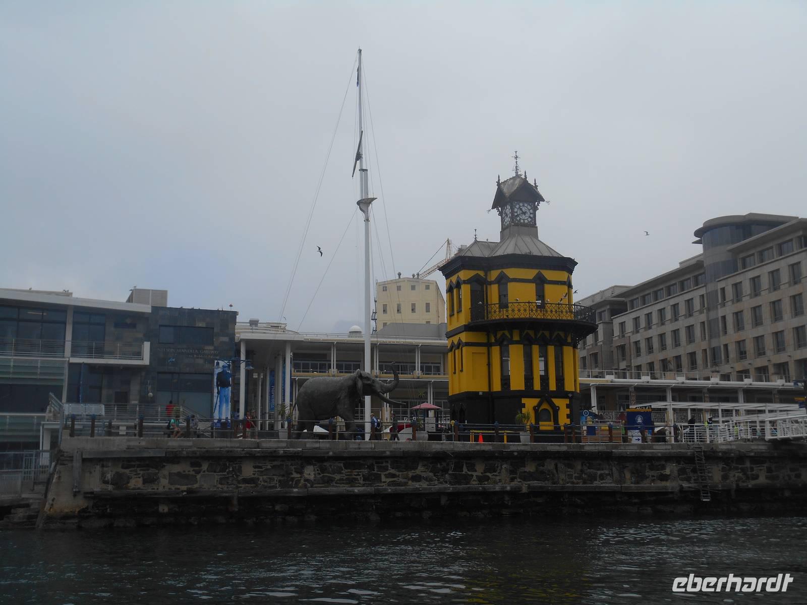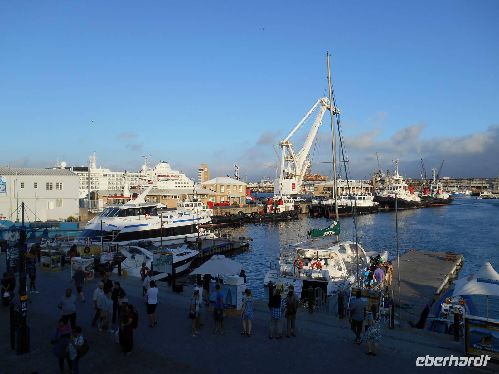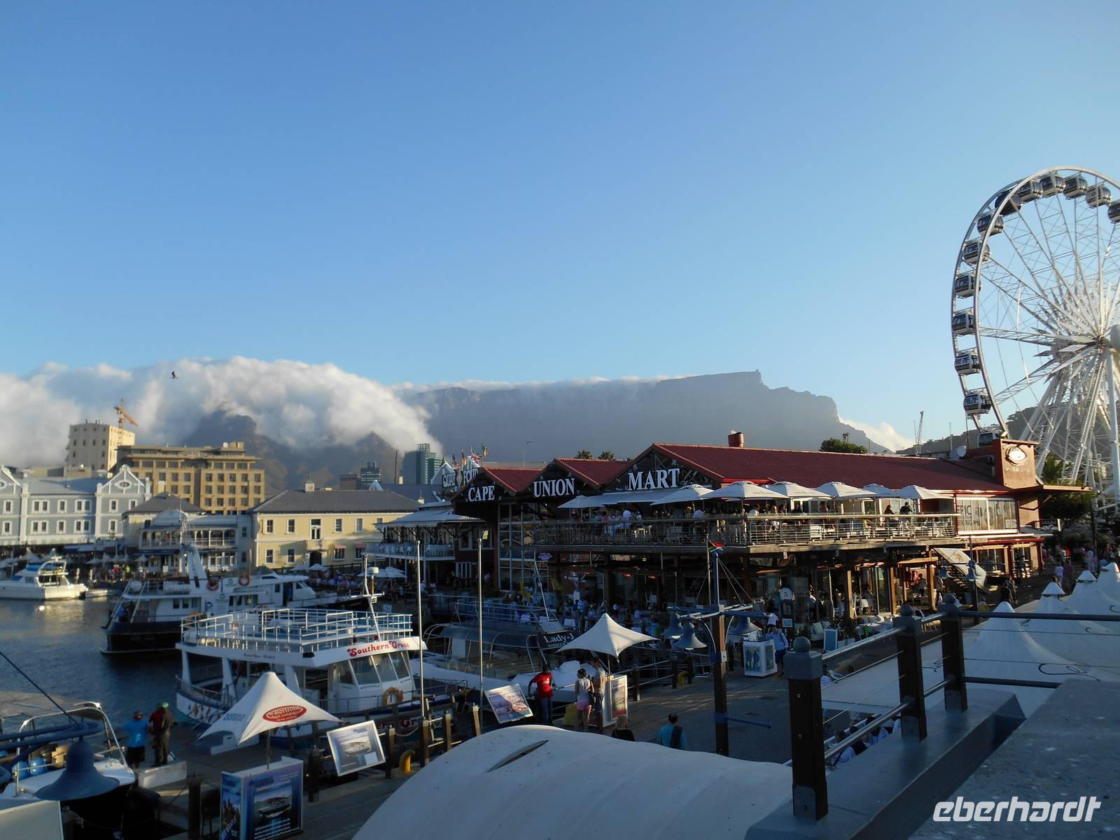Zum Abschluss unserer Rundfahrt erreichten wir den 350 Meter hohen Signal Hill, von wo wir einen grandiosen Ausblick auf Kapstadt mit seiner Waterfront und der dahinter liegenden Tafelbucht genossen. Des Weiteren erwartete uns hier eine Mitarbeiterin der örtlichen Agentur, um uns mit einem Glas Sekt zu überraschen und auf unsere Ankunft "am schönsten Ende der Welt" anzustoßen! Seit dem 17. Jahrhundert steht hier oben auch die sog. "12-Uhr-Kanone". Ihr Kanonenschuss signalisierte den damaligen Kapstädtern das Ankommen eines neuen Schiffes (daher der Name Signal Hill). Die heutige Kanone wurde 1890 von den Briten zur Verteidigung des Hafens aufgestellt, kam aber nie zum eigentlichen Einsatz. Allerdings wird sie heute aus Tradition zur Schiffsankündigung, jeden Tag, außer Sonntag, um genau 12 Uhr mittags abgefeuert - dies erschrickt natürlich zuweilen die BesucherZwinkernd. Entlang der Küste bzw. über Camps Bay und Clifton ging es nunmehr in unser zentral gelegenes Hotel "City Lodge V&A Waterfront". Wir waren mittlerweile alle etwas müde und auch die Hitze machte uns zu schaffen - schließlich begrüßte uns Kapstadt mit hochsommerlichen Temperaturen um die 30 Grad! Nachdem wir uns etwas frisch gemacht hatten, schlenderten wir am Abend durch die berühmte Waterfront, dem alten Hafen- und Werftviertel Kapstadts, welches heute ein Vergnügungsviertel mit zahlreichen Geschäften und Restaurants ist. Unser Abendessen nahmen wir im hiesigen Restaurant "Karibu" ein, wo wir erste südafrikanische Spezialitäten probieren konnten - einfach leckerLächelnd!
