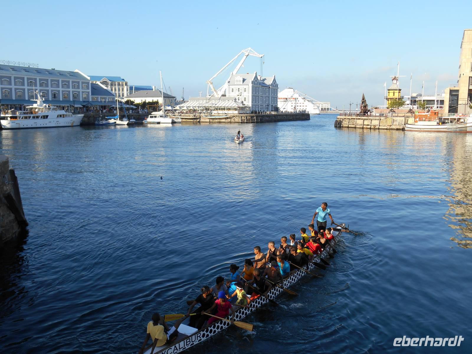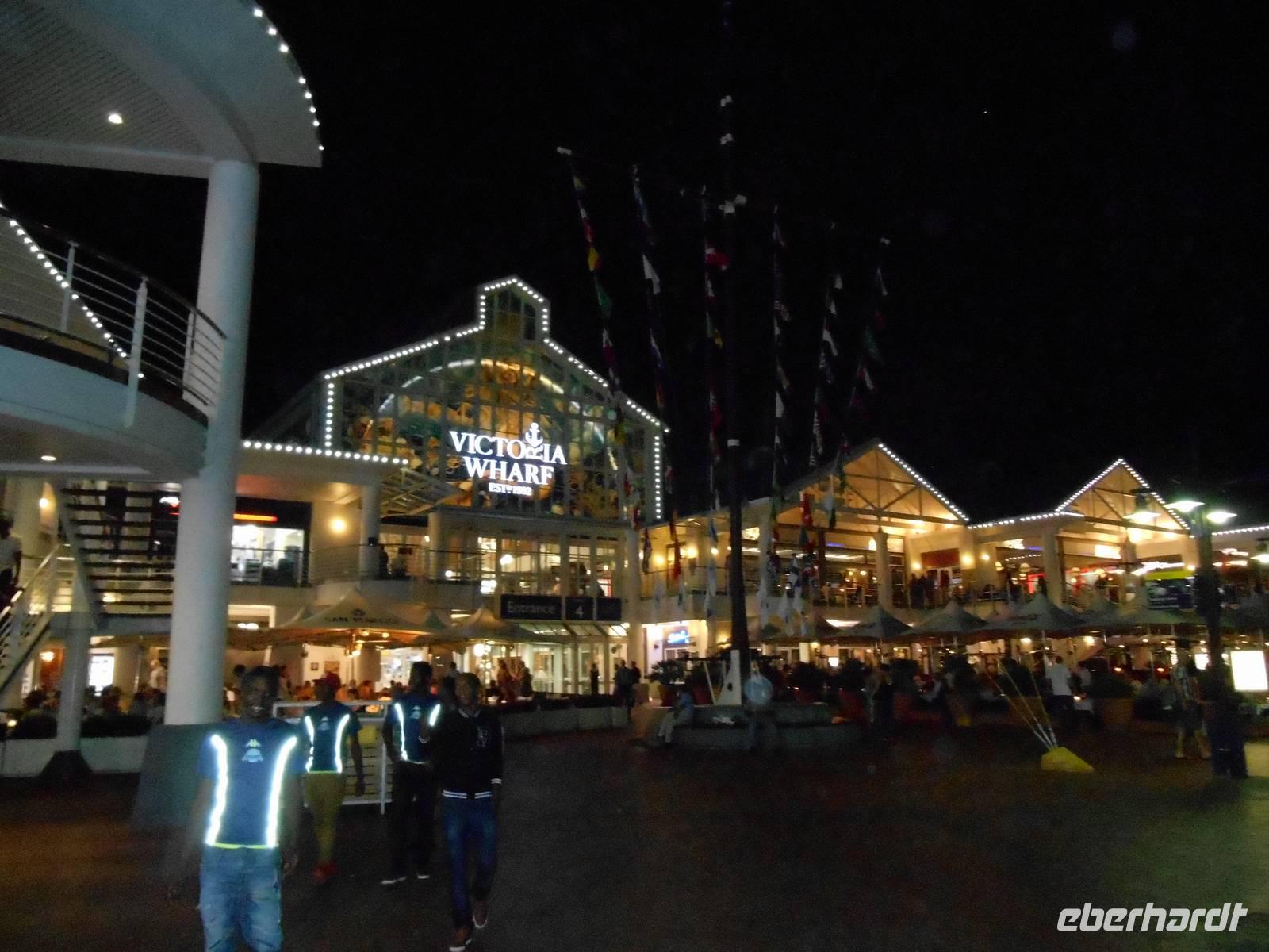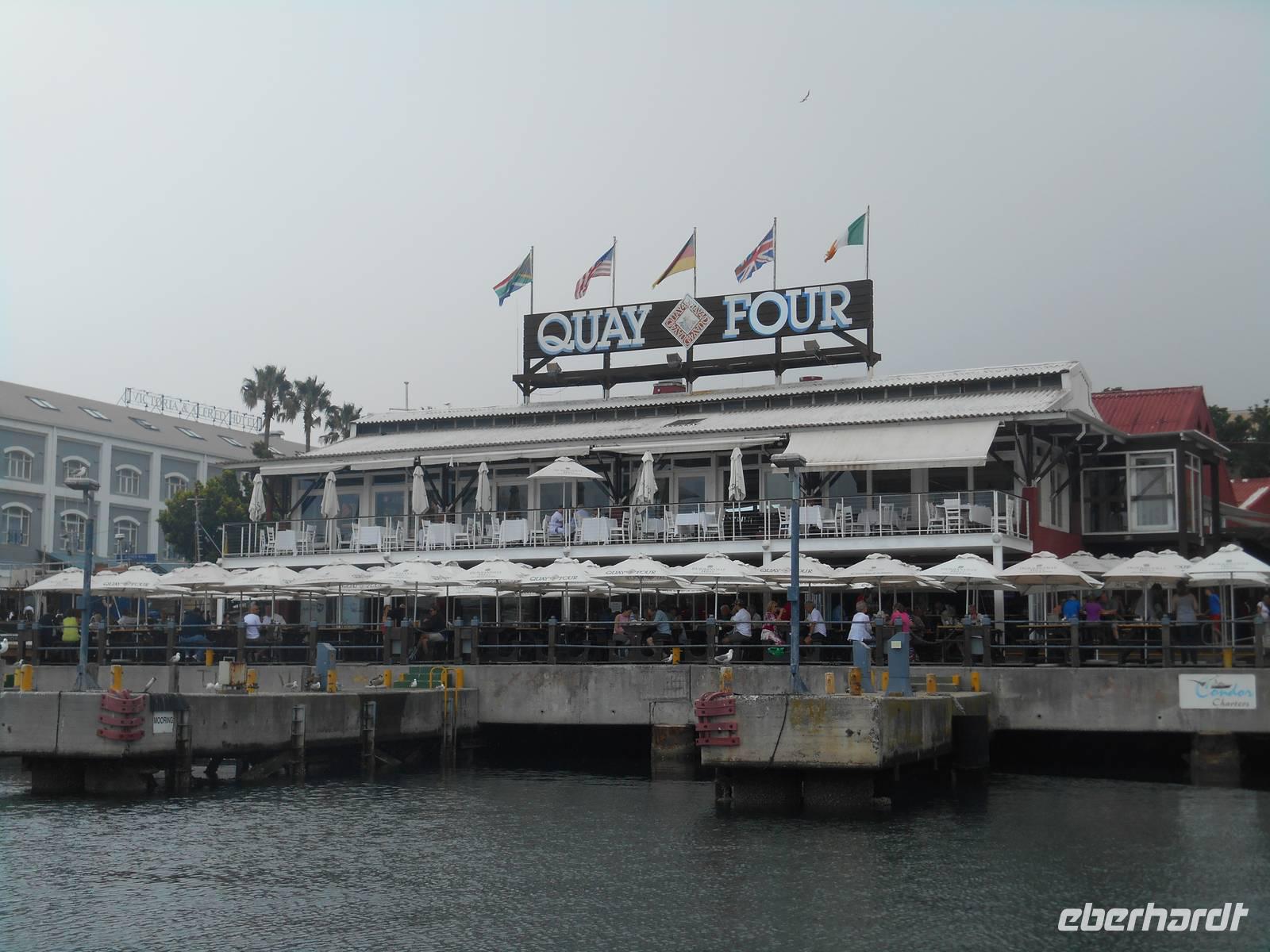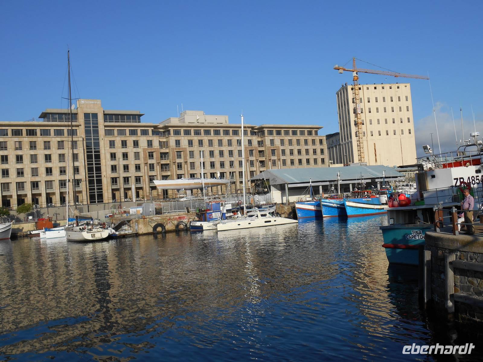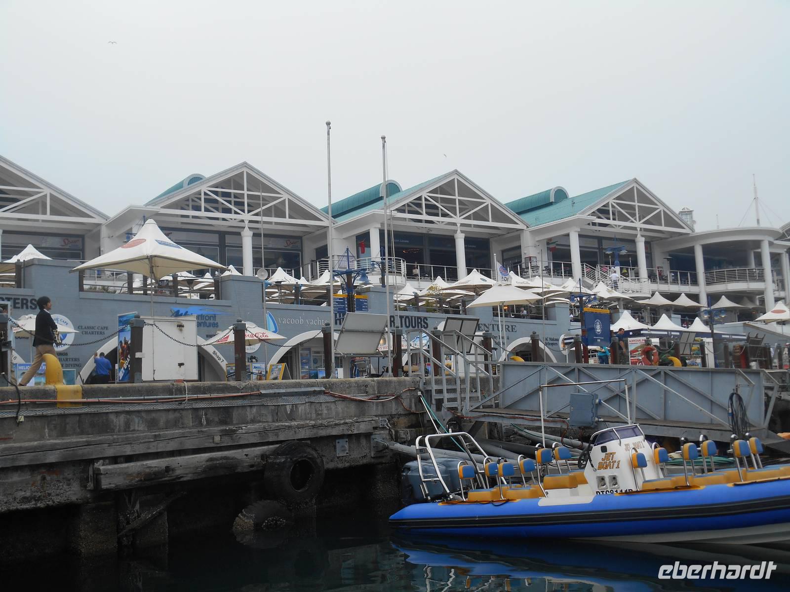 Zum Abschluss unserer Rundfahrt erreichten wir den 350 Meter hohen Signal Hill, von wo wir einen grandiosen Ausblick auf Kapstadt mit seiner Waterfront und der dahinter liegenden Tafelbucht genossen. Des Weiteren erwartete uns hier eine Mitarbeiterin der örtlichen Agentur, um uns mit einem Glas Sekt zu überraschen und auf unsere Ankunft "am schönsten Ende der Welt" anzustoßen! Seit dem 17. Jahrhundert steht hier oben auch die sog. "12-Uhr-Kanone". Ihr Kanonenschuss signalisierte den damaligen Kapstädtern das Ankommen eines neuen Schiffes (daher der Name Signal Hill). Die heutige Kanone wurde 1890 von den Briten zur Verteidigung des Hafens aufgestellt, kam aber nie zum eigentlichen Einsatz. Allerdings wird sie heute aus Tradition zur Schiffsankündigung, jeden Tag, außer Sonntag, um genau 12 Uhr mittags abgefeuert - dies erschrickt natürlich zuweilen die BesucherZwinkernd. Entlang der Küste bzw. über Camps Bay und Clifton ging es nunmehr in unser zentral gelegenes Hotel "City Lodge V&A Waterfront". Wir waren mittlerweile alle etwas müde und auch die Hitze machte uns zu schaffen - schließlich begrüßte uns Kapstadt mit hochsommerlichen Temperaturen um die 30 Grad! Nachdem wir uns etwas frisch gemacht hatten, schlenderten wir am Abend durch die berühmte Waterfront, dem alten Hafen- und Werftviertel Kapstadts, welches heute ein Vergnügungsviertel mit zahlreichen Geschäften und Restaurants ist. Unser Abendessen nahmen wir im hiesigen Restaurant "Karibu" ein, wo wir erste südafrikanische Spezialitäten probieren konnten - einfach leckerLächelnd!