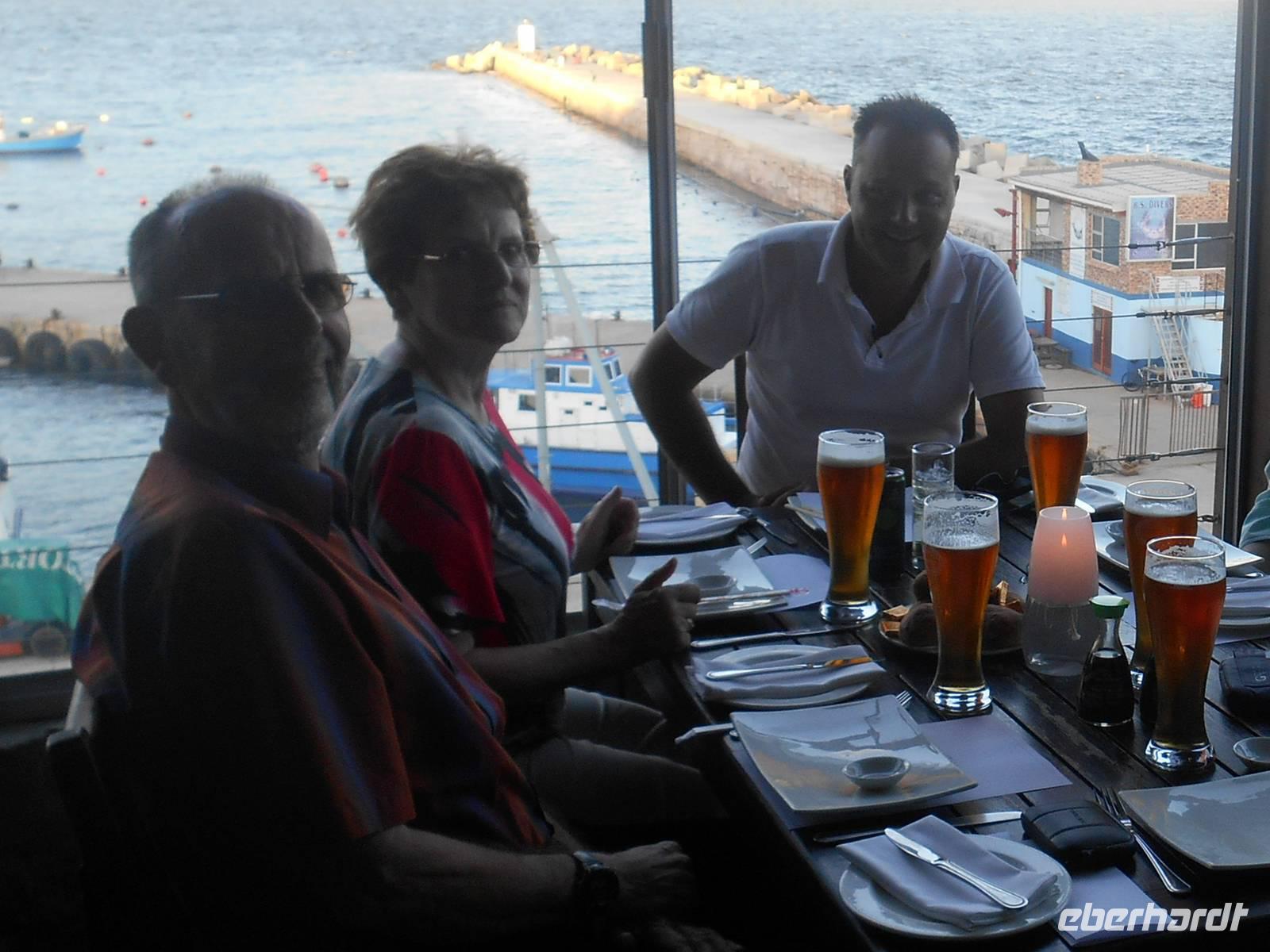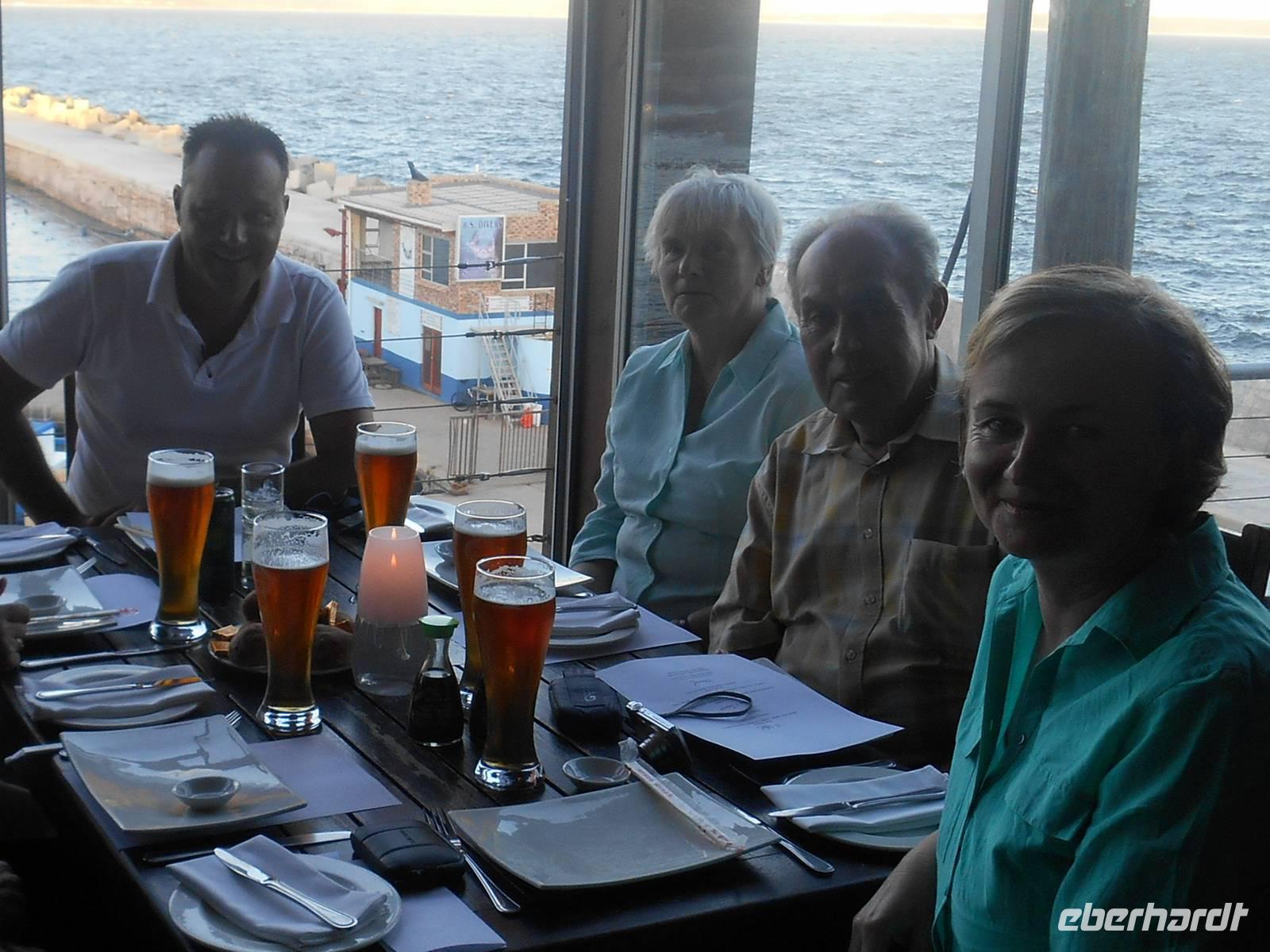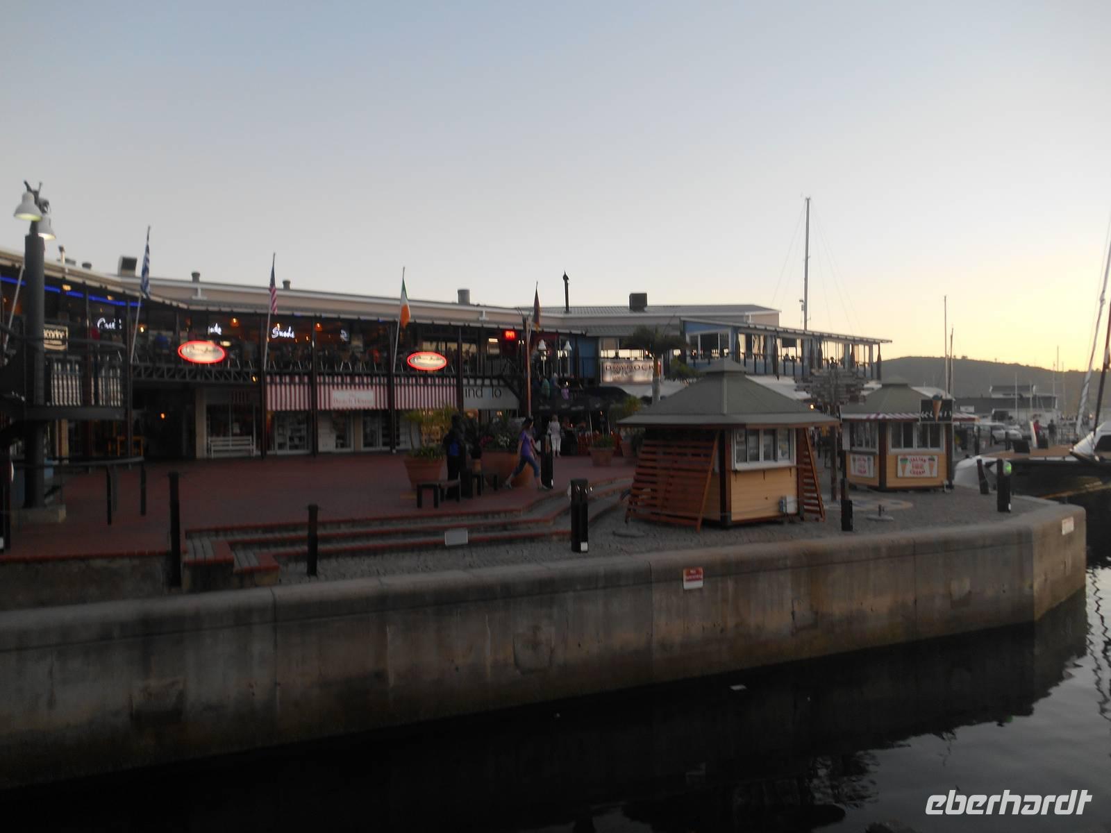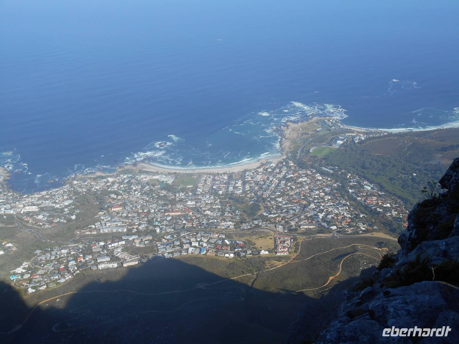 Zum Abschluss unserer Rundfahrt erreichten wir den 350 Meter hohen Signal Hill, von wo wir einen grandiosen Ausblick auf Kapstadt mit seiner Waterfront und der dahinter liegenden Tafelbucht genossen. Des Weiteren erwartete uns hier eine Mitarbeiterin der örtlichen Agentur, um uns mit einem Glas Sekt zu überraschen und auf unsere Ankunft "am schönsten Ende der Welt" anzustoßen! Seit dem 17. Jahrhundert steht hier oben auch die sog. "12-Uhr-Kanone". Ihr Kanonenschuss signalisierte den damaligen Kapstädtern das Ankommen eines neuen Schiffes (daher der Name Signal Hill). Die heutige Kanone wurde 1890 von den Briten zur Verteidigung des Hafens aufgestellt, kam aber nie zum eigentlichen Einsatz. Allerdings wird sie heute aus Tradition zur Schiffsankündigung, jeden Tag, außer Sonntag, um genau 12 Uhr mittags abgefeuert - dies erschrickt natürlich zuweilen die BesucherZwinkernd. Entlang der Küste bzw. über Camps Bay und Clifton ging es nunmehr in unser zentral gelegenes Hotel "City Lodge V&A Waterfront". Wir waren mittlerweile alle etwas müde und auch die Hitze machte uns zu schaffen - schließlich begrüßte uns Kapstadt mit hochsommerlichen Temperaturen um die 30 Grad! Nachdem wir uns etwas frisch gemacht hatten, schlenderten wir am Abend durch die berühmte Waterfront, dem alten Hafen- und Werftviertel Kapstadts, welches heute ein Vergnügungsviertel mit zahlreichen Geschäften und Restaurants ist. Unser Abendessen nahmen wir im hiesigen Restaurant "Karibu" ein, wo wir erste südafrikanische Spezialitäten probieren konnten - einfach leckerLächelnd!