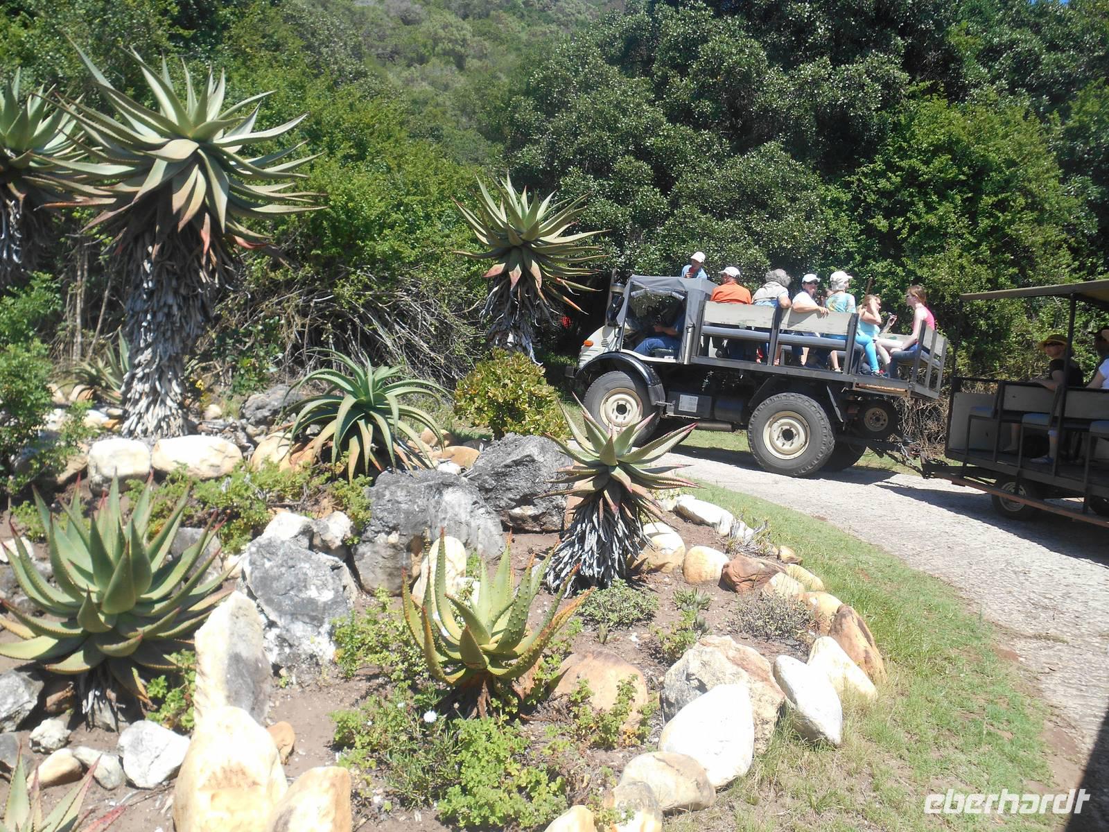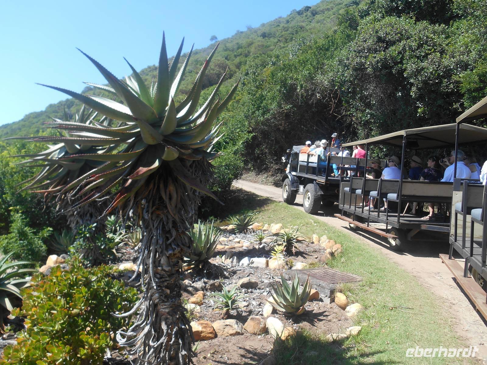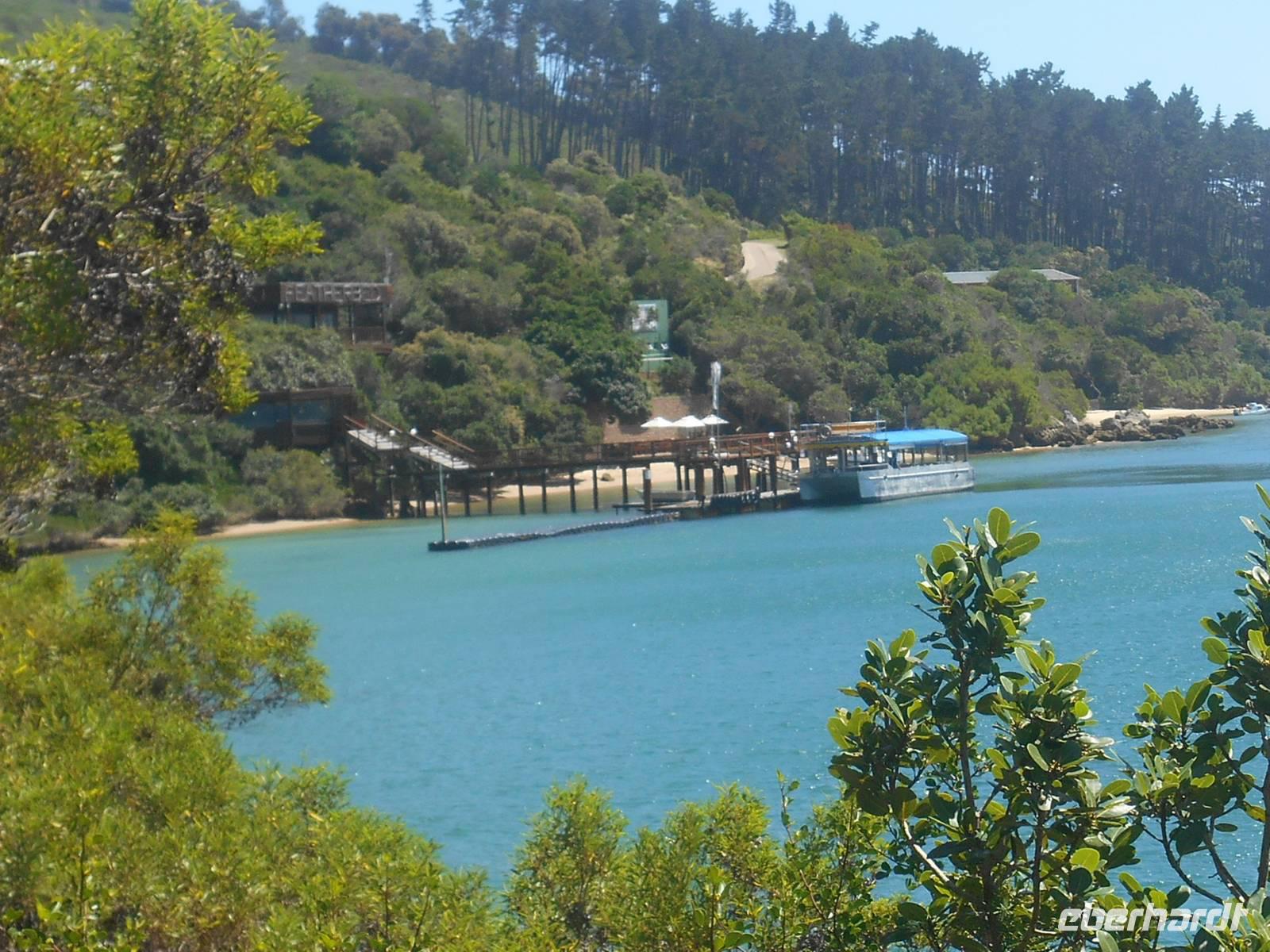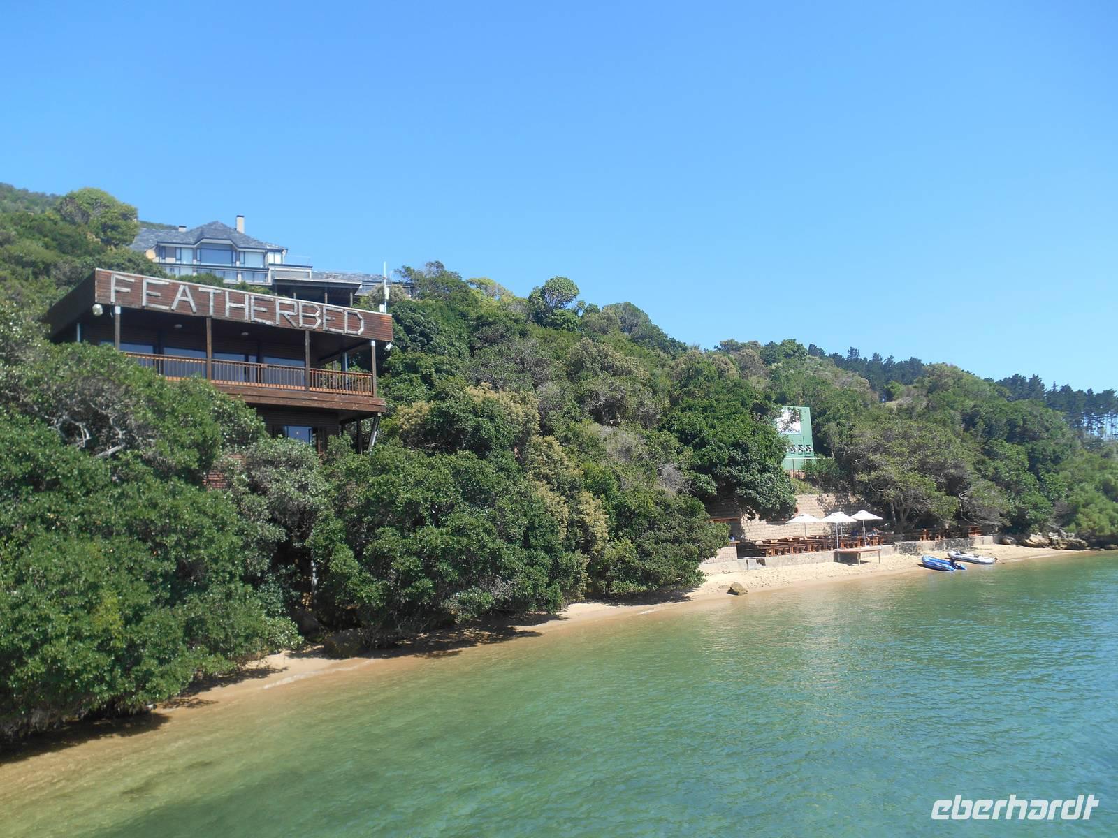 Den heutigen Tag ließen wir ganz in Ruhe angehen, denn unsere Fähre zum Featherbed Naturreservat legte erst um 10 Uhr im Hafen von Knysna ab. Nach einer 25-minütigen Fährüberfahrt erreichten wir schließlich das etwa 150 Hektar große private Naturreservat. Weiter wurden wir dann mit einem Geländewagen mit Anhängern bis an die höchste Spitze des Reservats gefahren. Immer wieder wurden wir mit wundervollen Panoramablicken auf die Lagune von Knysna überrascht! Oben angekommen, unternahmen wir eine reichlich zwei Kilometer lange geführte Wanderung nach unten durch Küstenwald und Fynbos bzw. teilweise entlang der Klippen. Es war einzigartig und auch das Wetter hatte es heute wieder gut mit uns gemeint. Im Restaurant der Featherbed-Lodge angekommen, erwartete uns ein hervorragendes Mittagsbuffet - wir hatten genügend Zeit zum Essen, bevor es mit der Fähre wieder zurück nach Knysna ging. Ein toller Ausflug lag hinter uns!