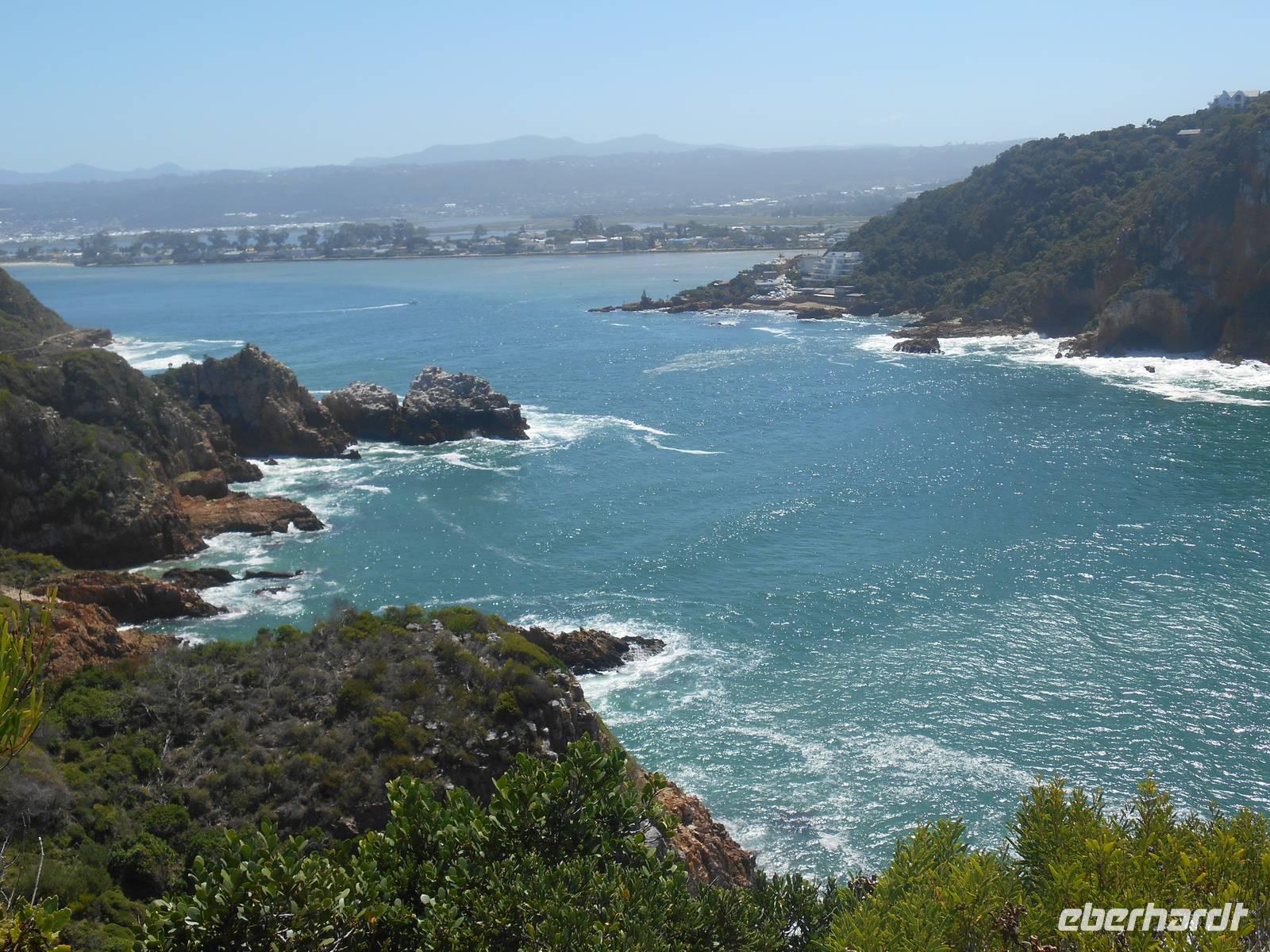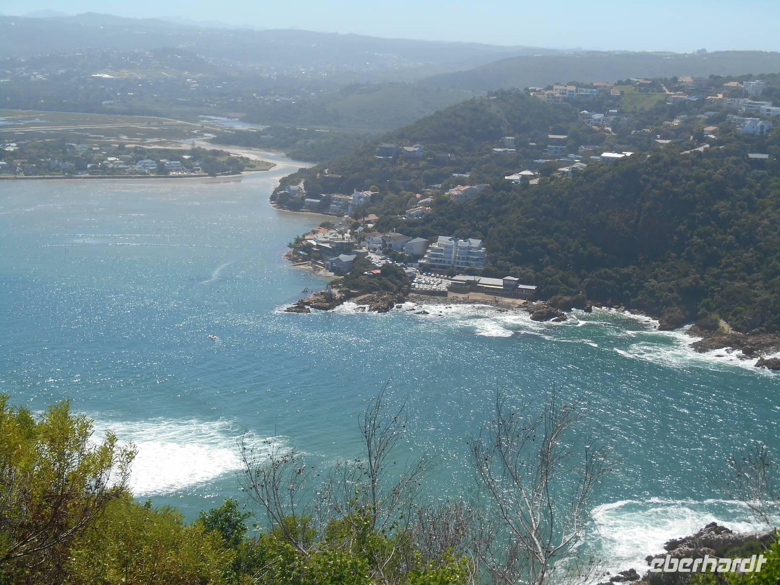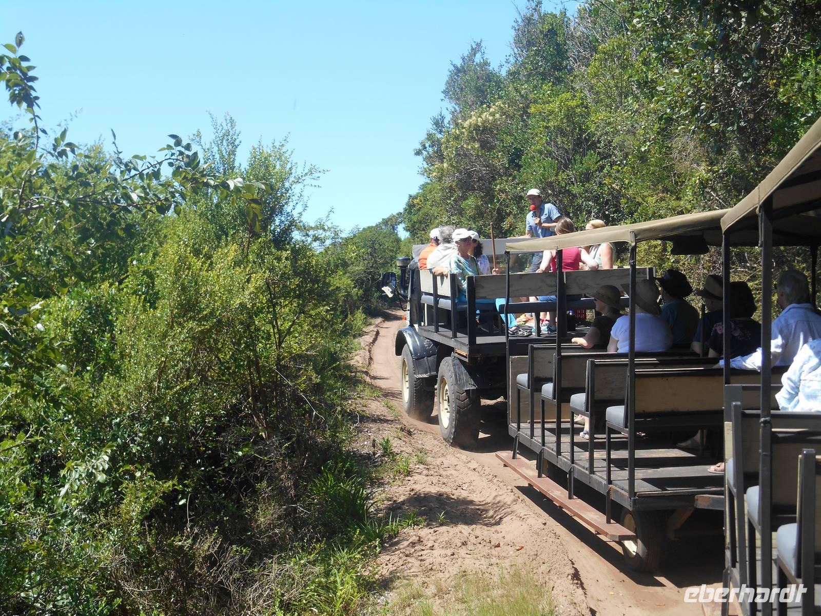 Den heutigen Tag ließen wir ganz in Ruhe angehen, denn unsere Fähre zum Featherbed Naturreservat legte erst um 10 Uhr im Hafen von Knysna ab. Nach einer 25-minütigen Fährüberfahrt erreichten wir schließlich das etwa 150 Hektar große private Naturreservat. Weiter wurden wir dann mit einem Geländewagen mit Anhängern bis an die höchste Spitze des Reservats gefahren. Immer wieder wurden wir mit wundervollen Panoramablicken auf die Lagune von Knysna überrascht! Oben angekommen, unternahmen wir eine reichlich zwei Kilometer lange geführte Wanderung nach unten durch Küstenwald und Fynbos bzw. teilweise entlang der Klippen. Es war einzigartig und auch das Wetter hatte es heute wieder gut mit uns gemeint. Im Restaurant der Featherbed-Lodge angekommen, erwartete uns ein hervorragendes Mittagsbuffet - wir hatten genügend Zeit zum Essen, bevor es mit der Fähre wieder zurück nach Knysna ging. Ein toller Ausflug lag hinter uns!
