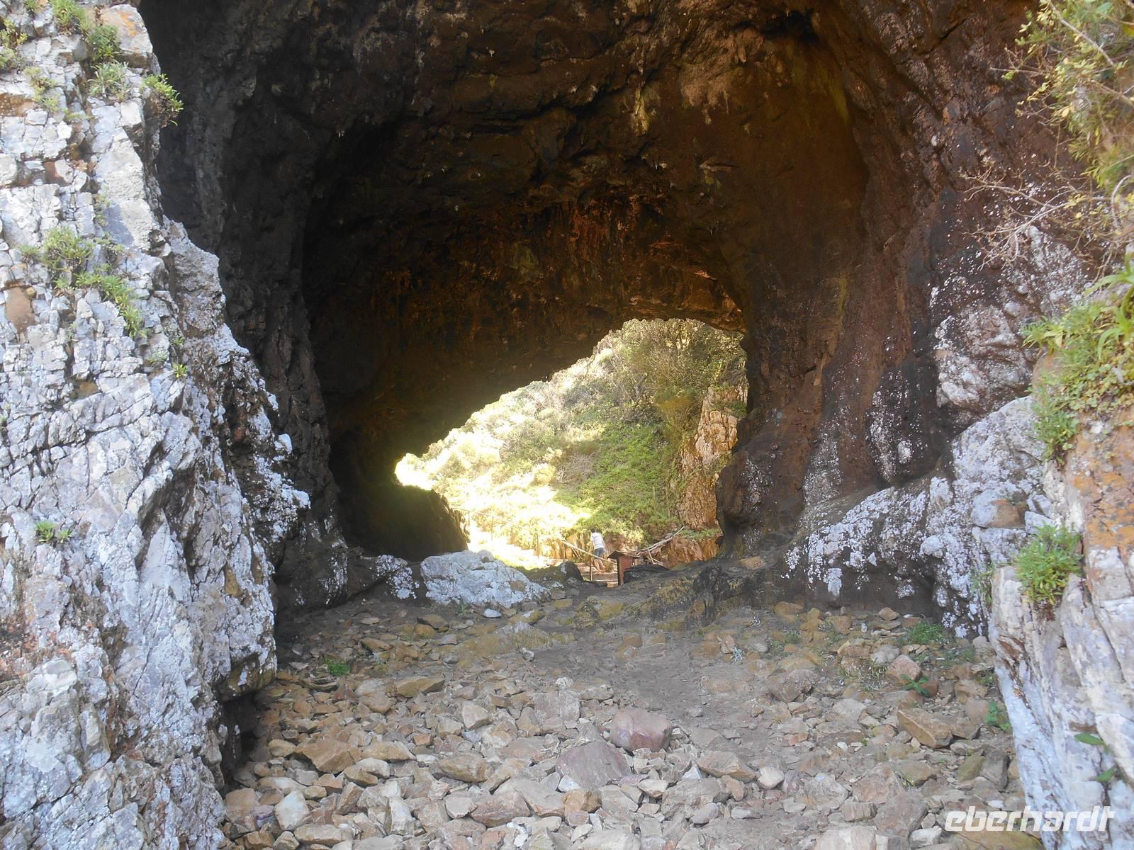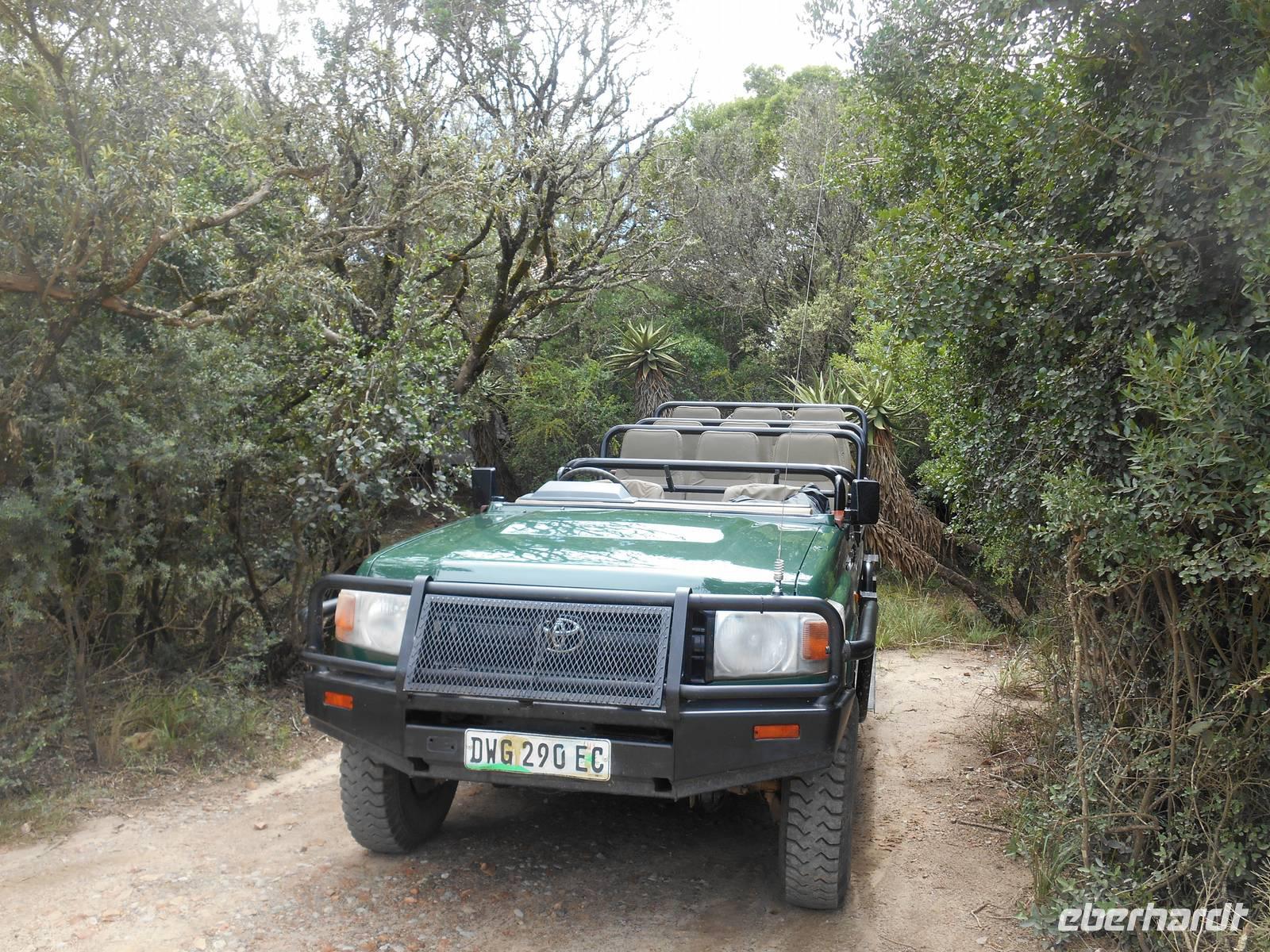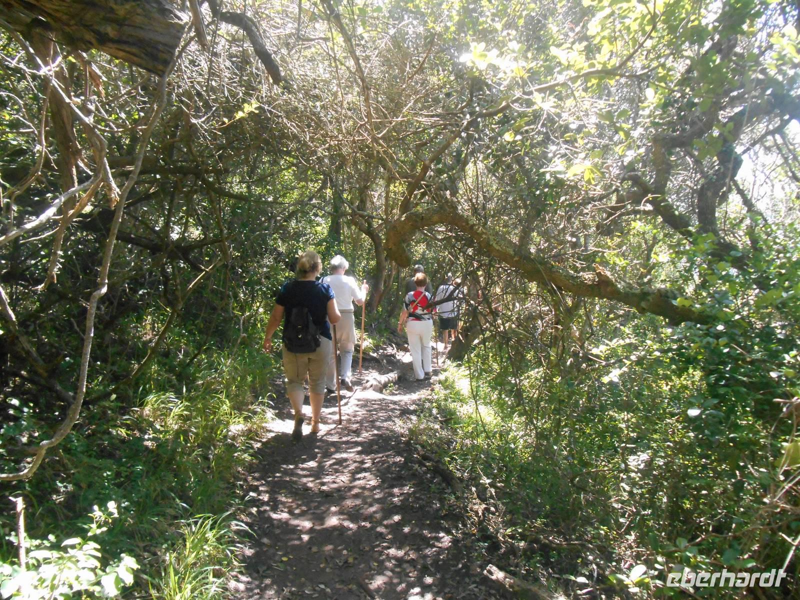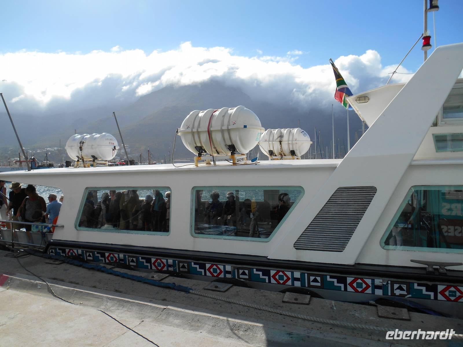 Den heutigen Tag ließen wir ganz in Ruhe angehen, denn unsere Fähre zum Featherbed Naturreservat legte erst um 10 Uhr im Hafen von Knysna ab. Nach einer 25-minütigen Fährüberfahrt erreichten wir schließlich das etwa 150 Hektar große private Naturreservat. Weiter wurden wir dann mit einem Geländewagen mit Anhängern bis an die höchste Spitze des Reservats gefahren. Immer wieder wurden wir mit wundervollen Panoramablicken auf die Lagune von Knysna überrascht! Oben angekommen, unternahmen wir eine reichlich zwei Kilometer lange geführte Wanderung nach unten durch Küstenwald und Fynbos bzw. teilweise entlang der Klippen. Es war einzigartig und auch das Wetter hatte es heute wieder gut mit uns gemeint. Im Restaurant der Featherbed-Lodge angekommen, erwartete uns ein hervorragendes Mittagsbuffet - wir hatten genügend Zeit zum Essen, bevor es mit der Fähre wieder zurück nach Knysna ging. Ein toller Ausflug lag hinter uns!