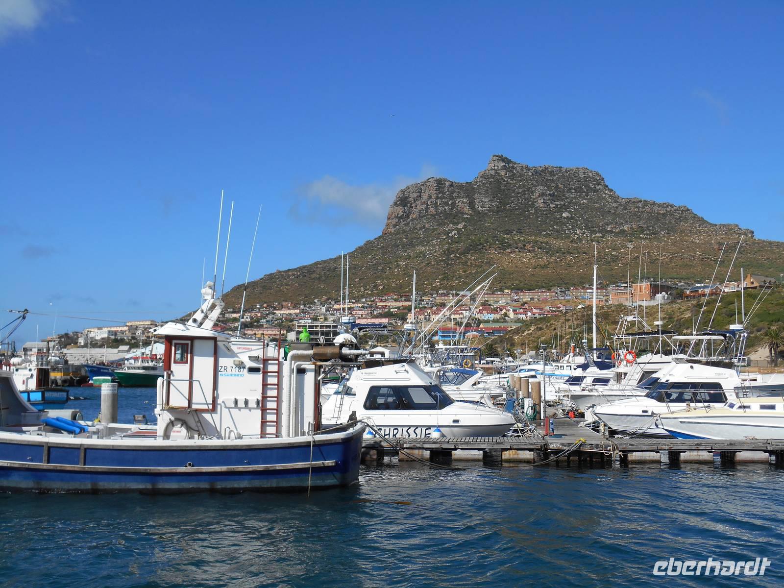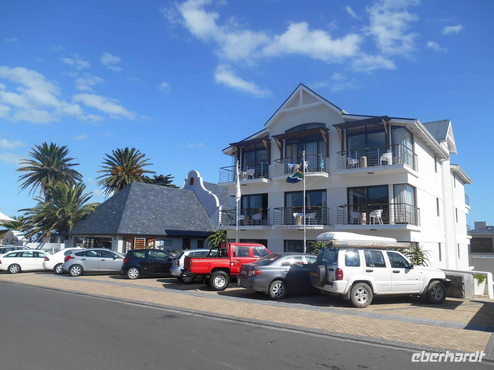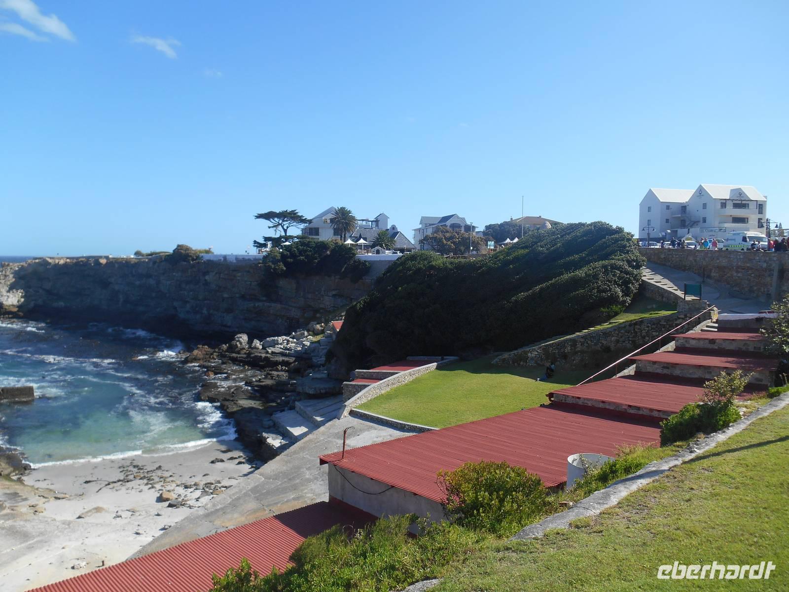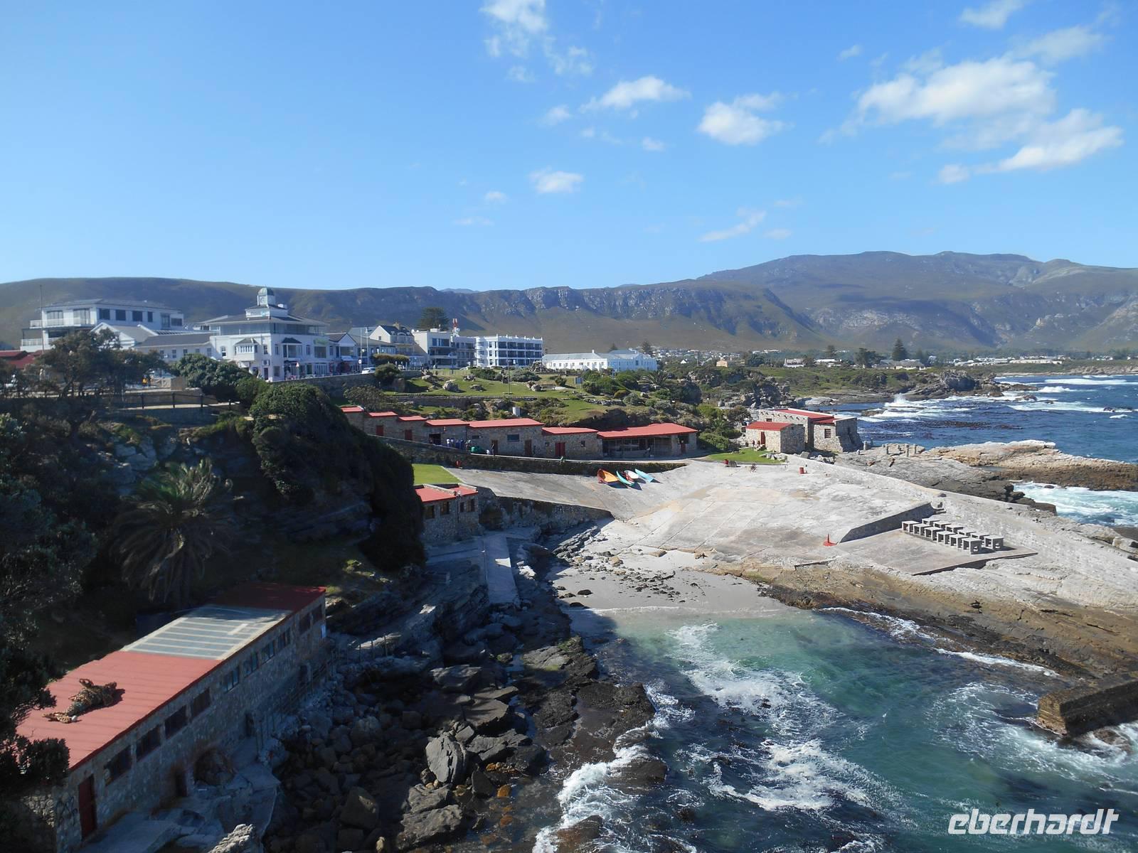 Alles hat ein Ende - der Abschied von Kapstadt nahte! Da heute eigentlich nur die ca. 130 Kilometer lange Fahrt von Kapstadt nach Hermanus anstand, entschlossen wir uns kurzerhand, ein paar weitere Attraktionen entlang unserer Fahrtroute in unser Reiseprogramm zu integrieren. Die Fahrt führte uns in Richtung Somerset West, genauer gesagt nach Strand. Hier gibt es einen interessanten Geparden-Park und wir konnten uns hier eindrücklich über das Leben dieser geschützten Tiere informieren. Das Highlight des Parks ist das Gehege, in welchem man hautnah mit den Geparden in Kontakt kommen kann. Unter der Aufsicht eines Tierpflegers darf man in kleinen Gruppen in ein Gehege mit 2-3 Geparden - eine einzige Mutige gab es auch in unserer Gruppe! Nach diesen tierischen Eindrücken machten wir noch einen kurzen Aufenthalt in der sog. "False Bay" (Strand) und warfen auch die letzten Blicke hinüber zur Kap-Halbinsel. False Bay heißt wörtlich übersetzt "falsche Bucht". Der Name entstand dadurch, dass Seefahrer in der Vergangenheit irrtümlich annahmen, sie hätten das Kap bereits umsegelt. Die False Bay ließen wir bei Gordon´s Bay hinter uns und entlang der wunderschönen Küstenstraße führte uns unser Weg nach Betty´s Bay, wo wir Harold Porter´s Botanischen Garten besuchten. Die ersten Paviane empfingen uns hier bereits am Parkplatz! Dieser ruhige Garten befindet sich zwischen den Bergen und dem Meer im Herzen der Fynbos-Region. Er bietet die Möglichkeit von ebenen Rasenflächen und farbenfrohen Blumenbeeten mit einheimischen Pflanzen zu natürlichen Fynbos-Biotopen am Berghang zu wandern. Fynbos findet man auf nährstoffarmen Sandsteinböden in den Bergen und Tälern und ist durch Straucharten charakterisiert, die feine und harte Blätter haben. Eingeschlossen sind auch solche Pflanzen wie: Proteen, Erikaarten, Leguminosen und Zwiebelpflanzen wie Iris und Lilien sowie die schilfartigen Restios an Stelle von Gras. Nach diesem Rundgang an der frischen Luft bekamen wir allmählich etwas Hunger - die Mittagszeit war schließlich längst angebrochen! Bei einem Bummel durch einen Supermarkt in Kleinmond versorgten wir uns mit Lebensmitteln wie Wurst, Käse und Brot bzw. Getränken, um uns am Strand von Kleinmond bei einem Mittags-Picknick zu stärken! Am Nachmittag checkten wir im stilvollen "Harbour House Hotel" in Hermanus ein, um die restliche Zeit bis zum Abendessen ganz individuell zu verbringen. Hermanus wird jedes Jahr zwischen Juni und Dezember von den Southern Right Walen besucht und bewohnt und ist weltbekannt hierfür. Da wir jedoch außerhalb der Wal-Saison hier waren, beschränkten wir uns auf einen gemütlichen Spaziergang durch das beschauliche Städtchen. Zum Abendessen wurden wir heute im "Harbour Rock Restaurant" erwartet - auf der Spitze der Klippe mit Blick auf den Hafen von Hermanus gelegen. Dies ist der ideale Ort, um den atemberaubenden Meerblick über die Bucht zu genießen - eine Ansicht, die übrigens nur noch vom Ambiente des Restaurants und dem wahrhaft perfekten Essen übertroffen wurde!