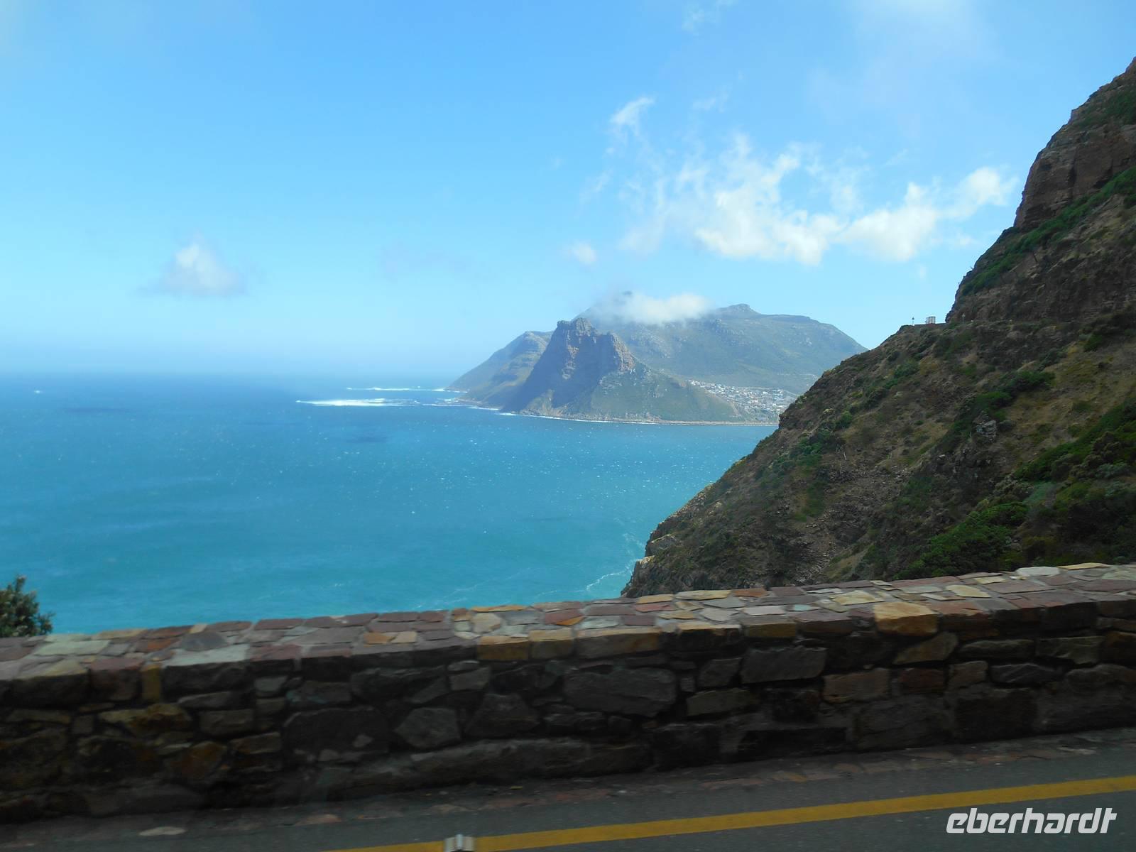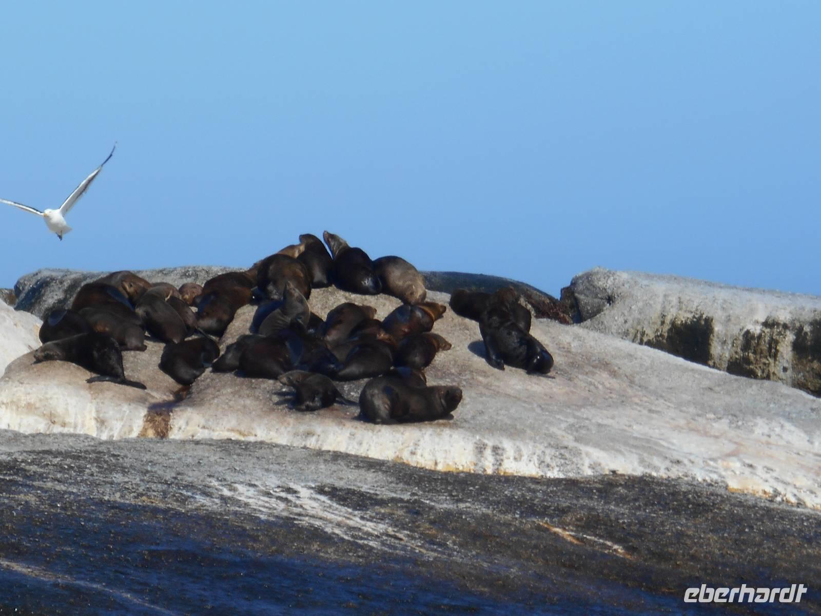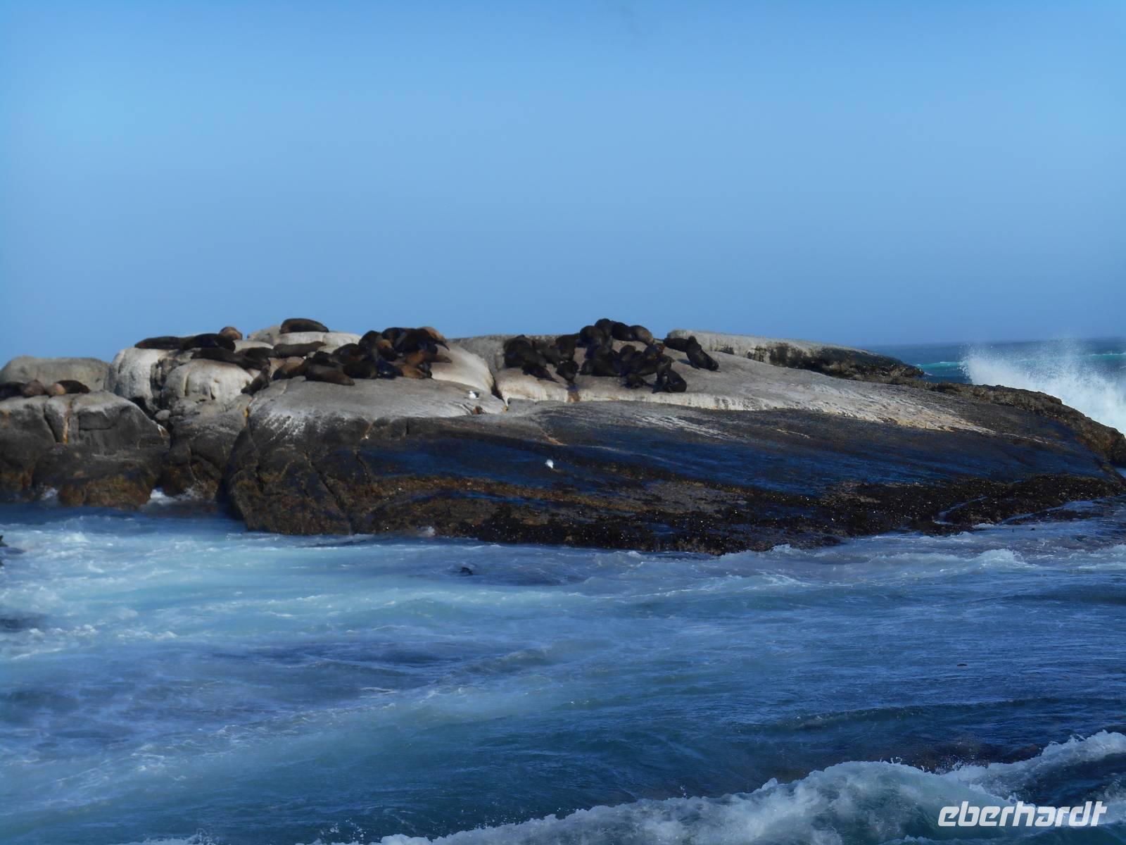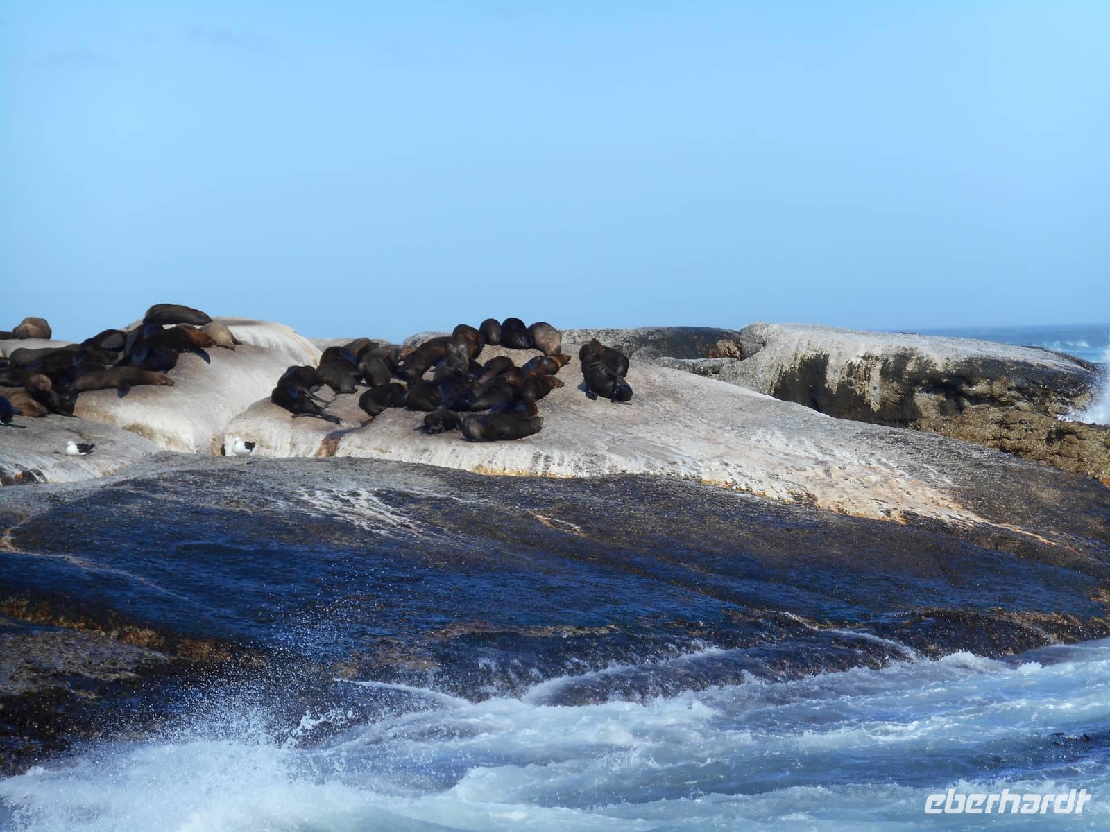 Ausgeruht und gut gestärkt vom reichhaltigen Frühstücksbuffet nahmen wir unsere traumhafte Panoramafahrt in Richtung Süden auf. Die Route führte uns vorerst durch die Küstenorte Camps Bay und Clifton bis zum Hafen von Hout Bay, von wo aus wir eine kleine Schifffahrt zur etwa 1.500 Quadratmeter großen Insel "Duiker Island" unternahmen. In der Sommerzeit tummeln sich hier bis zu 8.000 Robben - wir konnten Hunderte davon beobachten! Nebenbei sieht man hier unzählige Seevögel, die auf die Überreste der Fischfänge der Pelzrobben lauern. Wieder an Land, fuhren wir weiter auf einer der berühmtesten und wohl schönsten Küstenstraßen Südafrikas - dem sog. "Chapman's Peak Drive". Er schlängelt sich in 114 Kurven zwischen Meer und steilen Felswänden von Hout Bay nach Noordhoek entlang und bietet eine wunderschöne Kulisse und atemberaubende Aussichten. Aus diesem Grund drehen auch viele Autokonzerne ihre Werbeaufnahmen hier.