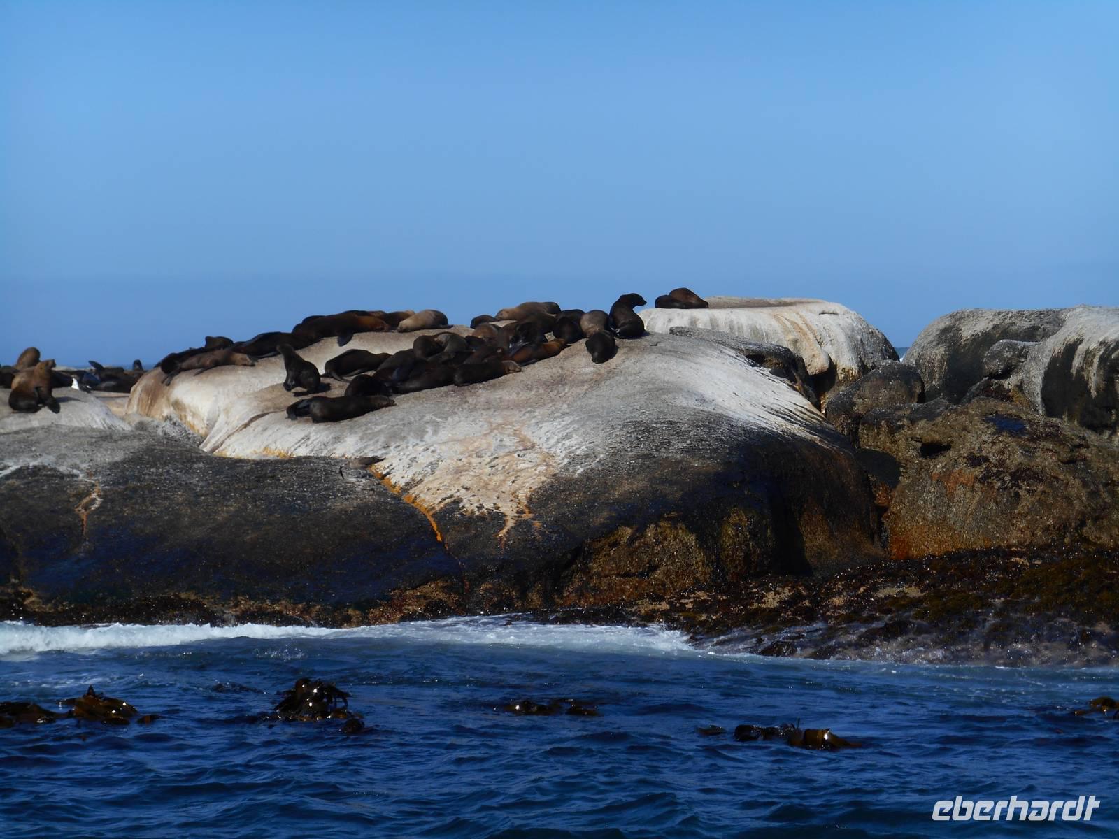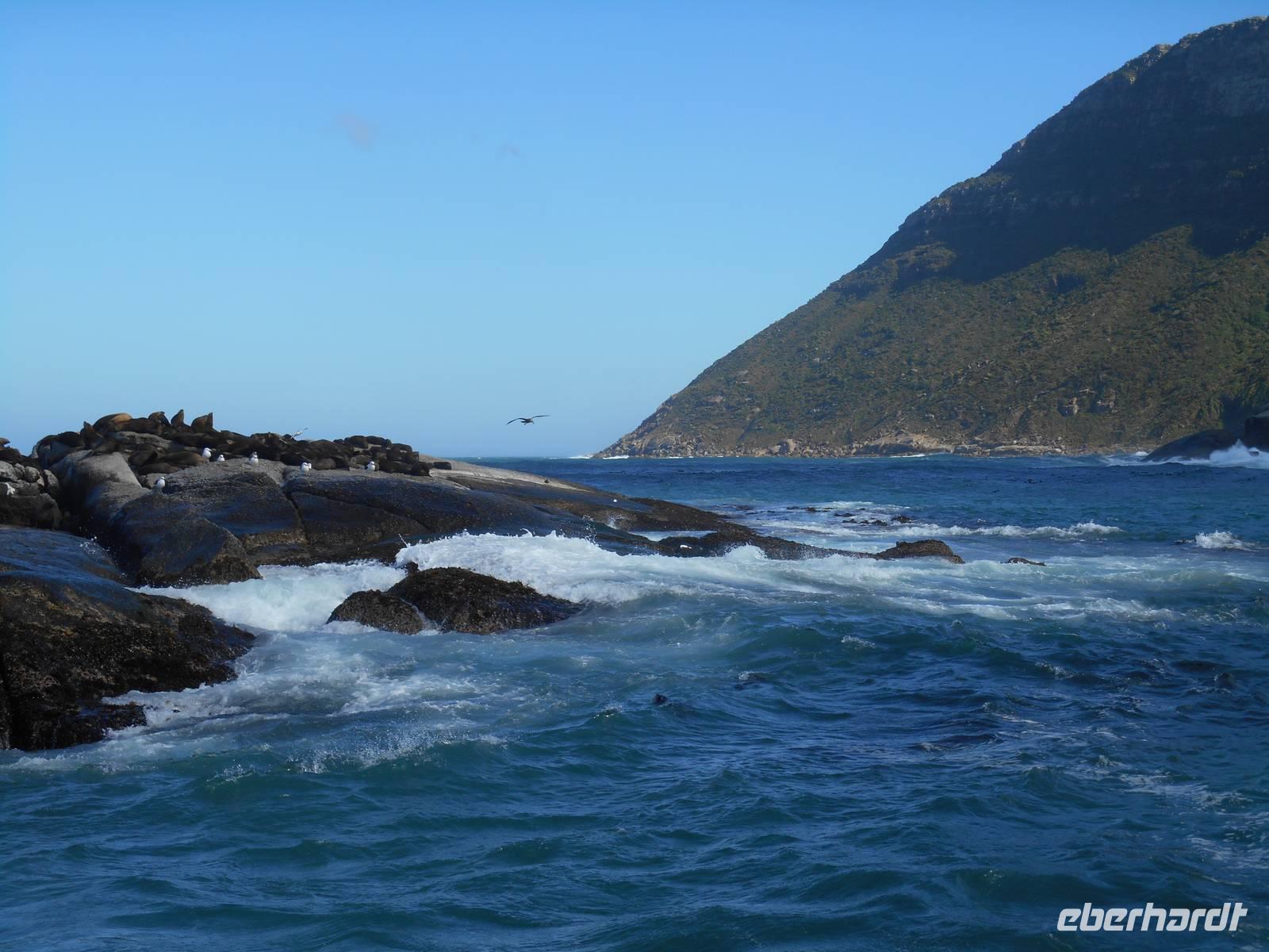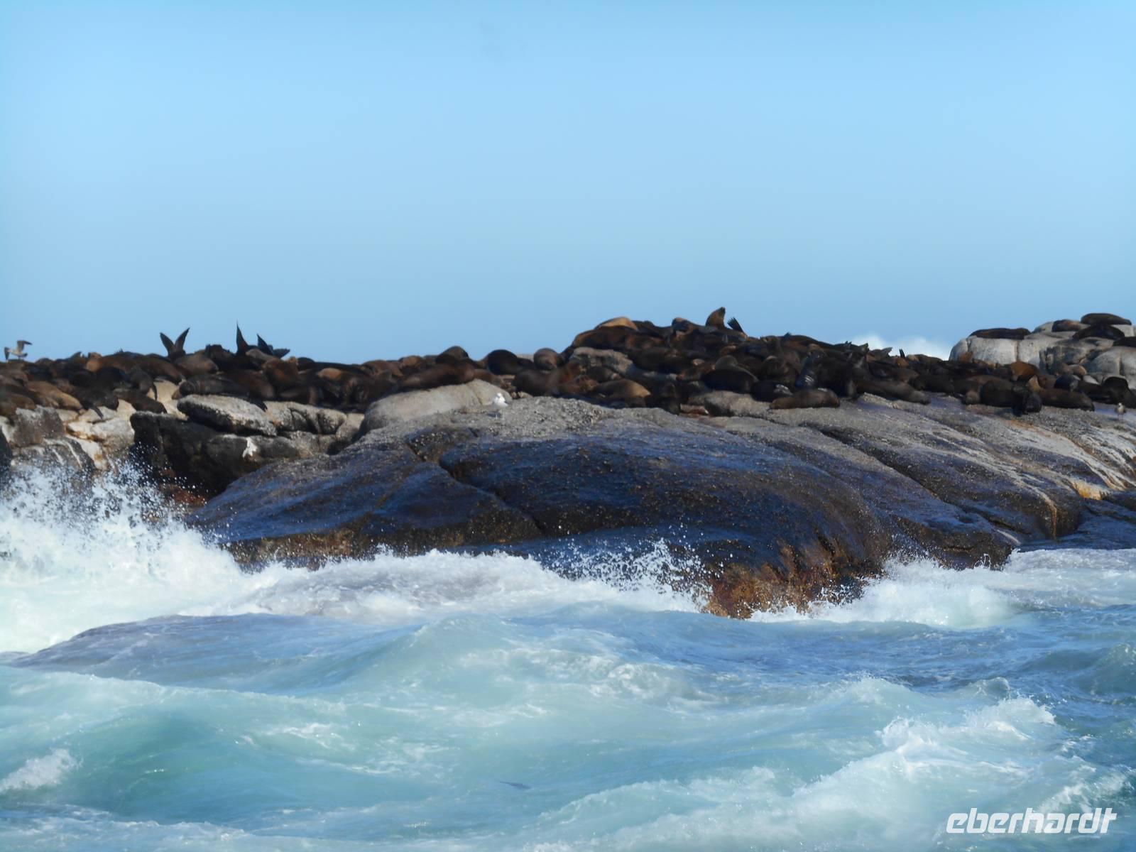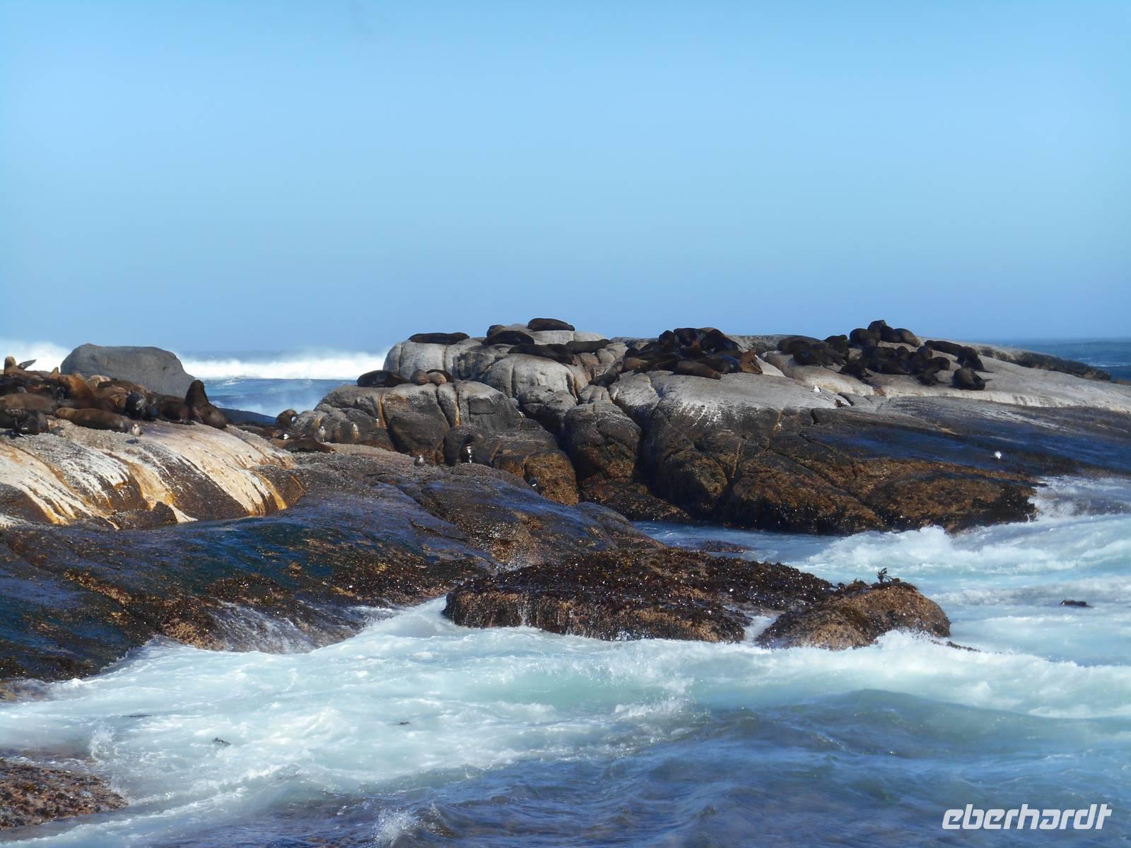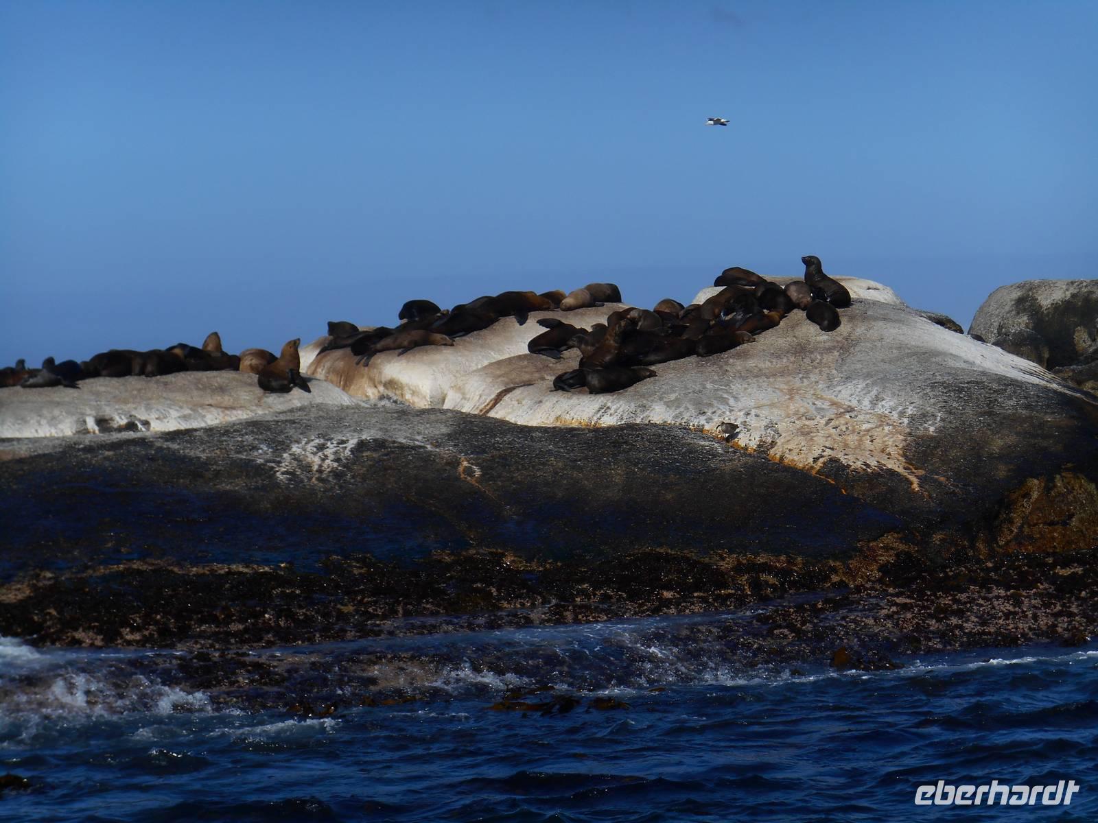 Ausgeruht und gut gestärkt vom reichhaltigen Frühstücksbuffet nahmen wir unsere traumhafte Panoramafahrt in Richtung Süden auf. Die Route führte uns vorerst durch die Küstenorte Camps Bay und Clifton bis zum Hafen von Hout Bay, von wo aus wir eine kleine Schifffahrt zur etwa 1.500 Quadratmeter großen Insel "Duiker Island" unternahmen. In der Sommerzeit tummeln sich hier bis zu 8.000 Robben - wir konnten Hunderte davon beobachten! Nebenbei sieht man hier unzählige Seevögel, die auf die Überreste der Fischfänge der Pelzrobben lauern. Wieder an Land, fuhren wir weiter auf einer der berühmtesten und wohl schönsten Küstenstraßen Südafrikas - dem sog. "Chapman's Peak Drive". Er schlängelt sich in 114 Kurven zwischen Meer und steilen Felswänden von Hout Bay nach Noordhoek entlang und bietet eine wunderschöne Kulisse und atemberaubende Aussichten. Aus diesem Grund drehen auch viele Autokonzerne ihre Werbeaufnahmen hier.