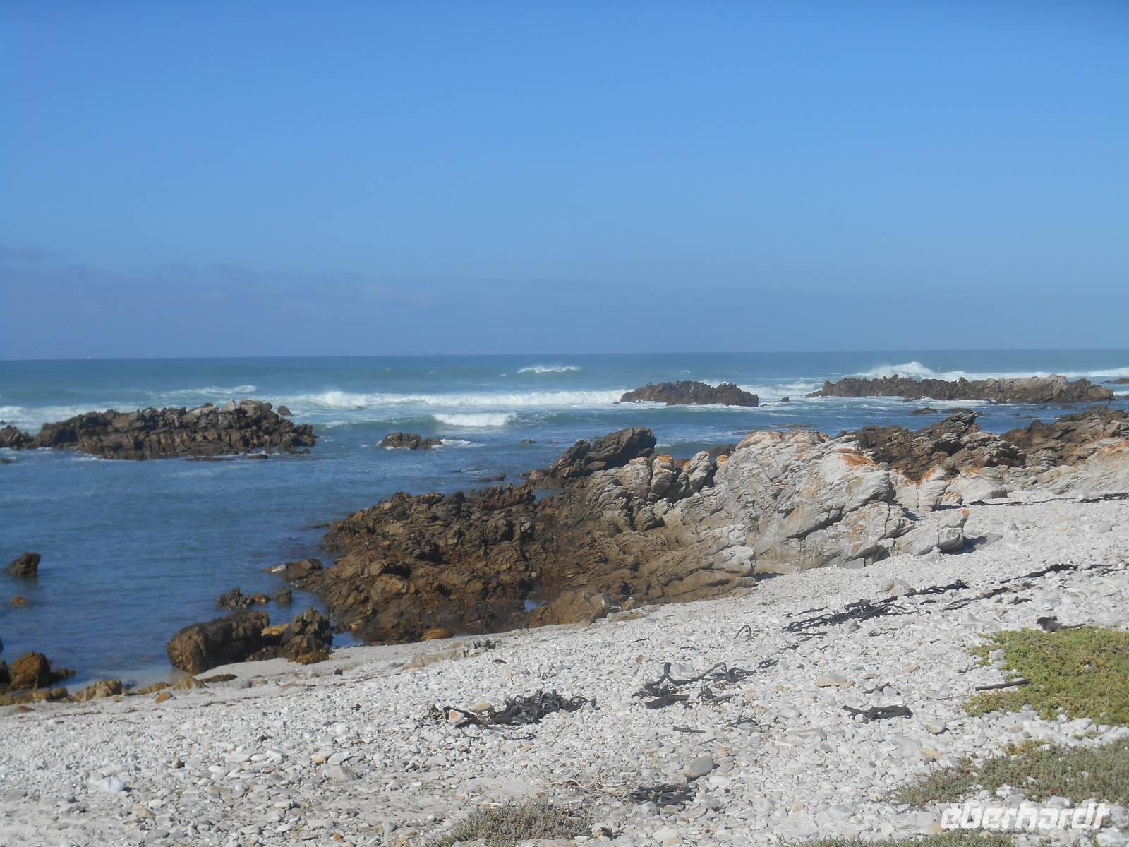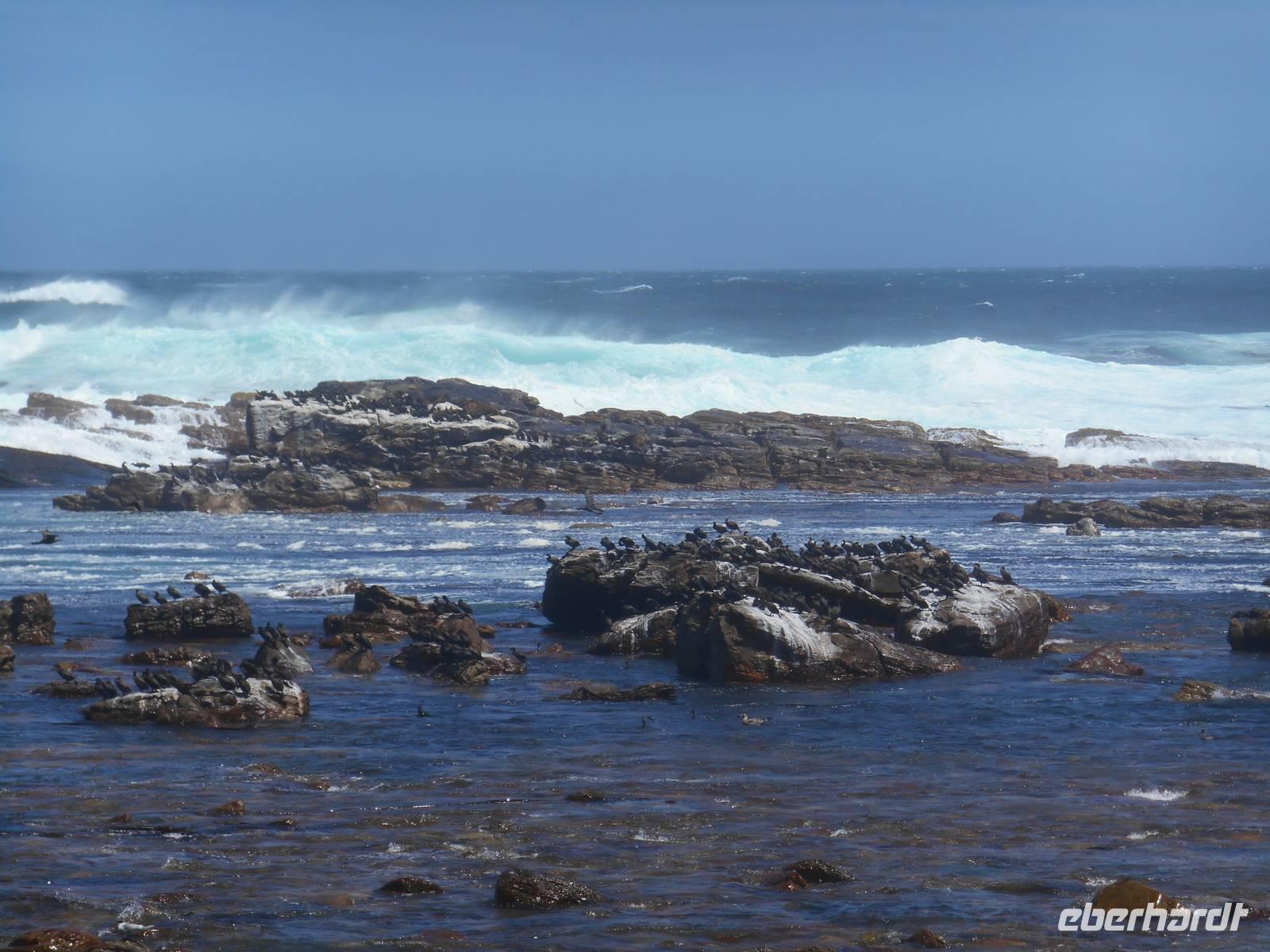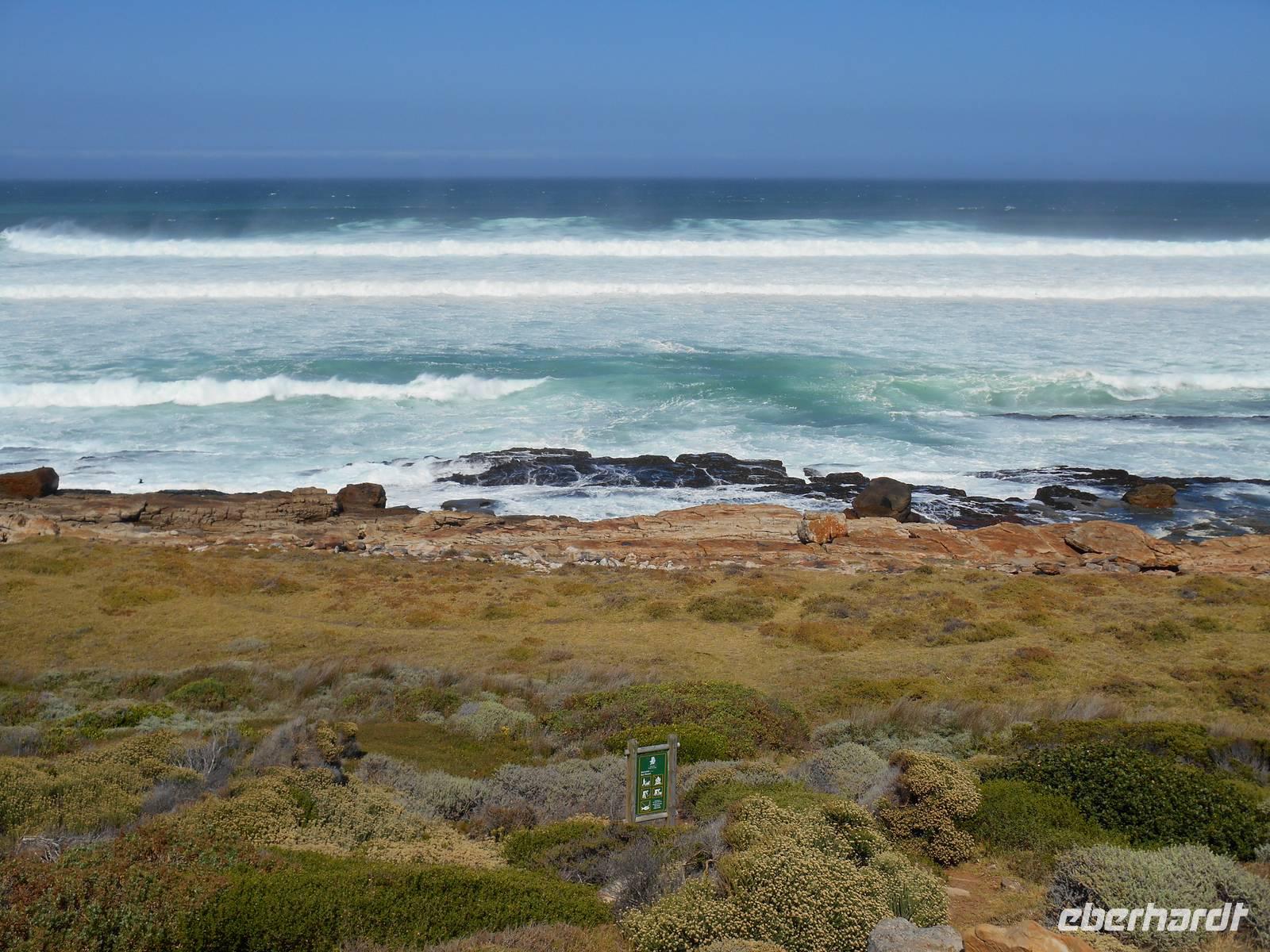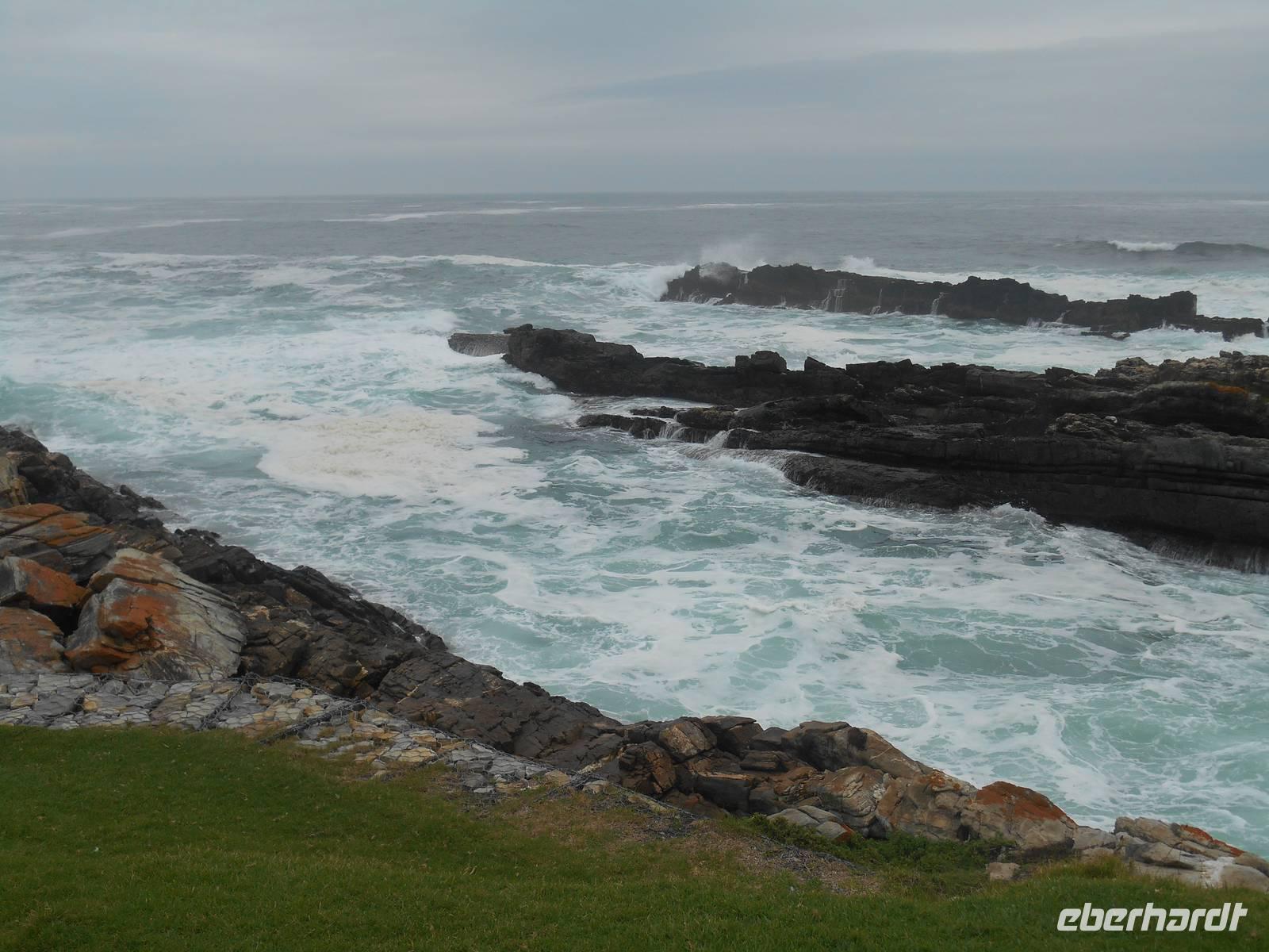 Das Motto des heutigen Tages: "Der frühe Vogel fängt den Wurm ...!" Zeitiges Aufstehen war angesagt und ausgestattet mit Frühstücksboxen starteten wir bereits um 7 Uhr. Aufregung machte sich breit, weil unser Reiseleiter Chris kurzzeitig seine gesamten Papiere und Kreditkarten verloren hatte - glücklicherweise klärte sich diese Situation nach nur wenigen Minuten auf, er hatte seine Geldbörse am Vorabend im "Harbour Rock Restaurant" liegen gelassen und konnte sie dort auch wieder in Empfang nehmen. Wir hatten uns für heute viel vorgenommen und waren uns wieder mal einig - wir wollten einmal am südlichsten Punkt Afrikas stehen! Wiederum zusätzlich zu unserem eigentlichen Programm erreichten wir nach einer knapp 2-stündigen Fahrt das Cape Agulhas. Geographisch betrachtet, ist dieses Kap nicht nur das südlichste, sondern es gilt auch als offizielle Trennungslinie zwischen Indischem und Atlantischem Ozean - andere Wissenschaftler nennen aber auch andere Linien. Direkt hinter dem Leuchtturm befindet sich der "Southernmost Point" und der Punkt, "where the Oceans meet", doch mehr als eine Gedenkplatte gab es dann auch wieder nicht zu bewundern. Die Natur hier ist allerdings beeindruckend bizarr und so nutzten wir auch gleich die Gelegenheit, um hier zu frühstücken - in dieser Umgebung schmeckte es gleich nochmal so gutZwinkernd! Fazit - ein Besuch lohnt sich allemal. Kleine Fischerdörfer wie Arniston, Struisbaai und Agulhas mit ihren reetgedeckten Häusern und langen Stränden haben ein besonderes Flair. Eine lange Fahrt lag anschließend vor uns und dennoch kamen wir pünktlich zur Mittagszeit in Mossel Bay an, wo für uns im direkt am Meer gelegenen Restaurant "The Kingfisher" ein Mittagessen reserviert war - es gab unter anderem Straußenfleisch und natürlich eine Auswahl verschiedener Fischgerichte bzw. Meeresfrüchte.
