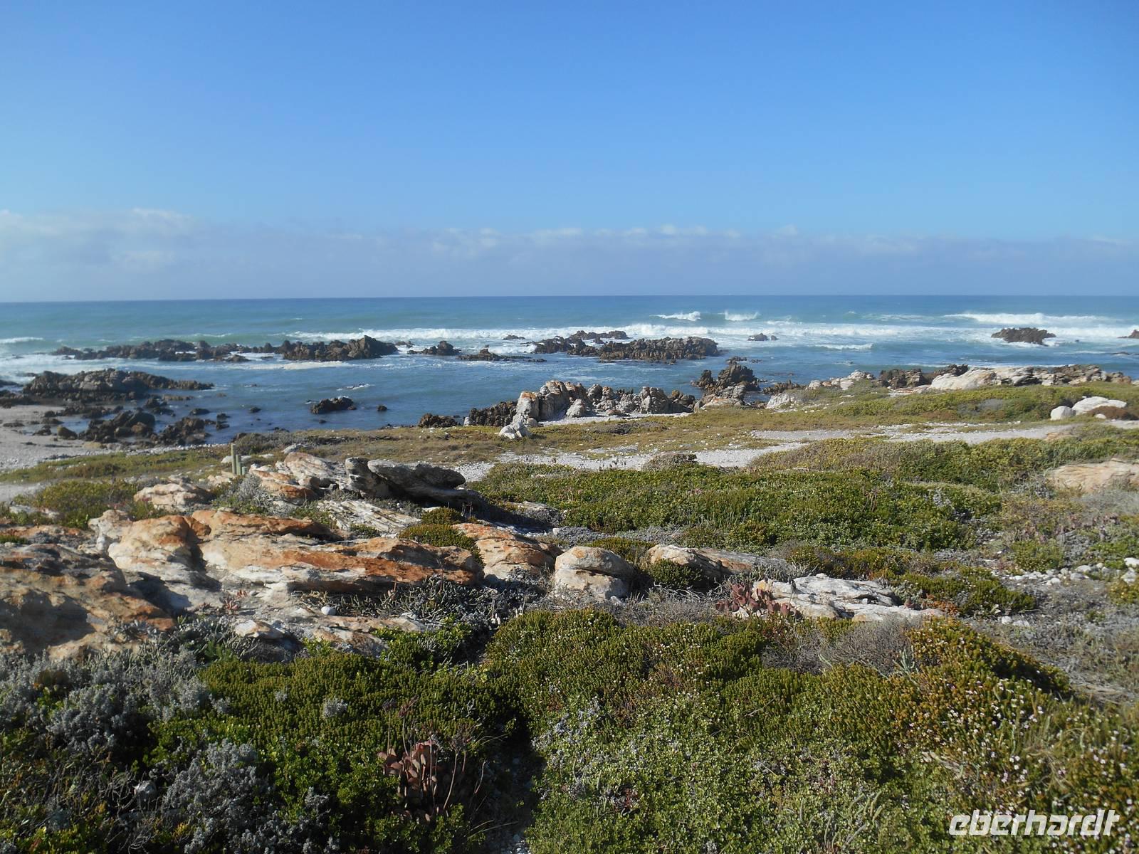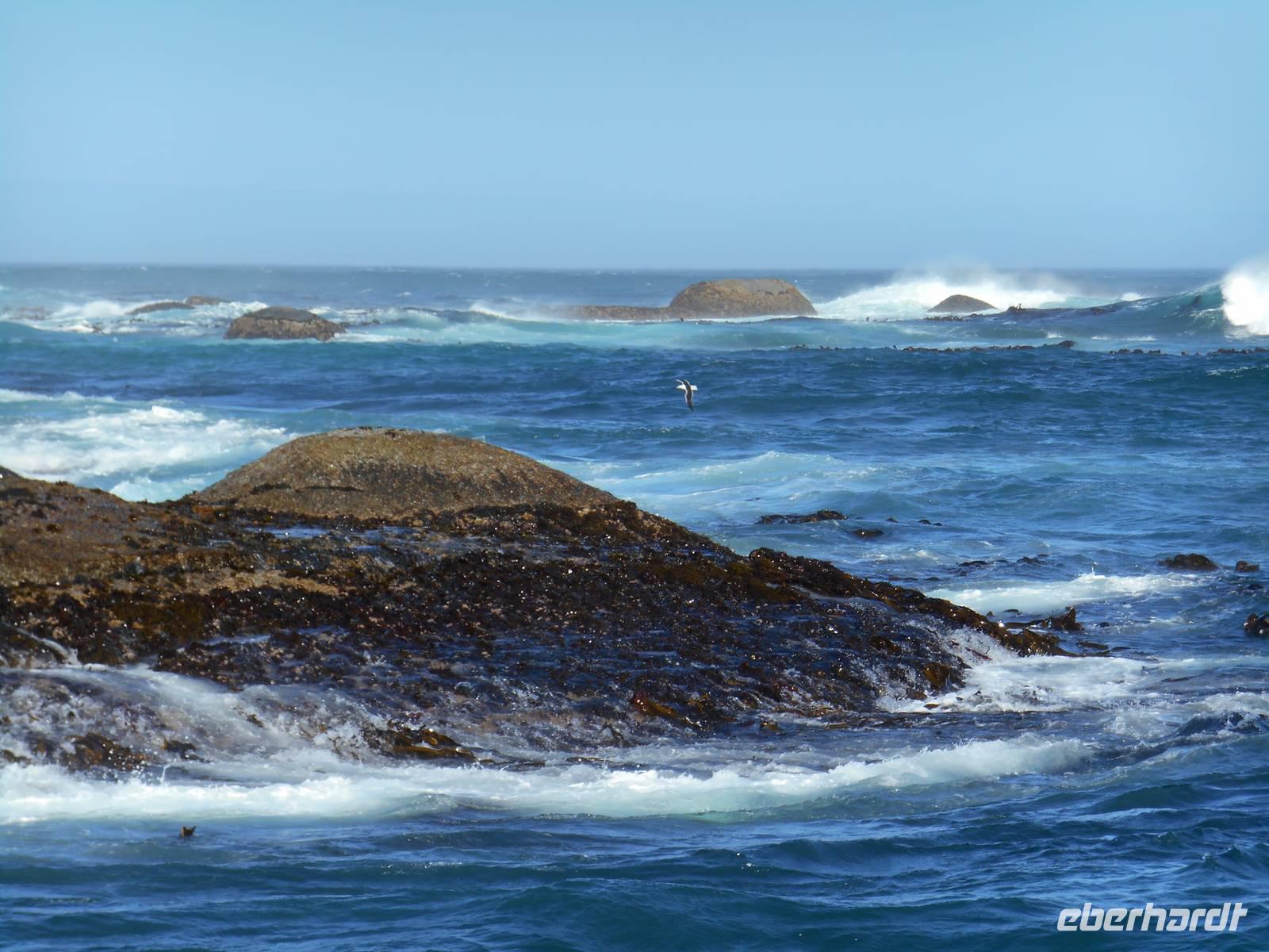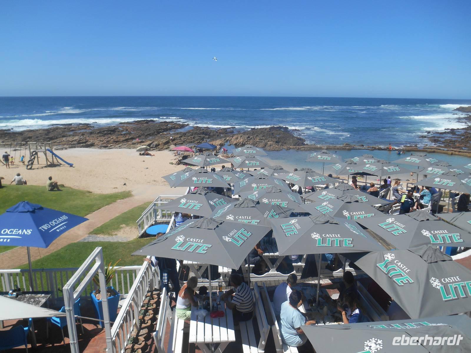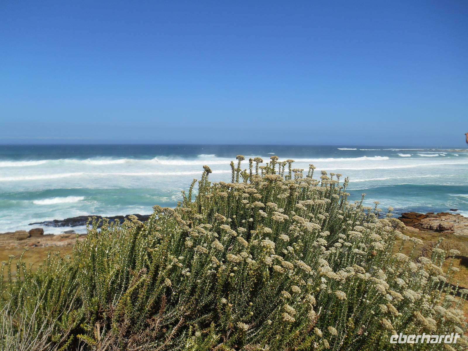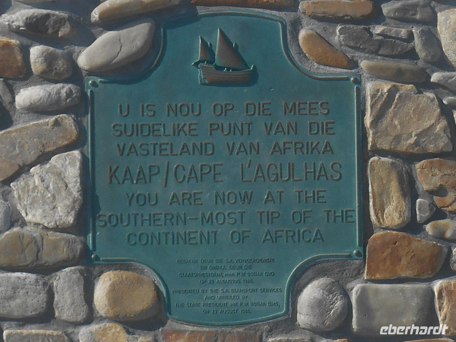 Das Motto des heutigen Tages: "Der frühe Vogel fängt den Wurm ...!" Zeitiges Aufstehen war angesagt und ausgestattet mit Frühstücksboxen starteten wir bereits um 7 Uhr. Aufregung machte sich breit, weil unser Reiseleiter Chris kurzzeitig seine gesamten Papiere und Kreditkarten verloren hatte - glücklicherweise klärte sich diese Situation nach nur wenigen Minuten auf, er hatte seine Geldbörse am Vorabend im "Harbour Rock Restaurant" liegen gelassen und konnte sie dort auch wieder in Empfang nehmen. Wir hatten uns für heute viel vorgenommen und waren uns wieder mal einig - wir wollten einmal am südlichsten Punkt Afrikas stehen! Wiederum zusätzlich zu unserem eigentlichen Programm erreichten wir nach einer knapp 2-stündigen Fahrt das Cape Agulhas. Geographisch betrachtet, ist dieses Kap nicht nur das südlichste, sondern es gilt auch als offizielle Trennungslinie zwischen Indischem und Atlantischem Ozean - andere Wissenschaftler nennen aber auch andere Linien. Direkt hinter dem Leuchtturm befindet sich der "Southernmost Point" und der Punkt, "where the Oceans meet", doch mehr als eine Gedenkplatte gab es dann auch wieder nicht zu bewundern. Die Natur hier ist allerdings beeindruckend bizarr und so nutzten wir auch gleich die Gelegenheit, um hier zu frühstücken - in dieser Umgebung schmeckte es gleich nochmal so gutZwinkernd! Fazit - ein Besuch lohnt sich allemal. Kleine Fischerdörfer wie Arniston, Struisbaai und Agulhas mit ihren reetgedeckten Häusern und langen Stränden haben ein besonderes Flair. Eine lange Fahrt lag anschließend vor uns und dennoch kamen wir pünktlich zur Mittagszeit in Mossel Bay an, wo für uns im direkt am Meer gelegenen Restaurant "The Kingfisher" ein Mittagessen reserviert war - es gab unter anderem Straußenfleisch und natürlich eine Auswahl verschiedener Fischgerichte bzw. Meeresfrüchte.