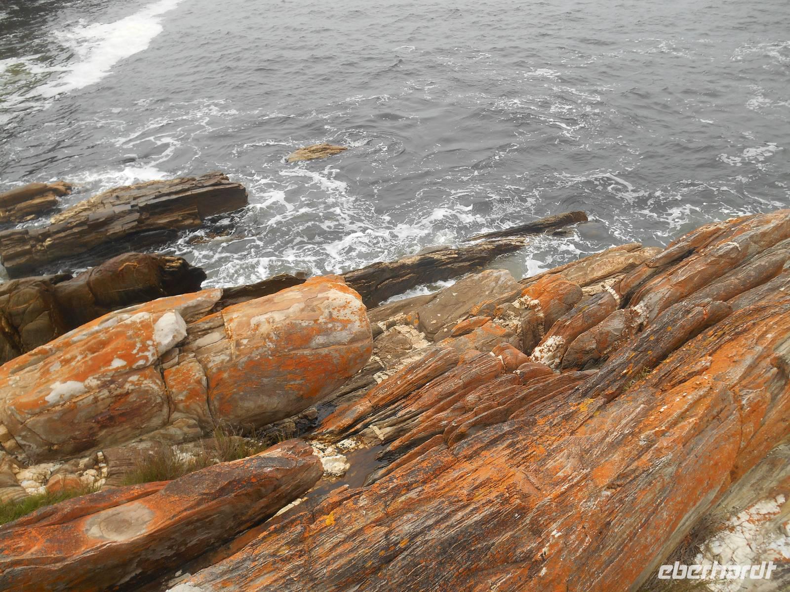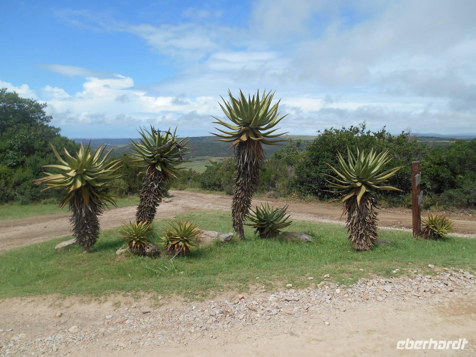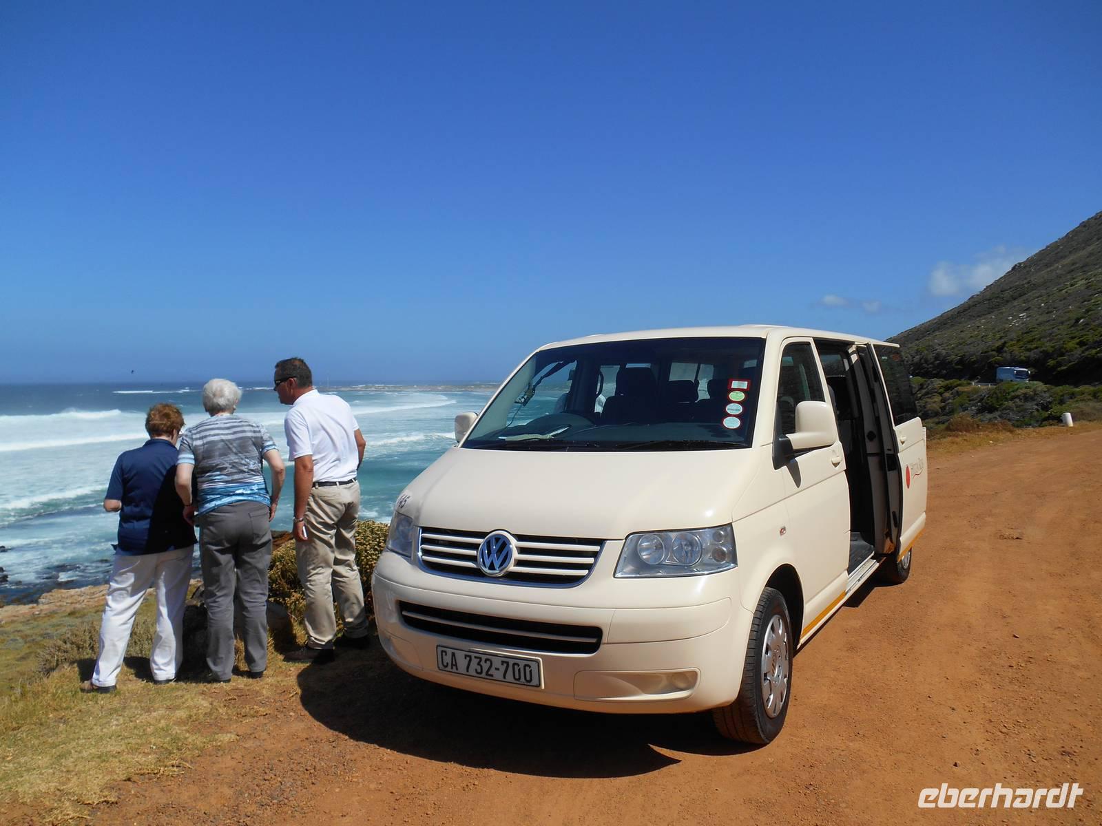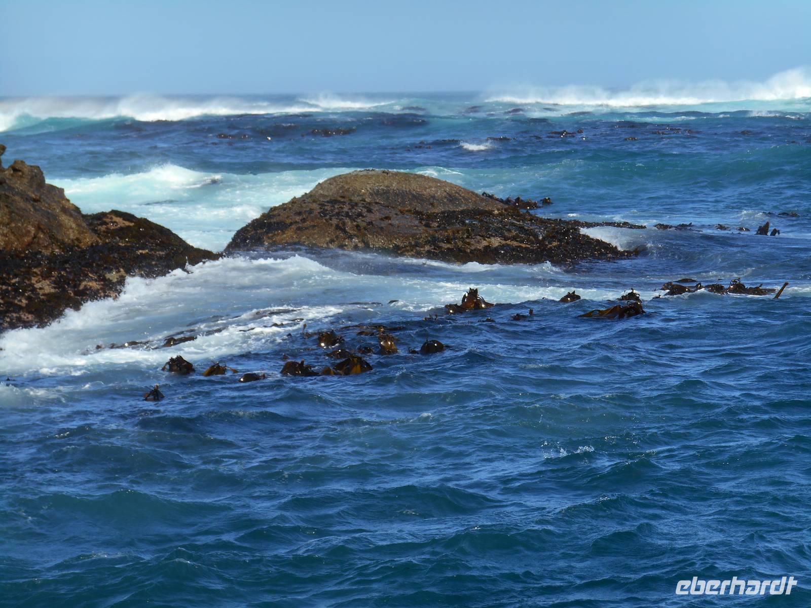 Das Motto des heutigen Tages: "Der frühe Vogel fängt den Wurm ...!" Zeitiges Aufstehen war angesagt und ausgestattet mit Frühstücksboxen starteten wir bereits um 7 Uhr. Aufregung machte sich breit, weil unser Reiseleiter Chris kurzzeitig seine gesamten Papiere und Kreditkarten verloren hatte - glücklicherweise klärte sich diese Situation nach nur wenigen Minuten auf, er hatte seine Geldbörse am Vorabend im "Harbour Rock Restaurant" liegen gelassen und konnte sie dort auch wieder in Empfang nehmen. Wir hatten uns für heute viel vorgenommen und waren uns wieder mal einig - wir wollten einmal am südlichsten Punkt Afrikas stehen! Wiederum zusätzlich zu unserem eigentlichen Programm erreichten wir nach einer knapp 2-stündigen Fahrt das Cape Agulhas. Geographisch betrachtet, ist dieses Kap nicht nur das südlichste, sondern es gilt auch als offizielle Trennungslinie zwischen Indischem und Atlantischem Ozean - andere Wissenschaftler nennen aber auch andere Linien. Direkt hinter dem Leuchtturm befindet sich der "Southernmost Point" und der Punkt, "where the Oceans meet", doch mehr als eine Gedenkplatte gab es dann auch wieder nicht zu bewundern. Die Natur hier ist allerdings beeindruckend bizarr und so nutzten wir auch gleich die Gelegenheit, um hier zu frühstücken - in dieser Umgebung schmeckte es gleich nochmal so gutZwinkernd! Fazit - ein Besuch lohnt sich allemal. Kleine Fischerdörfer wie Arniston, Struisbaai und Agulhas mit ihren reetgedeckten Häusern und langen Stränden haben ein besonderes Flair. Eine lange Fahrt lag anschließend vor uns und dennoch kamen wir pünktlich zur Mittagszeit in Mossel Bay an, wo für uns im direkt am Meer gelegenen Restaurant "The Kingfisher" ein Mittagessen reserviert war - es gab unter anderem Straußenfleisch und natürlich eine Auswahl verschiedener Fischgerichte bzw. Meeresfrüchte.