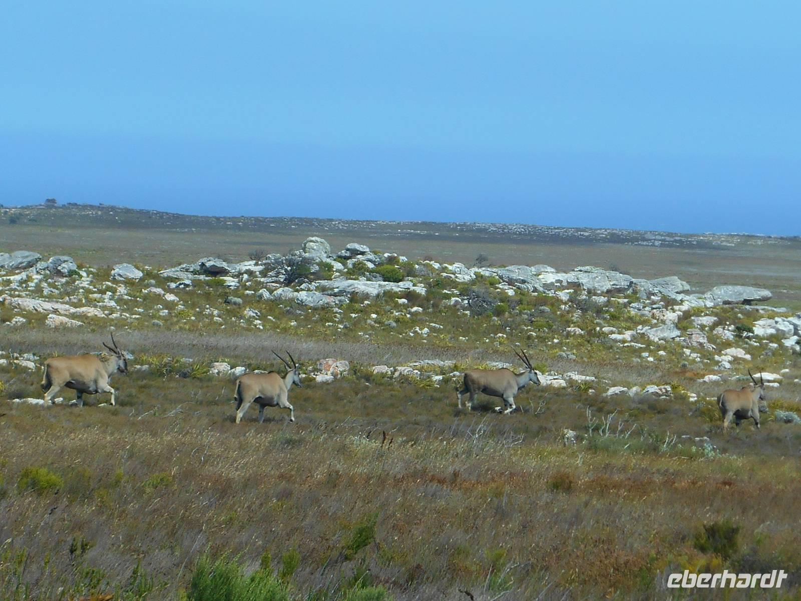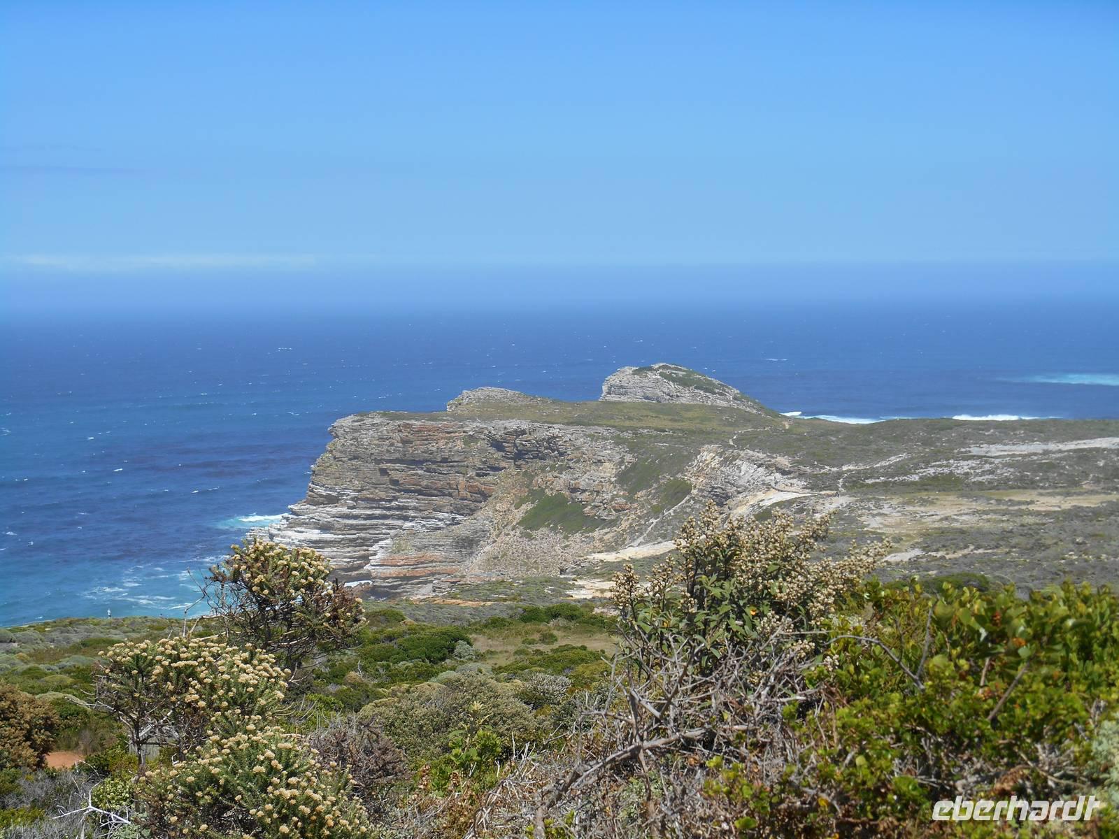 Anschließend stand die kurze Fahrt hinüber zum Kap der Guten Hoffnung an, wo wir uns - wie es schließlich fast alle Touristen tun - für ein Gruppenfoto am südwestlichsten Punkt Afrikas aufstellten, denn ein Erinnerungsfoto an der Hinweistafel ist ein absolutes Muss! An der Küste der Guten Hoffnung imponiert eine bizarre und unendlich weit erscheinende Felsenlandschaft, die unter dem Meeresspiegel ihren deutlich sichtbaren Fortgang nimmt. Die am Kap der Guten Hoffnung herrschenden Gezeiten lassen die Felsen bei Ebbe aus dem Wasser ragen, um sie bei Flut fast vollständig zu verbergen. Die Gegend rund um das Kap ist heute ein attraktiver Nationalpark, wo man zahlreiche Pflanzenarten entdecken kann, die für die berühmte Fynbos-Landschaft typisch sind, welche übrigens Ähnlichkeiten mit der deutschen Heidelandschaft aufweist. Gut gelaunt chauffierte uns unser Driver-Guide Chris weiter nach Simon´s Town.