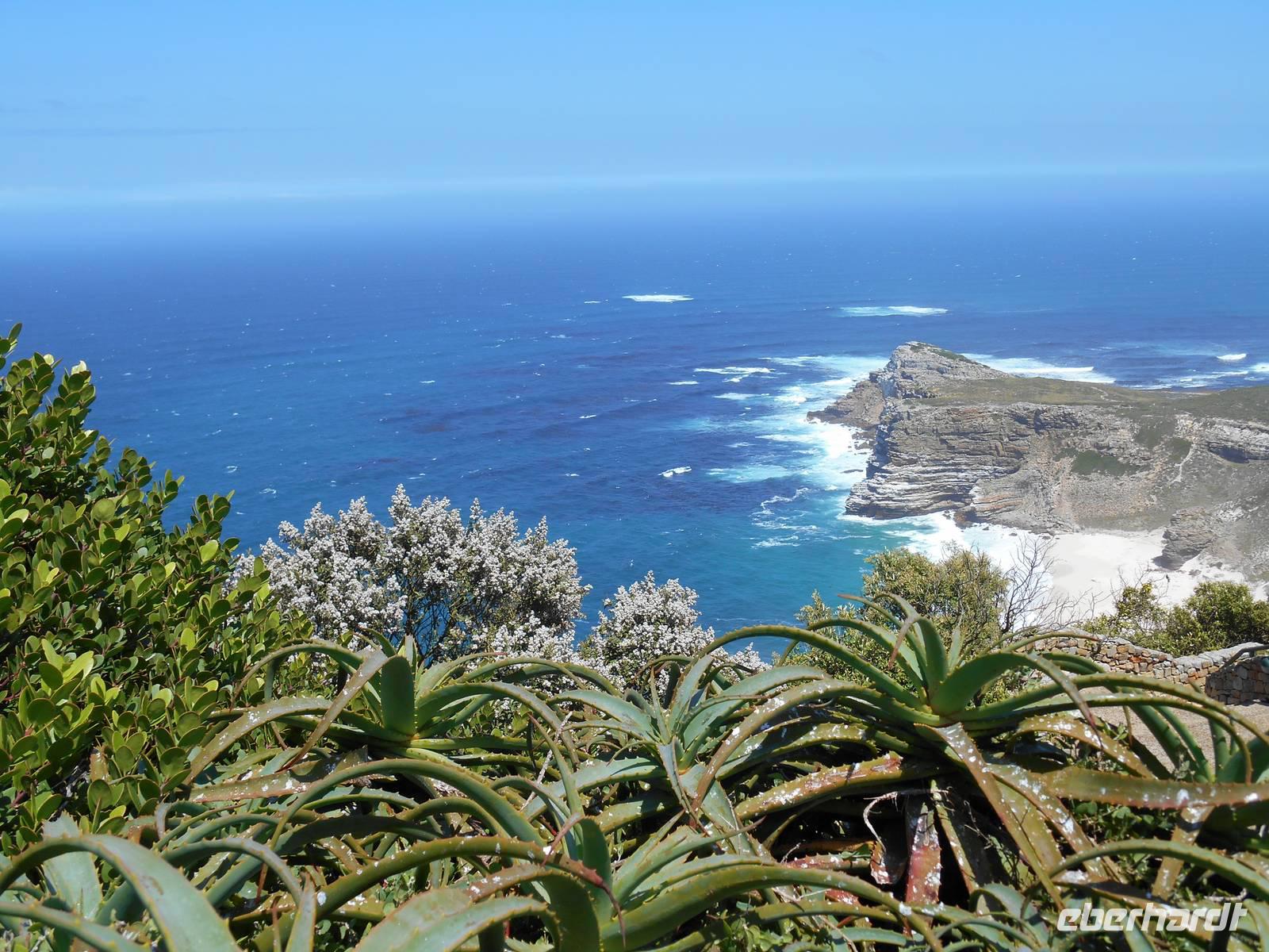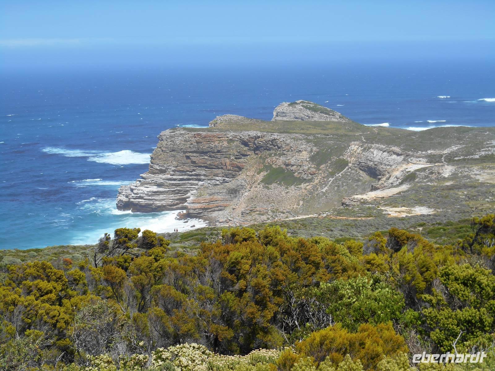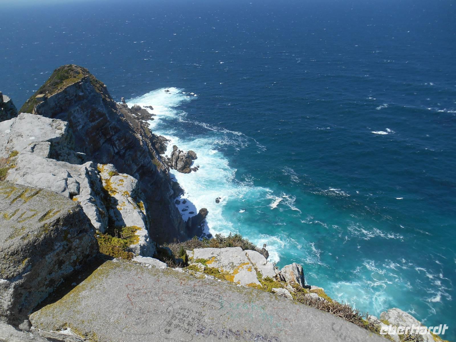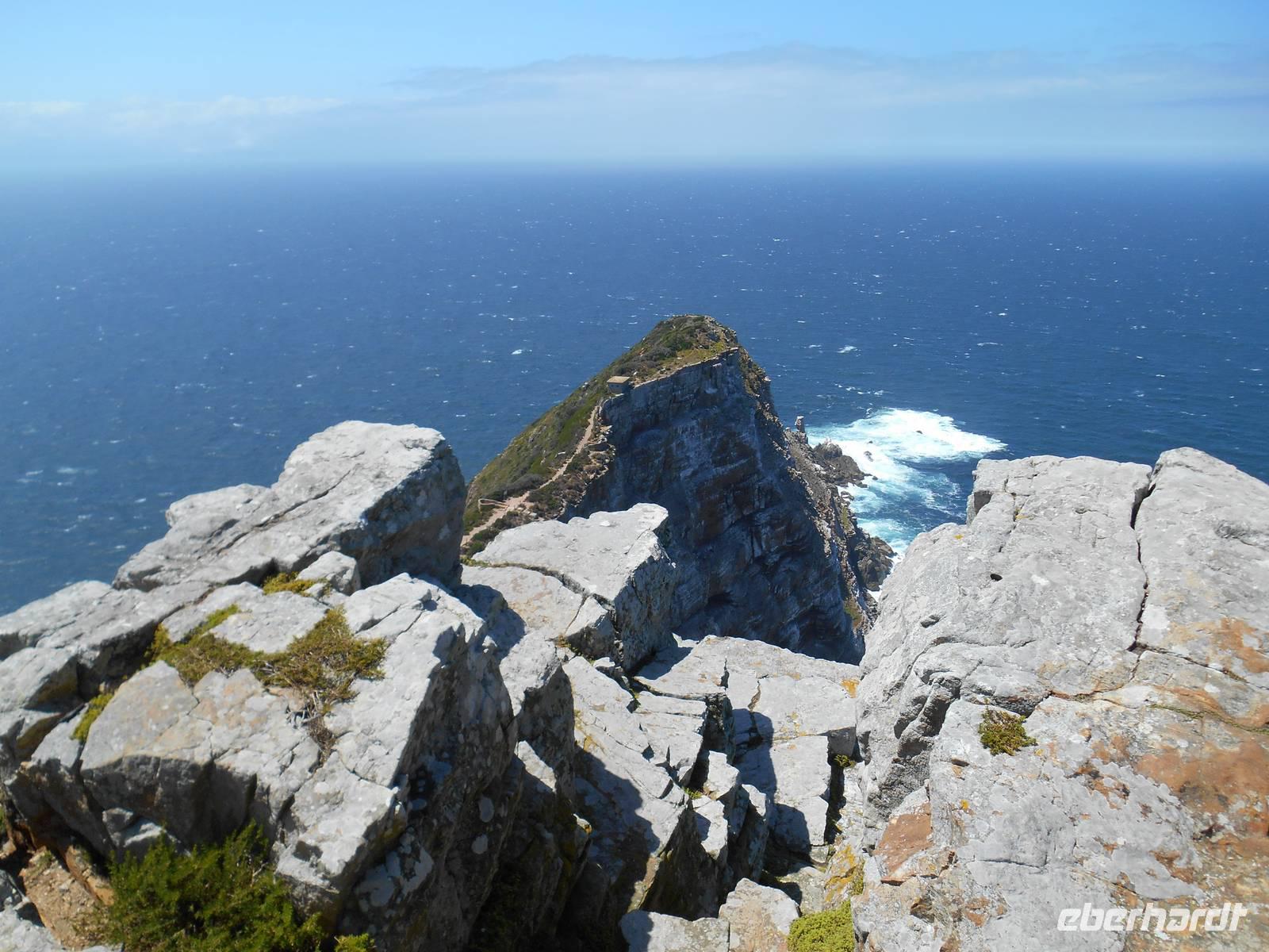 Nach dieser fantastischen Panoramafahrt und der Begegnung mit Pavianen und Schildkröten, erreichten wir am Mittag die Kap-Spitze (Cape Point). Die letzten Meter kann man mit der Zahnradbahn fahren oder man entscheidet sich für einen Aufstieg zu Fuß - übrigens absolut empfehlenswert, denn immer wieder wird man von herrlichen Panoramablicken überrascht! Eine Treppe aus Naturstein führte uns über 120 Treppenstufen zum alten Leuchtturm auf dem Cape Point Peak, 250 Meter über dem Meeresspiegel. Von hier aus kann man die Kap-Spitze und auch das westlich gelegene Kap der Guten Hoffnung sehen! Viele Orts-Unkundige verwechseln übrigens aufgrund der ähnlichen Optik Cape Point mit dem Cape of Good Hope - tatsächlich liegen die beiden Kaps zirka einen Kilometer voneinander entfernt. Und wer wirklich den südlichsten Süden Südafrikas sehen will, der muss sich zum Cape Agulhas begeben, welches auch den Namen Nadel-Kap trägt!
