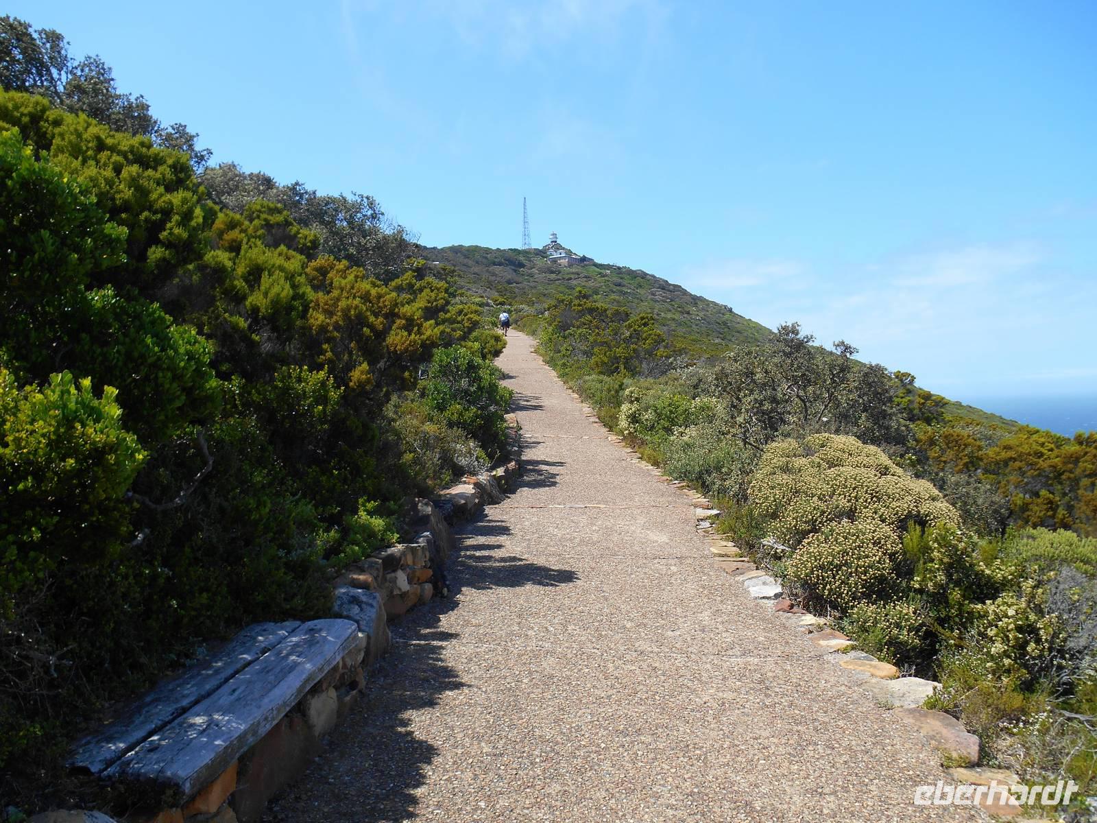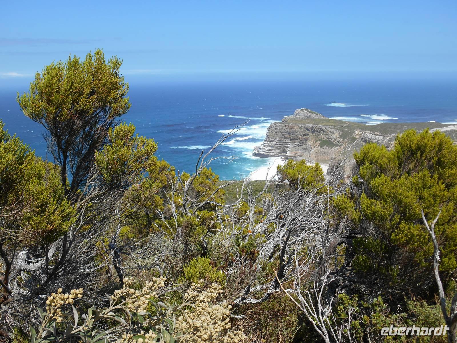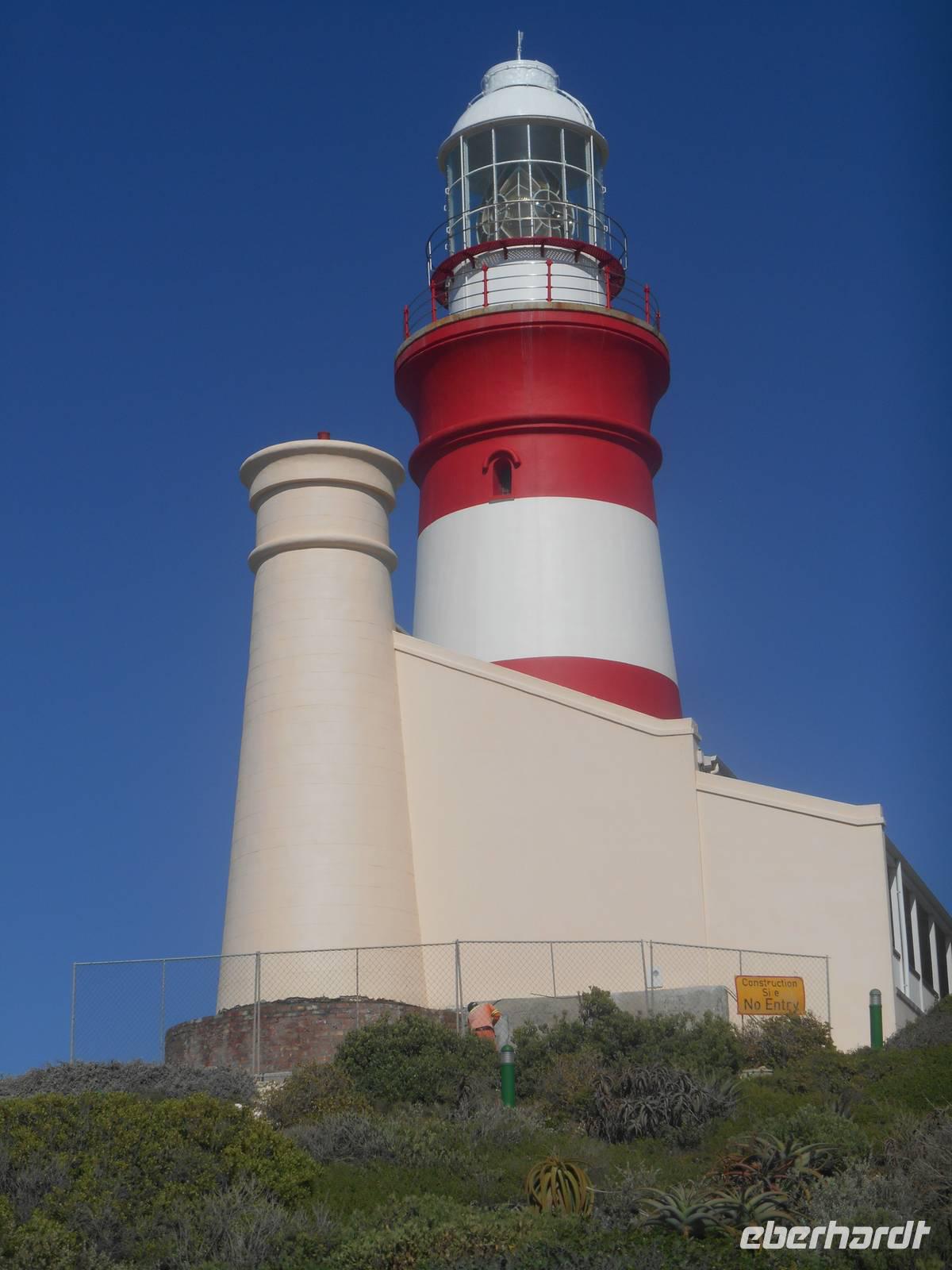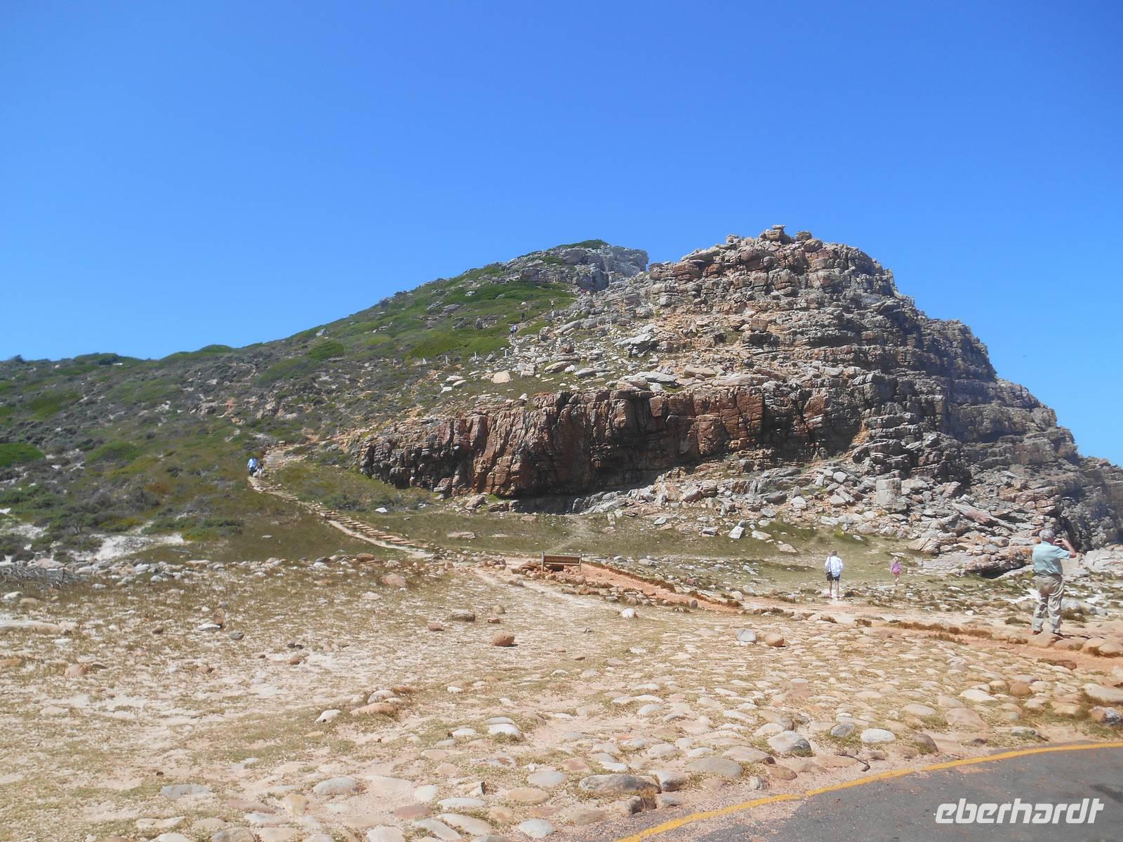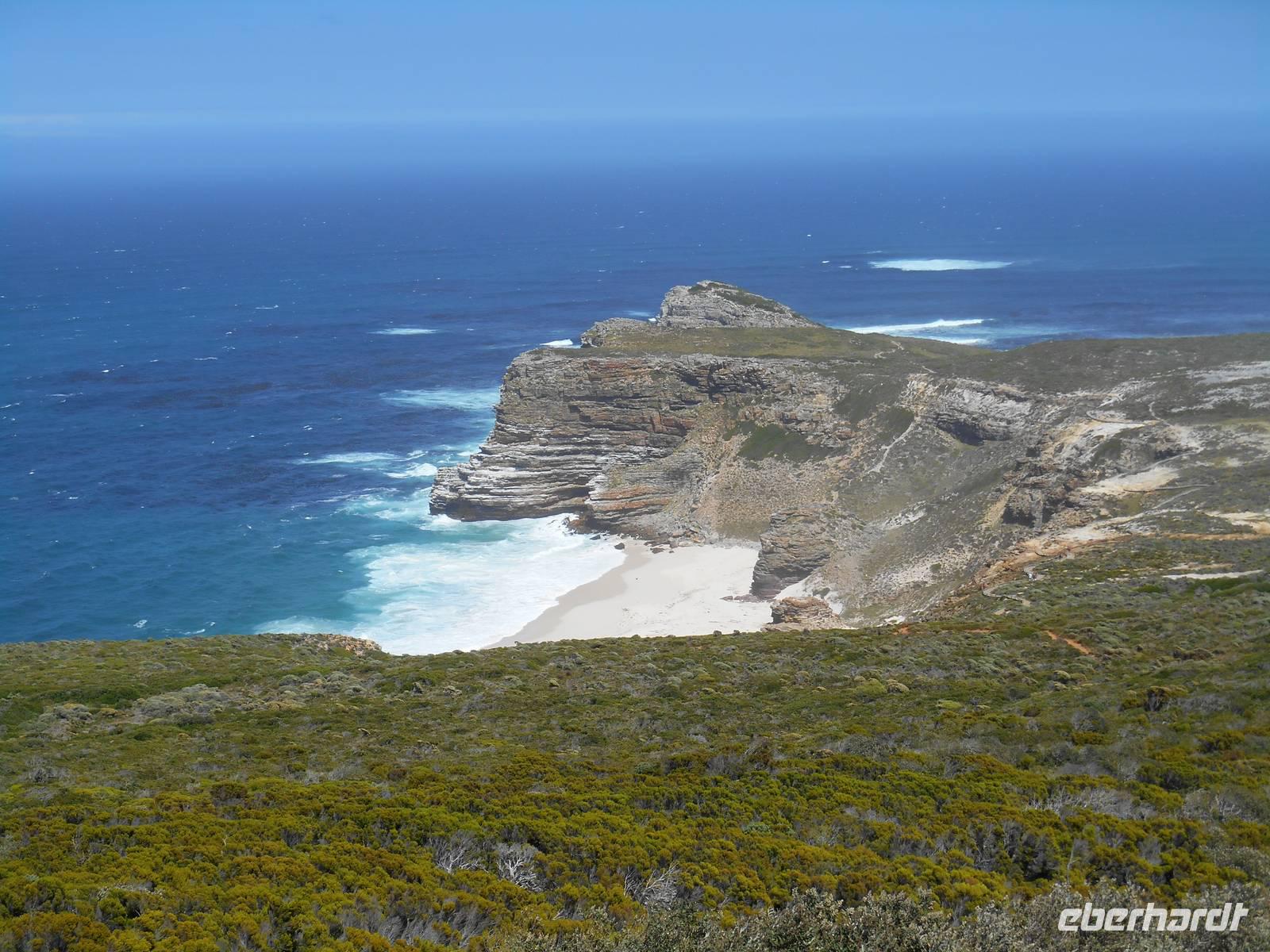 Nach dieser fantastischen Panoramafahrt und der Begegnung mit Pavianen und Schildkröten, erreichten wir am Mittag die Kap-Spitze (Cape Point). Die letzten Meter kann man mit der Zahnradbahn fahren oder man entscheidet sich für einen Aufstieg zu Fuß - übrigens absolut empfehlenswert, denn immer wieder wird man von herrlichen Panoramablicken überrascht! Eine Treppe aus Naturstein führte uns über 120 Treppenstufen zum alten Leuchtturm auf dem Cape Point Peak, 250 Meter über dem Meeresspiegel. Von hier aus kann man die Kap-Spitze und auch das westlich gelegene Kap der Guten Hoffnung sehen! Viele Orts-Unkundige verwechseln übrigens aufgrund der ähnlichen Optik Cape Point mit dem Cape of Good Hope - tatsächlich liegen die beiden Kaps zirka einen Kilometer voneinander entfernt. Und wer wirklich den südlichsten Süden Südafrikas sehen will, der muss sich zum Cape Agulhas begeben, welches auch den Namen Nadel-Kap trägt!