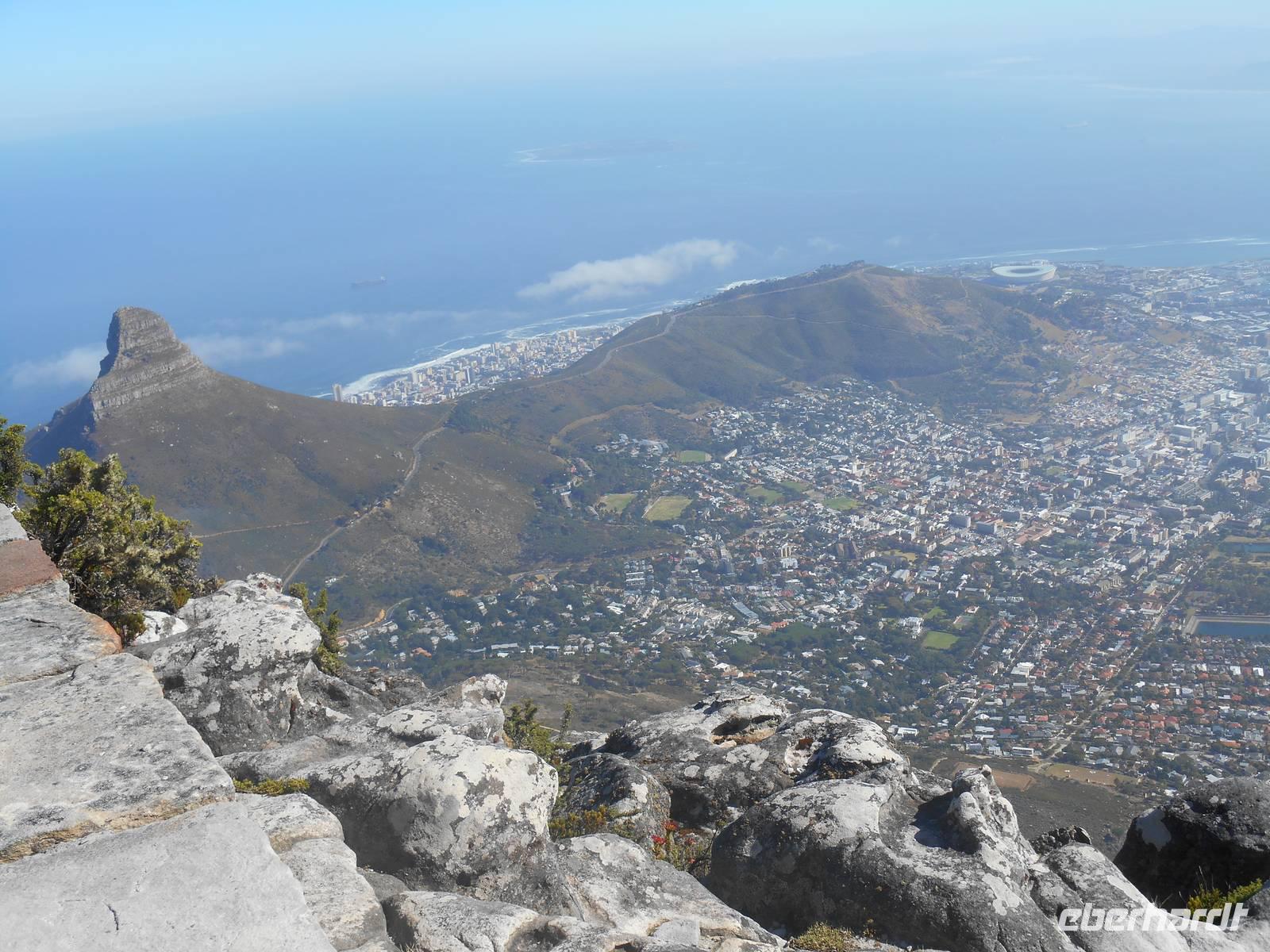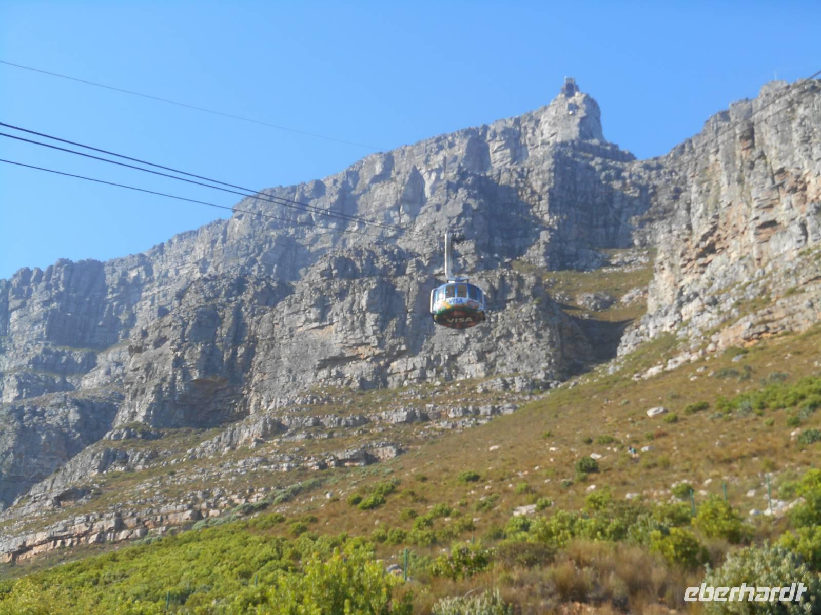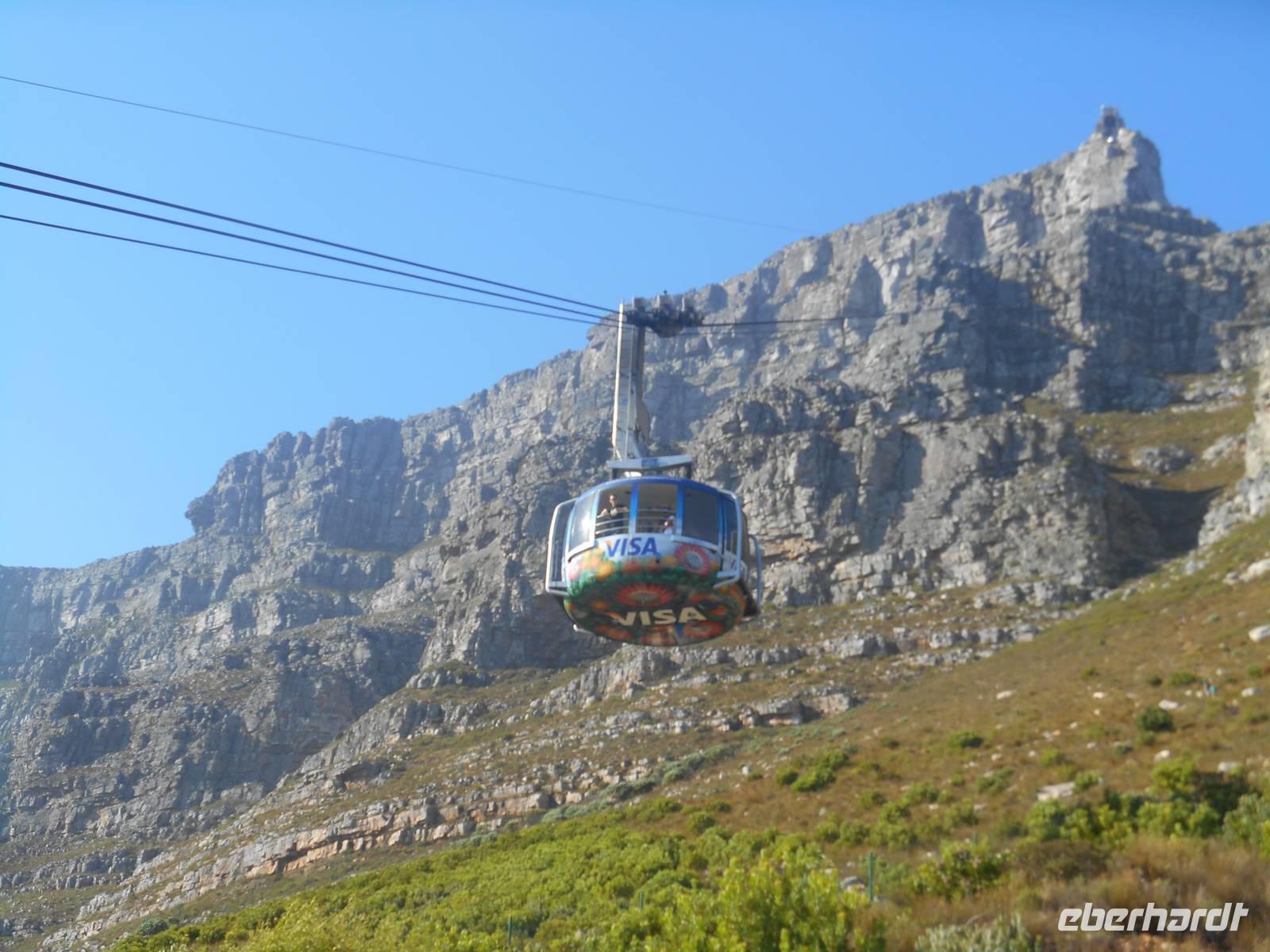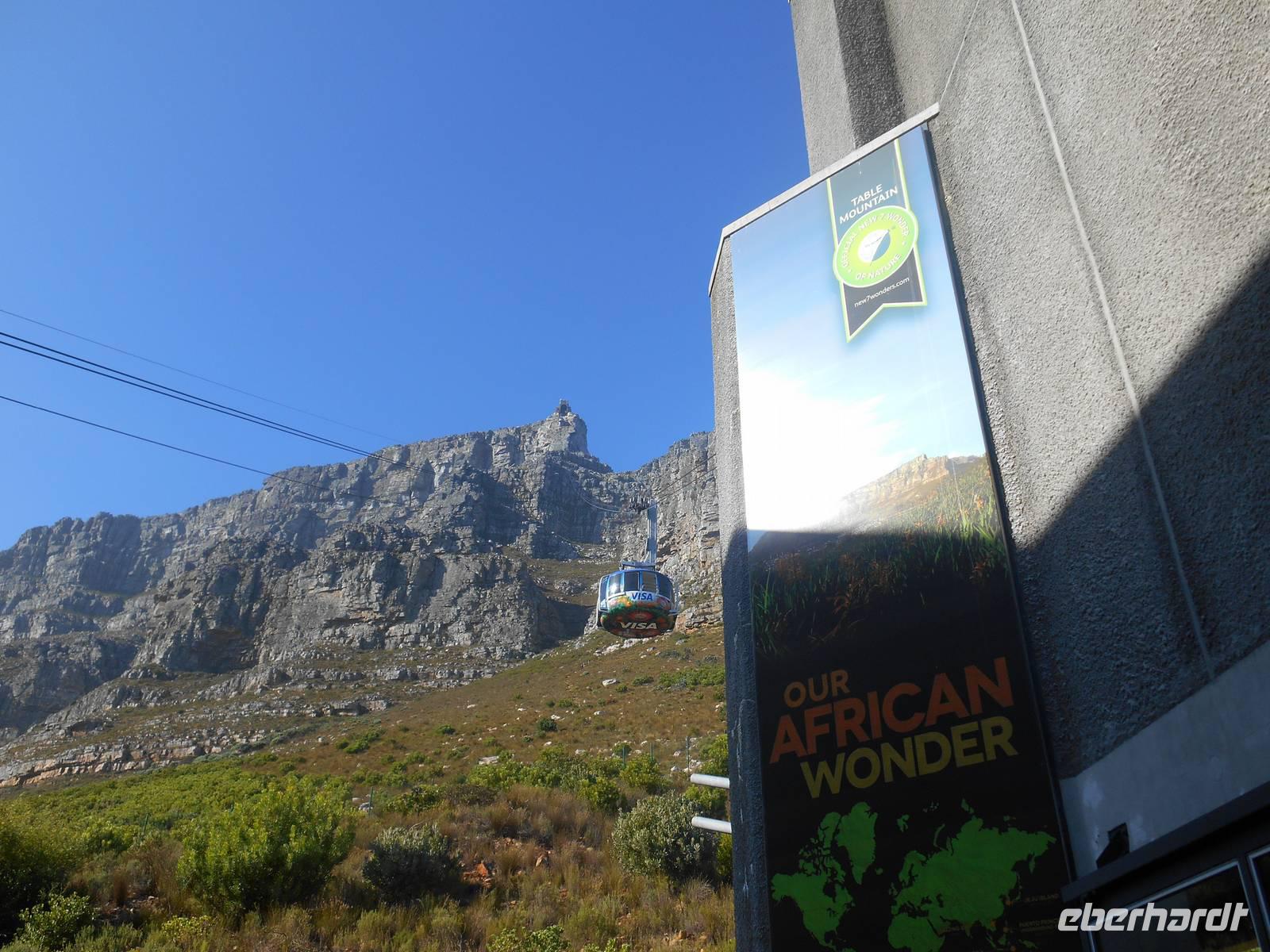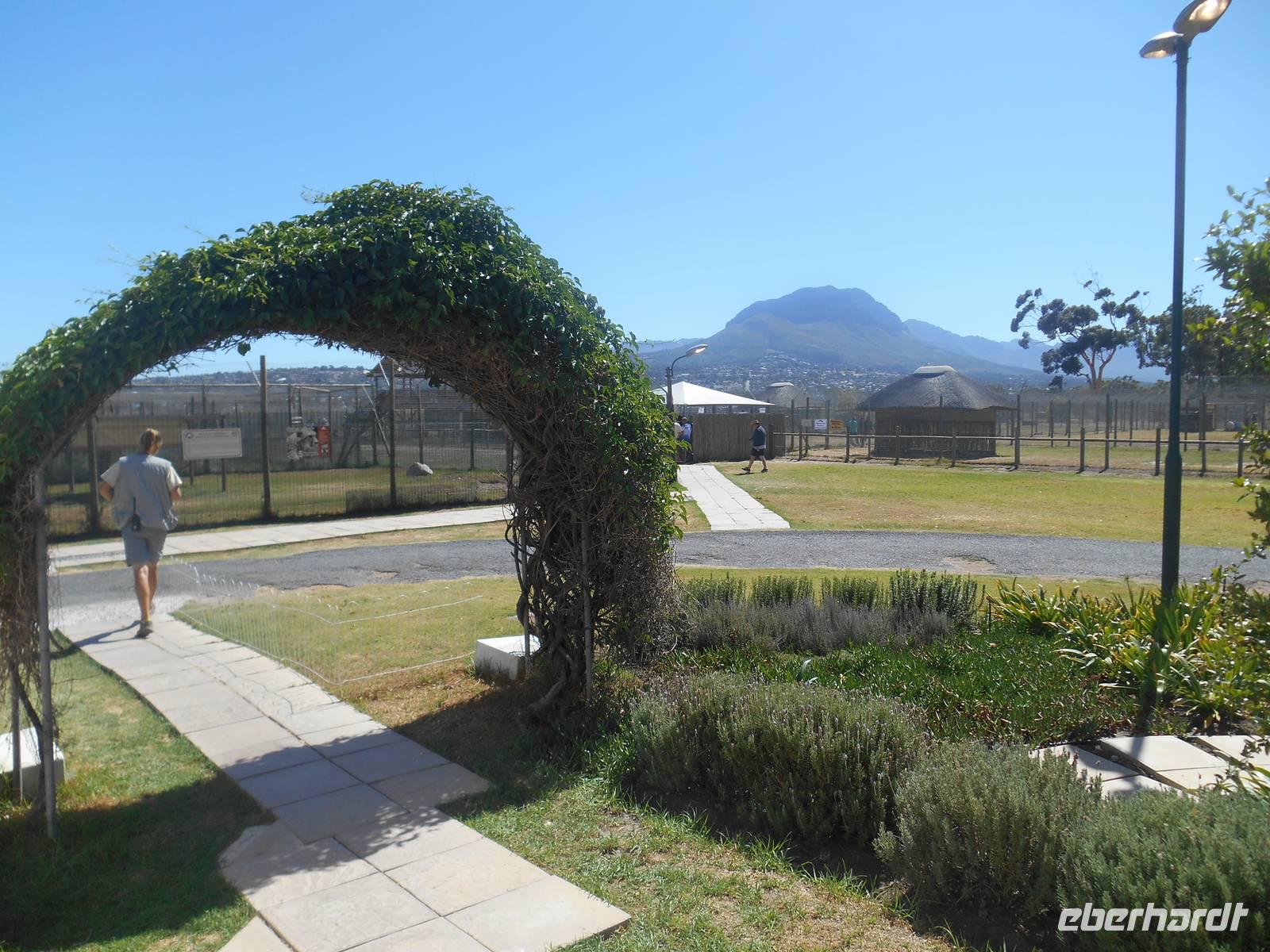 Heute stand ein Halbtagesausflug auf unserem Programm. Die ganze Zeit hofften wir auf schönes Wetter und drückten die Daumen, denn bei schlechtem Wetter (vor allem Wind und Nebel) gibt es keine Chance, auf dem Tafelberg zu stehen! Wir aber hatten großes Glück, denn unserer Fahrt auf den Tafelberg stand nichts im Wege. Der Himmel am Morgen war klar und die Sonne lachte und so starteten wir gleich früh um 8 Uhr zur nahe gelegenen Talstation der Seilbahn, die uns bequem auf den Berg hinauf brachte. Wir hatten es auch insofern gut, dass wir nicht lange Anstehen mussten - das zeitige Aufstehen hatte sich also gelohnt! Die Auffahrt dauerte ca. sieben Minuten, und während dieser Zeit rotierte die in der Schweiz hergestellte Gondel um 360°. Somit brauchte niemand darauf achten, an welchem Fenster er steht - sehr praktisch! Schon seit die ersten Seefahrer um das Kap der Guten Hoffnung gesegelt waren, galt der 1.086 Meter hohe Tafelberg als ein Wahrzeichen, welches bei gutem Wetter über 100 Kilometer auszumachen war. Oben auf dem Tafelberg angekommen, ließen wir bei angenehmen 20 Grad in Ruhe das Panorama auf uns wirken - zur Stadtseite hin sahen wir den markanten Felsen des Löwenkopfes bzw. den Signal Hill und nun lag uns endlich auch die Tafelbucht mit Kapstadts Häusermeer zu Füßen. In der Ferne erkannten wir die berühmte historische Insel Robben Island, die jetzt zum wichtigsten Museum des Landes im 21. Jahrhundert wird. Kein anderer Ort im neuen Südafrika ist so sehr mit der Geschichte des Landes verbunden, wie diese Insel in der Tafelbucht. Als 1488 der Portugiese Bartholomeu Diaz das Kap erkundete, fanden nur einige Expeditionen statt. Über 500 Jahre sollten vergehen, bis im demokratischen Südafrika heute Touristen vor allem die Zelle Nummer 5 ansteuern, wo Präsident Nelson Mandela 18 seiner 27 Haftjahre verbringen musste. Natürlich schauten wir auf unserem Rundgang auf dem Tafelberg auch in Richtung Süden, wo sich die Kap-Halbinsel zu unseren Füßen ausbreitete. Es war beeindruckend und wir genossen es in vollen Zügen, denn so langsam machten sich ein paar böse Wolken zu uns auf den WegZwinkernd - der Tafelberg ist für sein tückisches Wetter bekannt, es kann sich nämlich innerhalb weniger Minuten dramatisch ändern. In kürzester Zeit schwankt das Wetter dann von schön warm zu eisig kalt. Teilweise wird es auch innerhalb von Minuten so nebelig, dass man die Hand vor Augen nicht mehr sehen kann! Feuchte Luftmassen, die vom offenen Meer her den Tafelberg als erstes Hindernis überströmen, bilden daher häufig auch das sogenannte "Tischtuch". Das blieb uns allerdings heute Morgen glücklicherweise erspart! Nachdem wir wieder unten waren, bemerkten wir schnell, dass sich das Wetter mittlerweile wirklich ganz schnell verändert hatte und waren ganz einfach nur froh, dass wir es zeitlich alles gut abgepasst hatten!