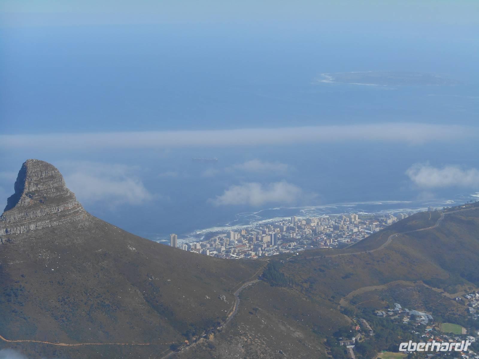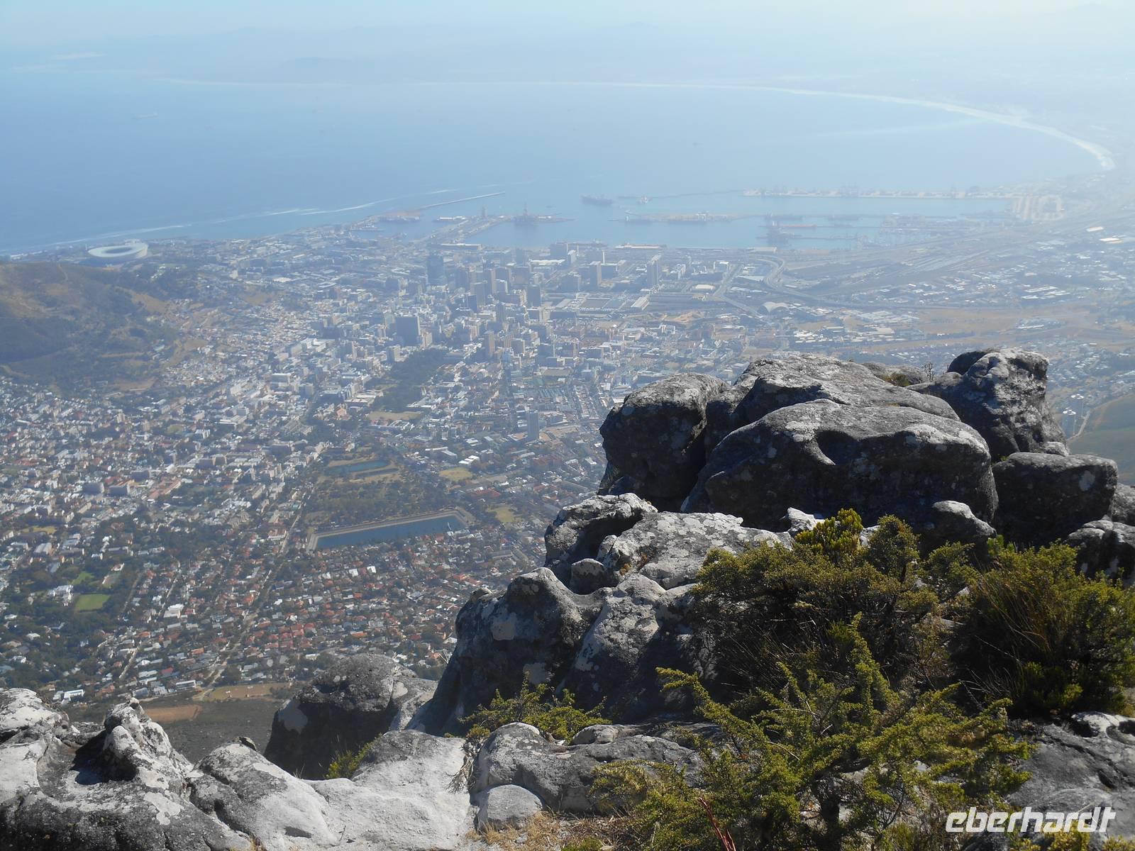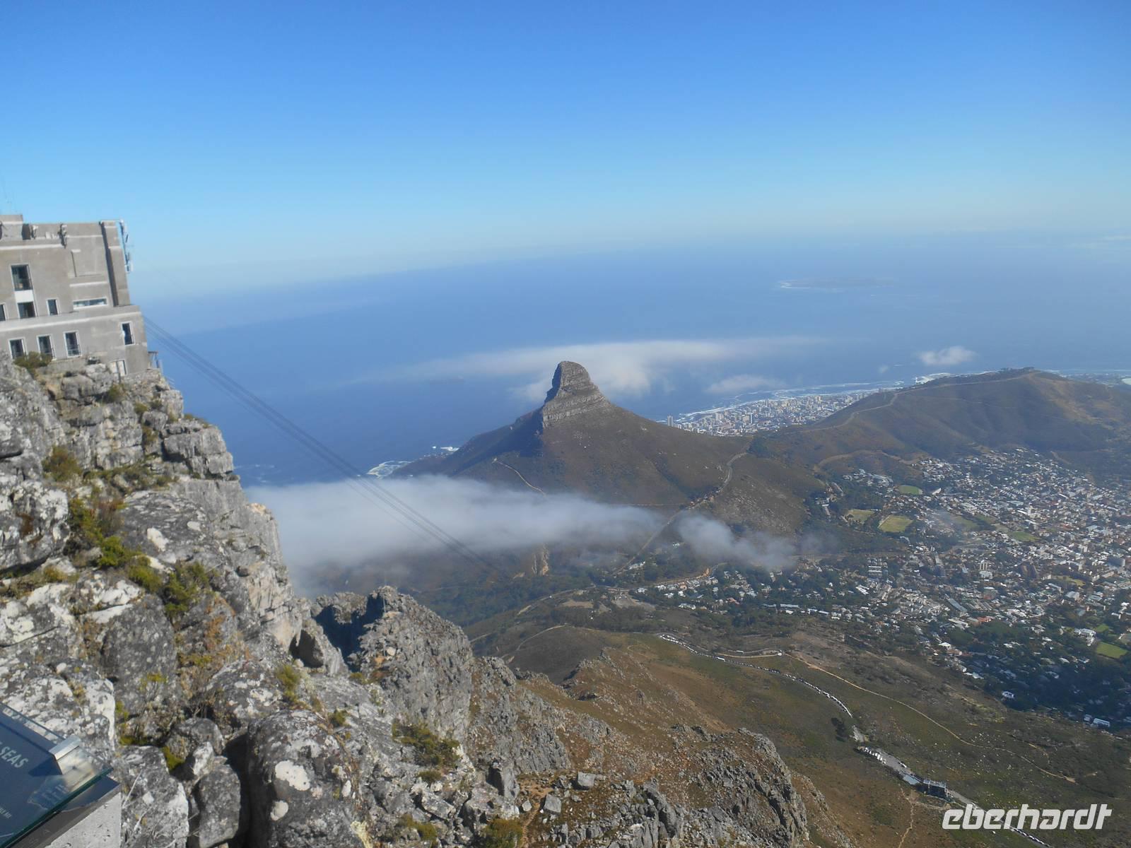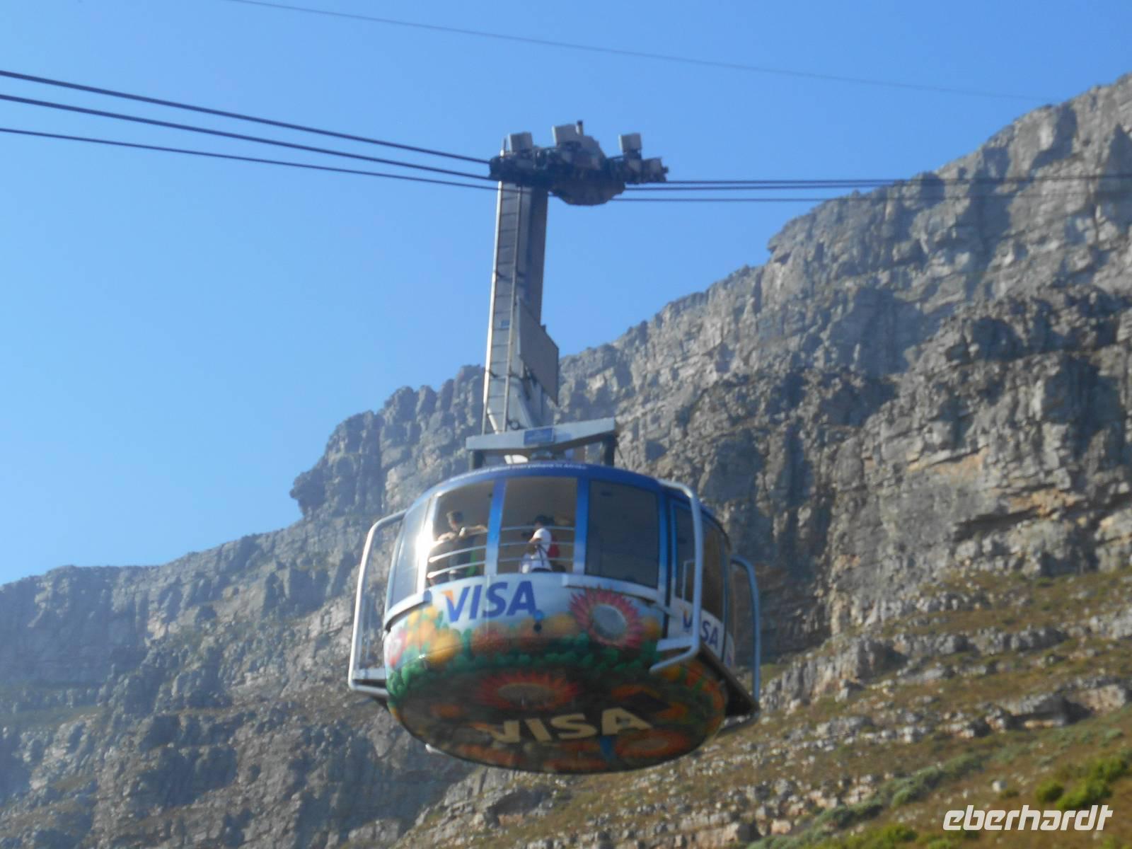 Heute stand ein Halbtagesausflug auf unserem Programm. Die ganze Zeit hofften wir auf schönes Wetter und drückten die Daumen, denn bei schlechtem Wetter (vor allem Wind und Nebel) gibt es keine Chance, auf dem Tafelberg zu stehen! Wir aber hatten großes Glück, denn unserer Fahrt auf den Tafelberg stand nichts im Wege. Der Himmel am Morgen war klar und die Sonne lachte und so starteten wir gleich früh um 8 Uhr zur nahe gelegenen Talstation der Seilbahn, die uns bequem auf den Berg hinauf brachte. Wir hatten es auch insofern gut, dass wir nicht lange Anstehen mussten - das zeitige Aufstehen hatte sich also gelohnt! Die Auffahrt dauerte ca. sieben Minuten, und während dieser Zeit rotierte die in der Schweiz hergestellte Gondel um 360°. Somit brauchte niemand darauf achten, an welchem Fenster er steht - sehr praktisch! Schon seit die ersten Seefahrer um das Kap der Guten Hoffnung gesegelt waren, galt der 1.086 Meter hohe Tafelberg als ein Wahrzeichen, welches bei gutem Wetter über 100 Kilometer auszumachen war. Oben auf dem Tafelberg angekommen, ließen wir bei angenehmen 20 Grad in Ruhe das Panorama auf uns wirken - zur Stadtseite hin sahen wir den markanten Felsen des Löwenkopfes bzw. den Signal Hill und nun lag uns endlich auch die Tafelbucht mit Kapstadts Häusermeer zu Füßen. In der Ferne erkannten wir die berühmte historische Insel Robben Island, die jetzt zum wichtigsten Museum des Landes im 21. Jahrhundert wird. Kein anderer Ort im neuen Südafrika ist so sehr mit der Geschichte des Landes verbunden, wie diese Insel in der Tafelbucht. Als 1488 der Portugiese Bartholomeu Diaz das Kap erkundete, fanden nur einige Expeditionen statt. Über 500 Jahre sollten vergehen, bis im demokratischen Südafrika heute Touristen vor allem die Zelle Nummer 5 ansteuern, wo Präsident Nelson Mandela 18 seiner 27 Haftjahre verbringen musste. Natürlich schauten wir auf unserem Rundgang auf dem Tafelberg auch in Richtung Süden, wo sich die Kap-Halbinsel zu unseren Füßen ausbreitete. Es war beeindruckend und wir genossen es in vollen Zügen, denn so langsam machten sich ein paar böse Wolken zu uns auf den WegZwinkernd - der Tafelberg ist für sein tückisches Wetter bekannt, es kann sich nämlich innerhalb weniger Minuten dramatisch ändern. In kürzester Zeit schwankt das Wetter dann von schön warm zu eisig kalt. Teilweise wird es auch innerhalb von Minuten so nebelig, dass man die Hand vor Augen nicht mehr sehen kann! Feuchte Luftmassen, die vom offenen Meer her den Tafelberg als erstes Hindernis überströmen, bilden daher häufig auch das sogenannte "Tischtuch". Das blieb uns allerdings heute Morgen glücklicherweise erspart! Nachdem wir wieder unten waren, bemerkten wir schnell, dass sich das Wetter mittlerweile wirklich ganz schnell verändert hatte und waren ganz einfach nur froh, dass wir es zeitlich alles gut abgepasst hatten!