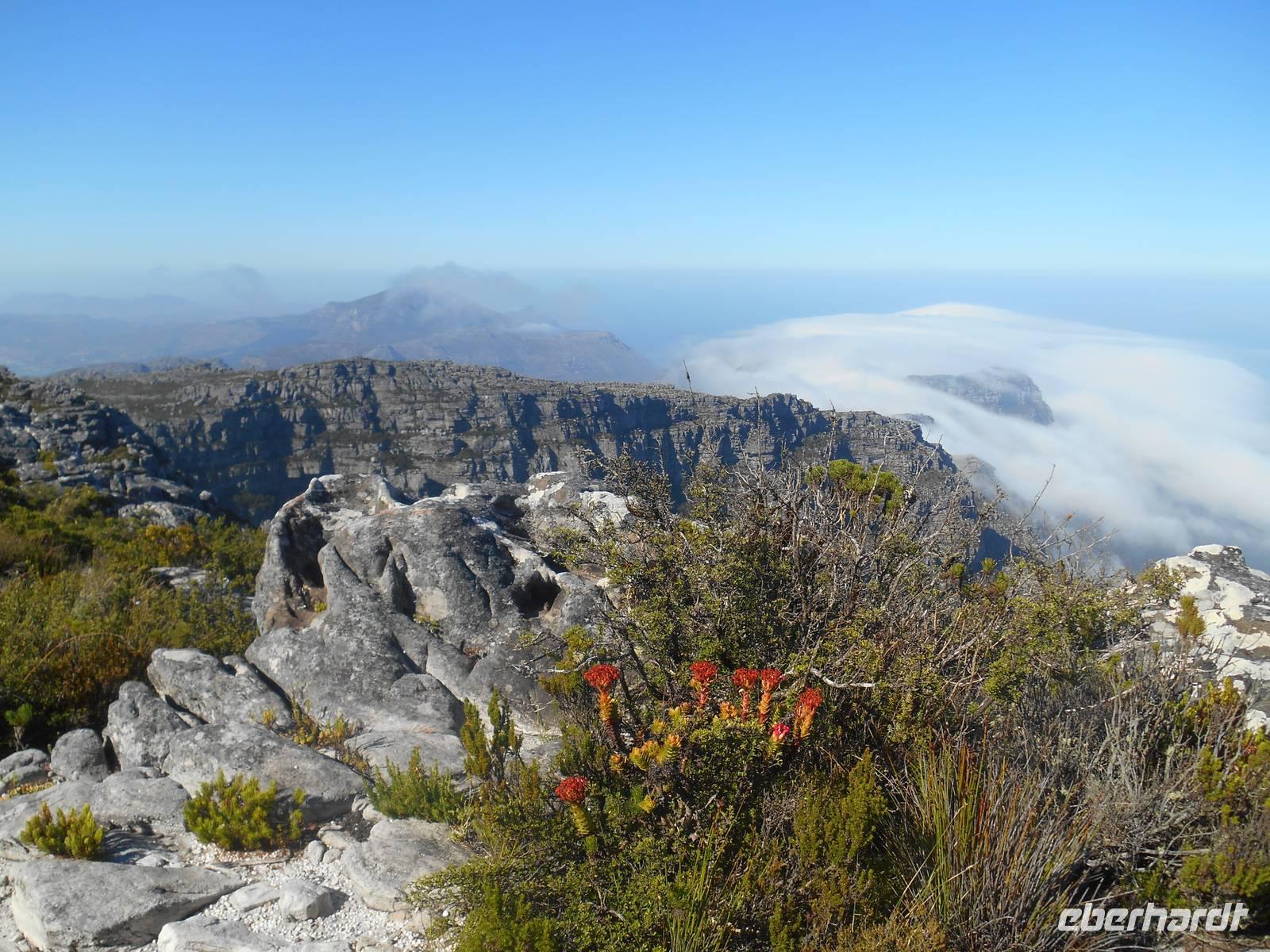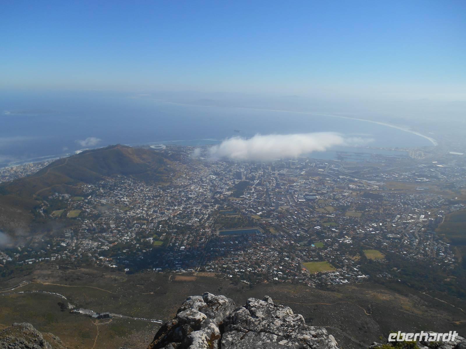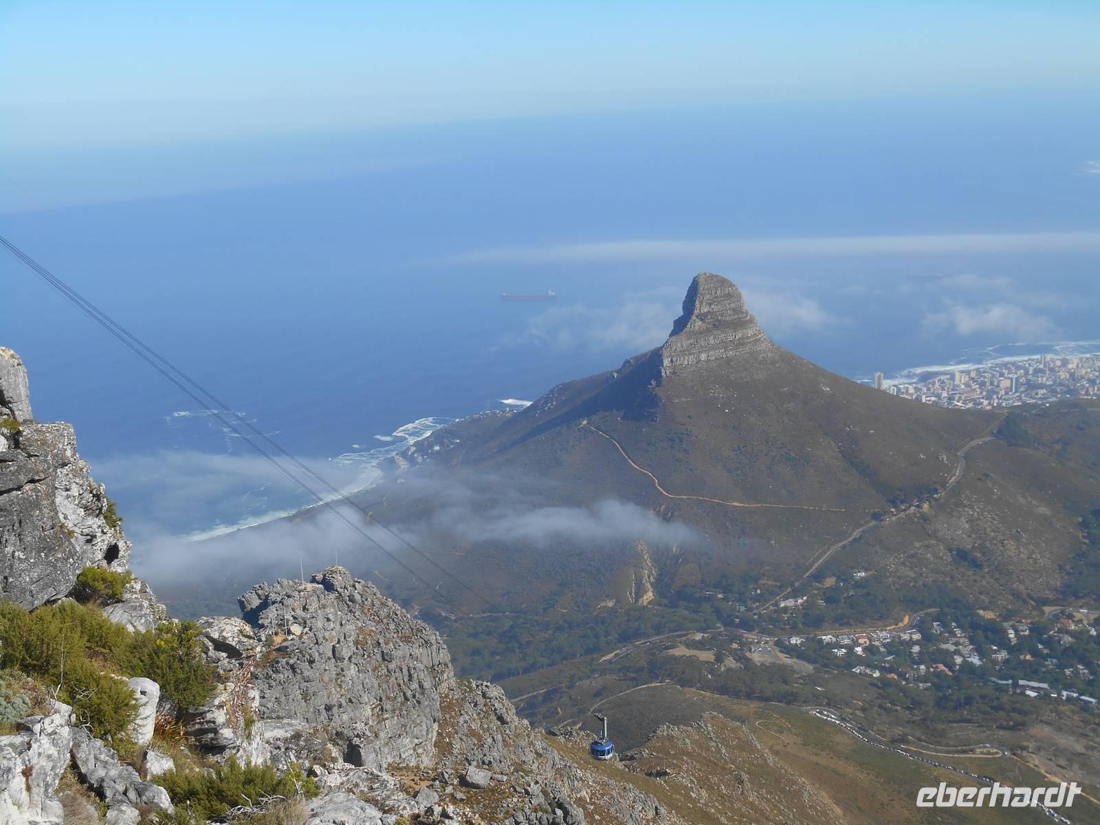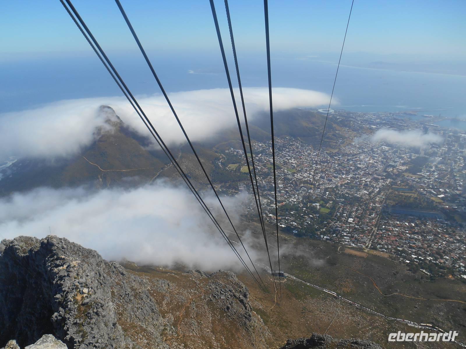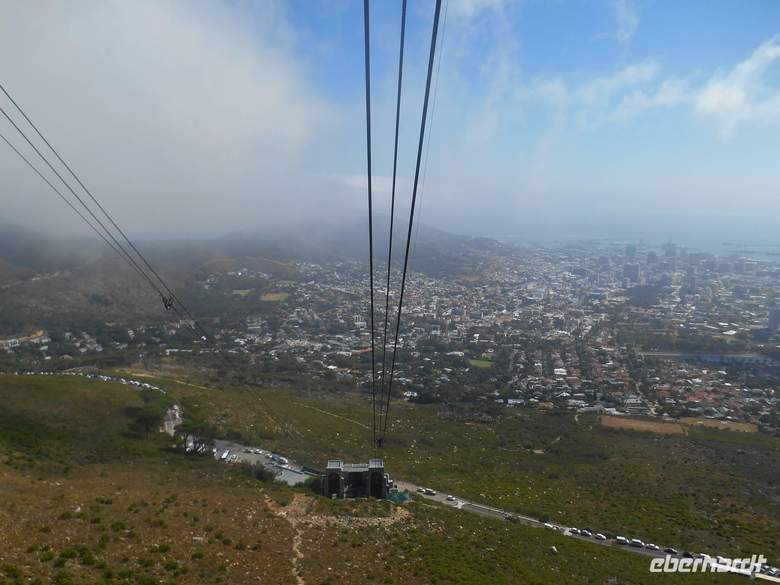 Heute stand ein Halbtagesausflug auf unserem Programm. Die ganze Zeit hofften wir auf schönes Wetter und drückten die Daumen, denn bei schlechtem Wetter (vor allem Wind und Nebel) gibt es keine Chance, auf dem Tafelberg zu stehen! Wir aber hatten großes Glück, denn unserer Fahrt auf den Tafelberg stand nichts im Wege. Der Himmel am Morgen war klar und die Sonne lachte und so starteten wir gleich früh um 8 Uhr zur nahe gelegenen Talstation der Seilbahn, die uns bequem auf den Berg hinauf brachte. Wir hatten es auch insofern gut, dass wir nicht lange Anstehen mussten - das zeitige Aufstehen hatte sich also gelohnt! Die Auffahrt dauerte ca. sieben Minuten, und während dieser Zeit rotierte die in der Schweiz hergestellte Gondel um 360°. Somit brauchte niemand darauf achten, an welchem Fenster er steht - sehr praktisch! Schon seit die ersten Seefahrer um das Kap der Guten Hoffnung gesegelt waren, galt der 1.086 Meter hohe Tafelberg als ein Wahrzeichen, welches bei gutem Wetter über 100 Kilometer auszumachen war. Oben auf dem Tafelberg angekommen, ließen wir bei angenehmen 20 Grad in Ruhe das Panorama auf uns wirken - zur Stadtseite hin sahen wir den markanten Felsen des Löwenkopfes bzw. den Signal Hill und nun lag uns endlich auch die Tafelbucht mit Kapstadts Häusermeer zu Füßen. In der Ferne erkannten wir die berühmte historische Insel Robben Island, die jetzt zum wichtigsten Museum des Landes im 21. Jahrhundert wird. Kein anderer Ort im neuen Südafrika ist so sehr mit der Geschichte des Landes verbunden, wie diese Insel in der Tafelbucht. Als 1488 der Portugiese Bartholomeu Diaz das Kap erkundete, fanden nur einige Expeditionen statt. Über 500 Jahre sollten vergehen, bis im demokratischen Südafrika heute Touristen vor allem die Zelle Nummer 5 ansteuern, wo Präsident Nelson Mandela 18 seiner 27 Haftjahre verbringen musste. Natürlich schauten wir auf unserem Rundgang auf dem Tafelberg auch in Richtung Süden, wo sich die Kap-Halbinsel zu unseren Füßen ausbreitete. Es war beeindruckend und wir genossen es in vollen Zügen, denn so langsam machten sich ein paar böse Wolken zu uns auf den WegZwinkernd - der Tafelberg ist für sein tückisches Wetter bekannt, es kann sich nämlich innerhalb weniger Minuten dramatisch ändern. In kürzester Zeit schwankt das Wetter dann von schön warm zu eisig kalt. Teilweise wird es auch innerhalb von Minuten so nebelig, dass man die Hand vor Augen nicht mehr sehen kann! Feuchte Luftmassen, die vom offenen Meer her den Tafelberg als erstes Hindernis überströmen, bilden daher häufig auch das sogenannte "Tischtuch". Das blieb uns allerdings heute Morgen glücklicherweise erspart! Nachdem wir wieder unten waren, bemerkten wir schnell, dass sich das Wetter mittlerweile wirklich ganz schnell verändert hatte und waren ganz einfach nur froh, dass wir es zeitlich alles gut abgepasst hatten!