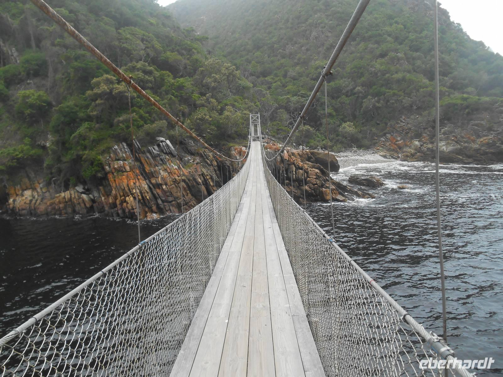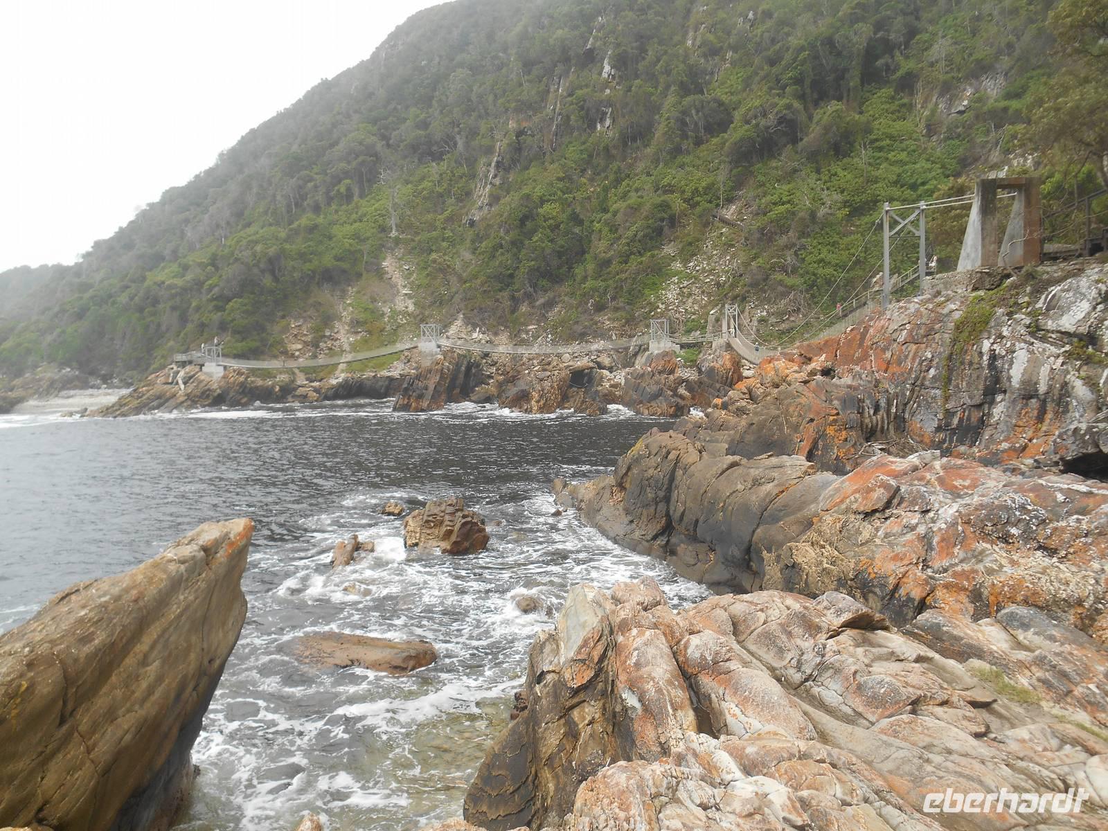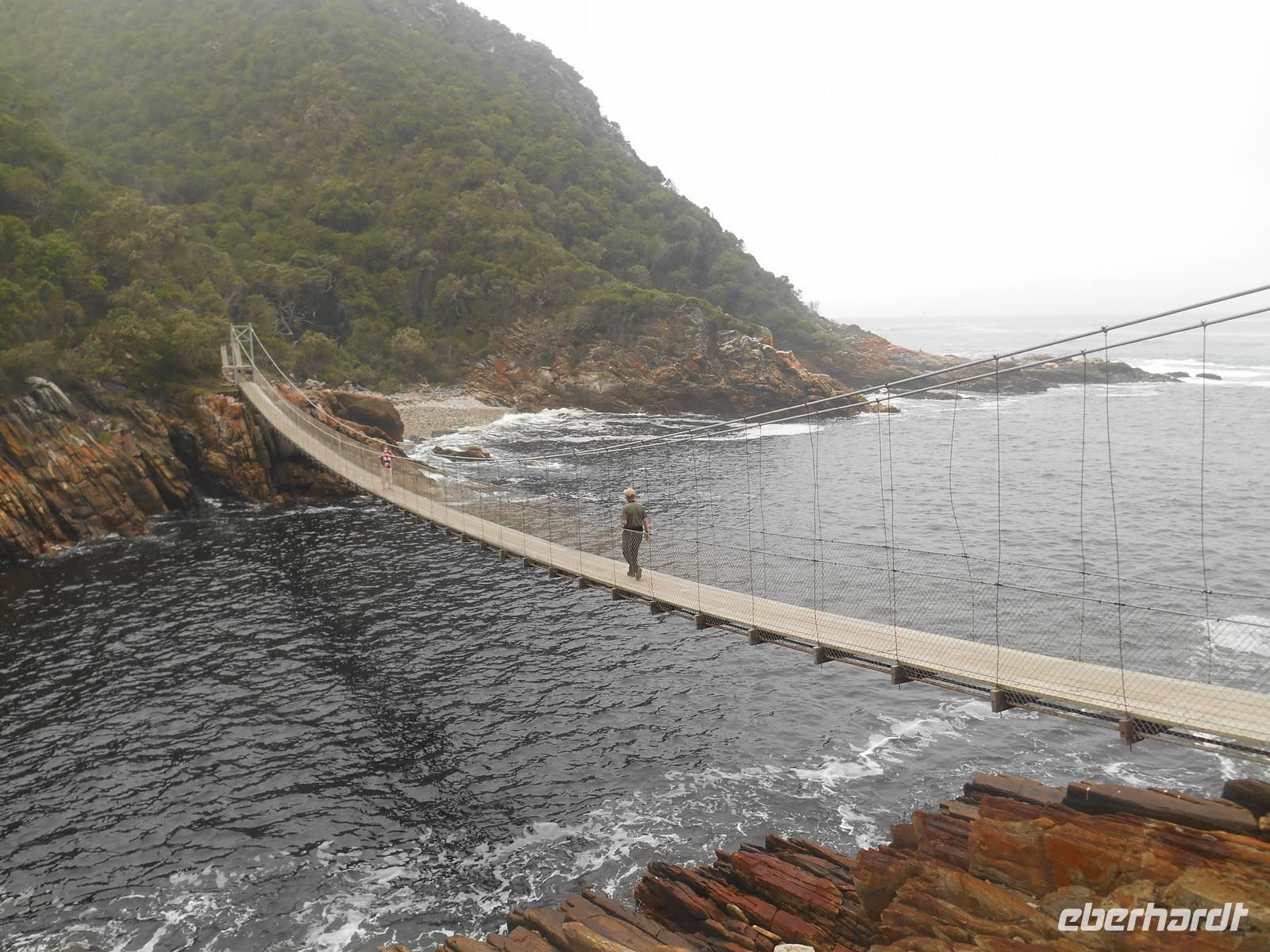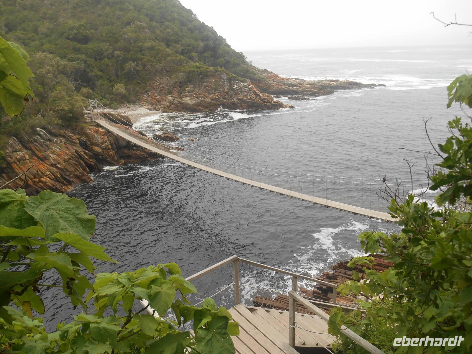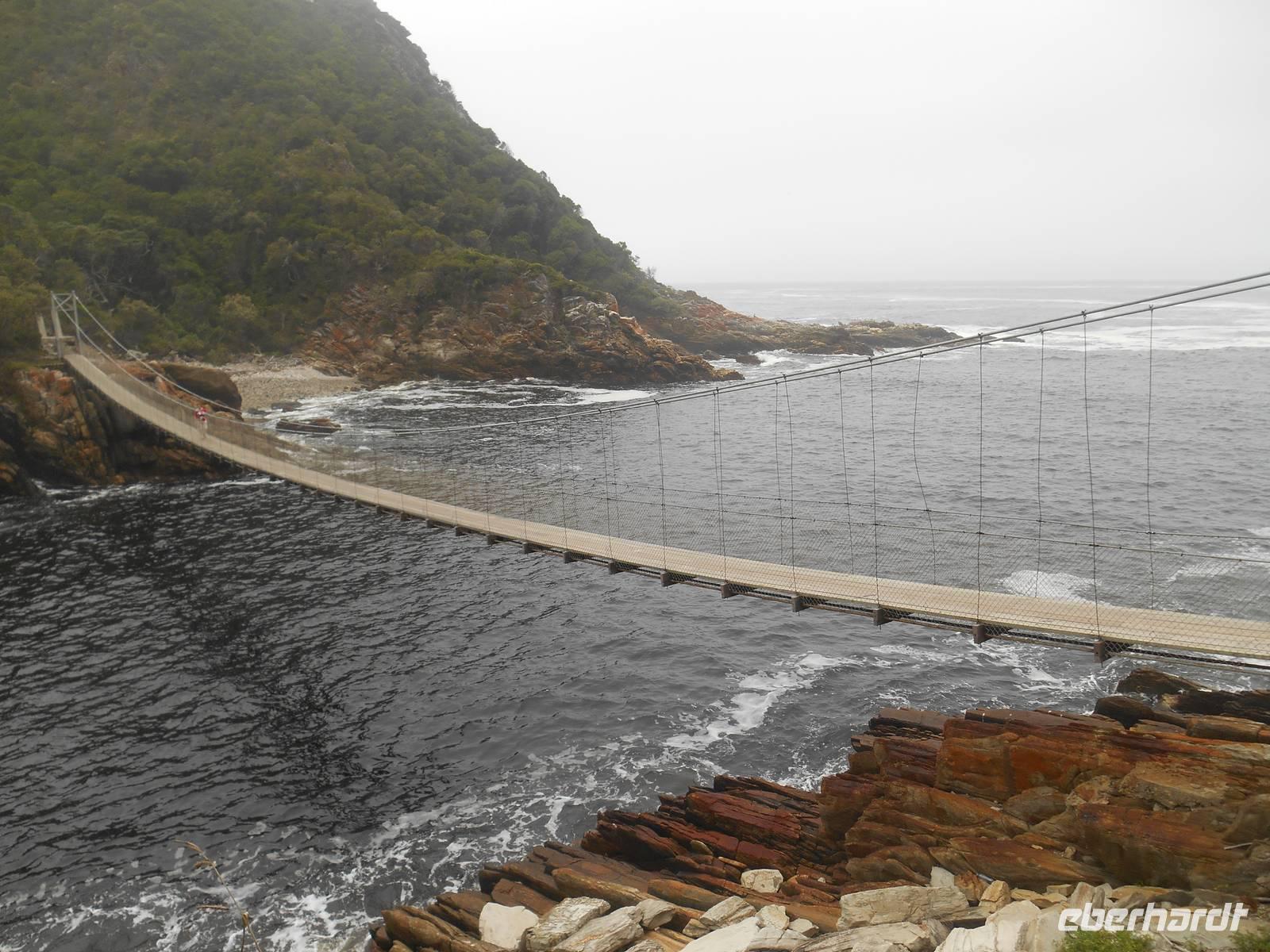 Von Knysna aus ging es weiter entlang der berühmten Garden-Route und über Plettenberg Bay in den Tsitsikamma Nationalpark. Hier unternahmen wir eine etwa 30-minütige Wanderung zum Storms River. Durch den immergrünen Wald schlängelte sich der Weg oberhalb entlang der Küste und es gab unterwegs unzählige Stichwege ans Meer. Über den Storms River führt eine Hängebrücke, von der aus wir einen wunderbaren Blick in die tiefe Schlucht und aufs nahe Meer hatten. Diese Hängebrücke erstreckt sich über die Mündung des Storm River, der an dieser Stelle 69 Meter breit und 9 Meter tief ist. Die im Jahr 2006 erneuerte Brücke ist 77 Meter lang und kann schon etwas schaukeln, wenn man sie überquert. Ihre Tragkraft beträgt 2.250 kg, sie ist somit für 25 Personen zugelassen. Zum Glück konnten wir unsere Wanderung noch im Trockenen erleben, denn als wir weiter in Richtung Port Elizabeth fuhren, fing es heftig zu regnen an.