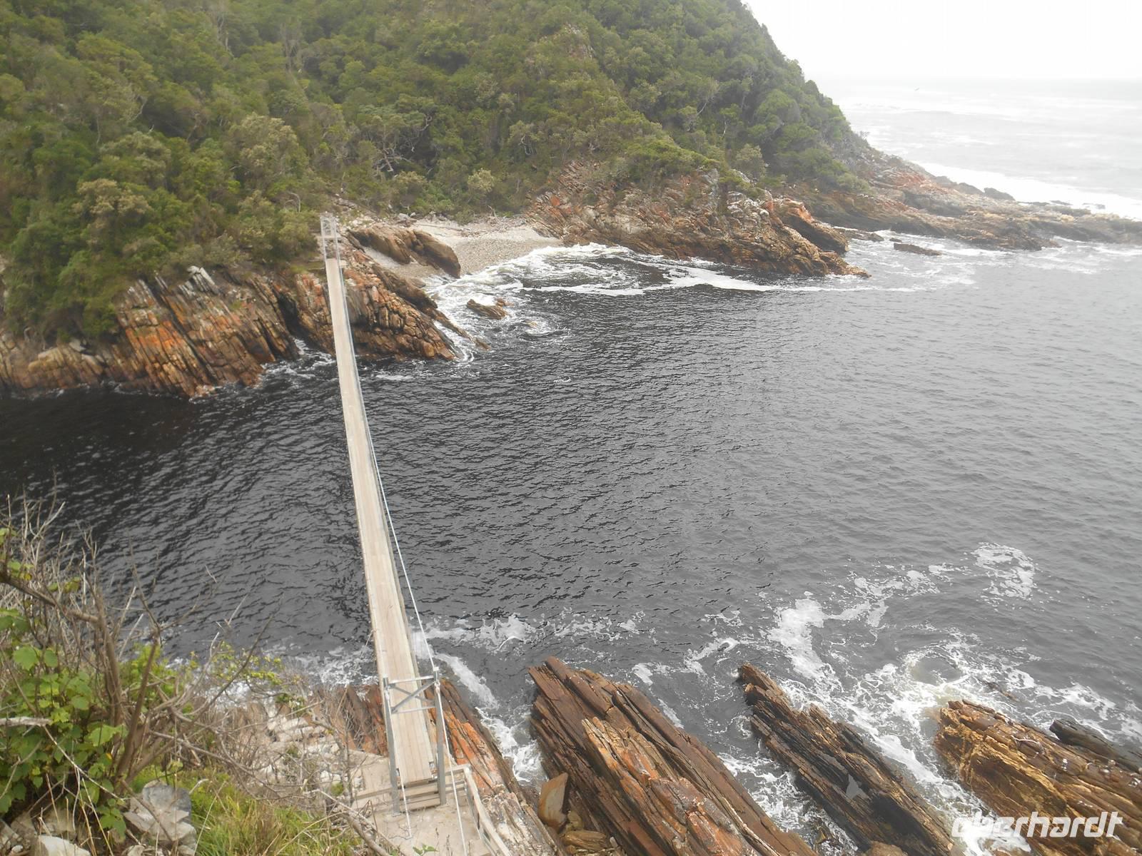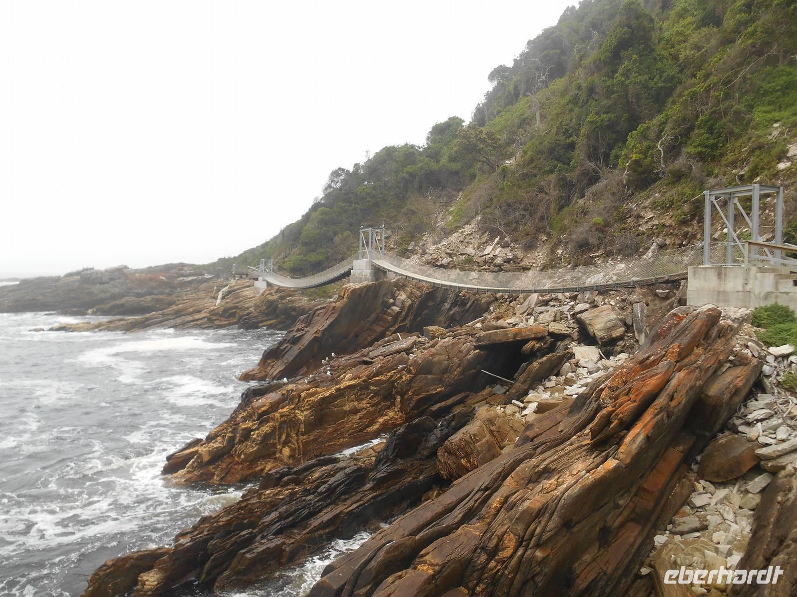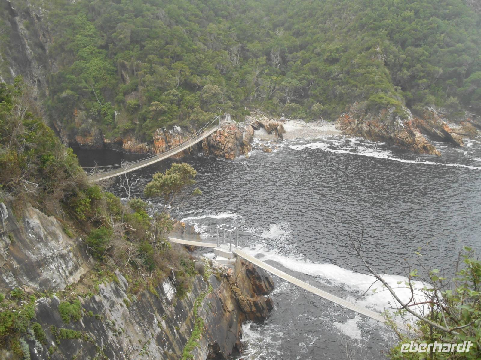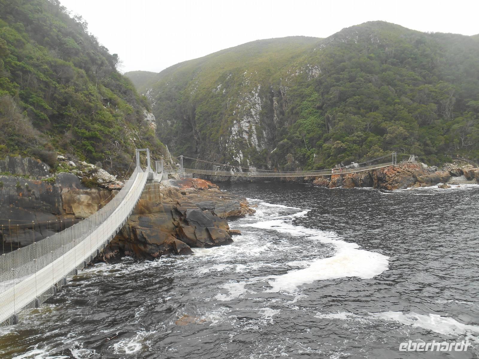 Von Knysna aus ging es weiter entlang der berühmten Garden-Route und über Plettenberg Bay in den Tsitsikamma Nationalpark. Hier unternahmen wir eine etwa 30-minütige Wanderung zum Storms River. Durch den immergrünen Wald schlängelte sich der Weg oberhalb entlang der Küste und es gab unterwegs unzählige Stichwege ans Meer. Über den Storms River führt eine Hängebrücke, von der aus wir einen wunderbaren Blick in die tiefe Schlucht und aufs nahe Meer hatten. Diese Hängebrücke erstreckt sich über die Mündung des Storm River, der an dieser Stelle 69 Meter breit und 9 Meter tief ist. Die im Jahr 2006 erneuerte Brücke ist 77 Meter lang und kann schon etwas schaukeln, wenn man sie überquert. Ihre Tragkraft beträgt 2.250 kg, sie ist somit für 25 Personen zugelassen. Zum Glück konnten wir unsere Wanderung noch im Trockenen erleben, denn als wir weiter in Richtung Port Elizabeth fuhren, fing es heftig zu regnen an.