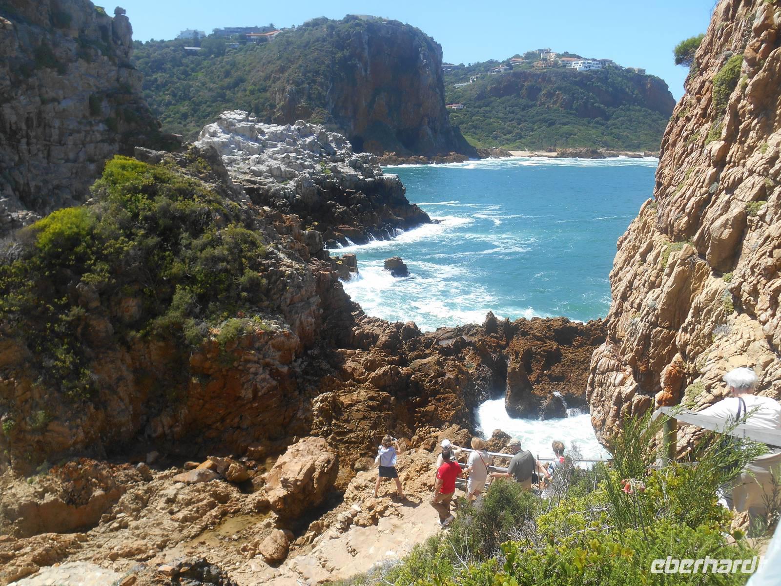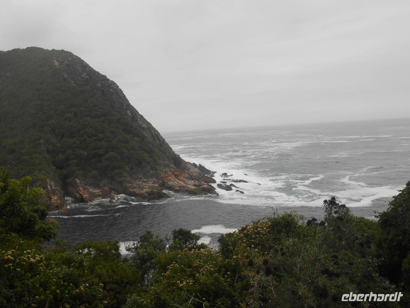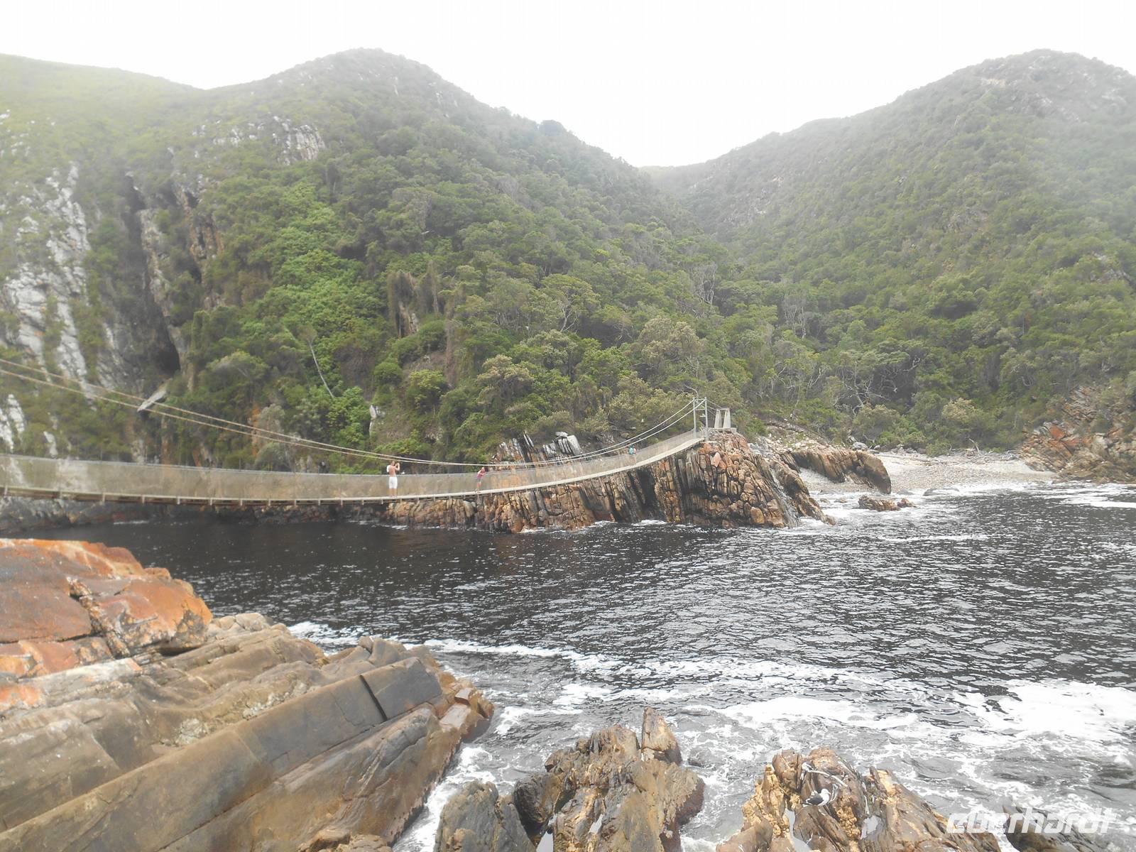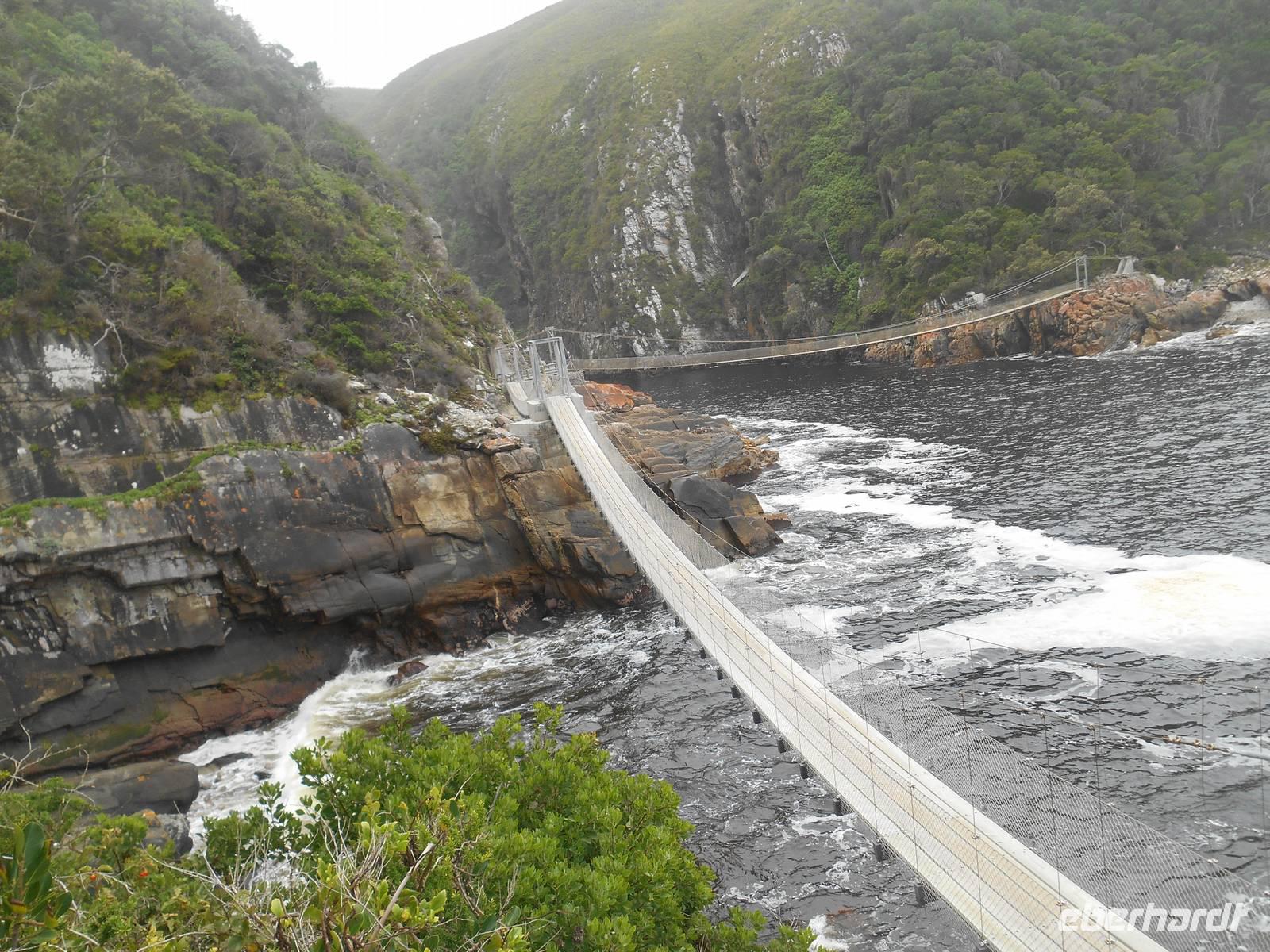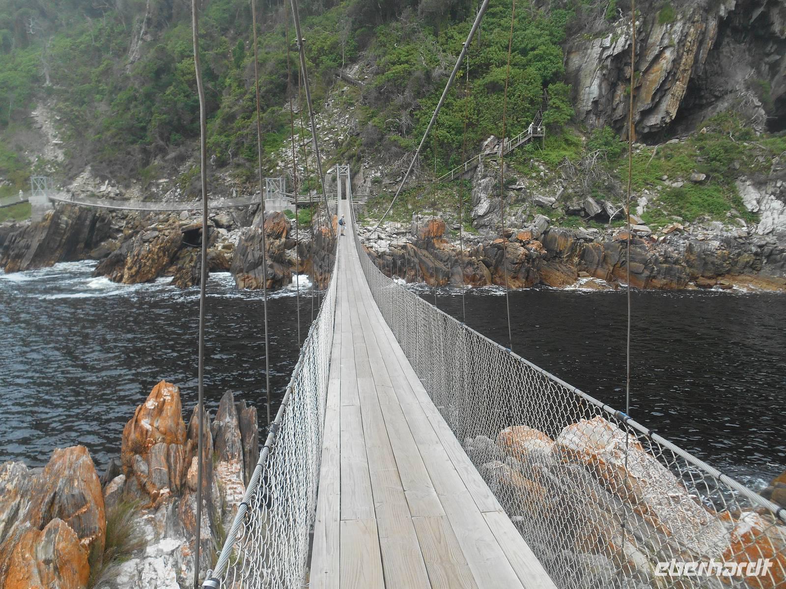 Von Knysna aus ging es weiter entlang der berühmten Garden-Route und über Plettenberg Bay in den Tsitsikamma Nationalpark. Hier unternahmen wir eine etwa 30-minütige Wanderung zum Storms River. Durch den immergrünen Wald schlängelte sich der Weg oberhalb entlang der Küste und es gab unterwegs unzählige Stichwege ans Meer. Über den Storms River führt eine Hängebrücke, von der aus wir einen wunderbaren Blick in die tiefe Schlucht und aufs nahe Meer hatten. Diese Hängebrücke erstreckt sich über die Mündung des Storm River, der an dieser Stelle 69 Meter breit und 9 Meter tief ist. Die im Jahr 2006 erneuerte Brücke ist 77 Meter lang und kann schon etwas schaukeln, wenn man sie überquert. Ihre Tragkraft beträgt 2.250 kg, sie ist somit für 25 Personen zugelassen. Zum Glück konnten wir unsere Wanderung noch im Trockenen erleben, denn als wir weiter in Richtung Port Elizabeth fuhren, fing es heftig zu regnen an.