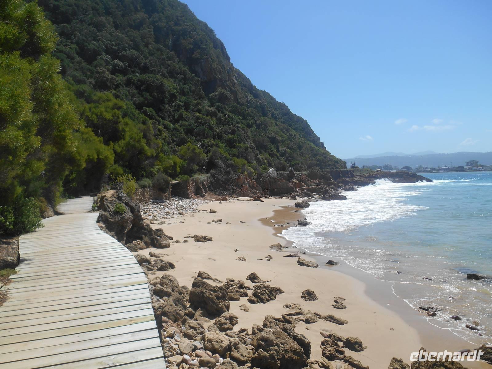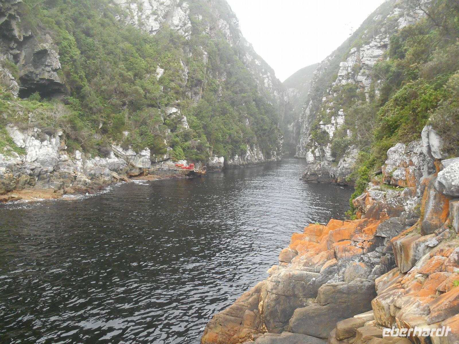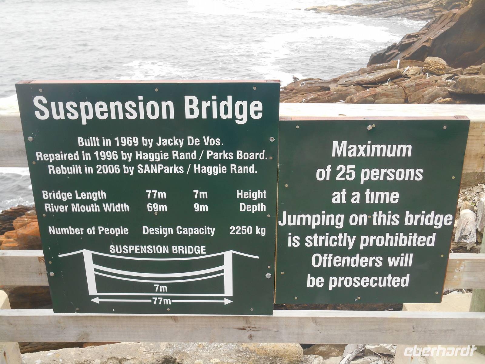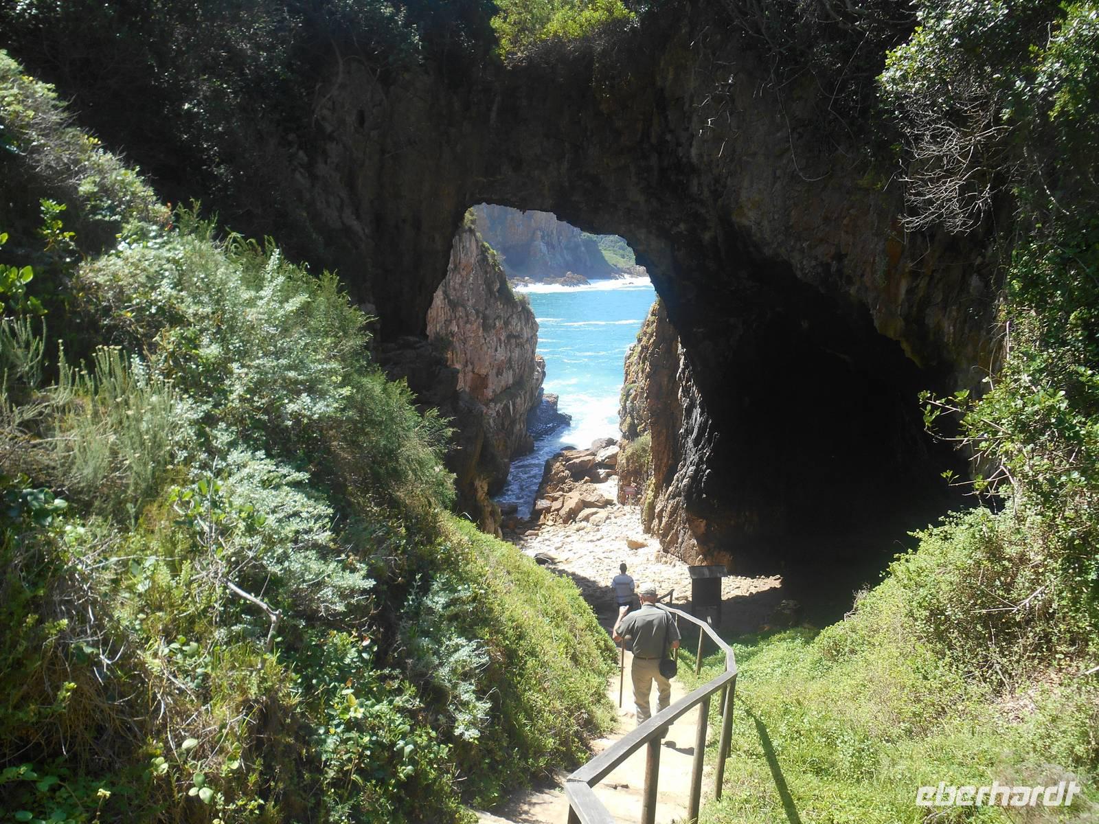 Von Knysna aus ging es weiter entlang der berühmten Garden-Route und über Plettenberg Bay in den Tsitsikamma Nationalpark. Hier unternahmen wir eine etwa 30-minütige Wanderung zum Storms River. Durch den immergrünen Wald schlängelte sich der Weg oberhalb entlang der Küste und es gab unterwegs unzählige Stichwege ans Meer. Über den Storms River führt eine Hängebrücke, von der aus wir einen wunderbaren Blick in die tiefe Schlucht und aufs nahe Meer hatten. Diese Hängebrücke erstreckt sich über die Mündung des Storm River, der an dieser Stelle 69 Meter breit und 9 Meter tief ist. Die im Jahr 2006 erneuerte Brücke ist 77 Meter lang und kann schon etwas schaukeln, wenn man sie überquert. Ihre Tragkraft beträgt 2.250 kg, sie ist somit für 25 Personen zugelassen. Zum Glück konnten wir unsere Wanderung noch im Trockenen erleben, denn als wir weiter in Richtung Port Elizabeth fuhren, fing es heftig zu regnen an.