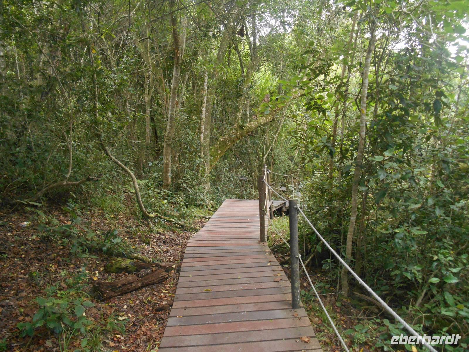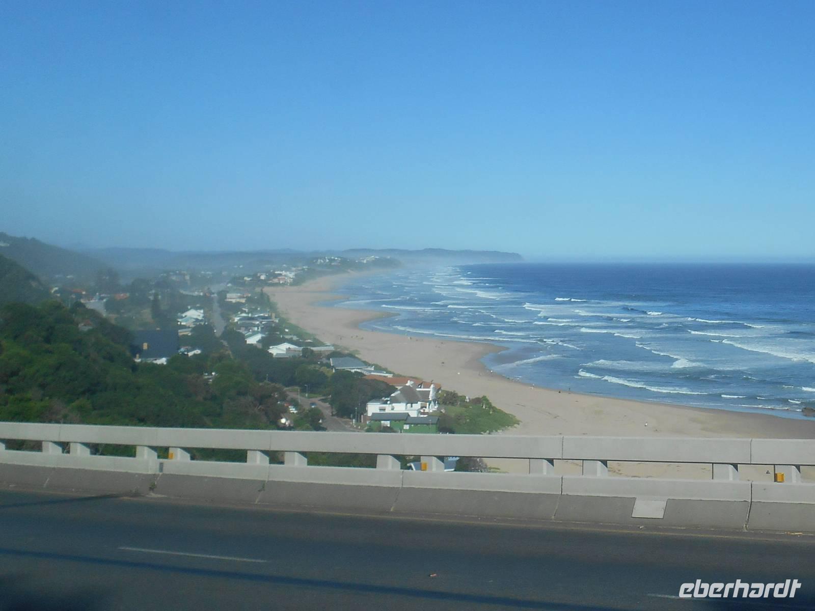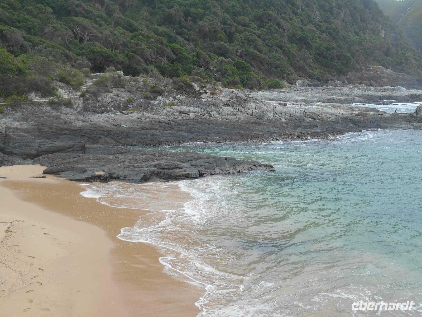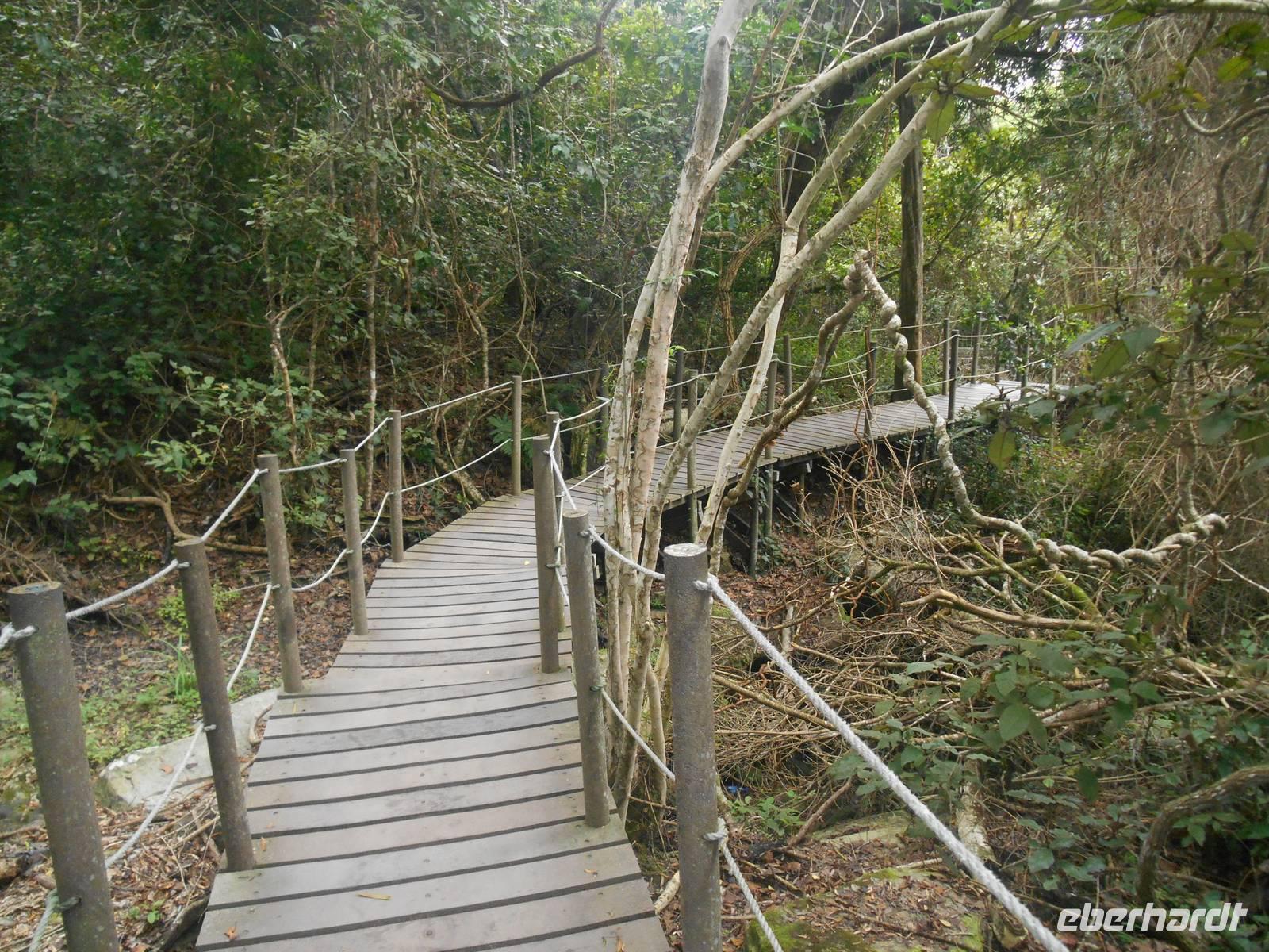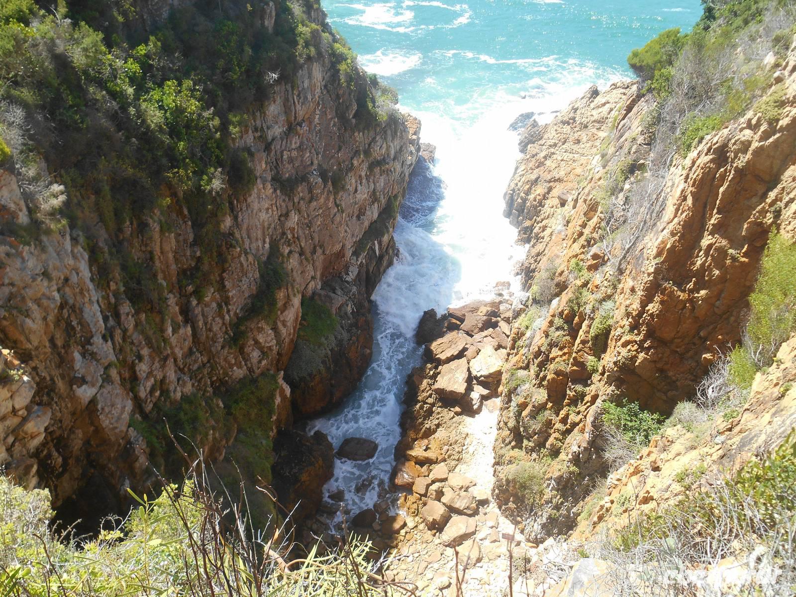Von Knysna aus ging es weiter entlang der berühmten Garden-Route und über Plettenberg Bay in den Tsitsikamma Nationalpark. Hier unternahmen wir eine etwa 30-minütige Wanderung zum Storms River. Durch den immergrünen Wald schlängelte sich der Weg oberhalb entlang der Küste und es gab unterwegs unzählige Stichwege ans Meer. Über den Storms River führt eine Hängebrücke, von der aus wir einen wunderbaren Blick in die tiefe Schlucht und aufs nahe Meer hatten. Diese Hängebrücke erstreckt sich über die Mündung des Storm River, der an dieser Stelle 69 Meter breit und 9 Meter tief ist. Die im Jahr 2006 erneuerte Brücke ist 77 Meter lang und kann schon etwas schaukeln, wenn man sie überquert. Ihre Tragkraft beträgt 2.250 kg, sie ist somit für 25 Personen zugelassen. Zum Glück konnten wir unsere Wanderung noch im Trockenen erleben, denn als wir weiter in Richtung Port Elizabeth fuhren, fing es heftig zu regnen an.