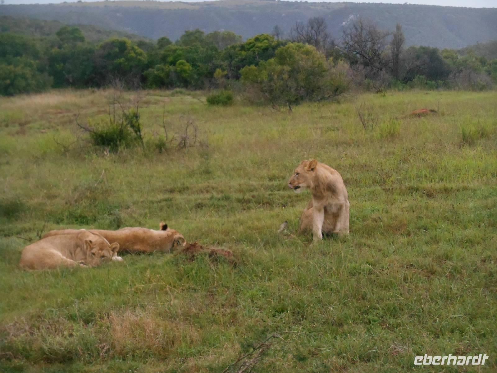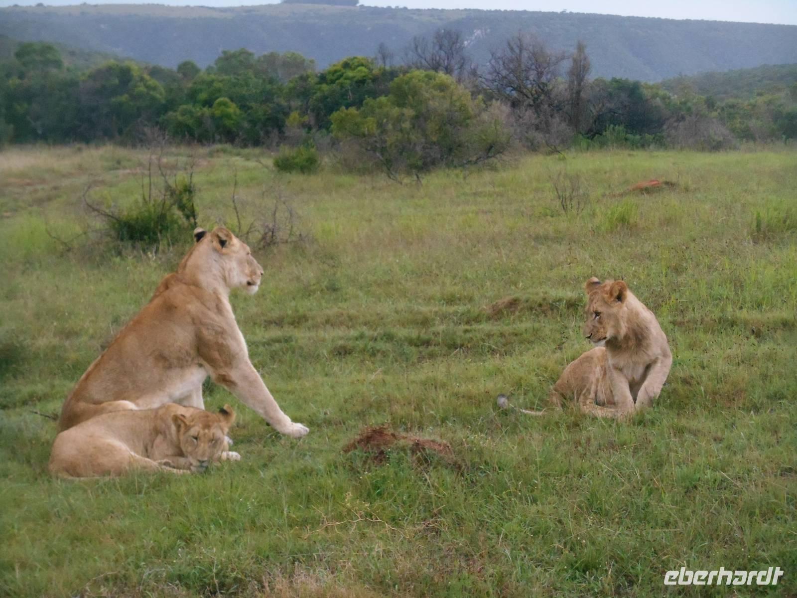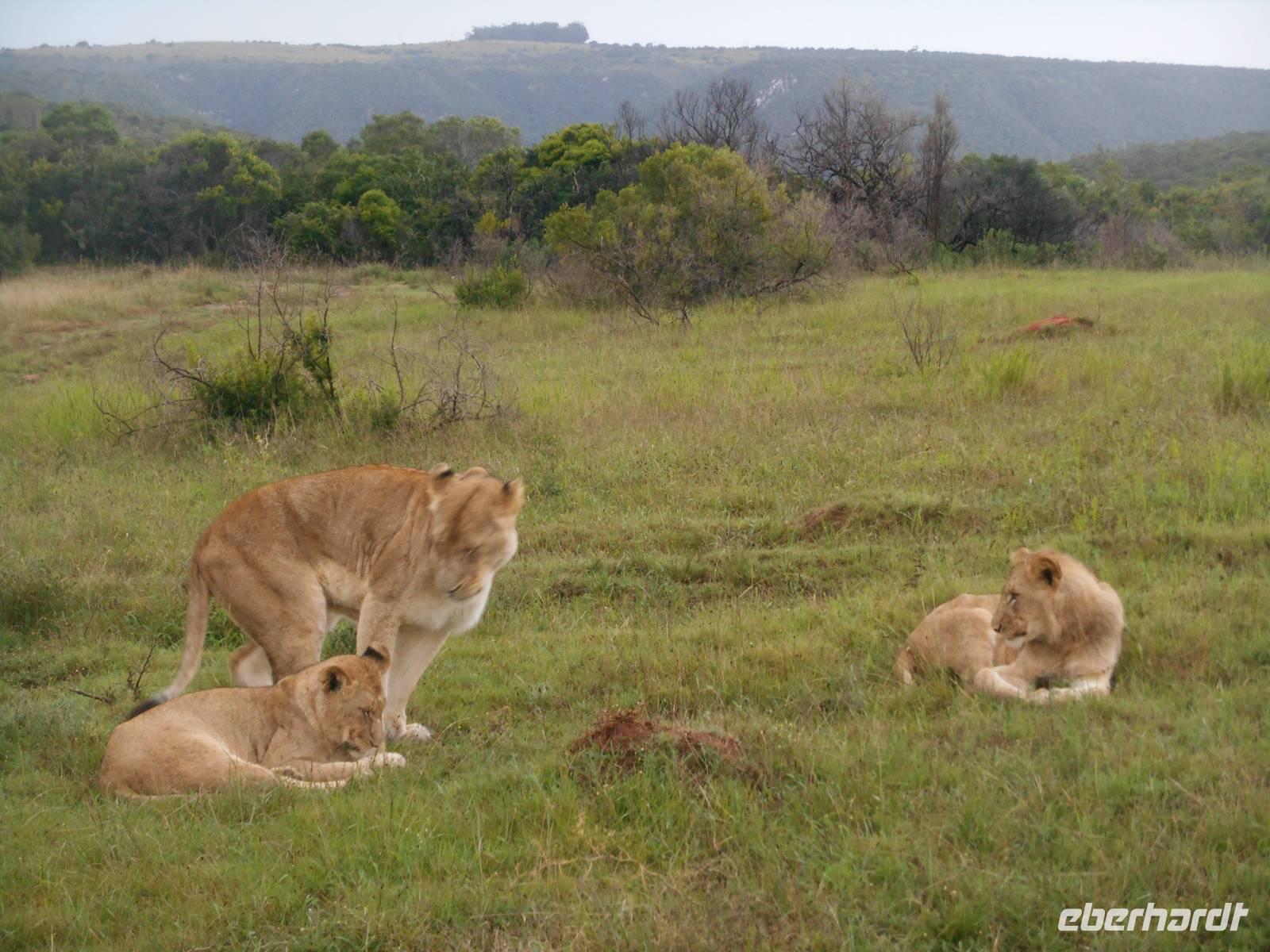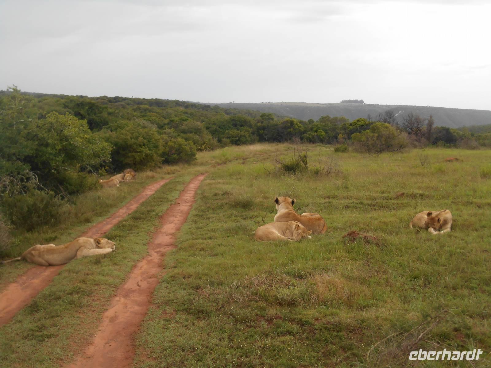 Am frühen Nachmittag mussten wir uns nunmehr leider von unserem Fahrer bzw. Reiseleiter Chris verabschieden und wurden von unserem persönlichen Ranger Dan vom Kariega Wildreservat in Empfang genommen. Der erste Eindruck von hier war allerdings nicht unbedingt vielversprechend, denn ein überdimensionaler Regenguss begleitete uns auf unserer Fahrt zur Lodge. Die Kariega Main Lodge verfügt über mehrere Holz-Chalets, die gekonnt in den Busch integriert sind und damit eine natürliche Umgebung schaffen. Jedes Chalets verfügt über eine eigene Aussichtsterrasse - eine erholsame und freundliche Umgebung, um den afrikanischen Busch ganz einfach zu genießen! Das Geländefahrzeug jedoch, das uns zu den Chalets chauffierte, verfügte allerdings über kein Dach und somit wurden wir alle innerhalb der 5-minütigen Fahrt klatschnass - unglaublich! Nach diversen "TrockenlegungsarbeitenZwinkernd" in unserer Lodge trafen wir uns zum gemeinsamen Mittagessen im Restaurant. Pünktlich kurz vor 17 Uhr begann dann unsere erste Abend-Safari und diese bot uns trotz Nieselregens einiges - Impalas, Löwen und vieles mehr! Wir waren begeistert - die ersten "Big Five" zum Greifen nah! Unter dem Begriff "Big Five" versteht man in Afrika den Löwen, Leoparden, Büffel, Elefanten und das Nashorn. Der Name "Big Five" stammt noch aus der Zeit der Großwildjäger - hier wurden die großen Fünf nicht nach der Körpergröße bemessen, sondern nach der Schwierigkeit und Gefährlichkeit des zu bejagenden Wildes.