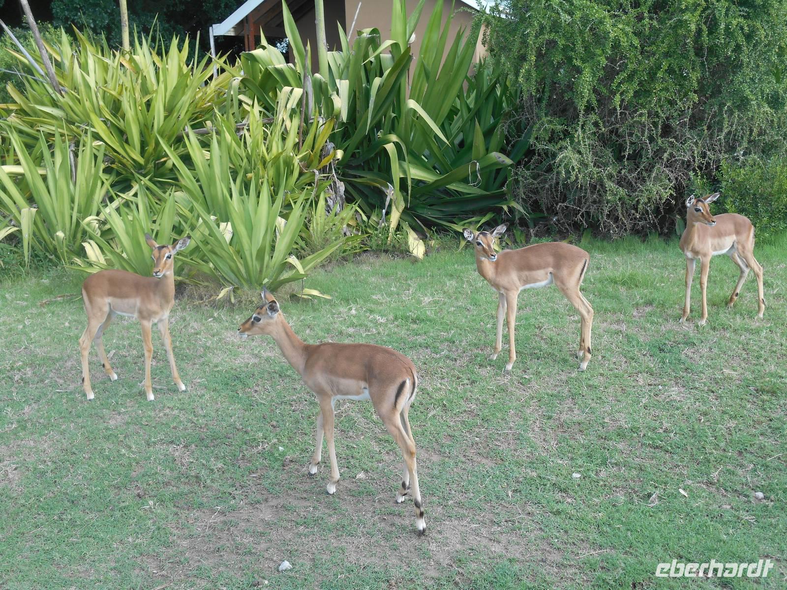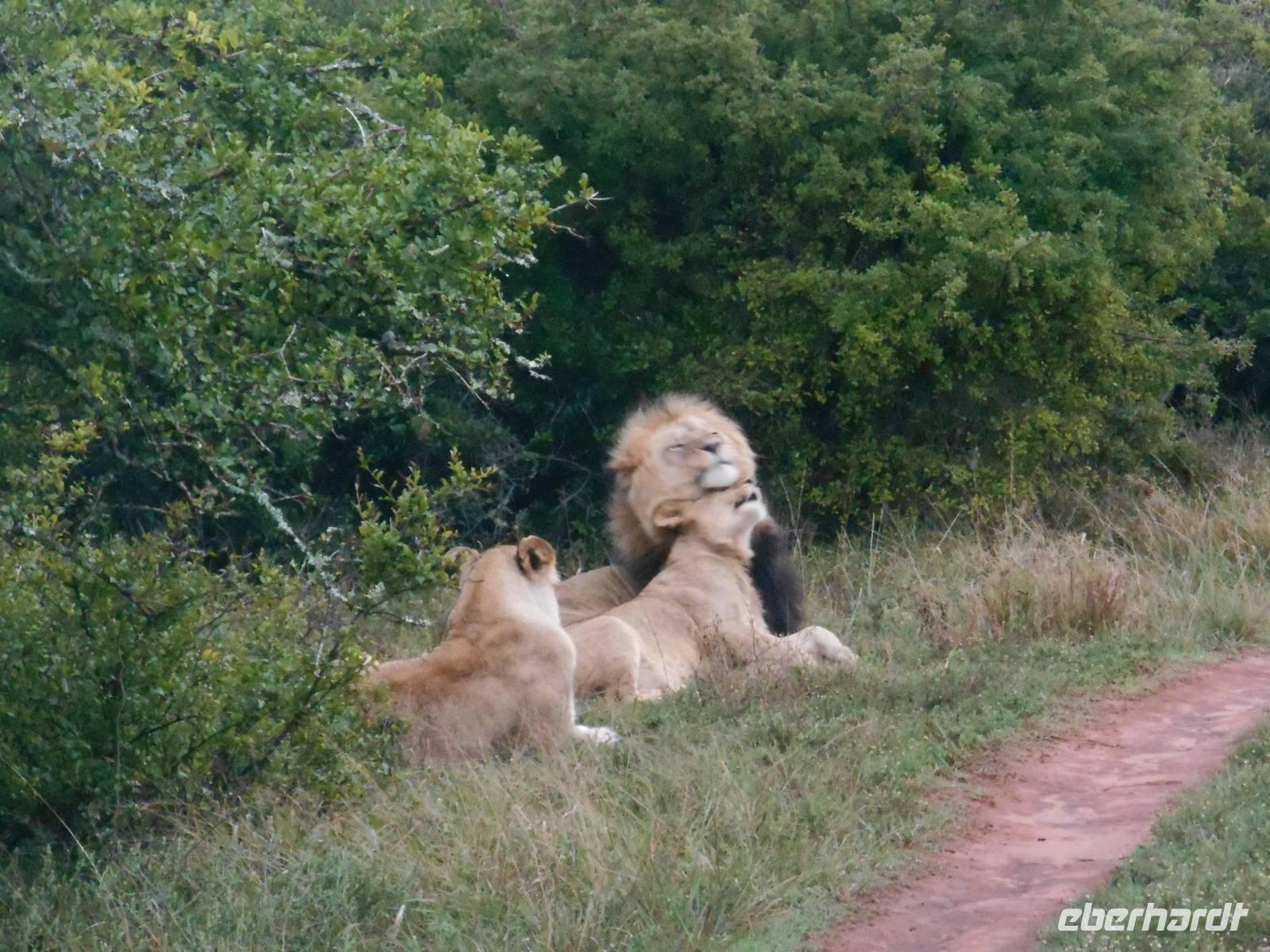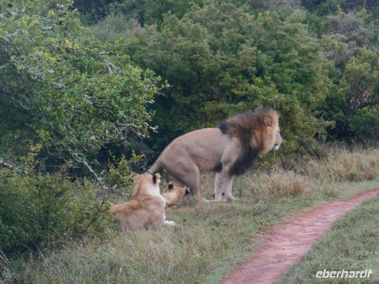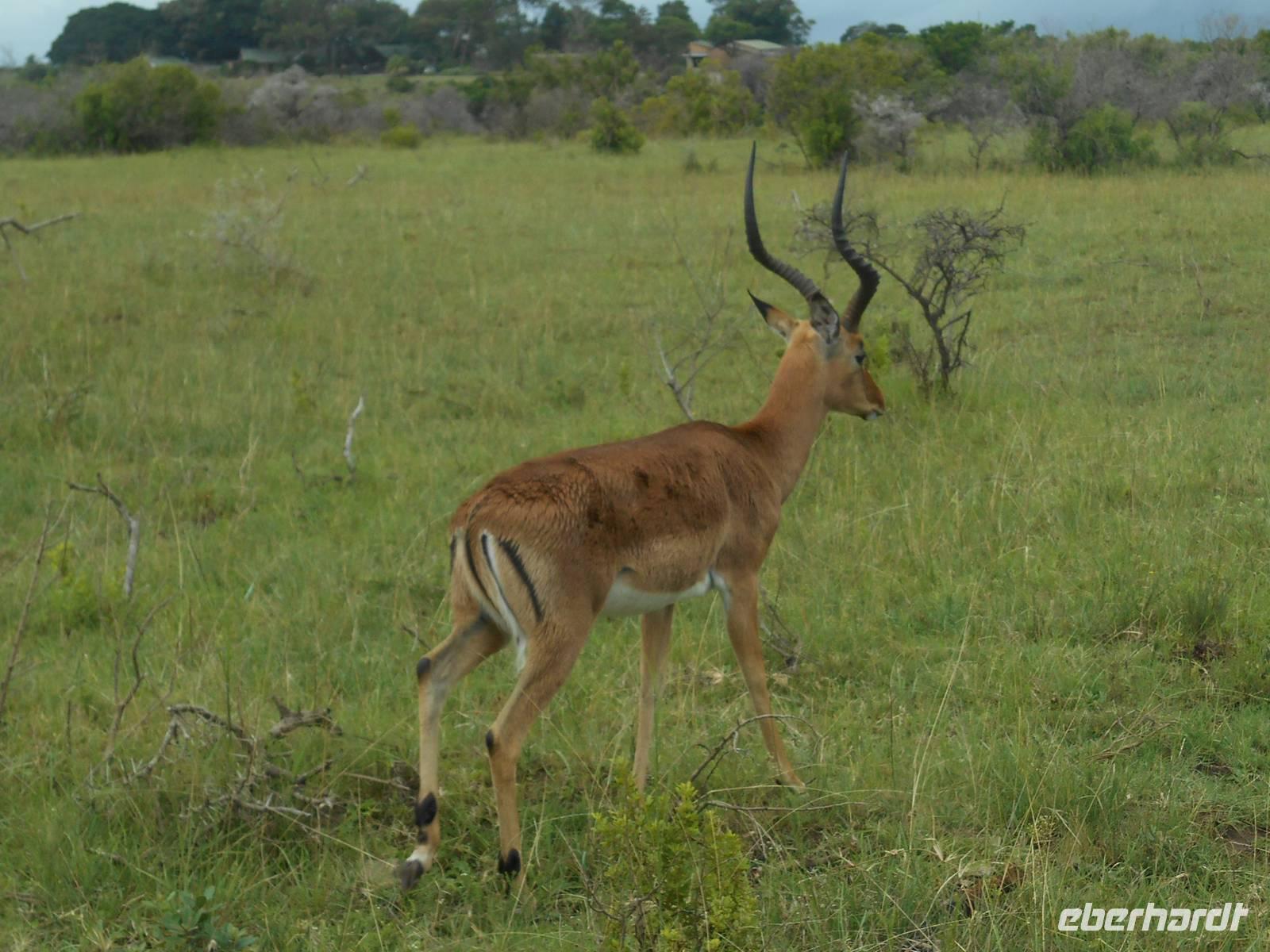 Am frühen Nachmittag mussten wir uns nunmehr leider von unserem Fahrer bzw. Reiseleiter Chris verabschieden und wurden von unserem persönlichen Ranger Dan vom Kariega Wildreservat in Empfang genommen. Der erste Eindruck von hier war allerdings nicht unbedingt vielversprechend, denn ein überdimensionaler Regenguss begleitete uns auf unserer Fahrt zur Lodge. Die Kariega Main Lodge verfügt über mehrere Holz-Chalets, die gekonnt in den Busch integriert sind und damit eine natürliche Umgebung schaffen. Jedes Chalets verfügt über eine eigene Aussichtsterrasse - eine erholsame und freundliche Umgebung, um den afrikanischen Busch ganz einfach zu genießen! Das Geländefahrzeug jedoch, das uns zu den Chalets chauffierte, verfügte allerdings über kein Dach und somit wurden wir alle innerhalb der 5-minütigen Fahrt klatschnass - unglaublich! Nach diversen "TrockenlegungsarbeitenZwinkernd" in unserer Lodge trafen wir uns zum gemeinsamen Mittagessen im Restaurant. Pünktlich kurz vor 17 Uhr begann dann unsere erste Abend-Safari und diese bot uns trotz Nieselregens einiges - Impalas, Löwen und vieles mehr! Wir waren begeistert - die ersten "Big Five" zum Greifen nah! Unter dem Begriff "Big Five" versteht man in Afrika den Löwen, Leoparden, Büffel, Elefanten und das Nashorn. Der Name "Big Five" stammt noch aus der Zeit der Großwildjäger - hier wurden die großen Fünf nicht nach der Körpergröße bemessen, sondern nach der Schwierigkeit und Gefährlichkeit des zu bejagenden Wildes.