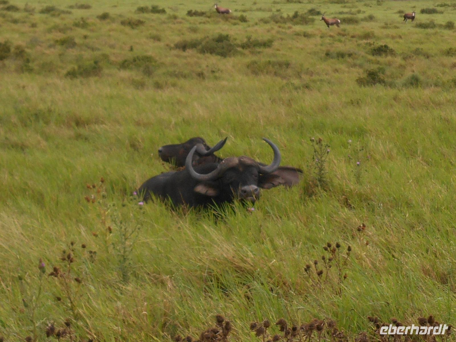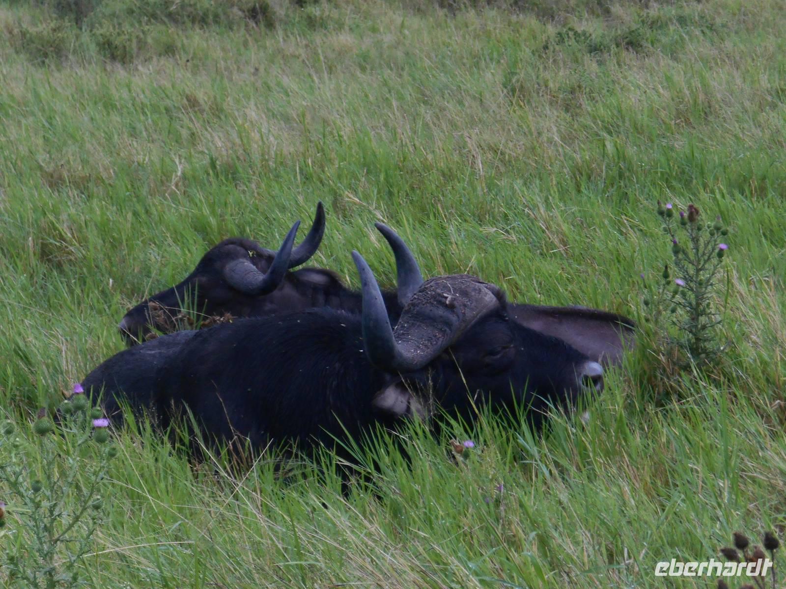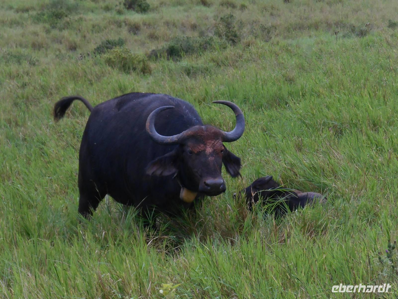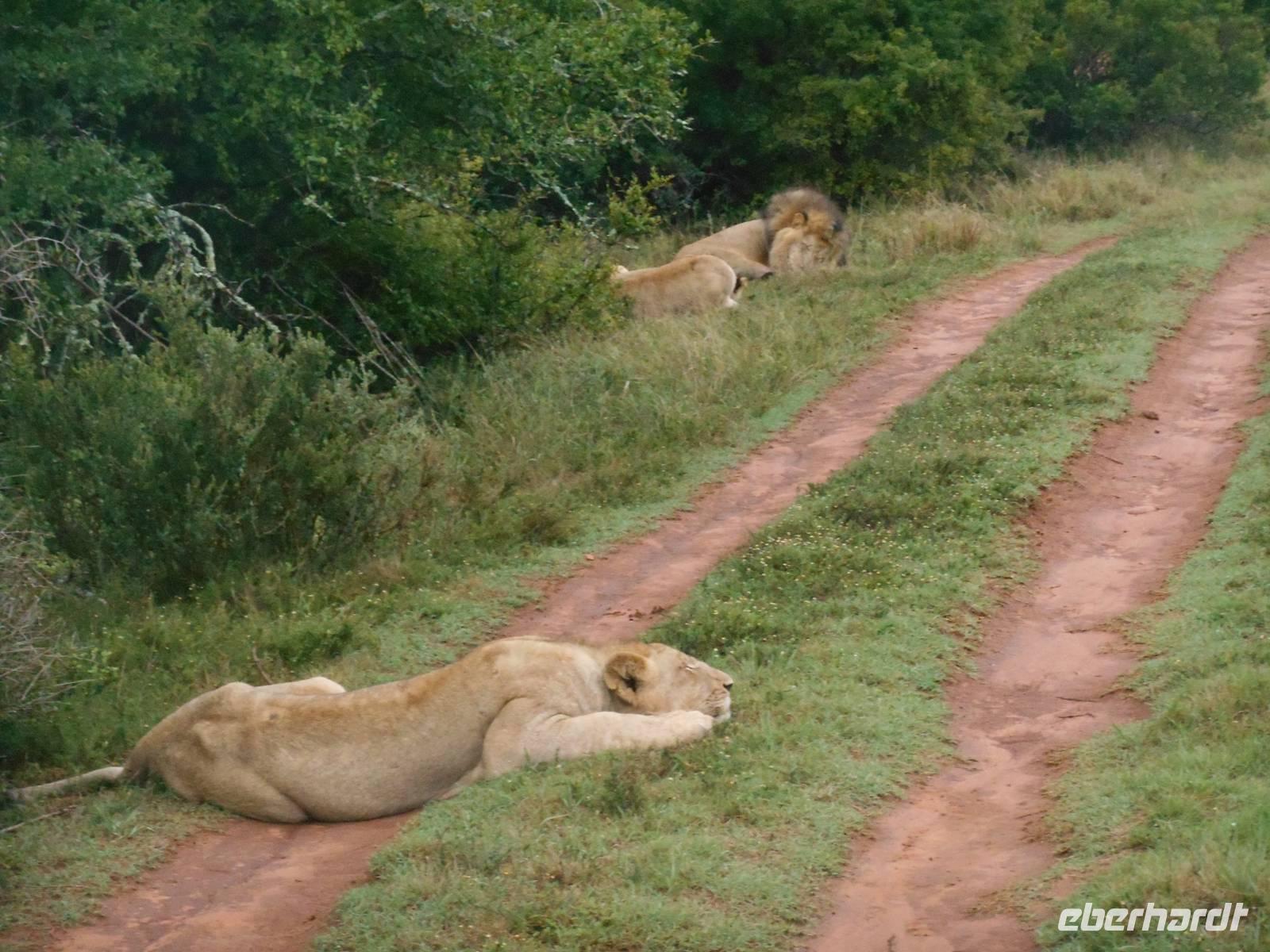 Am frühen Nachmittag mussten wir uns nunmehr leider von unserem Fahrer bzw. Reiseleiter Chris verabschieden und wurden von unserem persönlichen Ranger Dan vom Kariega Wildreservat in Empfang genommen. Der erste Eindruck von hier war allerdings nicht unbedingt vielversprechend, denn ein überdimensionaler Regenguss begleitete uns auf unserer Fahrt zur Lodge. Die Kariega Main Lodge verfügt über mehrere Holz-Chalets, die gekonnt in den Busch integriert sind und damit eine natürliche Umgebung schaffen. Jedes Chalets verfügt über eine eigene Aussichtsterrasse - eine erholsame und freundliche Umgebung, um den afrikanischen Busch ganz einfach zu genießen! Das Geländefahrzeug jedoch, das uns zu den Chalets chauffierte, verfügte allerdings über kein Dach und somit wurden wir alle innerhalb der 5-minütigen Fahrt klatschnass - unglaublich! Nach diversen "TrockenlegungsarbeitenZwinkernd" in unserer Lodge trafen wir uns zum gemeinsamen Mittagessen im Restaurant. Pünktlich kurz vor 17 Uhr begann dann unsere erste Abend-Safari und diese bot uns trotz Nieselregens einiges - Impalas, Löwen und vieles mehr! Wir waren begeistert - die ersten "Big Five" zum Greifen nah! Unter dem Begriff "Big Five" versteht man in Afrika den Löwen, Leoparden, Büffel, Elefanten und das Nashorn. Der Name "Big Five" stammt noch aus der Zeit der Großwildjäger - hier wurden die großen Fünf nicht nach der Körpergröße bemessen, sondern nach der Schwierigkeit und Gefährlichkeit des zu bejagenden Wildes.