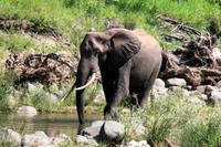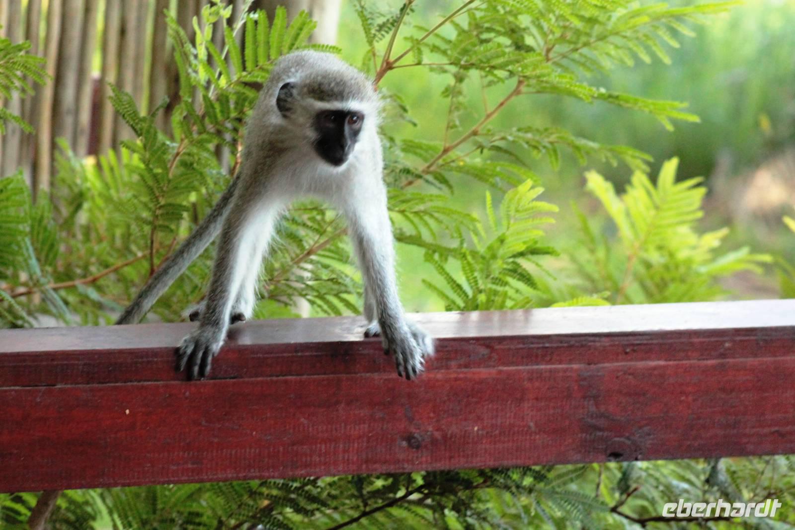 Für das Knacken in der Nacht war der Elefant verantwortlich, was seine Fußspuren vor unserem Zelt bewiesen. Sein Ziel: die Überreste seines Lieblingsbaumes. Es muß sehr viel Betrieb zwischen unseren Zelten gewesen sein, Hippo- und andere Getierfährten waren deutlich zu erkennen. Natürlich nutzen wir noch einmal die Möglichkeit, eine letzte, frühmorgendliche Pirschfahrt im Wildreservat unternehmen, die aber sehr spärlich ausfiel. Zum Frühstück in der Lodge beehrten uns dann einige Meerkatzen und waren scharf auf den Zucker. Danach verabschiedeten wir uns herzlich von Vivienne und ihren Mitarbeitern und begannen unsere längere Fahrt nach Johannesburg. Auf dem Weg zum Ausgang des Reservates schien es so, als wollten sich die Tiere von uns verabschieden: Elefant, Büffel und Zebras. Über Hoedspruit, den Pass und Lydenburg erreichten wir Dullstrom. In der hübschen Farmerstadt kehrten wir im Rose Cottage ein und pausierten bei Kaffee und kleinem Imbiss. Hier befindet sich auch der höchst gelegene Bahnhof Südafrikas und wir konnten endlich Makadamia-Nüssen kaufen. Weiter ging`s via Belfast und über die Autobahn nach Johannesburg, unsere Knochen waren von der langen Fahrt etwas müde und steif. Die letzte Nacht verbrachten wir im Misty Hills Country Hotel, nahe Muldersdrift. Das Hotel befindet sich einer wunderschönen Gartenanlage. Am Abend erlebten wir die afrikanische Gastfreundlichkeit im bekannten Restaurant "Carnivore" der Hotelanlage. Zum Abendessen begrüßte uns auch Astrid von unserer südafrikanischen Agentur. Mittelpunkt des Restaurants ist der offene Grill, auf dem sich riesige Fleischspieße drehen. Wir probierten neben Rind, Lamm und Schwein auch Strauß, Springbock und Krokodil. Dazu wurden die passenden Dips und afrikanische Beilagen serviert. Zum Abschluss spendierte Eberhardt die passenden Getränke. Wir verbrachten den letzten Abend in einer besonderen Atmosphäre und schlemmten so viel wir wollten. Der Abschluss-Amarula durfte dabei auch nicht fehlen. Den Tag ließen wir in geselliger Runde im Gartenpavillon auf Teich ausklingen. Die Show stahl uns ein dickhalsiger Ochsenfrosch mit seinem lauten Gequake!