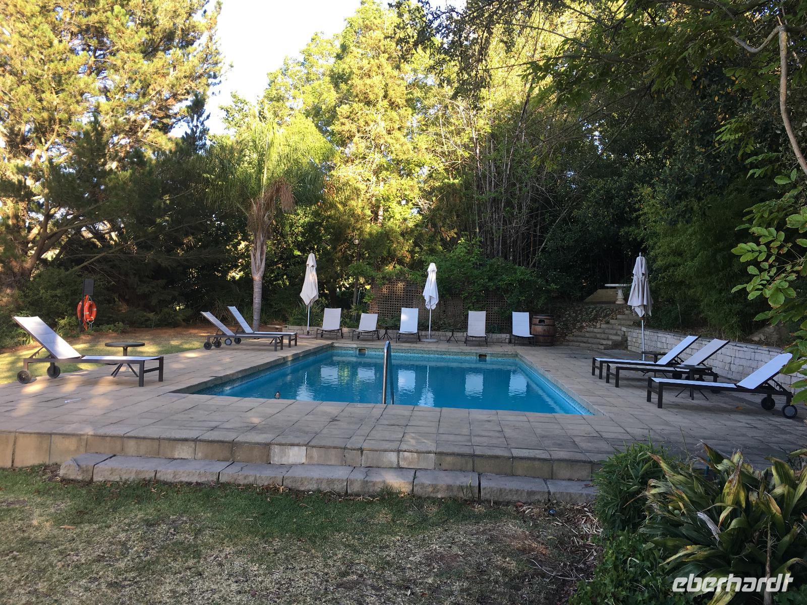 Nach unserer ersten Nacht in Südafrika werden wir von warmen Sonnenstrahlen geweckt. Wir gönnen uns ein leckeres Frühstück auf der Terrasse des Restaurants und um 09.00 Uhr beginnt schon unser heutiger Tagesausflug. Zuerst besuchen wir das Altdorfmuseum in Stellenbosch mit seinen fünf Häusern unterschiedlichster Stilrichtungen. Nach Kapstadt ist die kleine Universitätsstadt Stellenbosch die zweitälteste Stadt in Südafrika. Gegründet wurde sie 1679. Am Eingang erhalten wir Informationsmaterial in Deutsch sowohl zum Dorfmuseum als auch zum Stadtgründer Simon van der Stel. Neben den vier Häusern mit Namen "Schreuderhuis" aus dem Jahre 1709, dem "Blettermanhuis" 1789, dem "Grosvenor House" 1803 und dem "Haus von O. M. Bergh" 1850 befindet sich hier ebenso das 1940 fertiggestellte "Lubbe-Building" von Herrn Andries Petrus Lubbe, welches auch den offiziellen Haupteingang des Dorfmuseums darstellt. Anschließend schlendern wir auf den Gehwegen mit Eichen gesäumten Straßen entlang und bewundern den schönen Ort mit seiner kapholländischer Architektur. Einige Gäste hätten sich in diesem ruhigen Örtchen sicher einen längeren Aufenthalt gewünscht, vielleicht beim nächsten Mal ;o) Um 11.00 Uhr fahren wir weiter zur Weinregion Franschhoek. Rund 40 Minuten später erreichen wir dieses kleine Örtchen, welches 1688 von den protestantischen Hugenotten gegründet wurde. Der Ort ist auch als "Französisches Eck" bekannt. Wir bummeln durch diesen Ort, schauen uns auf dem "Village Market" nach dem einem oder anderem Souvenir um oder gönnen uns einen köstlichen Kaffee in einem der vielen kleinen Cafés im französischen Flair. Um 13.00 Uhr fahren wir weiter zum Weingut nach Blauwklippen, wo wir eine Weinverkostung genießen werden sowie uns eine Kellerführung geboten wird. Wir erfahren von Herbie, dass bereits seit 1659 Wein in Südafrika hergestellt wird. Rund 20 Jahre später im Jahr 1679 ist die Ernennung von Simon van der Stel als erster niederländischer Gouverneur des Kaps erfolgt. Er gründete sein eigenes Weingut in Constantia und förderte zudem den Anbau weiterer Rebsorten. Zu den bekanntesten Weißweinen zählen Chenin Blanc, Chardonnay, Sauvignon Blanc und Riesling; zu den typischen Rotweinen gehören Cabernet Sauvignon, Merlot, Shiraz, Pinot Noir und die nur in Südafrika vorkommende Rotweinsorte Pinotage. Unsere Verkostung beginnt mit dem Weißwein "Sauvignon Blanc 2017", welcher uns bereits sehr köstlich mundet. Dazu wird jedem Gast eine Picknick-Platte mit drei verschiedenen Käsesorten, Brot, Butter, eingelegten Birnen, einem Brownie, einem Puddingtörtchen, einem Käse-Zwiebel-Quiche-Törtchen, eingelegten Zwiebeln, saure Gurken, verschiedenen Saucen wie Humus, Schinkenmarmelade und Hühnchenleberpastete sowie ein kleines Glas mit Couscous, Roter Bete, Frischkäse, Rucola und grünem Pesto gereicht. Wir dürfen weiter den Weißwein "White Zinfandel 2017", die zwei Rotweine "Malbec 2017" und "Zinfandel 2016" sowie eine Art Aperitif mit Namen "B&A-Before&After" probieren. Die Erklärung zu den einzelnen Weinen erhalten wir in Deutsch durch die deutsche Praktikantin Nicole. Anschließend schauen wir uns den großen Garten und das ehemalige Herrenhaus an. Hier entsteht auch unser erstes gemeinsames tolles Gruppenfoto mit den Bergen im Hintergrund sowie blauem Himmel! Bereits an dieser Stelle sei erwähnt, dass das Wort "Gruppenfoto" auf unserer Reise noch sehr oft fallen wird ;o) Dann führt uns Nicole durch den Weinkeller. Um 16.00 Uhr fahren wir wieder zum Hotel zurück. Im Hotel angekommen lädt uns die grüne Landschaft zu einem entspannten Spaziergang oder der Hotelpool für eine angenehme Abkühlung ein. Zum Abendessen trifft sich der Großteil der Gäste auf der Terrasse wieder, um gemeinsam leckeren Salat, Wraps oder Pizza zu essen. Ein wunderschöner Tag neigt sich dem Ende, wir sind schon ganz gespannt auf den morgigen Jahreswechsel.