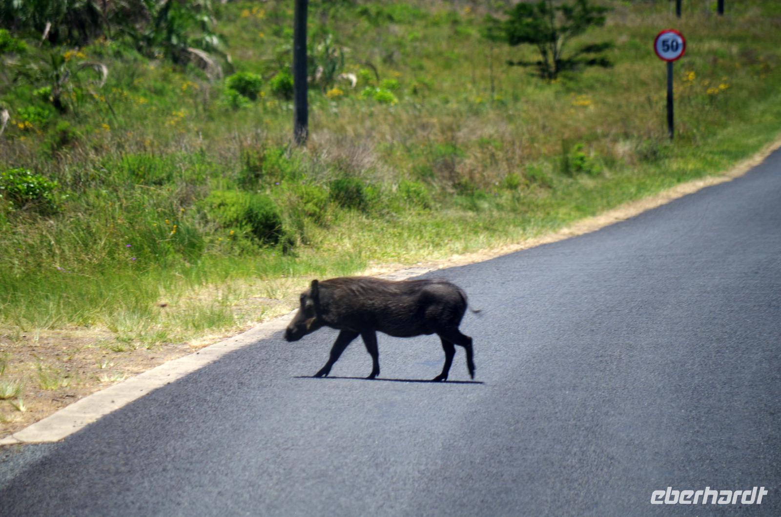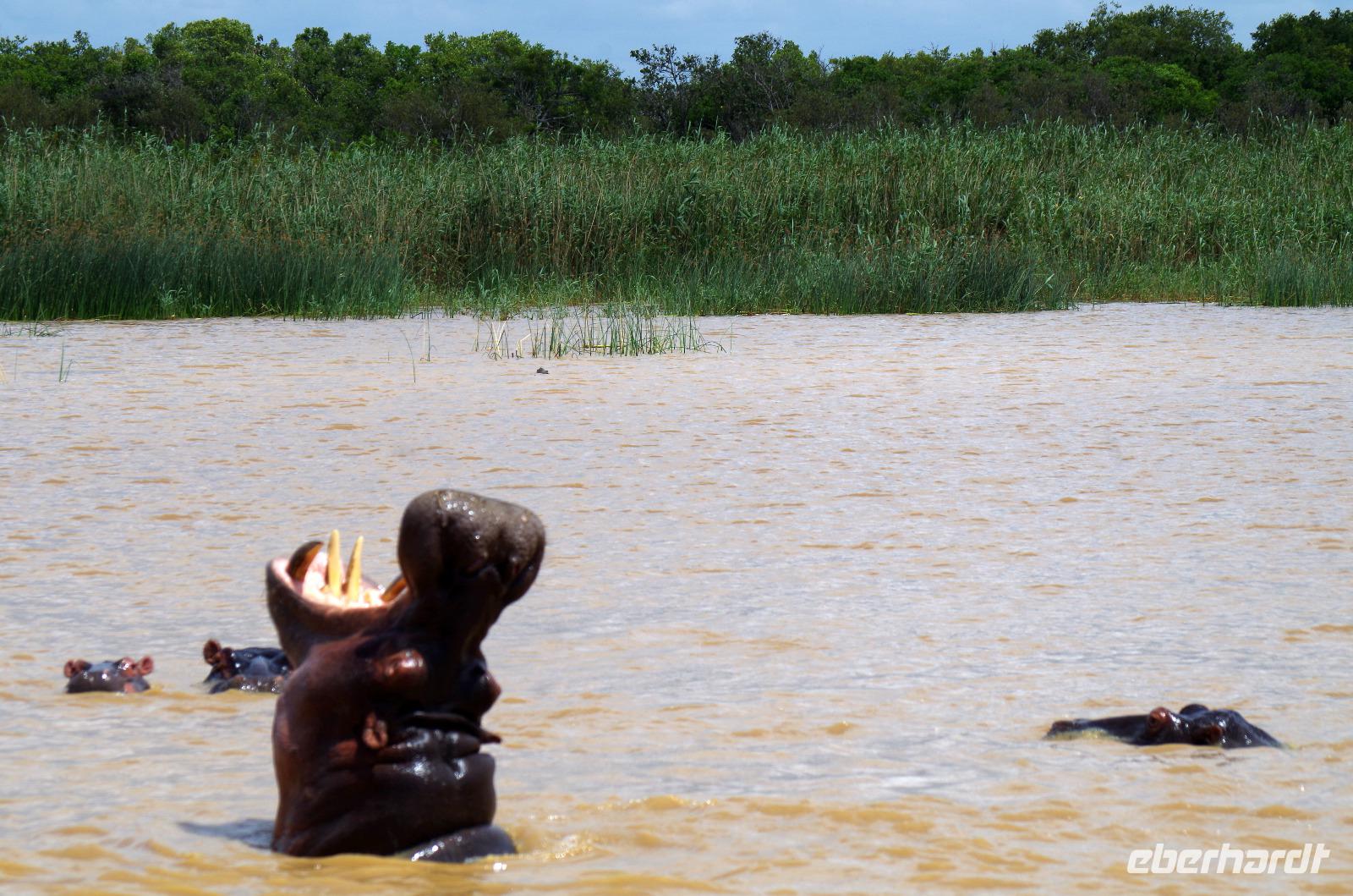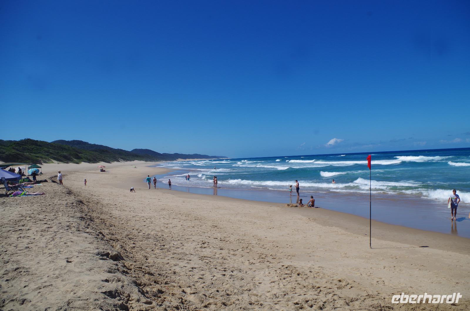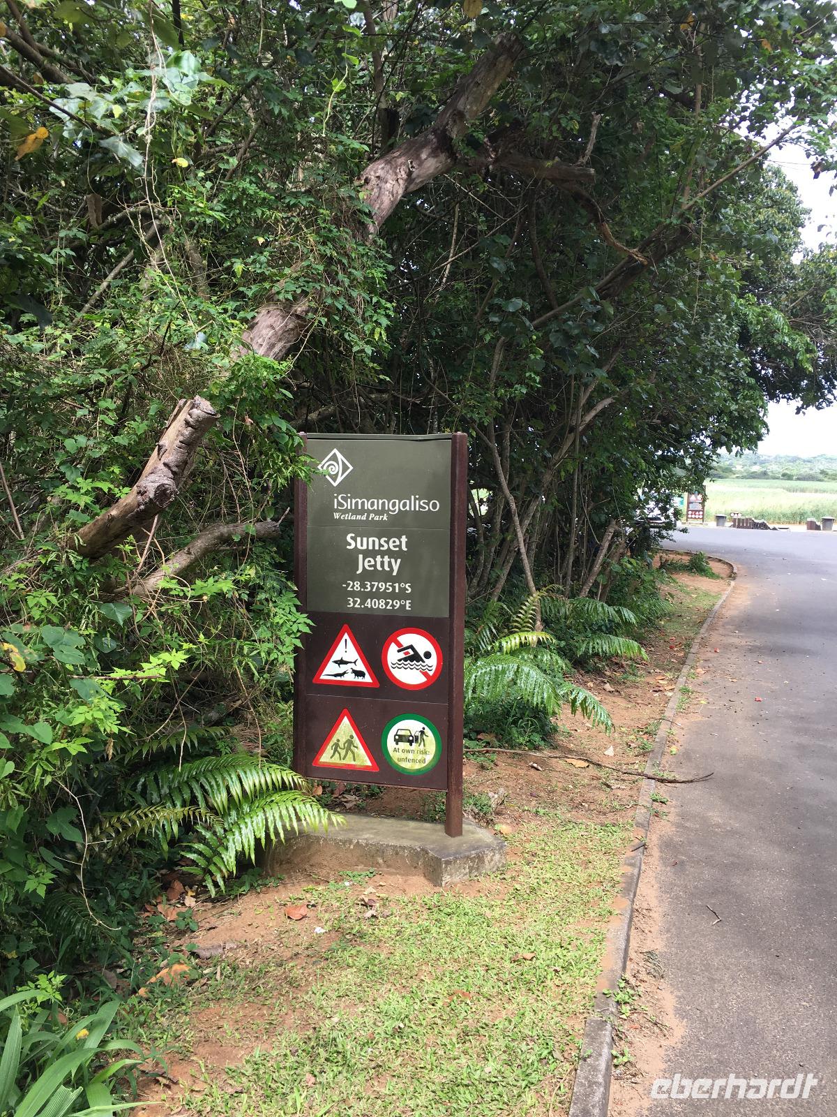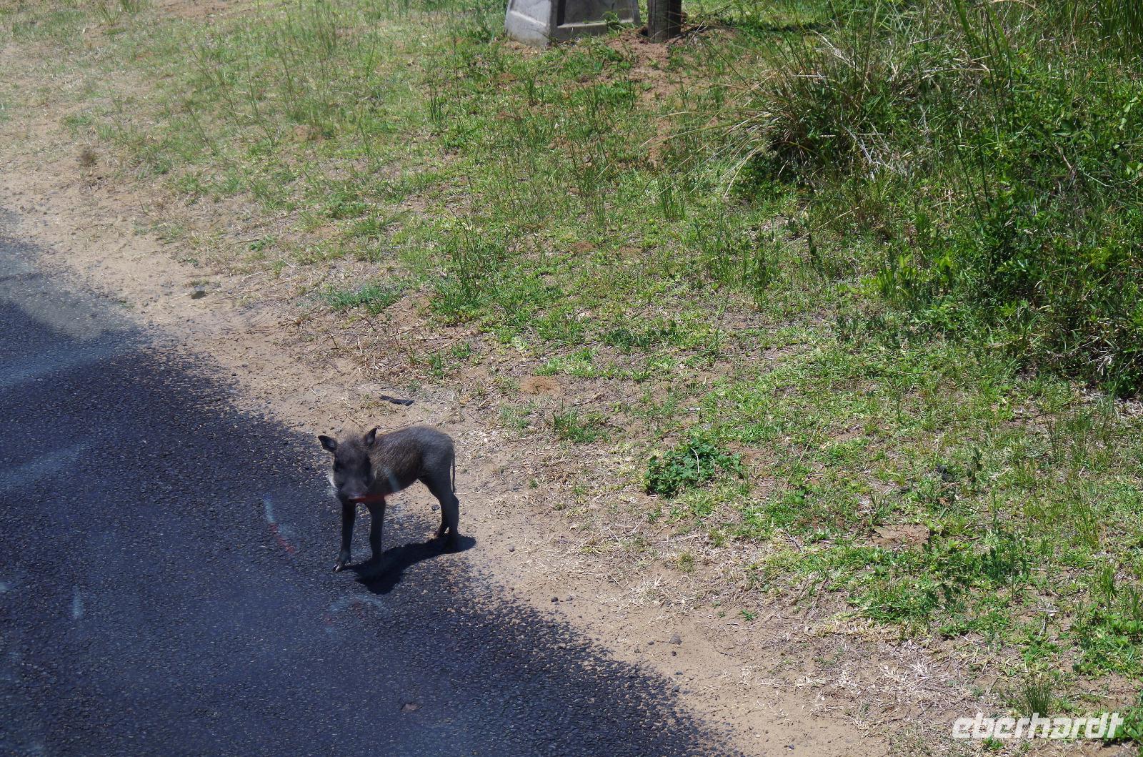 Nach einem leckeren Frühstück verstauen wir unsere Badesachen im Bus und laufen gemeinsam rund zehn bis fünfzehn Gehminuten an die Bootsanlegerstelle. Auf unserem Weg sehen wir die Affen mit Namen Grünmeerkatze "Vervet monkey" sowie Zebramanguste "Banded mongoose". Um 10.00 Uhr soll unsere Fahrt auf dem Lake St. Lucia beginnen. Da wir die einzigen Gäste sind, welche um diese Zeit mit dem Boot "FANNAS" fahren werden, erleben wir sozusagen einen Eberhardt-Exklusiv-Ausflug :-) Die Fahrt dauert rund eineinhalb Stunden und wir sehen ganz viele Nilpferde (Hippopotamus) "Hippos", Krokodile, Blauwangenspint "Blue-cheeked bee-eater", Gelbweber "Yellow weaver" und auch einen Schreiseeadler "African fish-eagle". Gegen 11.30 Uhr sind wir wieder zurück und laufen gemeinsam zum Supermarkt, um uns einen Mittagssnack zu besorgen. Unterwegs probieren Gäste an einem Stand frische "Ananas am Stiel", süß und sehr lecker! Um 12.15 Uhr fahren wir mit dem Bus durch den Nationalpark iSimangaliso Wetland Park zum Naturschutzgebiet Cape Vidal, welches wir rund eineinhalb Stunden später erreichen. Unterwegs sehen wir weitere Tiere wie Warzenschweine, Zebras, Affen oder Knus. Einen Foto-Stopp legen wir am Mfabeni Lookout ein. Sonet berichtet uns, dass der iSimangaliso Wetland Park im nördlichen KwaZulu-Natal liegt und nur über St. Lucia erreichbar ist. Der rund 40 Kilometer lange Lake St Lucia ist umgeben von Gras- und Buschland sowie Mangrovensümpfen. Angekommen am Cape Vidal heißt es auch schon relaxen am Strand oder schwimmen im Meer. Wir gönnen uns ein entspanntes Picknick am Strand, wobei wir von neugierigen Affen beobachtet werden. Ein Äffchen wagt es sogar, aus dem Rucksack eines Reisegasts etwas zu stibitzen, wir können ihn gerade noch davon abhalten! Einige Gäste schwimmen im Meer, was nur im Bereich der roten Fahnen erlaubt ist. Ein Rettungsschwimmerteam für den Notfall ist ebenfalls anwesend. Wir spazieren am Strand entlang, wobei wir unter anderem mit den Füßen und Beinen im Wasser laufen. Der Sand bei Temperaturen über 30 Grad ist doch schon sehr heiß. Am Nachmittag fahren wir wieder zur Lodge zurück. Hier verläuft der restliche Nachmittag ähnlich wie gestern: Wir schwimmen im Hotelpool, relaxen auf dem Balkon oder der Terrasse. Heute haben wir bereits Halbzeit oder auch "Bergfest" unserer wundervollen Traumreise! Bekanntlich vergeht die Zeit danach viel schneller, auch wenn noch so viele atemberaubende Erlebnisse auf uns warten, spannend wird es sicher bleiben! Um 18.45 Uhr treffen wir uns an der Hotelbar. Wir werden an dieser Bar nicht bedient, da dies eine "Bar des Vertrauens" ist. Wir nehmen die Getränke aus dem Kühlschrank - von Softdrinks, Säften, Wein und Bier ist alles vorhanden - und tragen uns mit Name, Zimmernummer und Anzahl in ein Buch auf dem Tresen ein. Die Bezahlung erfolgt erst beim Check-Out. Wirklich ein schönes Konzept, an welches wir uns selbstverständlich ordnungsgemäß halten :-) Wir stoßen gemeinsam auf das Bergfest unserer Reise an. Raten Sie mal, mit was wir anstoßen? Richtig geraten ;o) Der leckere Wildfrucht-Sahne-Likör "Amarula" ist es abermals geworden. Folglich erfüllen auch die aus Deutschland mitgebrachten Plastikbecher abermals ihre Daseins-Mitnahme-Berechtigung *grins* Nun noch ein kleiner Exkurs, mit welchen Likör wir denn überhaupt auf eine traumhafte Zeit in Südafrika anstoßen. Es gibt zwei unterschiedliche "Amarula"-Sorten: "Amarula Cream" seit 1989 und "Amarula Gold" seit 2014. Wir trinken den auf der Frucht des Marulabaums basierenden Sahnelikör "Amarula Cream" mit einem Alkoholgehalt von 17 Prozent."Amarula Gold" besitzt einen Alkoholgehalt von 30 Prozent. Nach dem Amarula-Geschmack gefragt würde die Reisebegleitung wohl mit einem leicht fruchtigen Karamell-Geschmack antworten. Der Name "Amarula" ist zugleich auch eine Spirituosen-Marke in Südafrika. Während wir das leckere Getränk genießen, besprechen wir den morgigen Tagesablauf. Wir werden morgen in Südafrika ausreisen und in Swaziland wieder einreisen. Die Reisepässe packen wir somit ins Handgepäck. Zudem bleiben unsere Koffer über Nacht verschlossen im Bus, so dass wir alle notwendigen Sachen für eine Übernachtung im Handgepäck verstauen. Das Abendessen "a la carte" nehmen wir heute im rund fünf Gehminuten von der Lodge entfernten "Ocean Basket Restaurant " ein. Wir gönnen uns leckeres Sushi, Salat oder Fish & Chips. Zum Tagesabschluss setzen wir uns abermals ans Lagerfeuer in der Lodge und lassen den Abend bei Wein und Softdrinks ausklingen.