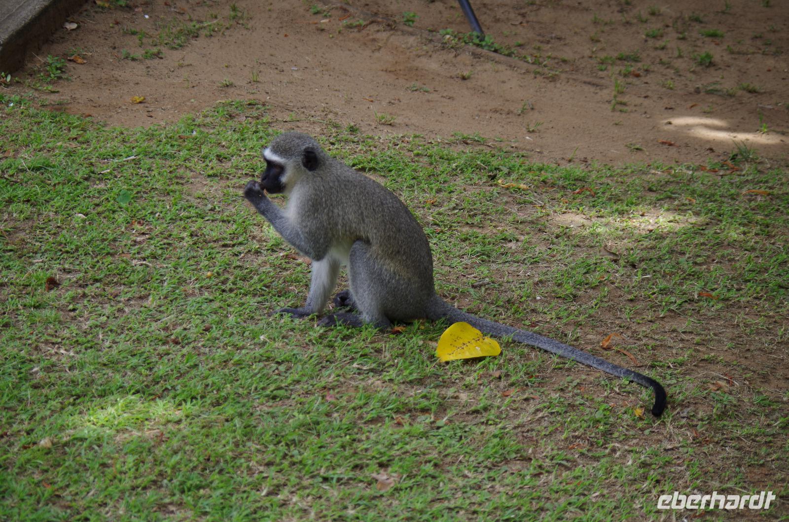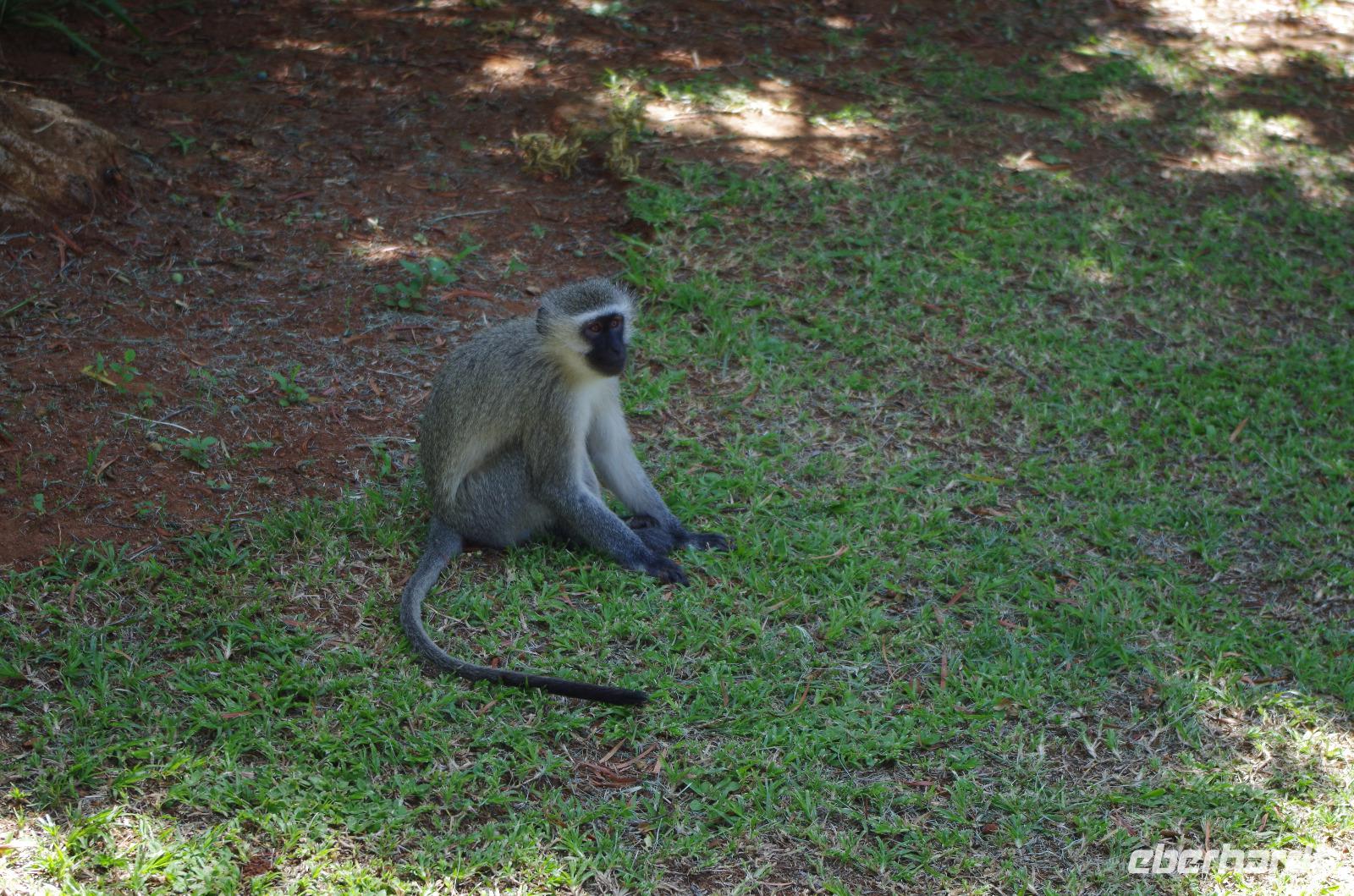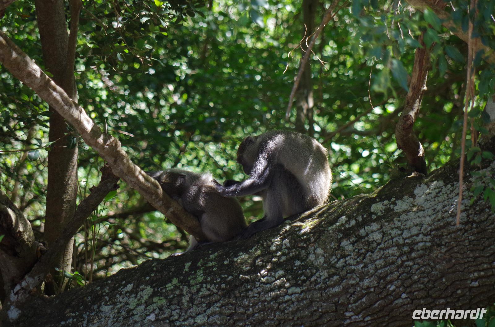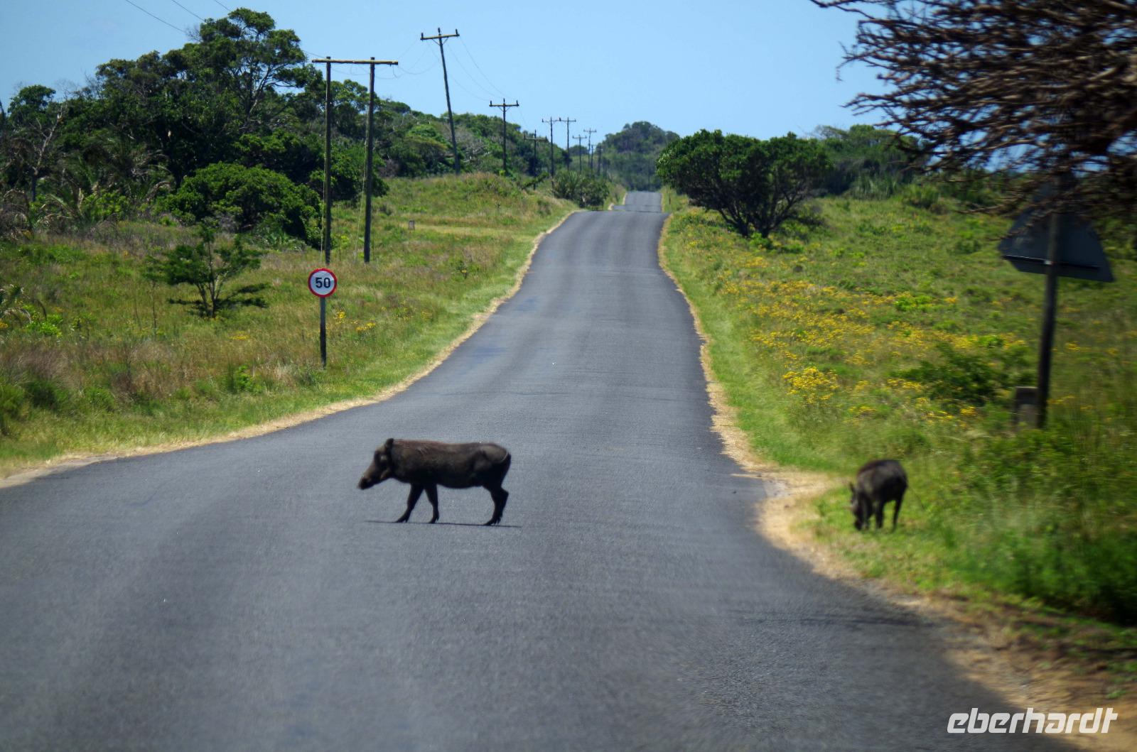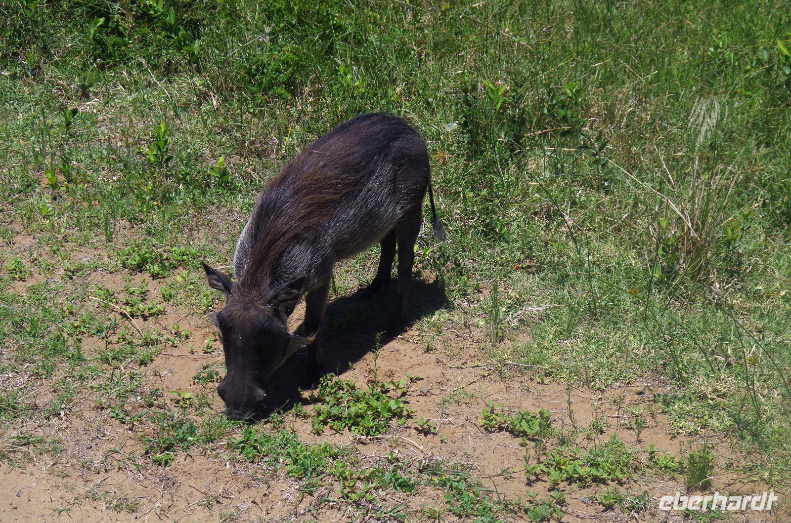 Nach einem leckeren Frühstück verstauen wir unsere Badesachen im Bus und laufen gemeinsam rund zehn bis fünfzehn Gehminuten an die Bootsanlegerstelle. Auf unserem Weg sehen wir die Affen mit Namen Grünmeerkatze "Vervet monkey" sowie Zebramanguste "Banded mongoose". Um 10.00 Uhr soll unsere Fahrt auf dem Lake St. Lucia beginnen. Da wir die einzigen Gäste sind, welche um diese Zeit mit dem Boot "FANNAS" fahren werden, erleben wir sozusagen einen Eberhardt-Exklusiv-Ausflug :-) Die Fahrt dauert rund eineinhalb Stunden und wir sehen ganz viele Nilpferde (Hippopotamus) "Hippos", Krokodile, Blauwangenspint "Blue-cheeked bee-eater", Gelbweber "Yellow weaver" und auch einen Schreiseeadler "African fish-eagle". Gegen 11.30 Uhr sind wir wieder zurück und laufen gemeinsam zum Supermarkt, um uns einen Mittagssnack zu besorgen. Unterwegs probieren Gäste an einem Stand frische "Ananas am Stiel", süß und sehr lecker! Um 12.15 Uhr fahren wir mit dem Bus durch den Nationalpark iSimangaliso Wetland Park zum Naturschutzgebiet Cape Vidal, welches wir rund eineinhalb Stunden später erreichen. Unterwegs sehen wir weitere Tiere wie Warzenschweine, Zebras, Affen oder Knus. Einen Foto-Stopp legen wir am Mfabeni Lookout ein. Sonet berichtet uns, dass der iSimangaliso Wetland Park im nördlichen KwaZulu-Natal liegt und nur über St. Lucia erreichbar ist. Der rund 40 Kilometer lange Lake St Lucia ist umgeben von Gras- und Buschland sowie Mangrovensümpfen. Angekommen am Cape Vidal heißt es auch schon relaxen am Strand oder schwimmen im Meer. Wir gönnen uns ein entspanntes Picknick am Strand, wobei wir von neugierigen Affen beobachtet werden. Ein Äffchen wagt es sogar, aus dem Rucksack eines Reisegasts etwas zu stibitzen, wir können ihn gerade noch davon abhalten! Einige Gäste schwimmen im Meer, was nur im Bereich der roten Fahnen erlaubt ist. Ein Rettungsschwimmerteam für den Notfall ist ebenfalls anwesend. Wir spazieren am Strand entlang, wobei wir unter anderem mit den Füßen und Beinen im Wasser laufen. Der Sand bei Temperaturen über 30 Grad ist doch schon sehr heiß. Am Nachmittag fahren wir wieder zur Lodge zurück. Hier verläuft der restliche Nachmittag ähnlich wie gestern: Wir schwimmen im Hotelpool, relaxen auf dem Balkon oder der Terrasse. Heute haben wir bereits Halbzeit oder auch "Bergfest" unserer wundervollen Traumreise! Bekanntlich vergeht die Zeit danach viel schneller, auch wenn noch so viele atemberaubende Erlebnisse auf uns warten, spannend wird es sicher bleiben! Um 18.45 Uhr treffen wir uns an der Hotelbar. Wir werden an dieser Bar nicht bedient, da dies eine "Bar des Vertrauens" ist. Wir nehmen die Getränke aus dem Kühlschrank - von Softdrinks, Säften, Wein und Bier ist alles vorhanden - und tragen uns mit Name, Zimmernummer und Anzahl in ein Buch auf dem Tresen ein. Die Bezahlung erfolgt erst beim Check-Out. Wirklich ein schönes Konzept, an welches wir uns selbstverständlich ordnungsgemäß halten :-) Wir stoßen gemeinsam auf das Bergfest unserer Reise an. Raten Sie mal, mit was wir anstoßen? Richtig geraten ;o) Der leckere Wildfrucht-Sahne-Likör "Amarula" ist es abermals geworden. Folglich erfüllen auch die aus Deutschland mitgebrachten Plastikbecher abermals ihre Daseins-Mitnahme-Berechtigung *grins* Nun noch ein kleiner Exkurs, mit welchen Likör wir denn überhaupt auf eine traumhafte Zeit in Südafrika anstoßen. Es gibt zwei unterschiedliche "Amarula"-Sorten: "Amarula Cream" seit 1989 und "Amarula Gold" seit 2014. Wir trinken den auf der Frucht des Marulabaums basierenden Sahnelikör "Amarula Cream" mit einem Alkoholgehalt von 17 Prozent."Amarula Gold" besitzt einen Alkoholgehalt von 30 Prozent. Nach dem Amarula-Geschmack gefragt würde die Reisebegleitung wohl mit einem leicht fruchtigen Karamell-Geschmack antworten. Der Name "Amarula" ist zugleich auch eine Spirituosen-Marke in Südafrika. Während wir das leckere Getränk genießen, besprechen wir den morgigen Tagesablauf. Wir werden morgen in Südafrika ausreisen und in Swaziland wieder einreisen. Die Reisepässe packen wir somit ins Handgepäck. Zudem bleiben unsere Koffer über Nacht verschlossen im Bus, so dass wir alle notwendigen Sachen für eine Übernachtung im Handgepäck verstauen. Das Abendessen "a la carte" nehmen wir heute im rund fünf Gehminuten von der Lodge entfernten "Ocean Basket Restaurant " ein. Wir gönnen uns leckeres Sushi, Salat oder Fish & Chips. Zum Tagesabschluss setzen wir uns abermals ans Lagerfeuer in der Lodge und lassen den Abend bei Wein und Softdrinks ausklingen.