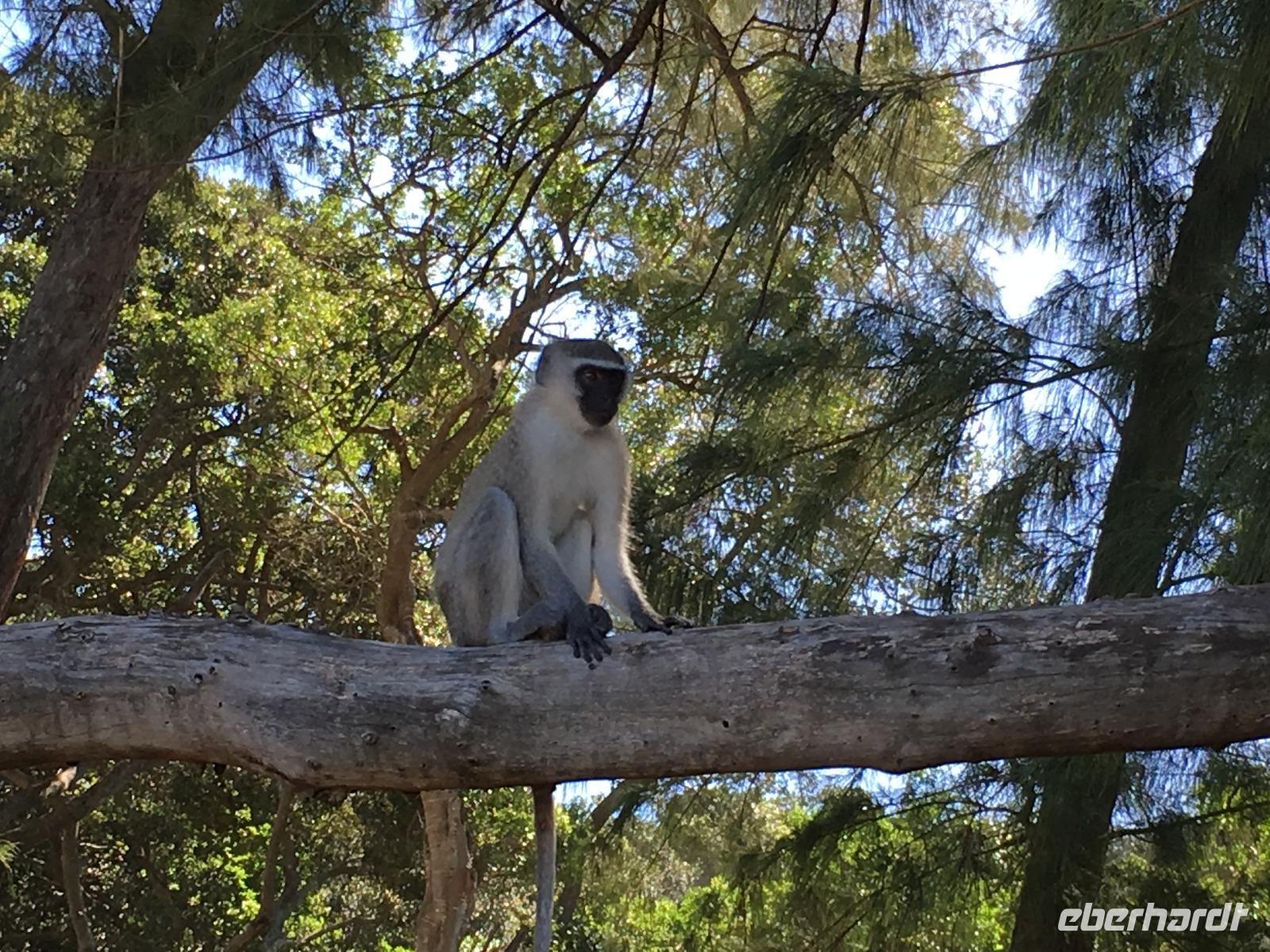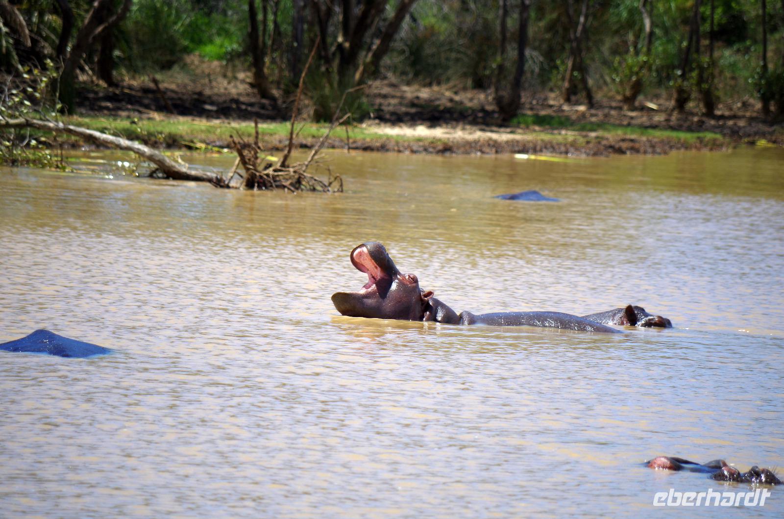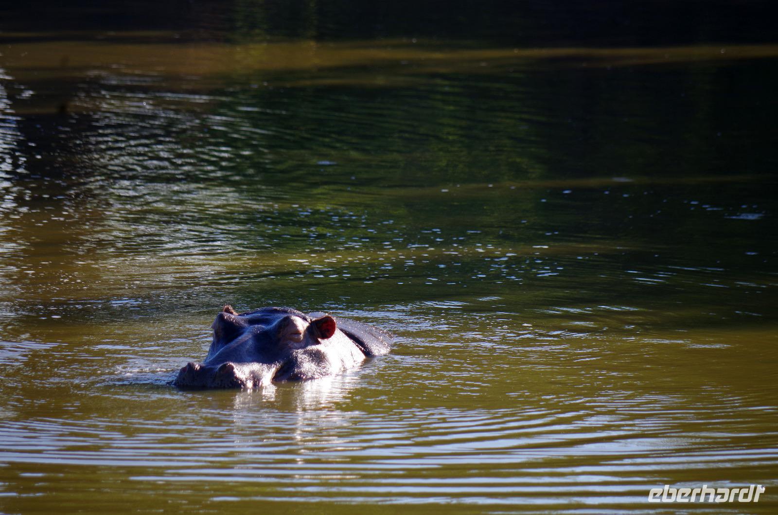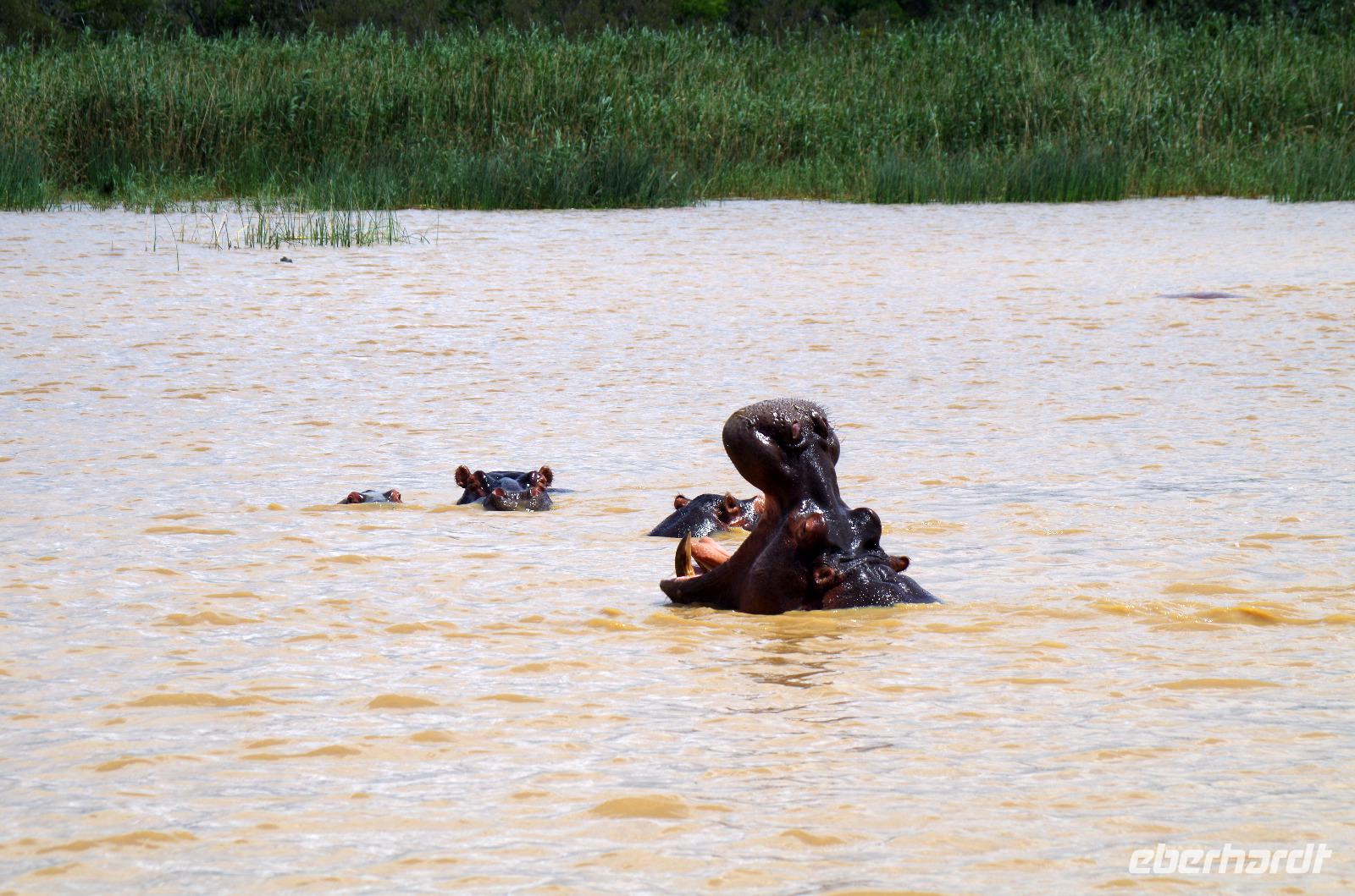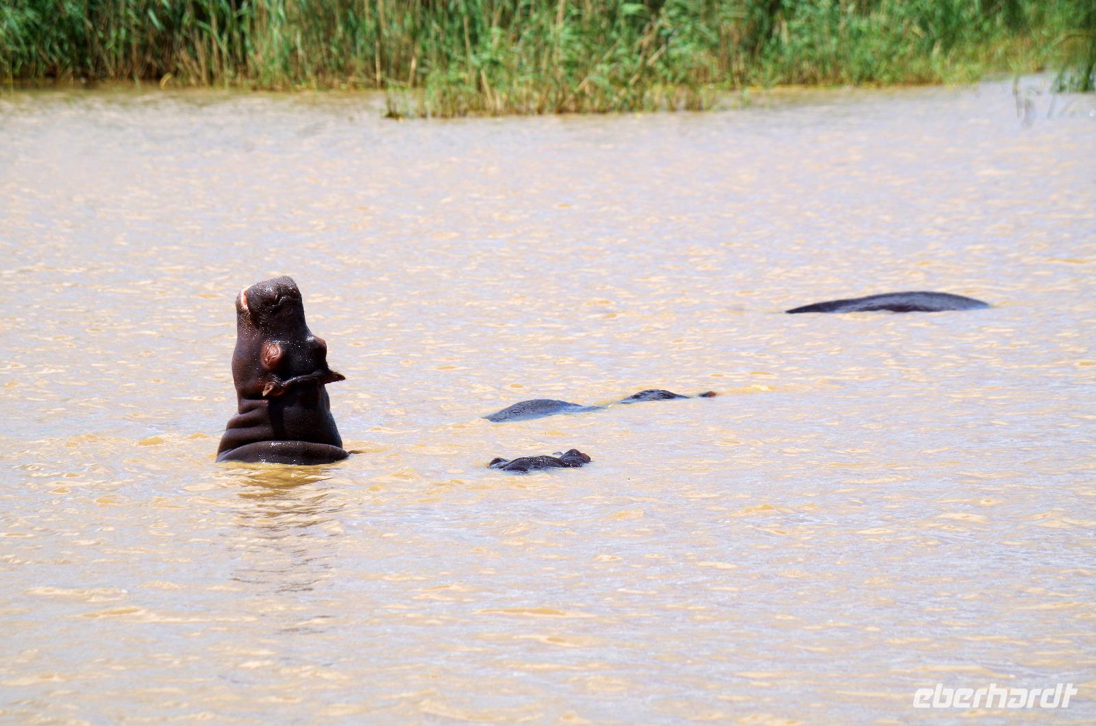 Nach einem leckeren Frühstück verstauen wir unsere Badesachen im Bus und laufen gemeinsam rund zehn bis fünfzehn Gehminuten an die Bootsanlegerstelle. Auf unserem Weg sehen wir die Affen mit Namen Grünmeerkatze "Vervet monkey" sowie Zebramanguste "Banded mongoose". Um 10.00 Uhr soll unsere Fahrt auf dem Lake St. Lucia beginnen. Da wir die einzigen Gäste sind, welche um diese Zeit mit dem Boot "FANNAS" fahren werden, erleben wir sozusagen einen Eberhardt-Exklusiv-Ausflug :-) Die Fahrt dauert rund eineinhalb Stunden und wir sehen ganz viele Nilpferde (Hippopotamus) "Hippos", Krokodile, Blauwangenspint "Blue-cheeked bee-eater", Gelbweber "Yellow weaver" und auch einen Schreiseeadler "African fish-eagle". Gegen 11.30 Uhr sind wir wieder zurück und laufen gemeinsam zum Supermarkt, um uns einen Mittagssnack zu besorgen. Unterwegs probieren Gäste an einem Stand frische "Ananas am Stiel", süß und sehr lecker! Um 12.15 Uhr fahren wir mit dem Bus durch den Nationalpark iSimangaliso Wetland Park zum Naturschutzgebiet Cape Vidal, welches wir rund eineinhalb Stunden später erreichen. Unterwegs sehen wir weitere Tiere wie Warzenschweine, Zebras, Affen oder Knus. Einen Foto-Stopp legen wir am Mfabeni Lookout ein. Sonet berichtet uns, dass der iSimangaliso Wetland Park im nördlichen KwaZulu-Natal liegt und nur über St. Lucia erreichbar ist. Der rund 40 Kilometer lange Lake St Lucia ist umgeben von Gras- und Buschland sowie Mangrovensümpfen. Angekommen am Cape Vidal heißt es auch schon relaxen am Strand oder schwimmen im Meer. Wir gönnen uns ein entspanntes Picknick am Strand, wobei wir von neugierigen Affen beobachtet werden. Ein Äffchen wagt es sogar, aus dem Rucksack eines Reisegasts etwas zu stibitzen, wir können ihn gerade noch davon abhalten! Einige Gäste schwimmen im Meer, was nur im Bereich der roten Fahnen erlaubt ist. Ein Rettungsschwimmerteam für den Notfall ist ebenfalls anwesend. Wir spazieren am Strand entlang, wobei wir unter anderem mit den Füßen und Beinen im Wasser laufen. Der Sand bei Temperaturen über 30 Grad ist doch schon sehr heiß. Am Nachmittag fahren wir wieder zur Lodge zurück. Hier verläuft der restliche Nachmittag ähnlich wie gestern: Wir schwimmen im Hotelpool, relaxen auf dem Balkon oder der Terrasse. Heute haben wir bereits Halbzeit oder auch "Bergfest" unserer wundervollen Traumreise! Bekanntlich vergeht die Zeit danach viel schneller, auch wenn noch so viele atemberaubende Erlebnisse auf uns warten, spannend wird es sicher bleiben! Um 18.45 Uhr treffen wir uns an der Hotelbar. Wir werden an dieser Bar nicht bedient, da dies eine "Bar des Vertrauens" ist. Wir nehmen die Getränke aus dem Kühlschrank - von Softdrinks, Säften, Wein und Bier ist alles vorhanden - und tragen uns mit Name, Zimmernummer und Anzahl in ein Buch auf dem Tresen ein. Die Bezahlung erfolgt erst beim Check-Out. Wirklich ein schönes Konzept, an welches wir uns selbstverständlich ordnungsgemäß halten :-) Wir stoßen gemeinsam auf das Bergfest unserer Reise an. Raten Sie mal, mit was wir anstoßen? Richtig geraten ;o) Der leckere Wildfrucht-Sahne-Likör "Amarula" ist es abermals geworden. Folglich erfüllen auch die aus Deutschland mitgebrachten Plastikbecher abermals ihre Daseins-Mitnahme-Berechtigung *grins* Nun noch ein kleiner Exkurs, mit welchen Likör wir denn überhaupt auf eine traumhafte Zeit in Südafrika anstoßen. Es gibt zwei unterschiedliche "Amarula"-Sorten: "Amarula Cream" seit 1989 und "Amarula Gold" seit 2014. Wir trinken den auf der Frucht des Marulabaums basierenden Sahnelikör "Amarula Cream" mit einem Alkoholgehalt von 17 Prozent."Amarula Gold" besitzt einen Alkoholgehalt von 30 Prozent. Nach dem Amarula-Geschmack gefragt würde die Reisebegleitung wohl mit einem leicht fruchtigen Karamell-Geschmack antworten. Der Name "Amarula" ist zugleich auch eine Spirituosen-Marke in Südafrika. Während wir das leckere Getränk genießen, besprechen wir den morgigen Tagesablauf. Wir werden morgen in Südafrika ausreisen und in Swaziland wieder einreisen. Die Reisepässe packen wir somit ins Handgepäck. Zudem bleiben unsere Koffer über Nacht verschlossen im Bus, so dass wir alle notwendigen Sachen für eine Übernachtung im Handgepäck verstauen. Das Abendessen "a la carte" nehmen wir heute im rund fünf Gehminuten von der Lodge entfernten "Ocean Basket Restaurant " ein. Wir gönnen uns leckeres Sushi, Salat oder Fish & Chips. Zum Tagesabschluss setzen wir uns abermals ans Lagerfeuer in der Lodge und lassen den Abend bei Wein und Softdrinks ausklingen.