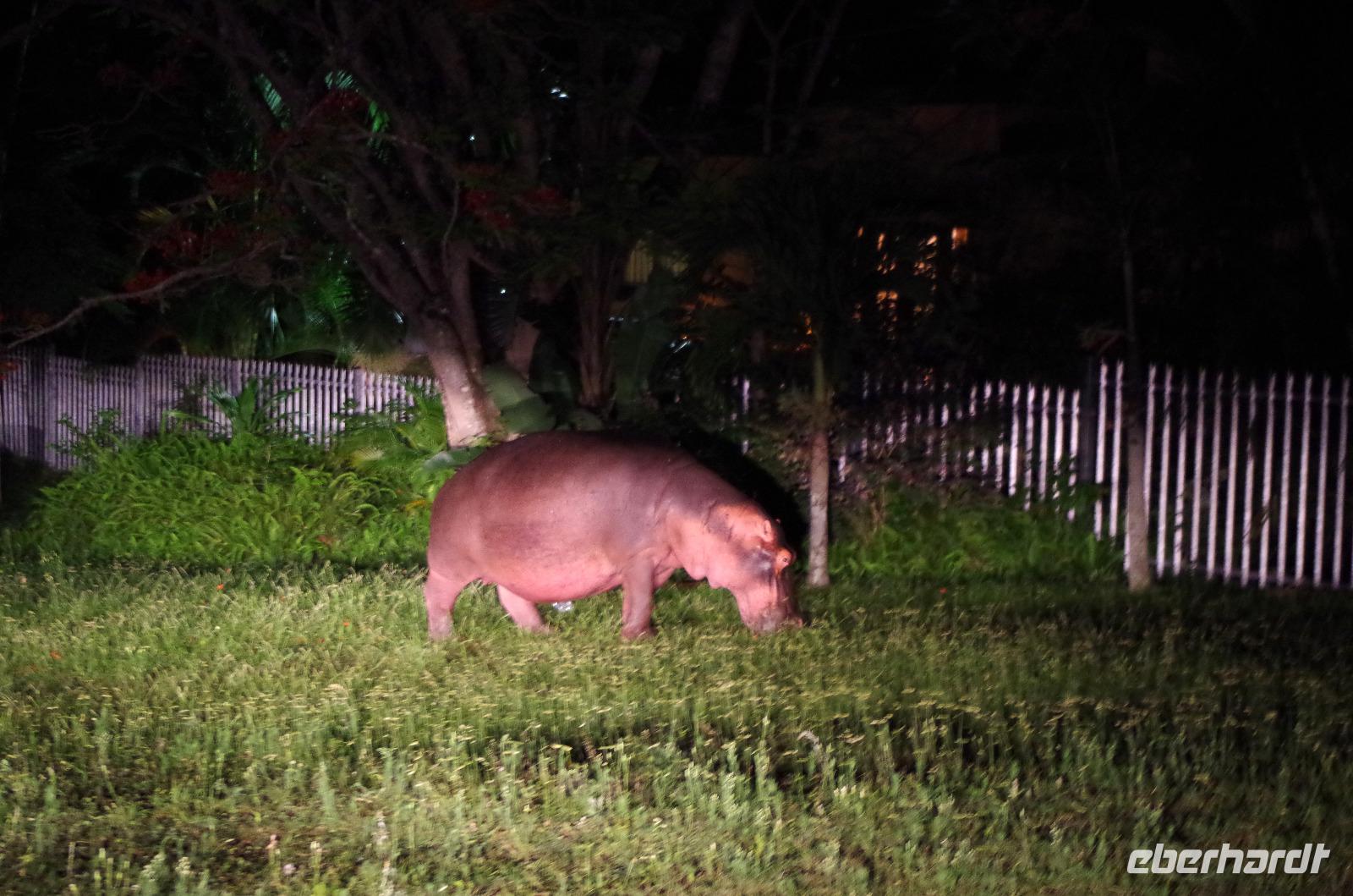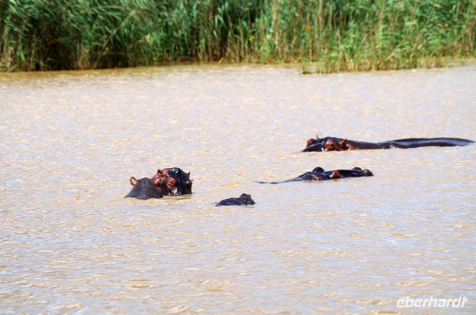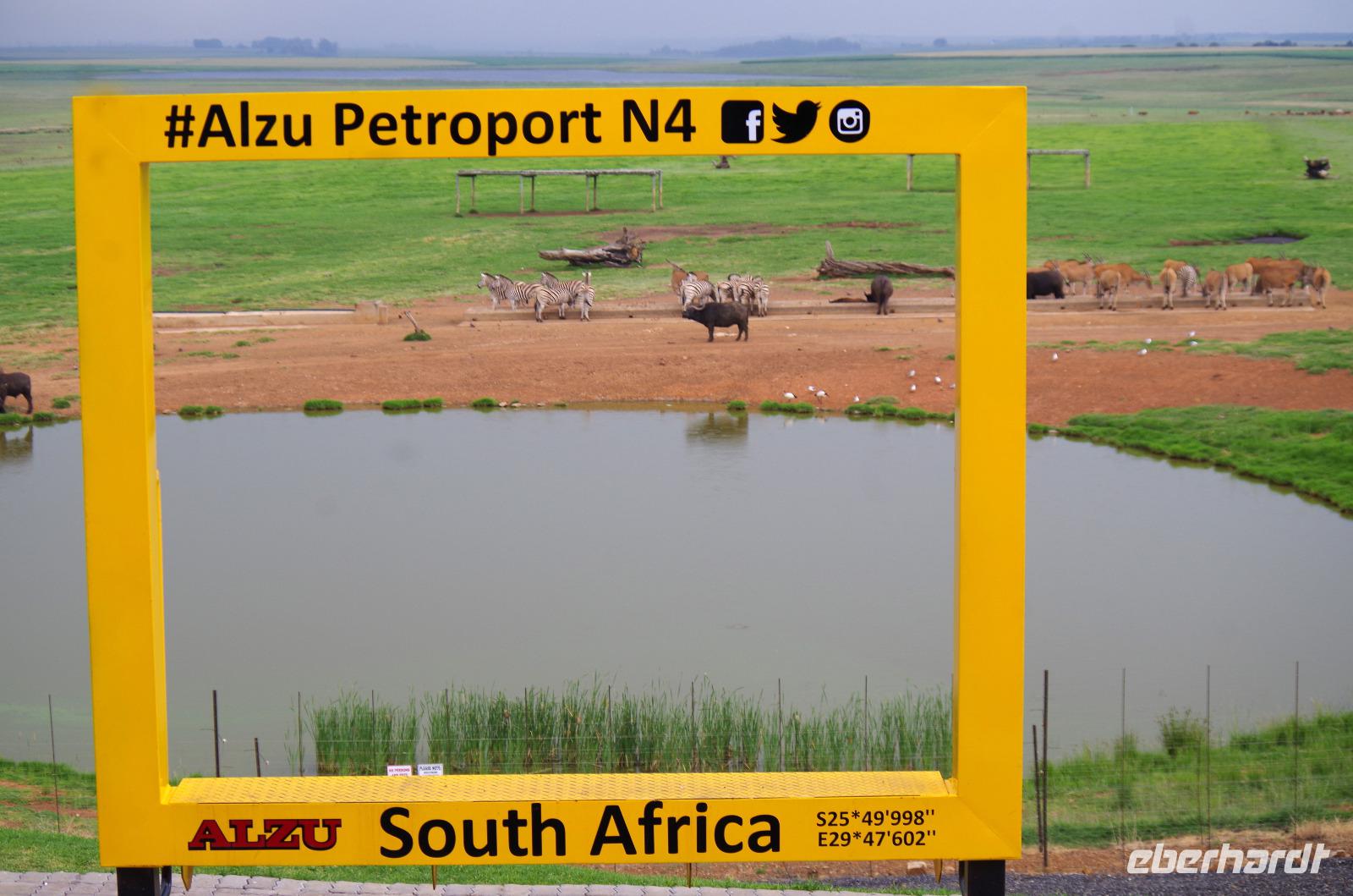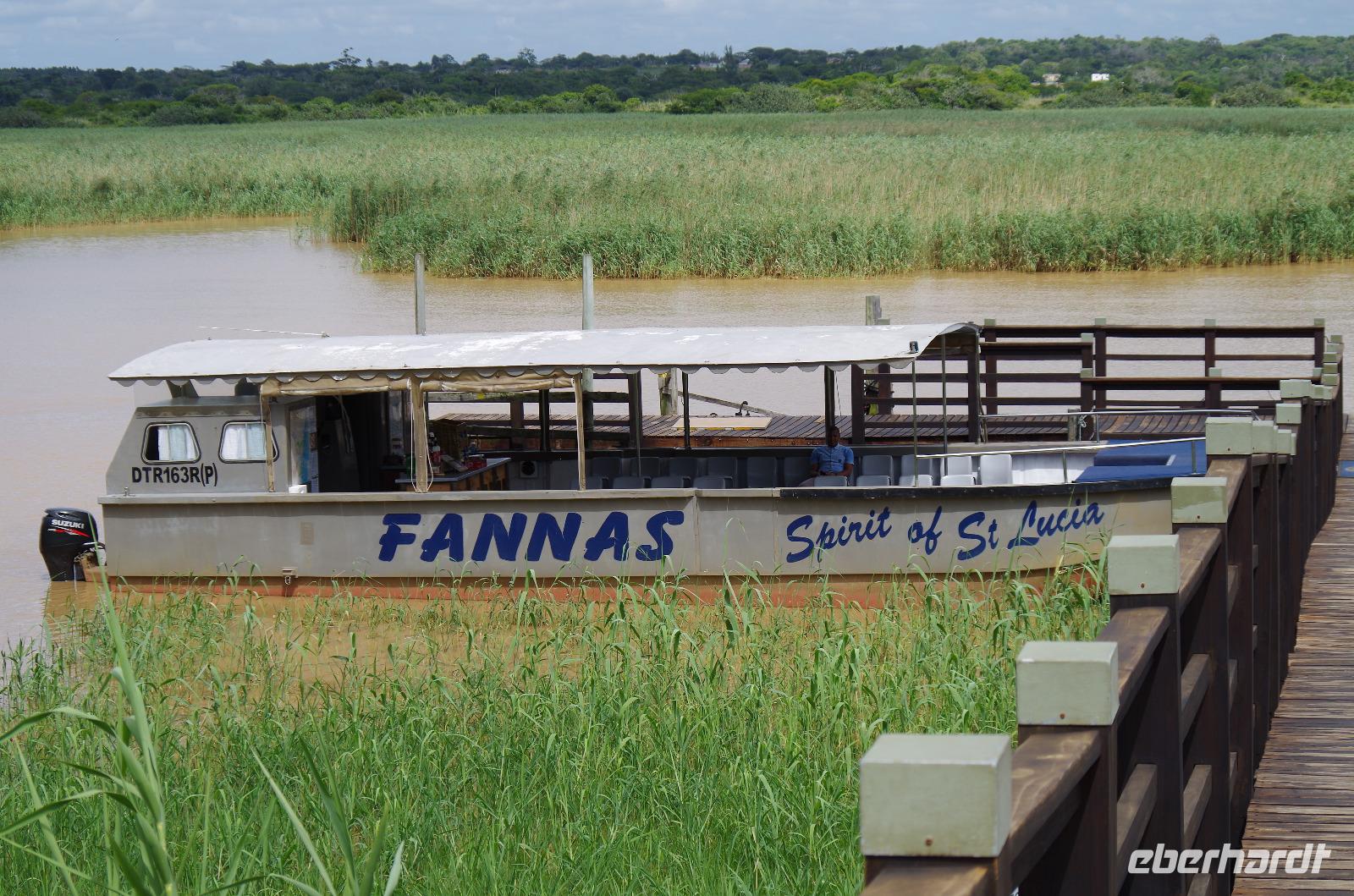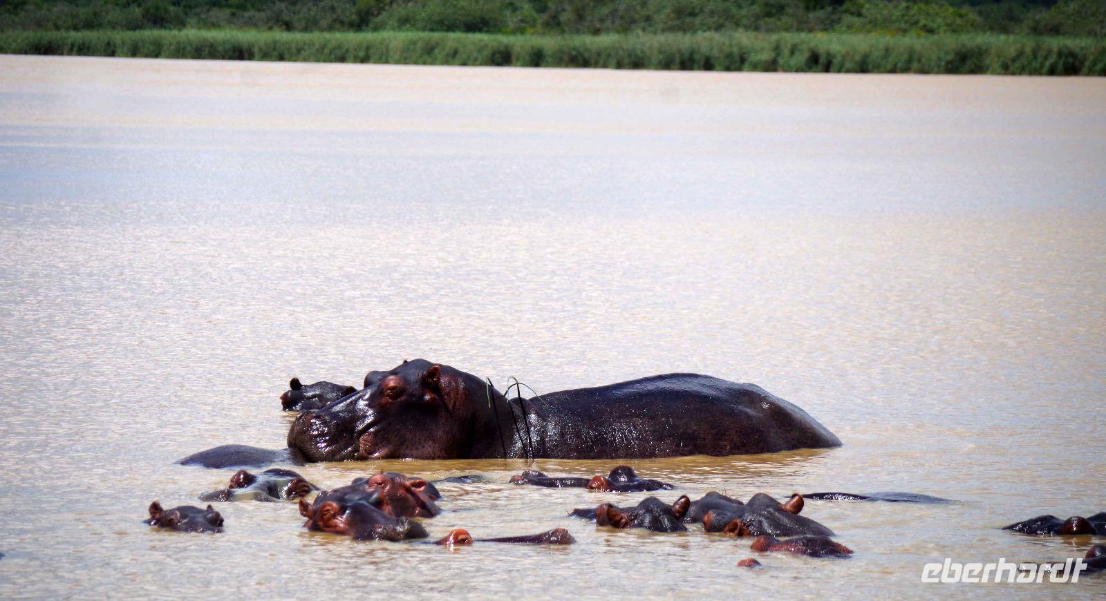 Nach einem leckeren Frühstück verstauen wir unsere Badesachen im Bus und laufen gemeinsam rund zehn bis fünfzehn Gehminuten an die Bootsanlegerstelle. Auf unserem Weg sehen wir die Affen mit Namen Grünmeerkatze "Vervet monkey" sowie Zebramanguste "Banded mongoose". Um 10.00 Uhr soll unsere Fahrt auf dem Lake St. Lucia beginnen. Da wir die einzigen Gäste sind, welche um diese Zeit mit dem Boot "FANNAS" fahren werden, erleben wir sozusagen einen Eberhardt-Exklusiv-Ausflug :-) Die Fahrt dauert rund eineinhalb Stunden und wir sehen ganz viele Nilpferde (Hippopotamus) "Hippos", Krokodile, Blauwangenspint "Blue-cheeked bee-eater", Gelbweber "Yellow weaver" und auch einen Schreiseeadler "African fish-eagle". Gegen 11.30 Uhr sind wir wieder zurück und laufen gemeinsam zum Supermarkt, um uns einen Mittagssnack zu besorgen. Unterwegs probieren Gäste an einem Stand frische "Ananas am Stiel", süß und sehr lecker! Um 12.15 Uhr fahren wir mit dem Bus durch den Nationalpark iSimangaliso Wetland Park zum Naturschutzgebiet Cape Vidal, welches wir rund eineinhalb Stunden später erreichen. Unterwegs sehen wir weitere Tiere wie Warzenschweine, Zebras, Affen oder Knus. Einen Foto-Stopp legen wir am Mfabeni Lookout ein. Sonet berichtet uns, dass der iSimangaliso Wetland Park im nördlichen KwaZulu-Natal liegt und nur über St. Lucia erreichbar ist. Der rund 40 Kilometer lange Lake St Lucia ist umgeben von Gras- und Buschland sowie Mangrovensümpfen. Angekommen am Cape Vidal heißt es auch schon relaxen am Strand oder schwimmen im Meer. Wir gönnen uns ein entspanntes Picknick am Strand, wobei wir von neugierigen Affen beobachtet werden. Ein Äffchen wagt es sogar, aus dem Rucksack eines Reisegasts etwas zu stibitzen, wir können ihn gerade noch davon abhalten! Einige Gäste schwimmen im Meer, was nur im Bereich der roten Fahnen erlaubt ist. Ein Rettungsschwimmerteam für den Notfall ist ebenfalls anwesend. Wir spazieren am Strand entlang, wobei wir unter anderem mit den Füßen und Beinen im Wasser laufen. Der Sand bei Temperaturen über 30 Grad ist doch schon sehr heiß. Am Nachmittag fahren wir wieder zur Lodge zurück. Hier verläuft der restliche Nachmittag ähnlich wie gestern: Wir schwimmen im Hotelpool, relaxen auf dem Balkon oder der Terrasse. Heute haben wir bereits Halbzeit oder auch "Bergfest" unserer wundervollen Traumreise! Bekanntlich vergeht die Zeit danach viel schneller, auch wenn noch so viele atemberaubende Erlebnisse auf uns warten, spannend wird es sicher bleiben! Um 18.45 Uhr treffen wir uns an der Hotelbar. Wir werden an dieser Bar nicht bedient, da dies eine "Bar des Vertrauens" ist. Wir nehmen die Getränke aus dem Kühlschrank - von Softdrinks, Säften, Wein und Bier ist alles vorhanden - und tragen uns mit Name, Zimmernummer und Anzahl in ein Buch auf dem Tresen ein. Die Bezahlung erfolgt erst beim Check-Out. Wirklich ein schönes Konzept, an welches wir uns selbstverständlich ordnungsgemäß halten :-) Wir stoßen gemeinsam auf das Bergfest unserer Reise an. Raten Sie mal, mit was wir anstoßen? Richtig geraten ;o) Der leckere Wildfrucht-Sahne-Likör "Amarula" ist es abermals geworden. Folglich erfüllen auch die aus Deutschland mitgebrachten Plastikbecher abermals ihre Daseins-Mitnahme-Berechtigung *grins* Nun noch ein kleiner Exkurs, mit welchen Likör wir denn überhaupt auf eine traumhafte Zeit in Südafrika anstoßen. Es gibt zwei unterschiedliche "Amarula"-Sorten: "Amarula Cream" seit 1989 und "Amarula Gold" seit 2014. Wir trinken den auf der Frucht des Marulabaums basierenden Sahnelikör "Amarula Cream" mit einem Alkoholgehalt von 17 Prozent."Amarula Gold" besitzt einen Alkoholgehalt von 30 Prozent. Nach dem Amarula-Geschmack gefragt würde die Reisebegleitung wohl mit einem leicht fruchtigen Karamell-Geschmack antworten. Der Name "Amarula" ist zugleich auch eine Spirituosen-Marke in Südafrika. Während wir das leckere Getränk genießen, besprechen wir den morgigen Tagesablauf. Wir werden morgen in Südafrika ausreisen und in Swaziland wieder einreisen. Die Reisepässe packen wir somit ins Handgepäck. Zudem bleiben unsere Koffer über Nacht verschlossen im Bus, so dass wir alle notwendigen Sachen für eine Übernachtung im Handgepäck verstauen. Das Abendessen "a la carte" nehmen wir heute im rund fünf Gehminuten von der Lodge entfernten "Ocean Basket Restaurant " ein. Wir gönnen uns leckeres Sushi, Salat oder Fish & Chips. Zum Tagesabschluss setzen wir uns abermals ans Lagerfeuer in der Lodge und lassen den Abend bei Wein und Softdrinks ausklingen.