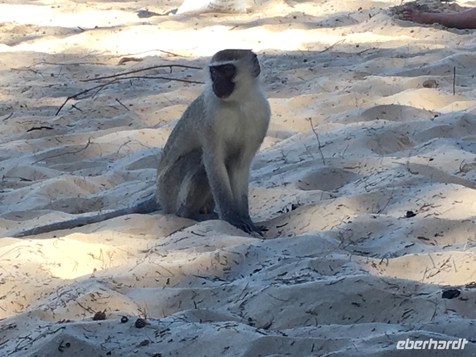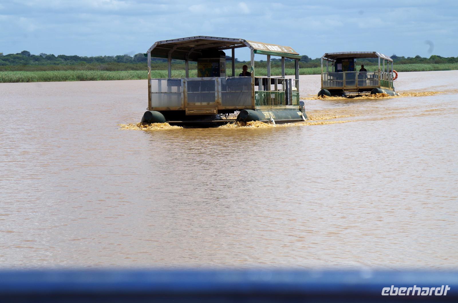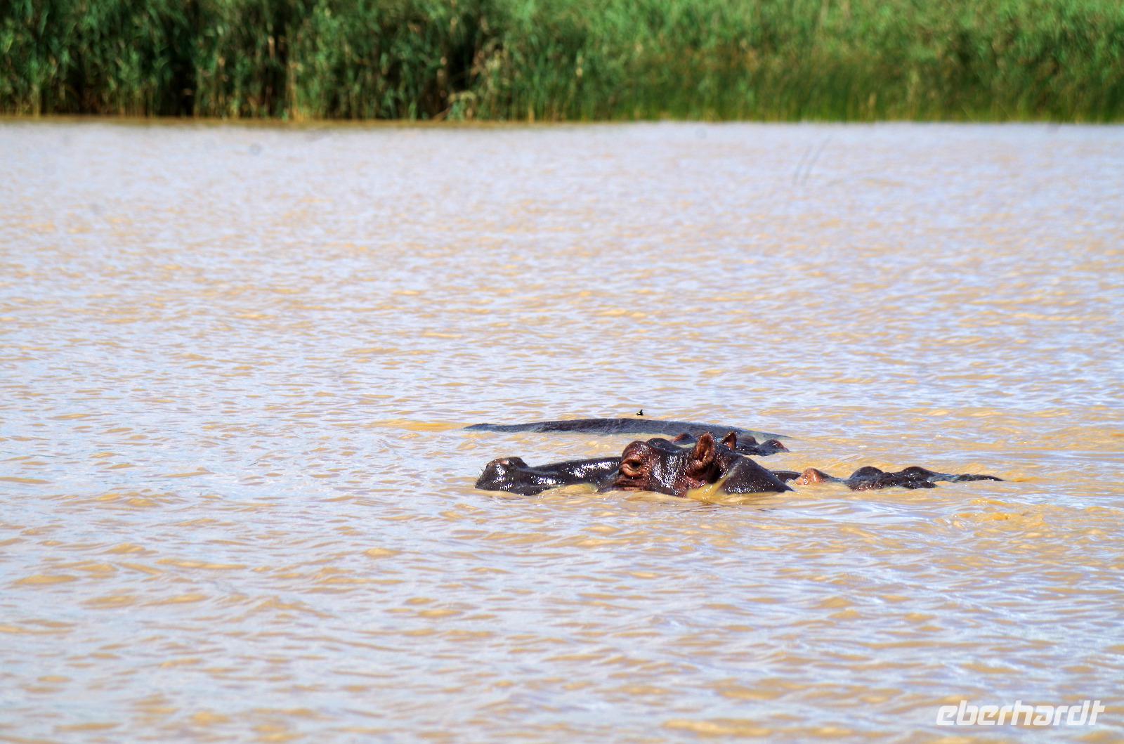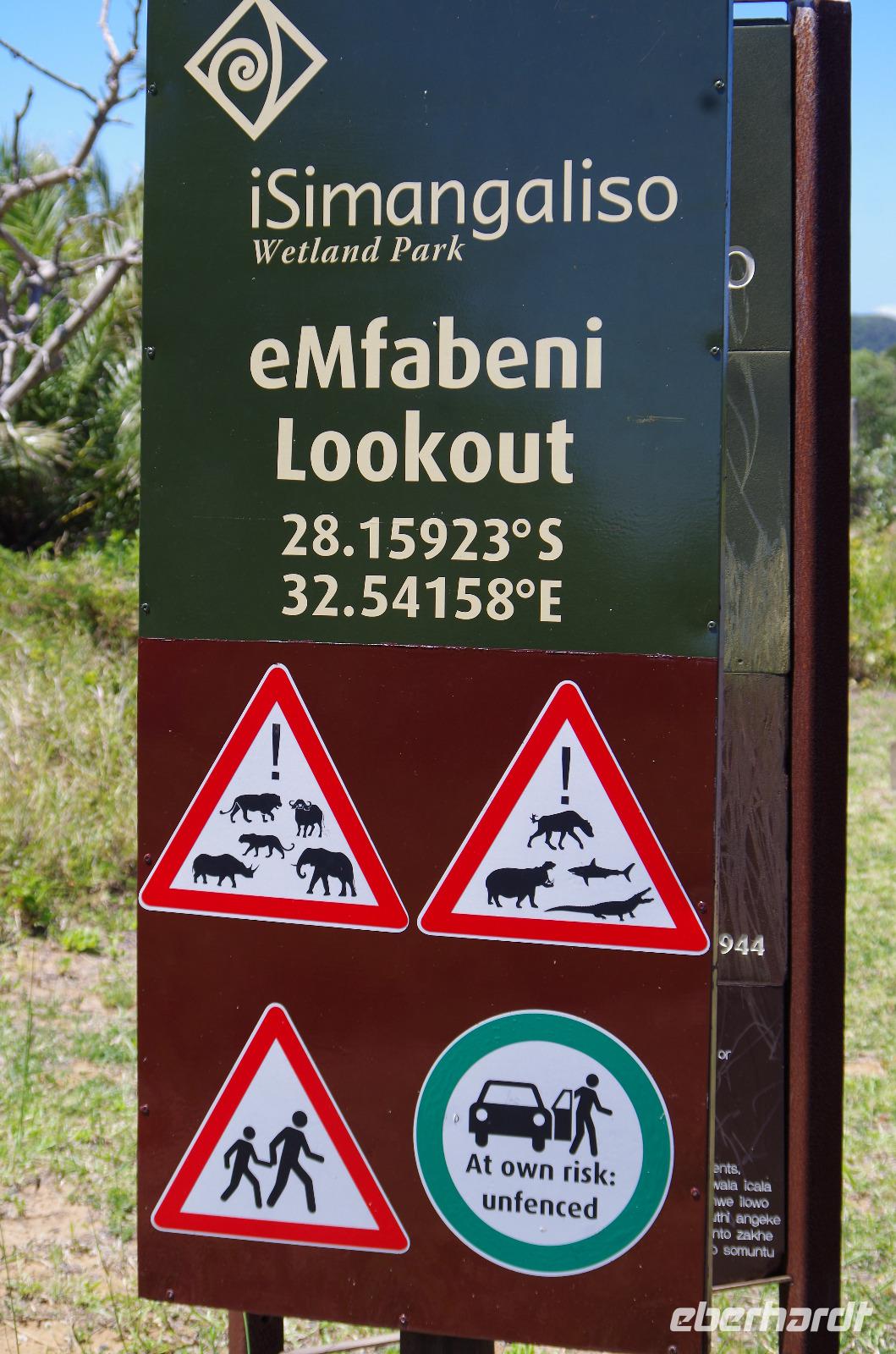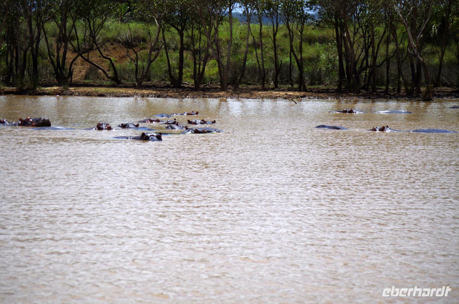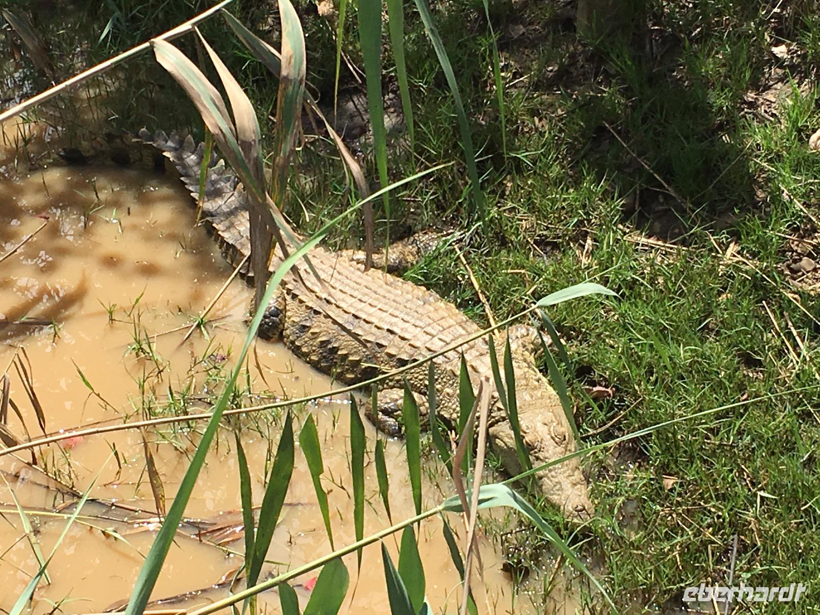 Nach einem leckeren Frühstück verstauen wir unsere Badesachen im Bus und laufen gemeinsam rund zehn bis fünfzehn Gehminuten an die Bootsanlegerstelle. Auf unserem Weg sehen wir die Affen mit Namen Grünmeerkatze "Vervet monkey" sowie Zebramanguste "Banded mongoose". Um 10.00 Uhr soll unsere Fahrt auf dem Lake St. Lucia beginnen. Da wir die einzigen Gäste sind, welche um diese Zeit mit dem Boot "FANNAS" fahren werden, erleben wir sozusagen einen Eberhardt-Exklusiv-Ausflug :-) Die Fahrt dauert rund eineinhalb Stunden und wir sehen ganz viele Nilpferde (Hippopotamus) "Hippos", Krokodile, Blauwangenspint "Blue-cheeked bee-eater", Gelbweber "Yellow weaver" und auch einen Schreiseeadler "African fish-eagle". Gegen 11.30 Uhr sind wir wieder zurück und laufen gemeinsam zum Supermarkt, um uns einen Mittagssnack zu besorgen. Unterwegs probieren Gäste an einem Stand frische "Ananas am Stiel", süß und sehr lecker! Um 12.15 Uhr fahren wir mit dem Bus durch den Nationalpark iSimangaliso Wetland Park zum Naturschutzgebiet Cape Vidal, welches wir rund eineinhalb Stunden später erreichen. Unterwegs sehen wir weitere Tiere wie Warzenschweine, Zebras, Affen oder Knus. Einen Foto-Stopp legen wir am Mfabeni Lookout ein. Sonet berichtet uns, dass der iSimangaliso Wetland Park im nördlichen KwaZulu-Natal liegt und nur über St. Lucia erreichbar ist. Der rund 40 Kilometer lange Lake St Lucia ist umgeben von Gras- und Buschland sowie Mangrovensümpfen. Angekommen am Cape Vidal heißt es auch schon relaxen am Strand oder schwimmen im Meer. Wir gönnen uns ein entspanntes Picknick am Strand, wobei wir von neugierigen Affen beobachtet werden. Ein Äffchen wagt es sogar, aus dem Rucksack eines Reisegasts etwas zu stibitzen, wir können ihn gerade noch davon abhalten! Einige Gäste schwimmen im Meer, was nur im Bereich der roten Fahnen erlaubt ist. Ein Rettungsschwimmerteam für den Notfall ist ebenfalls anwesend. Wir spazieren am Strand entlang, wobei wir unter anderem mit den Füßen und Beinen im Wasser laufen. Der Sand bei Temperaturen über 30 Grad ist doch schon sehr heiß. Am Nachmittag fahren wir wieder zur Lodge zurück. Hier verläuft der restliche Nachmittag ähnlich wie gestern: Wir schwimmen im Hotelpool, relaxen auf dem Balkon oder der Terrasse. Heute haben wir bereits Halbzeit oder auch "Bergfest" unserer wundervollen Traumreise! Bekanntlich vergeht die Zeit danach viel schneller, auch wenn noch so viele atemberaubende Erlebnisse auf uns warten, spannend wird es sicher bleiben! Um 18.45 Uhr treffen wir uns an der Hotelbar. Wir werden an dieser Bar nicht bedient, da dies eine "Bar des Vertrauens" ist. Wir nehmen die Getränke aus dem Kühlschrank - von Softdrinks, Säften, Wein und Bier ist alles vorhanden - und tragen uns mit Name, Zimmernummer und Anzahl in ein Buch auf dem Tresen ein. Die Bezahlung erfolgt erst beim Check-Out. Wirklich ein schönes Konzept, an welches wir uns selbstverständlich ordnungsgemäß halten :-) Wir stoßen gemeinsam auf das Bergfest unserer Reise an. Raten Sie mal, mit was wir anstoßen? Richtig geraten ;o) Der leckere Wildfrucht-Sahne-Likör "Amarula" ist es abermals geworden. Folglich erfüllen auch die aus Deutschland mitgebrachten Plastikbecher abermals ihre Daseins-Mitnahme-Berechtigung *grins* Nun noch ein kleiner Exkurs, mit welchen Likör wir denn überhaupt auf eine traumhafte Zeit in Südafrika anstoßen. Es gibt zwei unterschiedliche "Amarula"-Sorten: "Amarula Cream" seit 1989 und "Amarula Gold" seit 2014. Wir trinken den auf der Frucht des Marulabaums basierenden Sahnelikör "Amarula Cream" mit einem Alkoholgehalt von 17 Prozent."Amarula Gold" besitzt einen Alkoholgehalt von 30 Prozent. Nach dem Amarula-Geschmack gefragt würde die Reisebegleitung wohl mit einem leicht fruchtigen Karamell-Geschmack antworten. Der Name "Amarula" ist zugleich auch eine Spirituosen-Marke in Südafrika. Während wir das leckere Getränk genießen, besprechen wir den morgigen Tagesablauf. Wir werden morgen in Südafrika ausreisen und in Swaziland wieder einreisen. Die Reisepässe packen wir somit ins Handgepäck. Zudem bleiben unsere Koffer über Nacht verschlossen im Bus, so dass wir alle notwendigen Sachen für eine Übernachtung im Handgepäck verstauen. Das Abendessen "a la carte" nehmen wir heute im rund fünf Gehminuten von der Lodge entfernten "Ocean Basket Restaurant " ein. Wir gönnen uns leckeres Sushi, Salat oder Fish & Chips. Zum Tagesabschluss setzen wir uns abermals ans Lagerfeuer in der Lodge und lassen den Abend bei Wein und Softdrinks ausklingen.