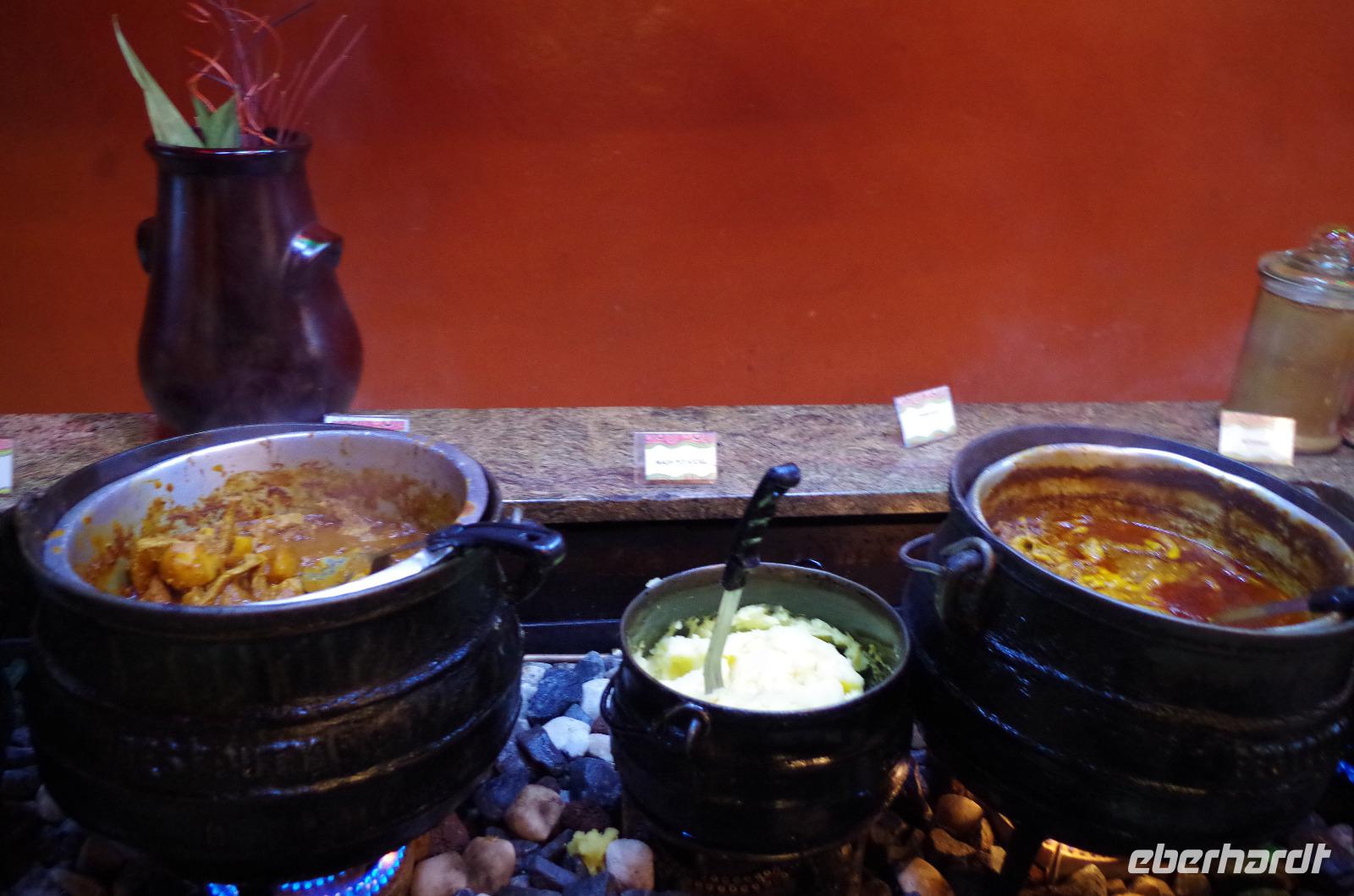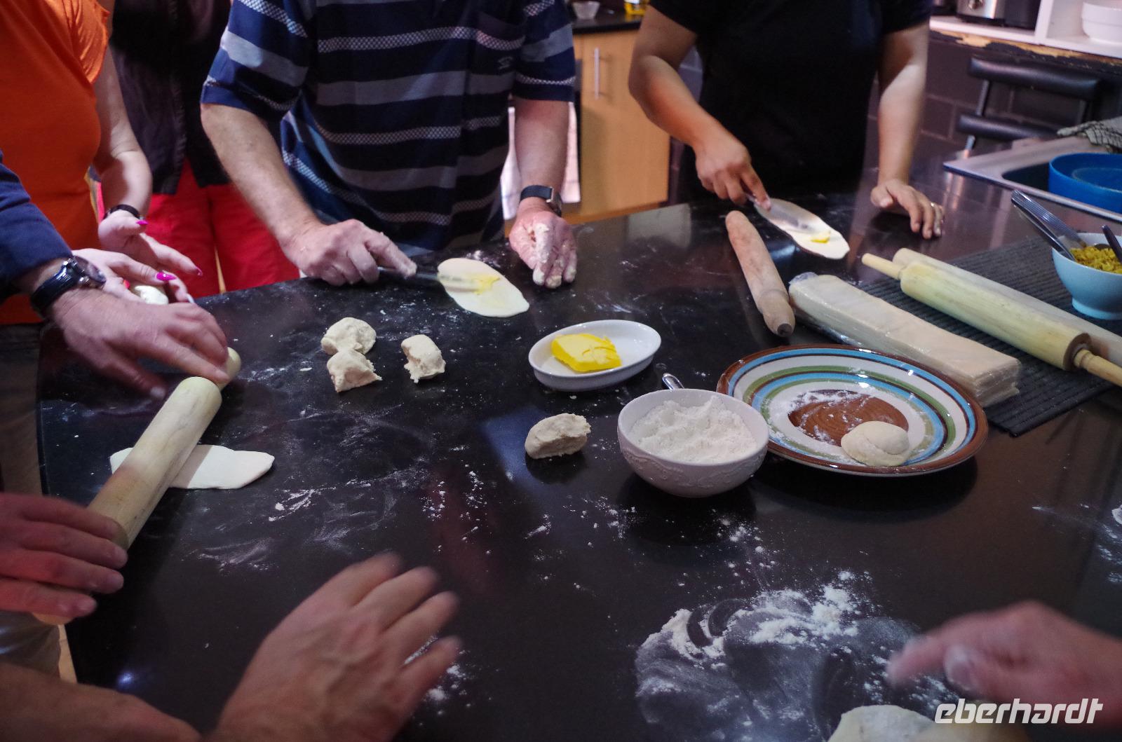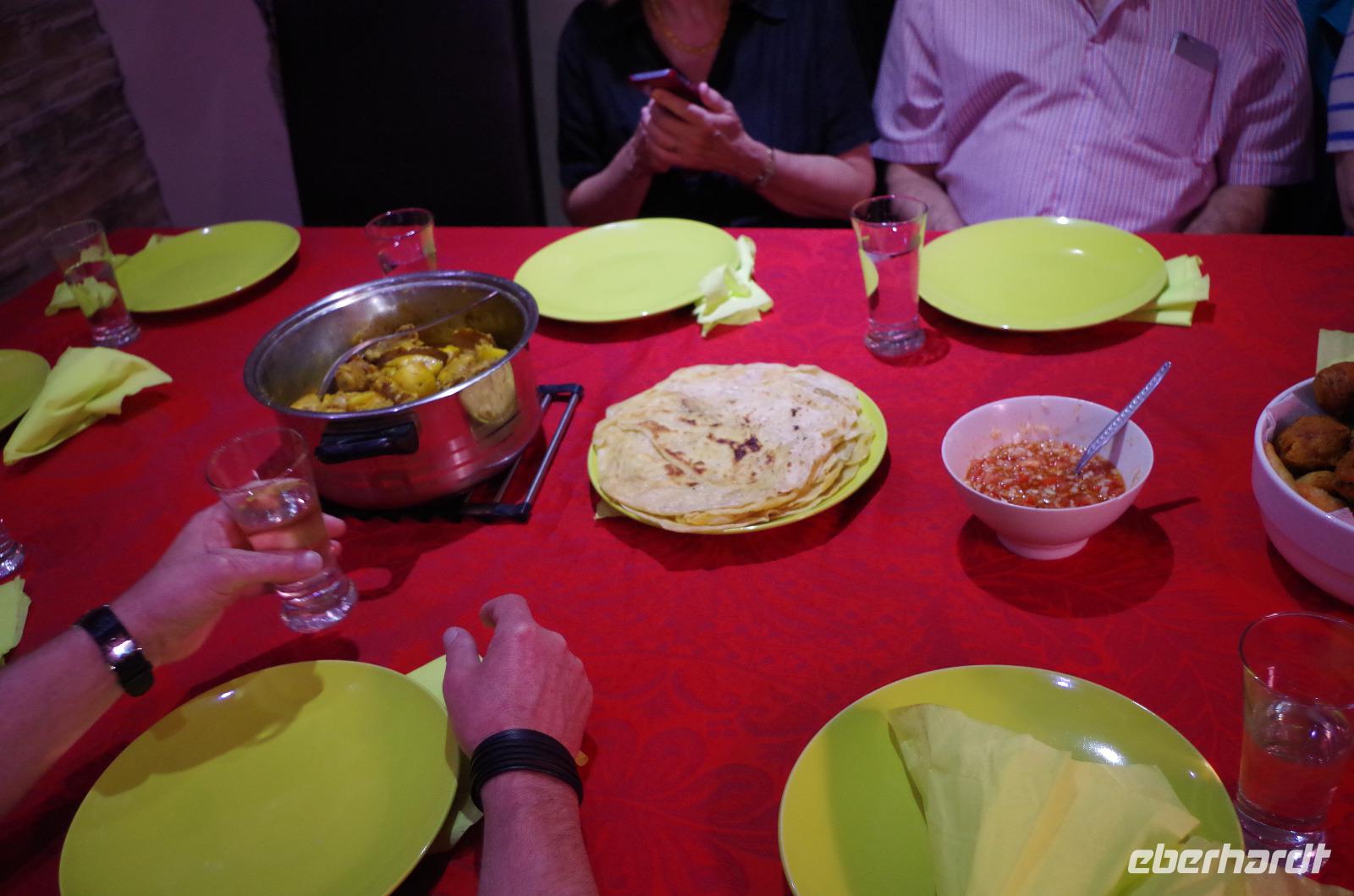 Unser heutiger Tag beginnt wieder mit strahlendem Sonnenschein. Das Frühstück gestaltet jeder individuell. Der Vormittag steht den Gästen zur freien Verfügung. Zu empfehlen sind der Besuch der großen Shopping Mall, des tollen Aquariums oder des neuen Art-Museums mit seinen ehemaligen Speicher und Silos an der "V & A Waterfront". Die Gäste können heute aber auch an einer fakultativ angebotenen Cape Cuisine Tour und an einer Sunset Cruise teilnehmen. Alle zehn Gäste, welche die Cape Cuisine Tour bei Eberhardt gebucht haben, treffen sich um 13.00 Uhr mit der Reisebegleitung in der Hotellobby. Dann fahren wir mit dem Taxi ins nicht weit entfernte und uns bereits bekannte Bo Kaap Viertel zu Gamidah. Aufgrund des heute stattfindenden Neujahrsfestes rund ums Bo Kaap Viertel sind einige Straße gesperrt, so dass uns die Taxifahrer so nah wie möglich an das Viertel heranfahren. Dann laufen wir rund zehn Gehminuten zum Haus von Gamidah in der Wale Street in Cape Town Bo Kaap. Um 13.45 Uhr beginnt unser Cape Malay Kochkurs und ein einmaliger Einblick in die afrikanische Küche. Zunächst bereiten wir gemeinsam folgende Gericht zu: Roti, traditionelles Curry, Samosa, Chili Bites und Sambal. Roti ist ein afrikanischer Teigfladen, welcher aus Mehl, Margarine, Salz und Öl besteht und warm serviert wird. Das Fladenbrot wird in kleine Teile auseinander gebrochen. Statt Gabel und Messer zu benutzen, werden die kleinen Stücke des Roti zum Aufnehmen von Fleisch und Sauce verwendet. Samosa sind gefüllte Teigtaschen bestehend aus Wasser, Salz, Butter und Mehl. Sie werden unter anderem wie Hackfleisch, Curry oder Käse gefüllt. Gamidah zeigt uns, wie wir die Samosa zu Dreiecken zusammenlegen. Anschließend erfolgt das Frittieren in siedendem Fett, so dass sie auch von außen knusprig braun werden. Aber wer jetzt denkt, nur die Frauen kochen heute, der irrt sich ;-) Die Männer unterstützen ihre Frauen tatkräftig und versuchen sich selbst im Zubereiten und Kochen der Speisen. Es ist wirklich ein schönes unterhaltsames gemeinsames Zubereiten, Kochen und natürlich auch Verzerren der Speisen! Sambal stammt aus Indonesien und ist eine dickflüssige Würzsauce mit Chili. Nicht nur das gemeinsame Kochen, auch das Verzerren der gekochten Speisen erfreut uns. Na dann, guten Appetit wünschen wir! Nach dem Essen zeigt uns Gamidah im gegenüberliegenden Laden die Gewürze, welche wir beim Kochen verwendet habe. Dazu zählen das Mehl "Chaan/Chickenpea Flour", Kurkuma "Turmeric", Chili Pulver "Mild Chili Powder", Kreuzkümmel "Cumin/Jeera", Koriander "Koljana/Coriander" und Fenchel "Fennel". Dann verabschieden wir uns freundlich von Gamidah und bedanken uns für den tollen Kochkurs. Wir laufen gemeinsam bei gefühlten 30 Grad zum Hotel zurück. Die Laufstrecke beträgt rund fünfzehn bis zwanzig Minuten. Zum Abend treffen sich alle Gäste um 18.30 Uhr am Riesenrad, um dann gemeinsam mit der Serenity One eine wunderbare Champagner Sunset Cruise in Kapstadt zu erleben. An Bord erhält jeder Gast zwei Gläser alkoholischen oder auch alkoholfreien Sekts. Die Bootsfahrt dauert rund eineinhalb Stunden und wir sehen einen wunderschönen Sonnenuntergang. Falls den Gästen kalt werden sollte, sind Decken an Bord vorhanden. Eine dünne Stoffjacke ist aber auf alle Fälle zu empfehlen! Nach einer wunderbaren Champagner Sunset Cruise entsteht ein weiteres tolles Gruppenfoto vor dem riesigen Weihnachtsbaum direkt vor der Shopping Mall an der Waterfront. Anschließend spazieren wir gemeinsam zum Hotel zurück. Hier heißt es dann Abschied nehmen! Vier Gäste werden morgen bereits wieder zurück nach Deutschland fliegen. Wir wünschen Ihnen einen angenehmen Rückflug und senden viele Grüße nach Deutschland ;o) Einige Gäste gönnen sich noch ein spätes Abendessen "a la carte" sowie einen Schlummerdrink im Hotelrestaurant. Am nächsten Tag fliegen wir weiter nach Durban, der Weckruf für alle Gäste um 05.30 Uhr ist bereits bestellt!