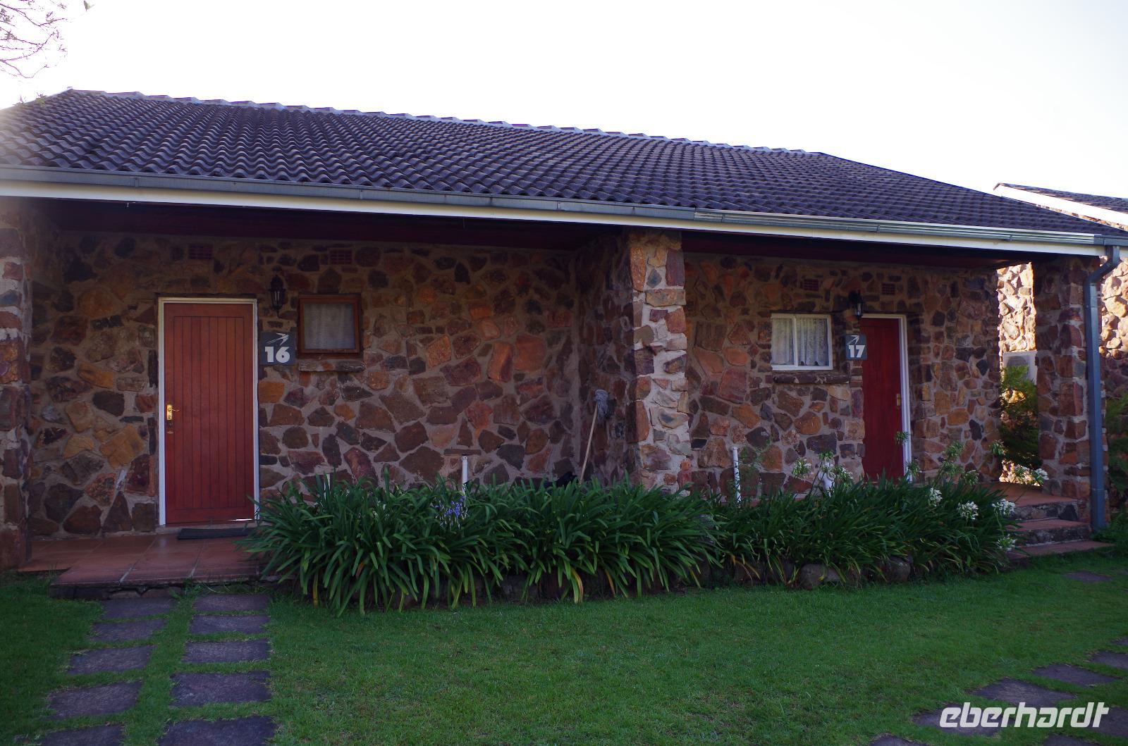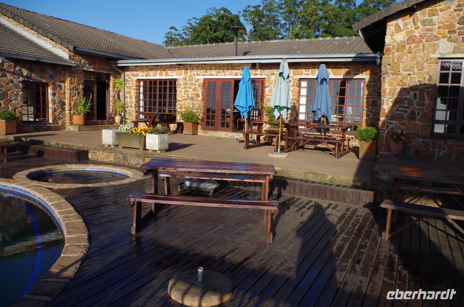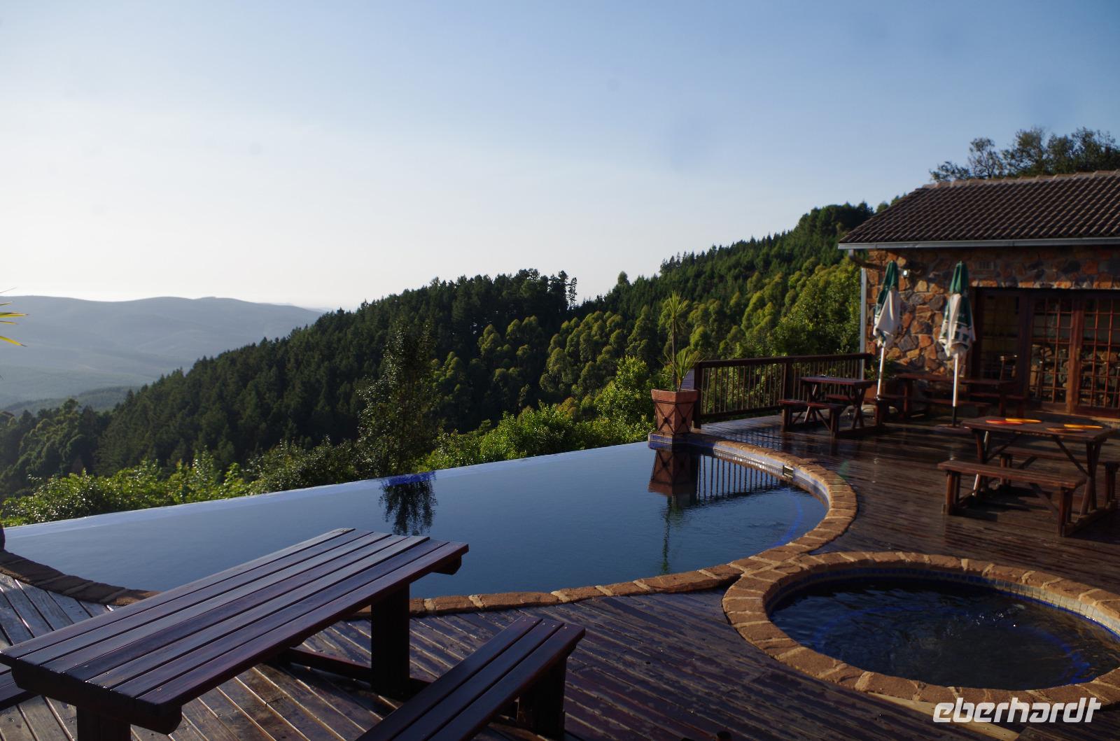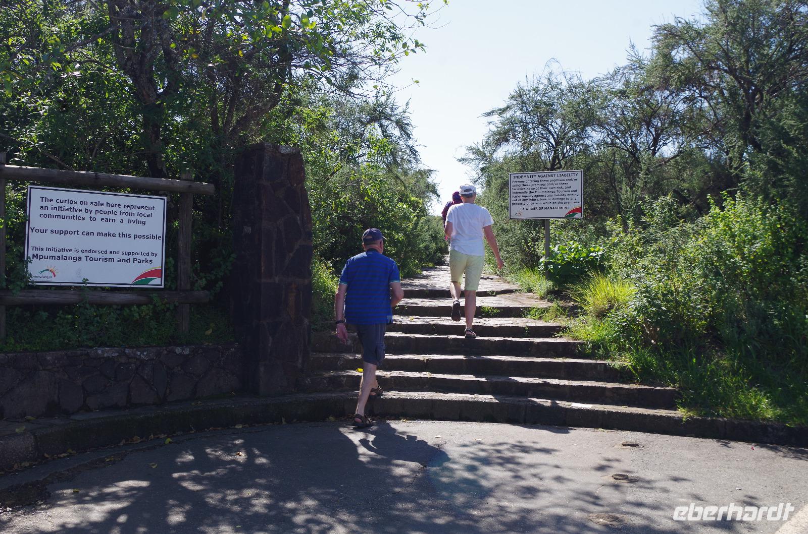 Die vergangene Nacht im halboffenen Steinhaus ist sicherlich für jeden Gast ein einmaliges besonderes Erlebnis! Wir werden persönlich von einem Mitarbeiter oder einer Mitarbeiterin des Stone Camps gegen 05.30 Uhr geweckt und erhalten ein kleines Frühstück mit Kaffee und Tee sowie einen leckeren Muffin. Bereits im Camp werden wir von der südostafrikanischen Antilopenart namens Nyala begrüßt. Diese fast schon zutraulichen Tiere fressen nur wenige Meter von uns entfernt gemütlich im Gras. Um 06.00 Uhr startet unsere morgendliche rund zweistündige Pirschfahrt im Mkhaya Game Reserve. Wir sehen unter anderem Gnus, Giraffen und weitere verschiedene Vogelarten. Gegen 08.00 Uhr genießen wir ein leckeres Frühstück im Stone Camp und tauschen uns darüber aus, wie wir die einzigartige Nacht verbracht und welche Tiere wir während der Safari gesehen haben. Wir können zumindest berichten, sowohl die Gäste als auch die Reisebegleitung haben in der vergangenen Nacht geschlafen. Rund eine Stunde später verstauen wir unsere Sachen und fahren zum gestrigen Treffpunkt, wo wir in unseren Bus umsteigen. Auf dem Weg zur Grenzstation im Swaziland und in Südafrika fahren wir durch Manzini und an der legislativen Hauptstadt Lohamba vorbei. Wir besuchen auch einen kleinen Markt für Kunsthandwerk und Souvenirs in Ezulwine. Unsere Fahrt führt uns weiter an der Hauptstadt Mbabane vom Swaziland vorbei durch Pigg's Peak. Gegen 14.00 Uhr reisen wir in Matsomo aus Swaziland aus und in Jeppe's Reef in Südafrika wieder ein. Das Grenzpersonal ist abermals eher touristenunfreundlich und wirkt extrem gelangweilt. Nun ja, solange wir unsere Ein- und Ausreisestempel erhalten, ist ja alles gut ;-) Langsam knurrt unser Magen, so dass wir am nächstgelegenen Einkaufszentrum in Malelan anhalten und uns mit Snacks und Getränken versorgen. Die Fahrt geht weiter zum 3-Sterne-Hotel "Misty Mountain Lodge" am Long Tom Pass zwischen Sabie und Lydenburg in Südafrika, wo wir gegen 17.30 Uhr einchecken. Wir befinden uns in der Provinz Mpumalanga, welche als "Ort der aufgehenden Sonne" bekannt und vom Lowveld-Busch und den großartigen Landschaftsformen der Hochebene geprägt ist. Der rund 20.000 Quadratkilometer große Krüger Nationalpark gehört ebenso zu dieser Provinz. Vor dem Abendessen stoßen wir gemeinsam auf den 65. Geburtstag eines Reisegasts an. Na dann, Prost und alles Gute zum Geburtstag! Zum Abendessen im Hotelrestaurant haben wir die Wahl zwischen Gemüsesuppe oder Dreierlei Fisch mit Pastete, Lachs und geräucherter Forelle als Vorspeise; Spaghetti Bolognese, Tagliatelle mit Pilz-Senf-Sahne-Soße, Steak mit Pfeffersoße oder Forellenfilet in Weißweinsoße mit Gemüse oder Salat und Reis, Kartoffelbrei aus Süßkartoffeln oder Pommes als Hauptspeise sowie Malva Pudding oder Eiscreme mit Schokosoße als Dessert. Guten Appetit, lassen wir es uns schmecken ;o) Wir gönnen uns noch ein Glas Wein auf der Terrasse, bevor wir uns wenig später eine angenehme Nacht wünschen.
