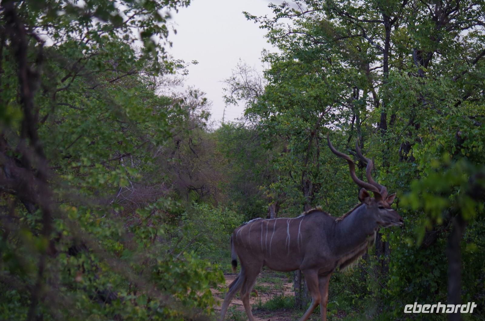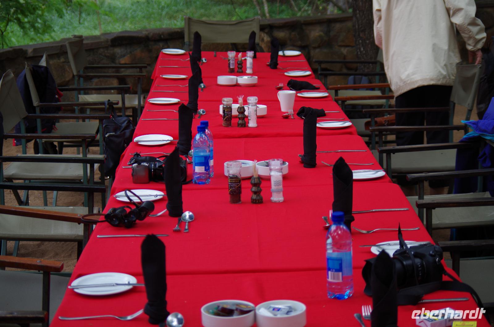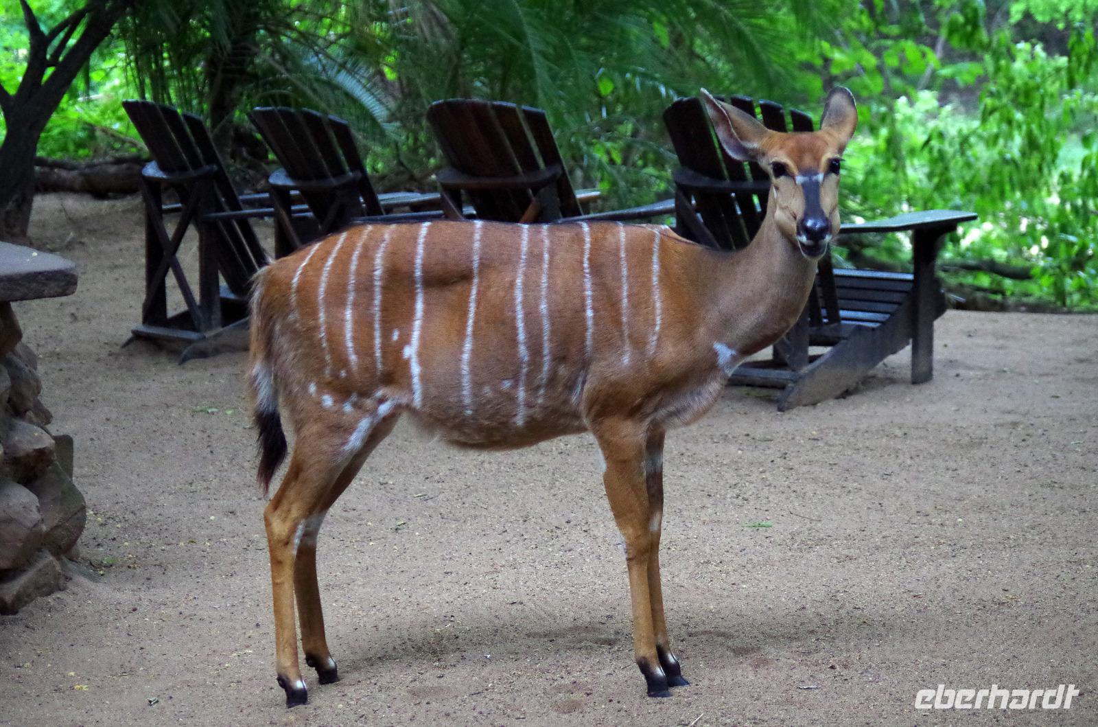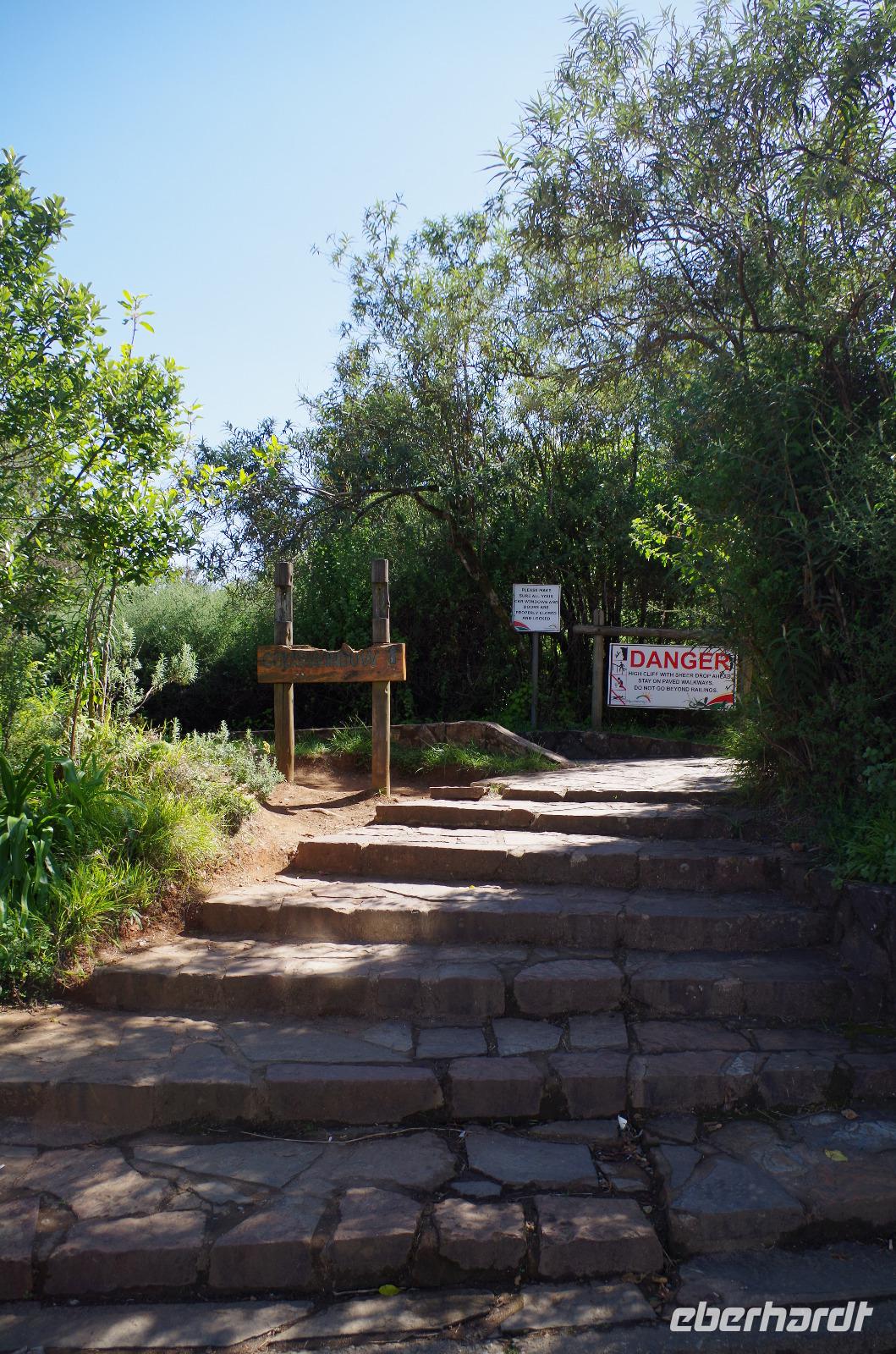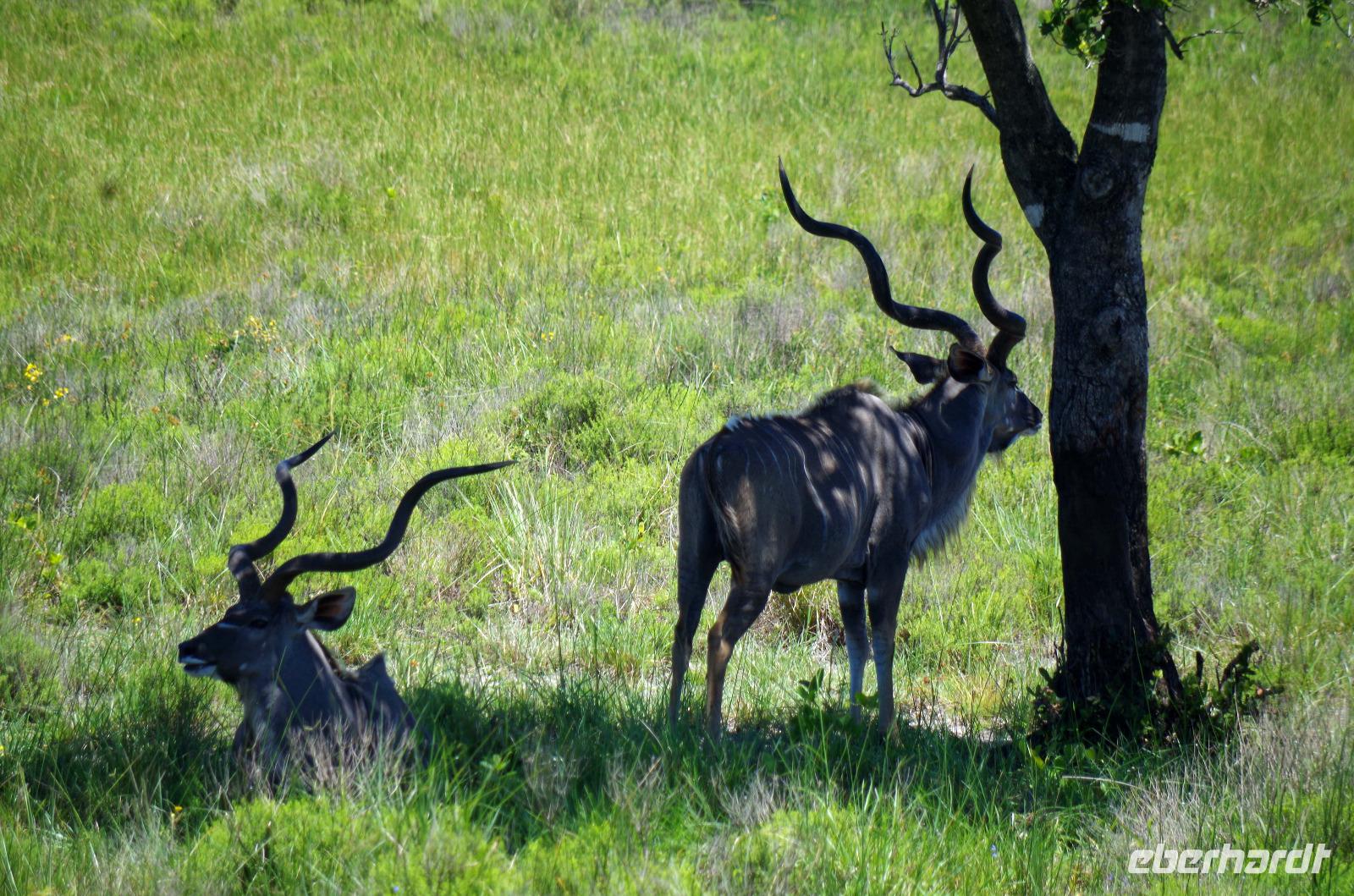 Die vergangene Nacht im halboffenen Steinhaus ist sicherlich für jeden Gast ein einmaliges besonderes Erlebnis! Wir werden persönlich von einem Mitarbeiter oder einer Mitarbeiterin des Stone Camps gegen 05.30 Uhr geweckt und erhalten ein kleines Frühstück mit Kaffee und Tee sowie einen leckeren Muffin. Bereits im Camp werden wir von der südostafrikanischen Antilopenart namens Nyala begrüßt. Diese fast schon zutraulichen Tiere fressen nur wenige Meter von uns entfernt gemütlich im Gras. Um 06.00 Uhr startet unsere morgendliche rund zweistündige Pirschfahrt im Mkhaya Game Reserve. Wir sehen unter anderem Gnus, Giraffen und weitere verschiedene Vogelarten. Gegen 08.00 Uhr genießen wir ein leckeres Frühstück im Stone Camp und tauschen uns darüber aus, wie wir die einzigartige Nacht verbracht und welche Tiere wir während der Safari gesehen haben. Wir können zumindest berichten, sowohl die Gäste als auch die Reisebegleitung haben in der vergangenen Nacht geschlafen. Rund eine Stunde später verstauen wir unsere Sachen und fahren zum gestrigen Treffpunkt, wo wir in unseren Bus umsteigen. Auf dem Weg zur Grenzstation im Swaziland und in Südafrika fahren wir durch Manzini und an der legislativen Hauptstadt Lohamba vorbei. Wir besuchen auch einen kleinen Markt für Kunsthandwerk und Souvenirs in Ezulwine. Unsere Fahrt führt uns weiter an der Hauptstadt Mbabane vom Swaziland vorbei durch Pigg's Peak. Gegen 14.00 Uhr reisen wir in Matsomo aus Swaziland aus und in Jeppe's Reef in Südafrika wieder ein. Das Grenzpersonal ist abermals eher touristenunfreundlich und wirkt extrem gelangweilt. Nun ja, solange wir unsere Ein- und Ausreisestempel erhalten, ist ja alles gut ;-) Langsam knurrt unser Magen, so dass wir am nächstgelegenen Einkaufszentrum in Malelan anhalten und uns mit Snacks und Getränken versorgen. Die Fahrt geht weiter zum 3-Sterne-Hotel "Misty Mountain Lodge" am Long Tom Pass zwischen Sabie und Lydenburg in Südafrika, wo wir gegen 17.30 Uhr einchecken. Wir befinden uns in der Provinz Mpumalanga, welche als "Ort der aufgehenden Sonne" bekannt und vom Lowveld-Busch und den großartigen Landschaftsformen der Hochebene geprägt ist. Der rund 20.000 Quadratkilometer große Krüger Nationalpark gehört ebenso zu dieser Provinz. Vor dem Abendessen stoßen wir gemeinsam auf den 65. Geburtstag eines Reisegasts an. Na dann, Prost und alles Gute zum Geburtstag! Zum Abendessen im Hotelrestaurant haben wir die Wahl zwischen Gemüsesuppe oder Dreierlei Fisch mit Pastete, Lachs und geräucherter Forelle als Vorspeise; Spaghetti Bolognese, Tagliatelle mit Pilz-Senf-Sahne-Soße, Steak mit Pfeffersoße oder Forellenfilet in Weißweinsoße mit Gemüse oder Salat und Reis, Kartoffelbrei aus Süßkartoffeln oder Pommes als Hauptspeise sowie Malva Pudding oder Eiscreme mit Schokosoße als Dessert. Guten Appetit, lassen wir es uns schmecken ;o) Wir gönnen uns noch ein Glas Wein auf der Terrasse, bevor wir uns wenig später eine angenehme Nacht wünschen.