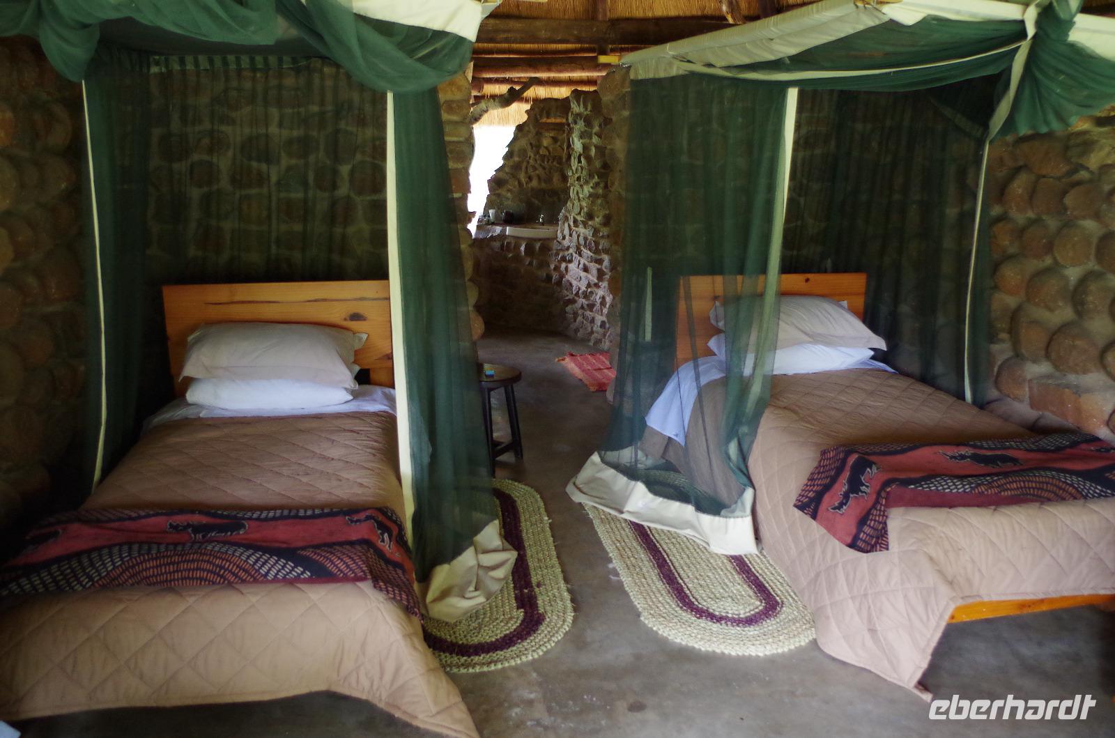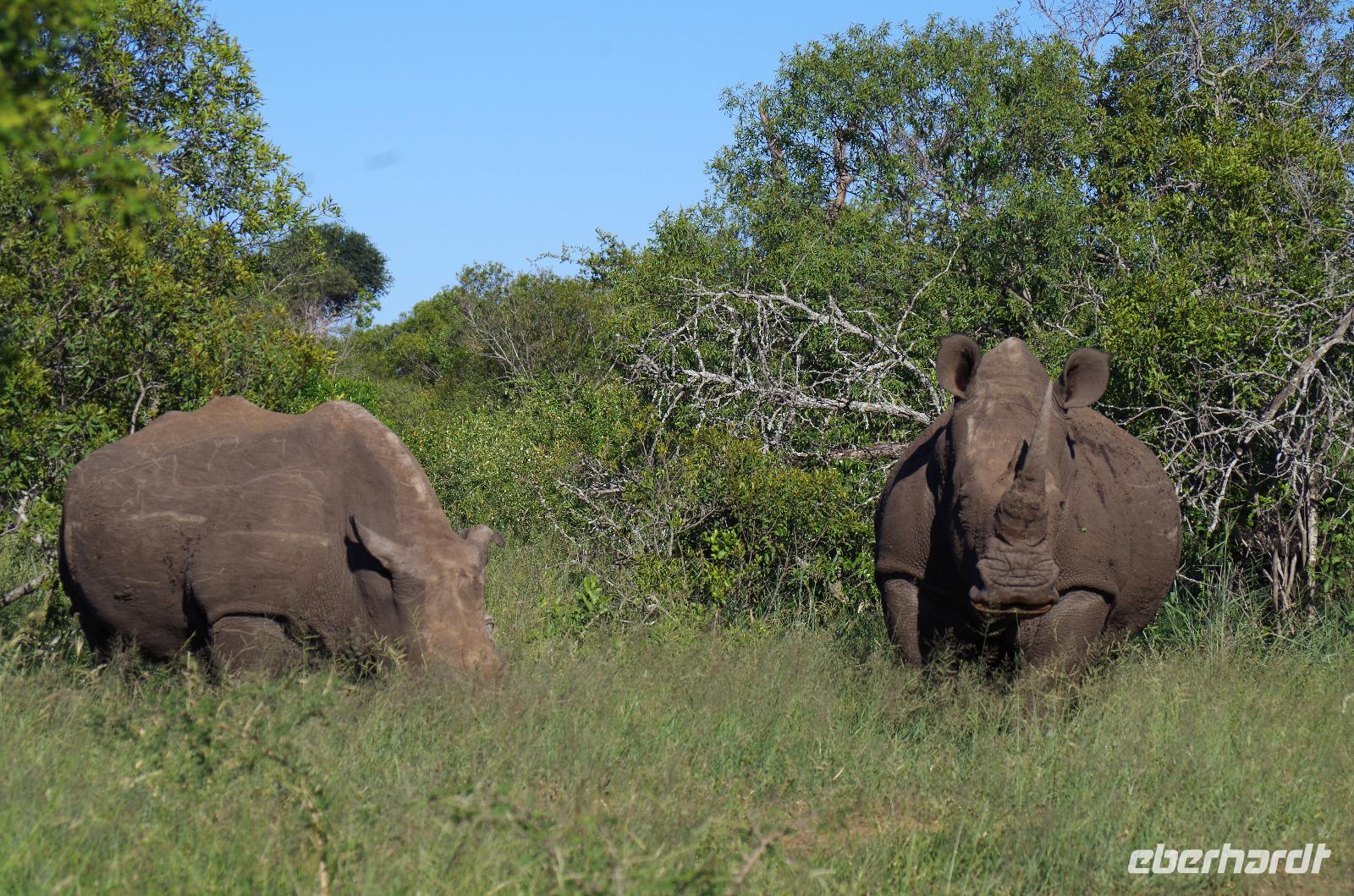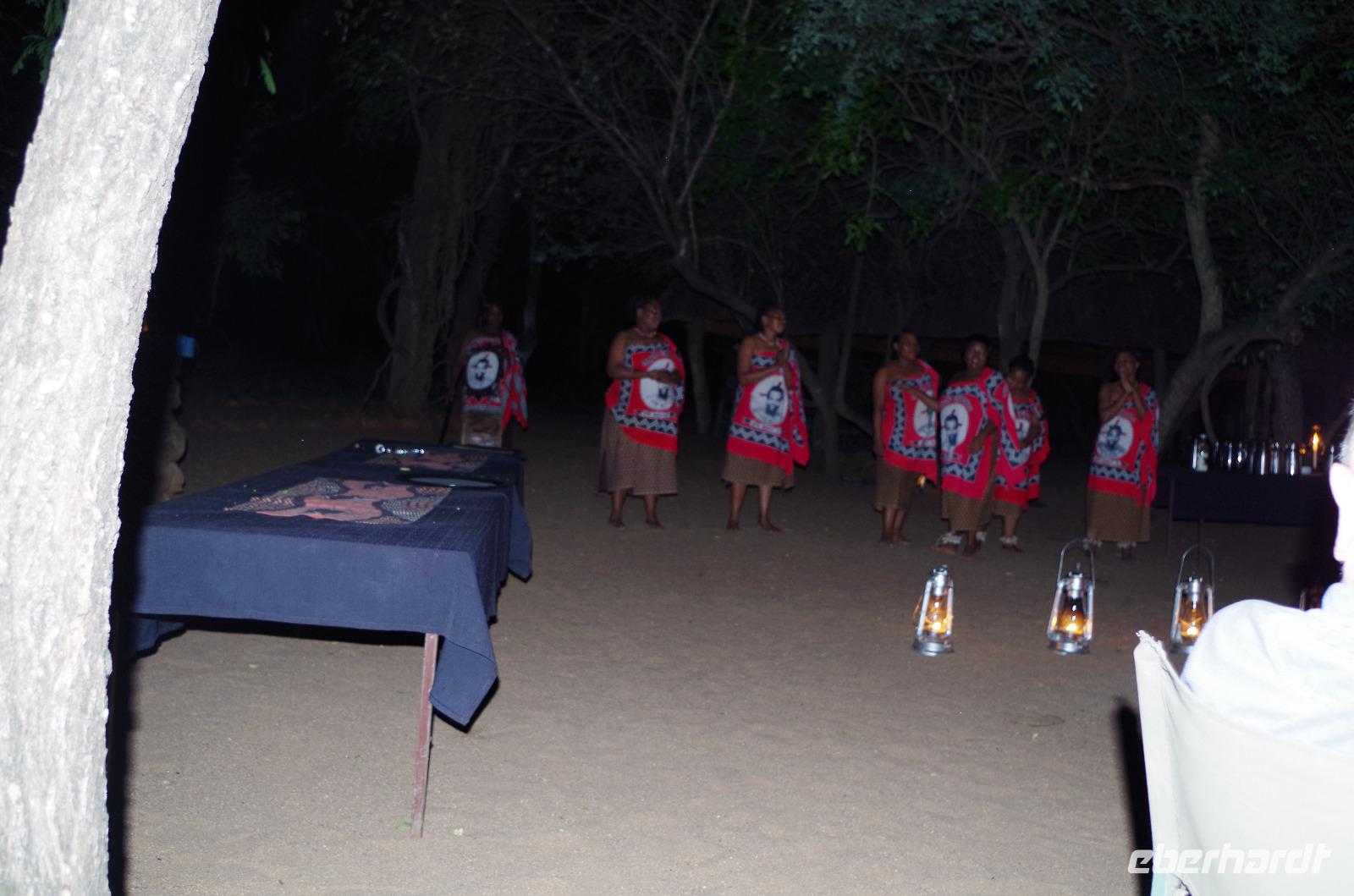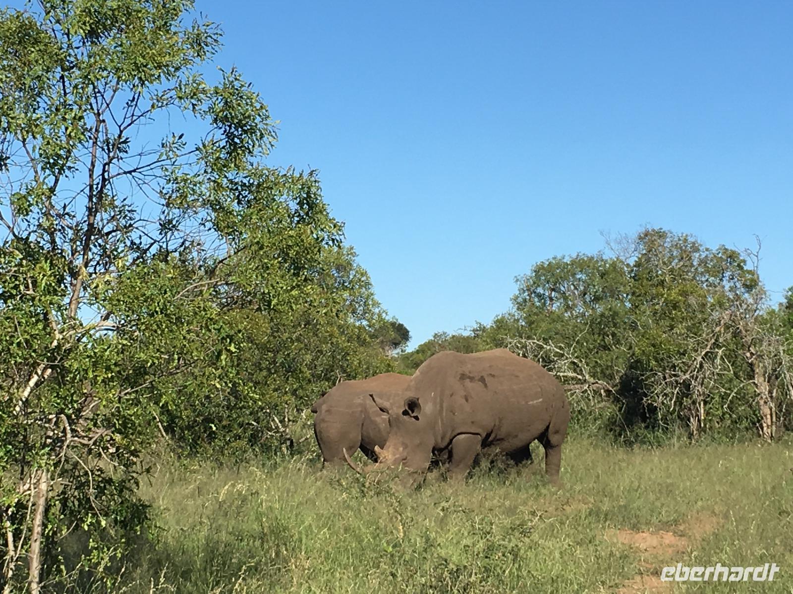 Wir werden abermals mit warmen Sonnenstrahlen geweckt. Nach einem leckeren Frühstück fahren wir um 08.00 Uhr von St. Lucia nach Swaziland ins "Mkhaya Game Reserve" oder auch Mkhaya Wildreservat, da "Game Reserve" wörtlich mit Wildpark oder Wildschutzgebiet übersetzt wird. Unterwegs legen wir eine Harmoniepause im Einkaufszentrum in Mtube ein. Zudem besorgen wir im Supermarkt Getränke und Kleinigkeiten für unterwegs. Um 11.00 Uhr reisen wir an der Grenzkontrolle in Golela aus Südafrika aus und in Lavumisa ins Swaziland ein. Die Aus- und Einreise verläuft sehr zügig und emotionslos, nicht mal ein "Guten Tag" erhalten wir. Aber gut, weiter geht's ;-) Unsere Mittagspause nehmen wir beim rund 32 Kilometer entfernten "Nisela Guesthouse" im Swaziland ein. Auf der Wiese sind Tische und Stühle vorhanden, wir packen unsere mitgebrachten Picknick-Sachen aus und genießen einen leckeren Snack bei strahlendem Sonnenschein. Wir können einen Kaffee bestellen oder Andenken im kleinen Souvenirladen erwerben. Eigentlich werden wir erst 16.00 Uhr am Treffpunkt zur Safari im "Mkhaya Game Reserve" abgeholt. Sonet spricht aber mehrmals mit dem Reservat, damit wir eher abgeholt werden können, was uns auch bestätigt wird. Somit fahren wir gegen 13.00 Uhr weiter zum vereinbarten Treffpunkt, welchen wir bereits rund eineinhalb Stunden später erreichen. Zwar hat das mit dem zeitigen Abholen nicht funktioniert, aber wir machen das Beste aus der Situation. Die Wartezeit überbrücken wir mit dem Erlebnisaustausch oder dem Lesen eines spannenden Buches im Bus, da es draußen doch schon sehr schwül-warm ist. Kurz nach 16.00 Uhr treffen dann endlich die Jeeps ein. Im offenen Geländewagen sind zehn Sitzplätze vorhanden. Die Gruppe teilt sich auf, in einem Jeep fährt Sonet, im anderem Jeep die Reisebegleitung mit. Wir fahren zuerst zum Basiscamp, wo uns ein Willkommensdrink serviert wird. Während der Safari werden wir ausreichend mit Wasser versorgt. Die Wildtiere sind am aktivsten am späten Nachmittag bis Sonnenuntergang oder am frühen Morgen. Tagsüber schlafen die Tiere unter Bäumen oder Büschen an schattigen Plätzen, um sich vor der extremen Hitze zu schützen. Während der Safari empfiehlt sich das Tragen bequemer Schuhe und auch bequemer Kleidung in den Farben beige oder Khaki, also in eher gedeckten Farben, um sich der Umgebung anzupassen. Da es bis zu 40 Grad und mehr heiß werden kann, sind Sonneschutz und Kopfbedeckung sowie ausreichend Wasser fast schon ein MUSS auf jeder Safari. Unsere Guides empfehlen uns auch die Mitnahme einer dünnen Jacke, da es in den frühen Morgenstunden oder auch am späten Abend durchaus recht kühl werden kann. Im Jeep wird unser kleines Handgepäck verstaut, die großen Koffer bleiben sicher im Bus über Nacht auf einem von der Polizei überwachten Parkplatz verschlossen. Und schon kann unsere erste aufregende Safari starten! Mit dem Fernglas und der Kamera in den Händen warten wir gespannt darauf, endlich die großartigen Tiere vor unsere Linsen zu bekommen. Und sie lassen nicht lange auf sich warten *freu* Bereits kurze Zeit später sehen wir zwei im Gras fressende Breitmaulnashörner. Während diese Nashornart im Nationalpark weit verbreitet ist, werden Spitzmaulnashörner eher selten gesehen, da sie sich hauptsächlich im Gebüsch verstecken. Wie der Name bereits verrät, unterscheiden sich die Arten hinsichtlich der Form ihres Mauls. Während das Breitmaulnashorn mit seinem breiten Maul das Gras am Boden frisst, rupft das Spitzmaulnashorn mit der Oberlippe die Blätter von den Ästen. Als Reviertiere markieren Nashörner mit dem Hinterlassen mehrerer Misthaufen - auch "Dung" genannt - immer an der gleichen Stellen ihr Revier. Mit einer Vielzahl an Nashornfotos geht unsere Safari auch schon weiter. Beim zweiten Jeep gibt es noch ein Problem mit dem Motor, nach mehrmaligen Versuchen springt dieser zum Glück doch wieder an. Es wird allerdings nicht die einzige Panne dieses Jeeps am heutigen Tag sein! Die Gruppen fahren auf unterschiedlichen Routen durch das Reservat. Wir sehen Giraffen, Zebras, Nyalas, "Hippos" und verschiedene Vogelarten. Bei der anderen Gruppe ist es noch zu einer Reifenpanne gekommen, der Reifen ist unterwegs gewechselt worden. Gegen 18.00 Uhr passieren wir die Einfahrt zum 2,5-Sterne-Stone Camp im Mkhaya Game Reserve. Zuerst werden uns die Unterkünfte gezeigt. Wir werden die Nacht im halboffenem Steinhäuschen mit halbhohen Steinmauern verbringen. Es gibt keinen Strom und das Handgepäck ist am besten in der Truhe zu verstauen, bevor neugierige Affen kommen und einzelne Dinge stibitzen. Das Bett ist von einem Mosquitonetz umgeben. Der ein oder andere Reisegast sowie die Reisebegleitung fragen sich zwar jetzt schon, ob sie in einer so halboffenen Unterkunft überhaupt schlafen werden, aber auch wenn es ungewohnt ist, wir werden sicher sehr gut schlafen, oder?! Um 19.00 Uhr wird uns ein leckeres 3-Gang-Abendessen am Lagerfeuer serviert. Nach dem Essen unterhalten uns die Gastgeberinnen mit afrikanischen Tänzen und gegen 22.00 Uhr verabschieden wir uns voneinander. Aus Sicherheitsgründen bringt uns das Wachpersonal zu den Unterkünften. Eine unvergessliche spannende Nacht steht uns bevor ;-)