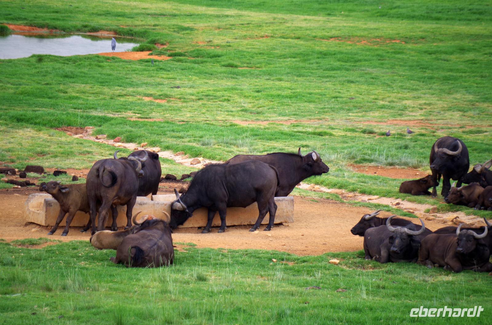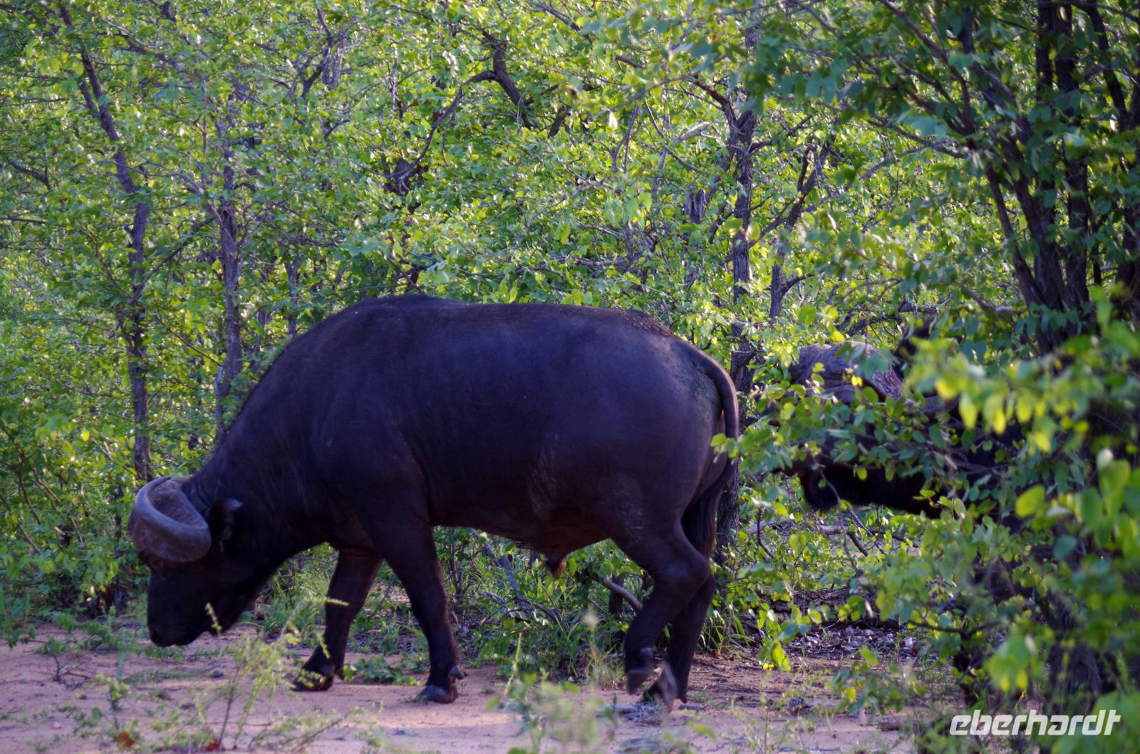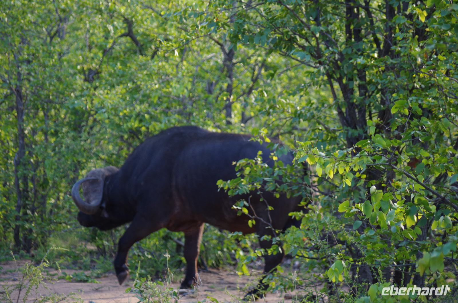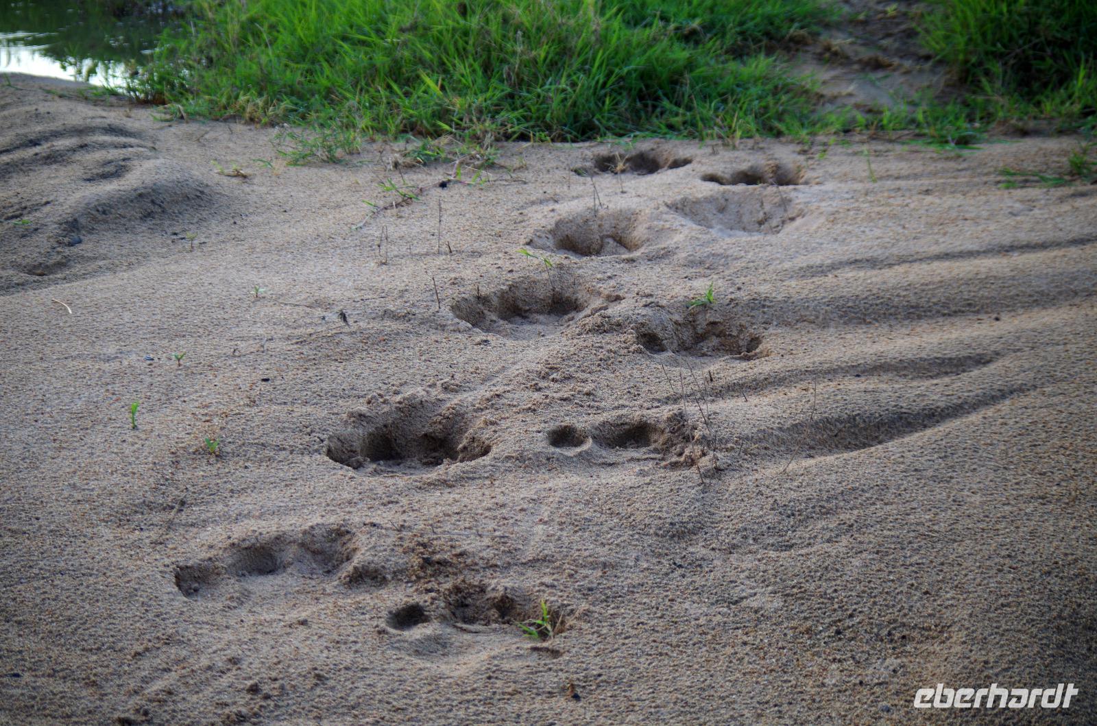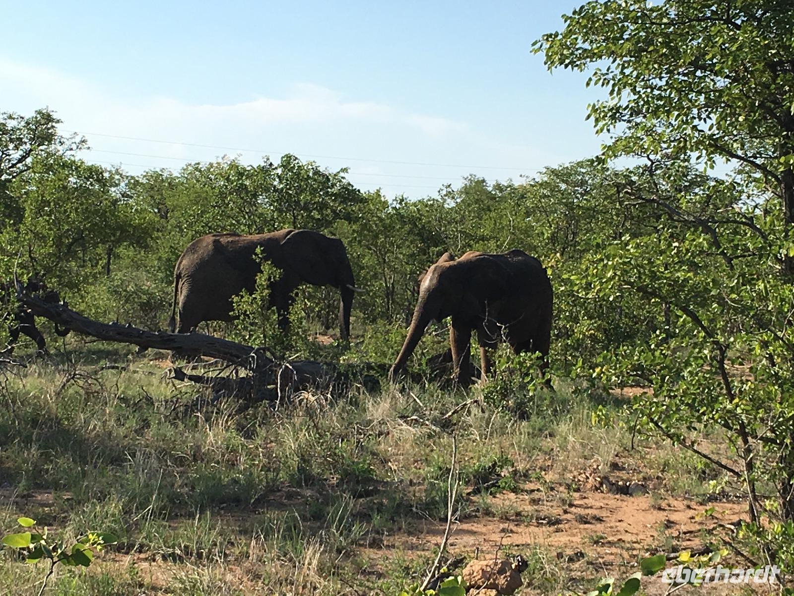 Viele Tiere können am frühen Morgen und in der Abenddämmerung beobachtet werden. Also heißt es abermals "der frühe Vogel fängt den Wurm" oder so :-) Wir werden um 05.00 Uhr durch einen Weckruf geweckt und bei der Rezeption mit Tee und Kaffee begrüßt. Rund eine halbe Stunde später beginnt die zweite Pirschfahrt. Zum Morgen sind die Temperaturen eher angenehm, eine Jacke wird nicht wirklich benötigt. Heute sollen es noch bis zu 39 Grad heiß werden, wir sind gespannt!!! Während unserer morgendlichen Pirschfahrt sehen wir leider nicht so viele Tiere wie gestern. Dies liegt wohl daran, dass sie alle noch schlafen *grins* Unser Spurenleser zeigt uns verschiedene Tierspuren unterschiedlicher Größe und Form. Zum Beispiel ist die Pfote eines Löwen rund 14 cm groß, eines Leoparden rund 7,1 cm, eines Breitmaulnashorns 30 cm, eines Spitzmaulnashorns 24 cm, eines Elefanten 50 cm und eines Büffels 18 cm. Unser Fahrer erklärt uns, dass wir vorrangig Breitmaulnashörner sehen werden, da Spitzmaulnashörner zwar auch im Nationalpark zu finden sind, aber diese, wie wir bereits wissen, eher selten entdeckt werden. Am Morgen schauen wir müden Hyänen beim Schlafen zu und fotografieren verschiedene Vogelarten. Die andere Gruppe hat sogar noch ein wenig mehr Glück, in dem sie die eher selten vorkommende "Afrikanische Zibetkatze" sehen. Interessant ist sicher für den einen oder anderen Reisegast auch, wie viele Tiere einer Art im Krüger Nationalpark vorkommen, oder? Die genaue Anzahl der verschiedenen Tierarten ist sicherlich der Parkleitung bekannt, sie wird aber nicht an Touristen übermittelt. Dies dient besonders auch dem Schutz der Tiere vor Wilderern. Laut Tierzählung vom Krüger National Park, kurz KNP, leben zum Beispiel ungefähr bis zu 1.750 Löwen, rund 1.000 Leoparden, circa 13.750 Elefanten und mehr als 37.000 Büffel im Park. Während der Safari legen wir eine Frühstückspause ein und werden mit Tee, Kaffee und Gebäck versorgt. In der Lodge erhalten wir dann noch ein vollwertiges Frühstück. Die Zeit bis zu unserer abendlichen Pirschfahrt vertreiben wir uns mit entspannen, im Pool schwimmen oder einem interessanten Buch lesen. Um 13.30 Uhr wird uns ein leichtes Mittagessen auf der Hotelterrasse serviert und später zur High Tea Time wieder Kaffee, Tee und Gebäck. Es ist nun wirklich sehr heiß, so dass wir viel Wasser trinken und uns vorrangig im Schatten aufhalten. Um 16.30 Uhr startet unsere dritte Pirschfahrt, wo wir endlich eine Vielzahl an Elefanten zu Gesicht bekommen, ein großartiger Anblick! Die Tagesbeschäftigung eines Elefanten besteht darin, hauptsächlich zu fressen und zu trinken, wobei der Tagesbedarf rund 200 Liter Wasser und bis zu 250 Kilogramm Gras beträgt. Wir erfahren von unserem Fahrer, dass die Bullen die Herden mit Beginn der Pubertät verlassen und eine kleine Junggesellengruppe bilden. Wir sehen zum Nachmittag unter anderem noch mehr Elefanten, zwei Büffel, eine Leopardenschildkröte und einen Steinbock. Besonders die Beobachtung zweier riesiger männlicher Büffel ist sehr spannend, da diese Tiere aufgrund ihrer Unberechenbarkeit zu den gefährlichsten Wildtieren Afrikas zählen. Zudem haben wir ein kleines Problem mit dem Anlasser des Jeeps, wobei vor allem die Reisebegleitung ein klein wenig ins Schwitzen gerät, nachdem ihr der Fahrer mitteilt, dass sich die Ersatzbatterie unter ihrem Sitz befindet und sie somit aufstehen und aus dem Fahrzeug aussteigen müsste. Als ernstzunehmende Vorsichtsmaßnahme ist es den Gästen eigentlich nicht erlaubt, während der Safari aufzustehen. Uns wird mit Pirschfahrtbeginn erklärt, dass die Wildtiere einen Jeep mit sitzenden Personen als großes Ganzes wahrnehmen. Sobald eine Person aufsteht, ist es kein großes Ganzes mehr, das Wildtier fühlt sich unter Umständen bedroht und attackiert die Menschen. Da bleiben wir doch lieber sitzen und halten uns zu unserer eigenen Sicherheit an diese Vorsichtsmaßnahme. Zudem sollten sich die Arme im Jeep befinden, was auch damit zu tun hat, dass wir teilweise durch dichtes Gebüsch und ziemlich oft auch unter tiefhängenden Bäumen hindurch fahren, wobei wir unsere heraushängenden Arme und Hände aufkratzen könnten. Kommen wir aber zurück zu den bis zu 1,4 Meter großen und rund 800 Kilogramm starken Büffeln! Unser Fahrer erzählt uns, dass sie als soziale Wildtiere in Herden mit bis zu 100 Büffeln leben, wobei ältere Büffel oftmals allein oder in kleinen Gruppen unterwegs sind. Somit geht unser Fahrer auch davon aus, dass die zwei Büffel, welche uns über den Weg laufen, schon älter sein müssen. Büffel halten sich vorwiegend im Grasland in der Nähe von Wasserstellen auf. Nun steht aber noch die Frage im Raum, müssen wir die Batterie wechseln oder nicht? Zum Glück springt der Motor nach mehrmaligen Versuchen von selbst wieder an und die Reisebegleitung kann sich etwas ruhiger zurücklehnen ;o) Da unsere zwei Gruppen zu weit entfernt voneinander fahren, werden wir heute auch getrennte Sundowner erleben. Das Wetter schaut weniger gut aus, in weiter Ferne blitzt und donnert es schon! Es scheint auch eine Regenwand auf uns zuzusteuern! Wir fahren wieder zum Camp zurück und sind zu einem leckeren südafrikanischen Barbecue, auch "Braais" genannt, am Lagerfeuer eingeladen. Die Tische sind in einer durch Eckpfeiler geschützten runden Fläche namens "Boma" unter dem sternenklarem Himmel am Lagerfeuer angeordnet. Unsere Fahrer Clement und Trabo sitzen heute mit uns am Tisch. Wir erfahren weitere spannende Informationen über die südafrikanische Tierwelt sowie das Leben als Fahrer und Guide im Nationalpark. Ein spannender Tag geht zu Ende! Wer möchte, kann morgen an einer weiteren morgendlichen Pirschfahrt teilnehmen oder ganz entspannt ausschlafen.