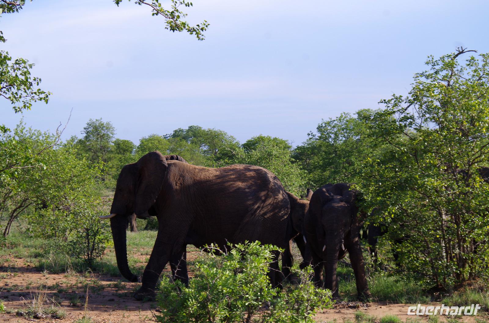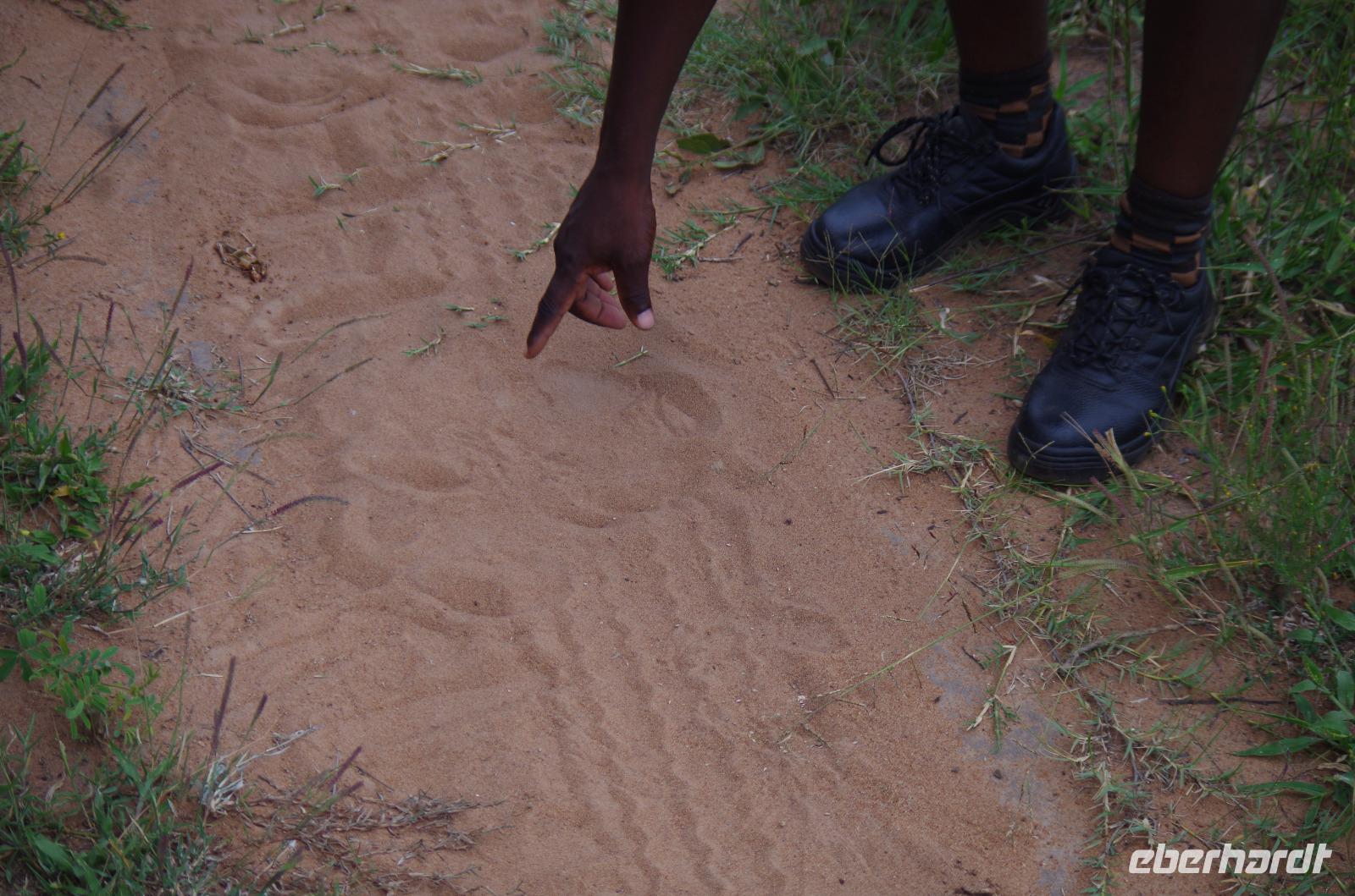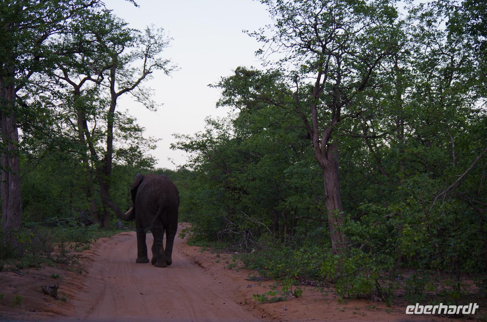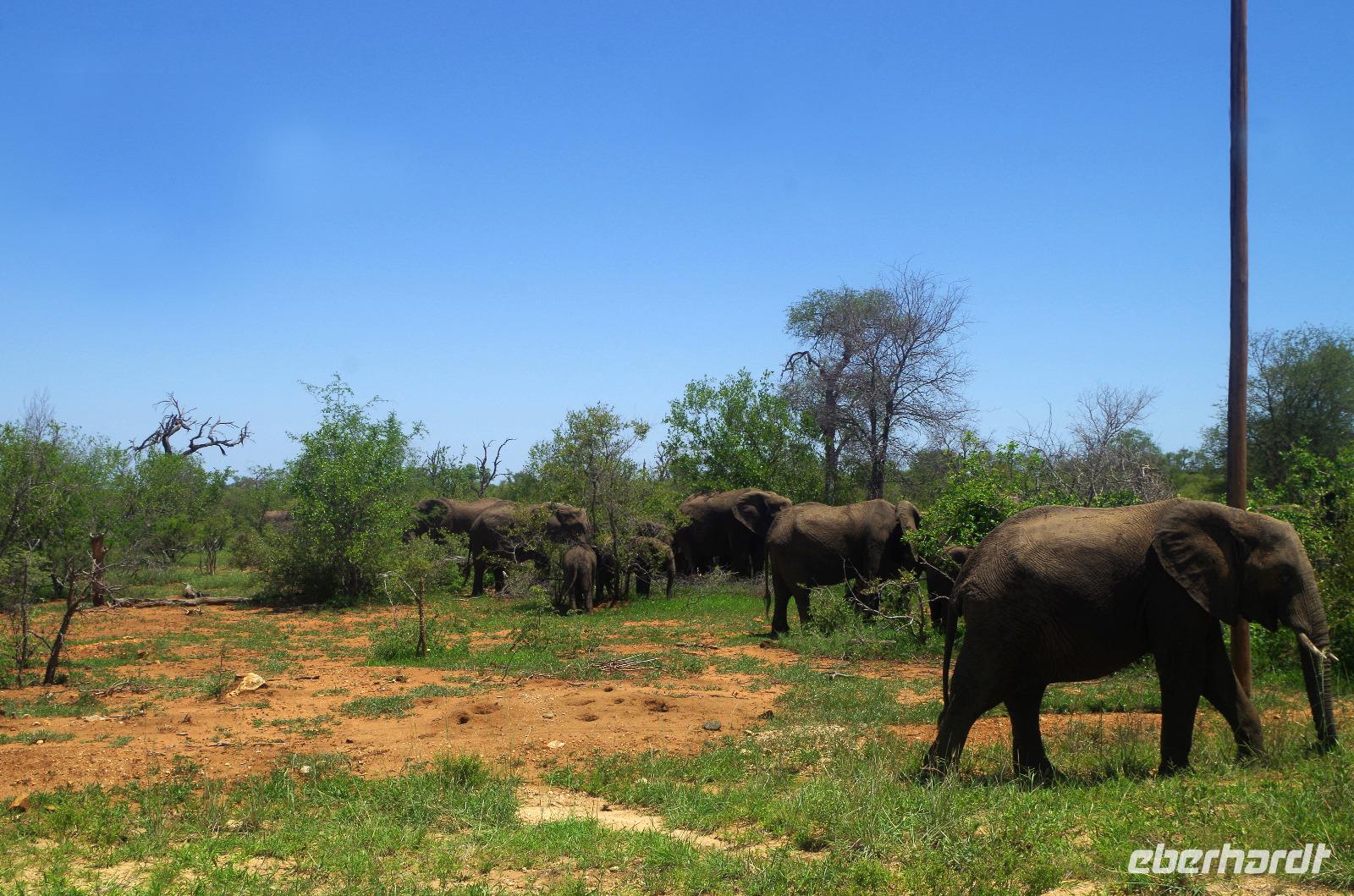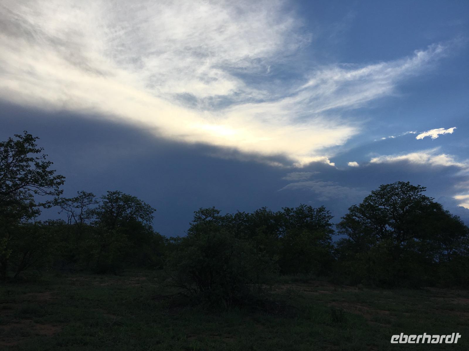 Viele Tiere können am frühen Morgen und in der Abenddämmerung beobachtet werden. Also heißt es abermals "der frühe Vogel fängt den Wurm" oder so :-) Wir werden um 05.00 Uhr durch einen Weckruf geweckt und bei der Rezeption mit Tee und Kaffee begrüßt. Rund eine halbe Stunde später beginnt die zweite Pirschfahrt. Zum Morgen sind die Temperaturen eher angenehm, eine Jacke wird nicht wirklich benötigt. Heute sollen es noch bis zu 39 Grad heiß werden, wir sind gespannt!!! Während unserer morgendlichen Pirschfahrt sehen wir leider nicht so viele Tiere wie gestern. Dies liegt wohl daran, dass sie alle noch schlafen *grins* Unser Spurenleser zeigt uns verschiedene Tierspuren unterschiedlicher Größe und Form. Zum Beispiel ist die Pfote eines Löwen rund 14 cm groß, eines Leoparden rund 7,1 cm, eines Breitmaulnashorns 30 cm, eines Spitzmaulnashorns 24 cm, eines Elefanten 50 cm und eines Büffels 18 cm. Unser Fahrer erklärt uns, dass wir vorrangig Breitmaulnashörner sehen werden, da Spitzmaulnashörner zwar auch im Nationalpark zu finden sind, aber diese, wie wir bereits wissen, eher selten entdeckt werden. Am Morgen schauen wir müden Hyänen beim Schlafen zu und fotografieren verschiedene Vogelarten. Die andere Gruppe hat sogar noch ein wenig mehr Glück, in dem sie die eher selten vorkommende "Afrikanische Zibetkatze" sehen. Interessant ist sicher für den einen oder anderen Reisegast auch, wie viele Tiere einer Art im Krüger Nationalpark vorkommen, oder? Die genaue Anzahl der verschiedenen Tierarten ist sicherlich der Parkleitung bekannt, sie wird aber nicht an Touristen übermittelt. Dies dient besonders auch dem Schutz der Tiere vor Wilderern. Laut Tierzählung vom Krüger National Park, kurz KNP, leben zum Beispiel ungefähr bis zu 1.750 Löwen, rund 1.000 Leoparden, circa 13.750 Elefanten und mehr als 37.000 Büffel im Park. Während der Safari legen wir eine Frühstückspause ein und werden mit Tee, Kaffee und Gebäck versorgt. In der Lodge erhalten wir dann noch ein vollwertiges Frühstück. Die Zeit bis zu unserer abendlichen Pirschfahrt vertreiben wir uns mit entspannen, im Pool schwimmen oder einem interessanten Buch lesen. Um 13.30 Uhr wird uns ein leichtes Mittagessen auf der Hotelterrasse serviert und später zur High Tea Time wieder Kaffee, Tee und Gebäck. Es ist nun wirklich sehr heiß, so dass wir viel Wasser trinken und uns vorrangig im Schatten aufhalten. Um 16.30 Uhr startet unsere dritte Pirschfahrt, wo wir endlich eine Vielzahl an Elefanten zu Gesicht bekommen, ein großartiger Anblick! Die Tagesbeschäftigung eines Elefanten besteht darin, hauptsächlich zu fressen und zu trinken, wobei der Tagesbedarf rund 200 Liter Wasser und bis zu 250 Kilogramm Gras beträgt. Wir erfahren von unserem Fahrer, dass die Bullen die Herden mit Beginn der Pubertät verlassen und eine kleine Junggesellengruppe bilden. Wir sehen zum Nachmittag unter anderem noch mehr Elefanten, zwei Büffel, eine Leopardenschildkröte und einen Steinbock. Besonders die Beobachtung zweier riesiger männlicher Büffel ist sehr spannend, da diese Tiere aufgrund ihrer Unberechenbarkeit zu den gefährlichsten Wildtieren Afrikas zählen. Zudem haben wir ein kleines Problem mit dem Anlasser des Jeeps, wobei vor allem die Reisebegleitung ein klein wenig ins Schwitzen gerät, nachdem ihr der Fahrer mitteilt, dass sich die Ersatzbatterie unter ihrem Sitz befindet und sie somit aufstehen und aus dem Fahrzeug aussteigen müsste. Als ernstzunehmende Vorsichtsmaßnahme ist es den Gästen eigentlich nicht erlaubt, während der Safari aufzustehen. Uns wird mit Pirschfahrtbeginn erklärt, dass die Wildtiere einen Jeep mit sitzenden Personen als großes Ganzes wahrnehmen. Sobald eine Person aufsteht, ist es kein großes Ganzes mehr, das Wildtier fühlt sich unter Umständen bedroht und attackiert die Menschen. Da bleiben wir doch lieber sitzen und halten uns zu unserer eigenen Sicherheit an diese Vorsichtsmaßnahme. Zudem sollten sich die Arme im Jeep befinden, was auch damit zu tun hat, dass wir teilweise durch dichtes Gebüsch und ziemlich oft auch unter tiefhängenden Bäumen hindurch fahren, wobei wir unsere heraushängenden Arme und Hände aufkratzen könnten. Kommen wir aber zurück zu den bis zu 1,4 Meter großen und rund 800 Kilogramm starken Büffeln! Unser Fahrer erzählt uns, dass sie als soziale Wildtiere in Herden mit bis zu 100 Büffeln leben, wobei ältere Büffel oftmals allein oder in kleinen Gruppen unterwegs sind. Somit geht unser Fahrer auch davon aus, dass die zwei Büffel, welche uns über den Weg laufen, schon älter sein müssen. Büffel halten sich vorwiegend im Grasland in der Nähe von Wasserstellen auf. Nun steht aber noch die Frage im Raum, müssen wir die Batterie wechseln oder nicht? Zum Glück springt der Motor nach mehrmaligen Versuchen von selbst wieder an und die Reisebegleitung kann sich etwas ruhiger zurücklehnen ;o) Da unsere zwei Gruppen zu weit entfernt voneinander fahren, werden wir heute auch getrennte Sundowner erleben. Das Wetter schaut weniger gut aus, in weiter Ferne blitzt und donnert es schon! Es scheint auch eine Regenwand auf uns zuzusteuern! Wir fahren wieder zum Camp zurück und sind zu einem leckeren südafrikanischen Barbecue, auch "Braais" genannt, am Lagerfeuer eingeladen. Die Tische sind in einer durch Eckpfeiler geschützten runden Fläche namens "Boma" unter dem sternenklarem Himmel am Lagerfeuer angeordnet. Unsere Fahrer Clement und Trabo sitzen heute mit uns am Tisch. Wir erfahren weitere spannende Informationen über die südafrikanische Tierwelt sowie das Leben als Fahrer und Guide im Nationalpark. Ein spannender Tag geht zu Ende! Wer möchte, kann morgen an einer weiteren morgendlichen Pirschfahrt teilnehmen oder ganz entspannt ausschlafen.