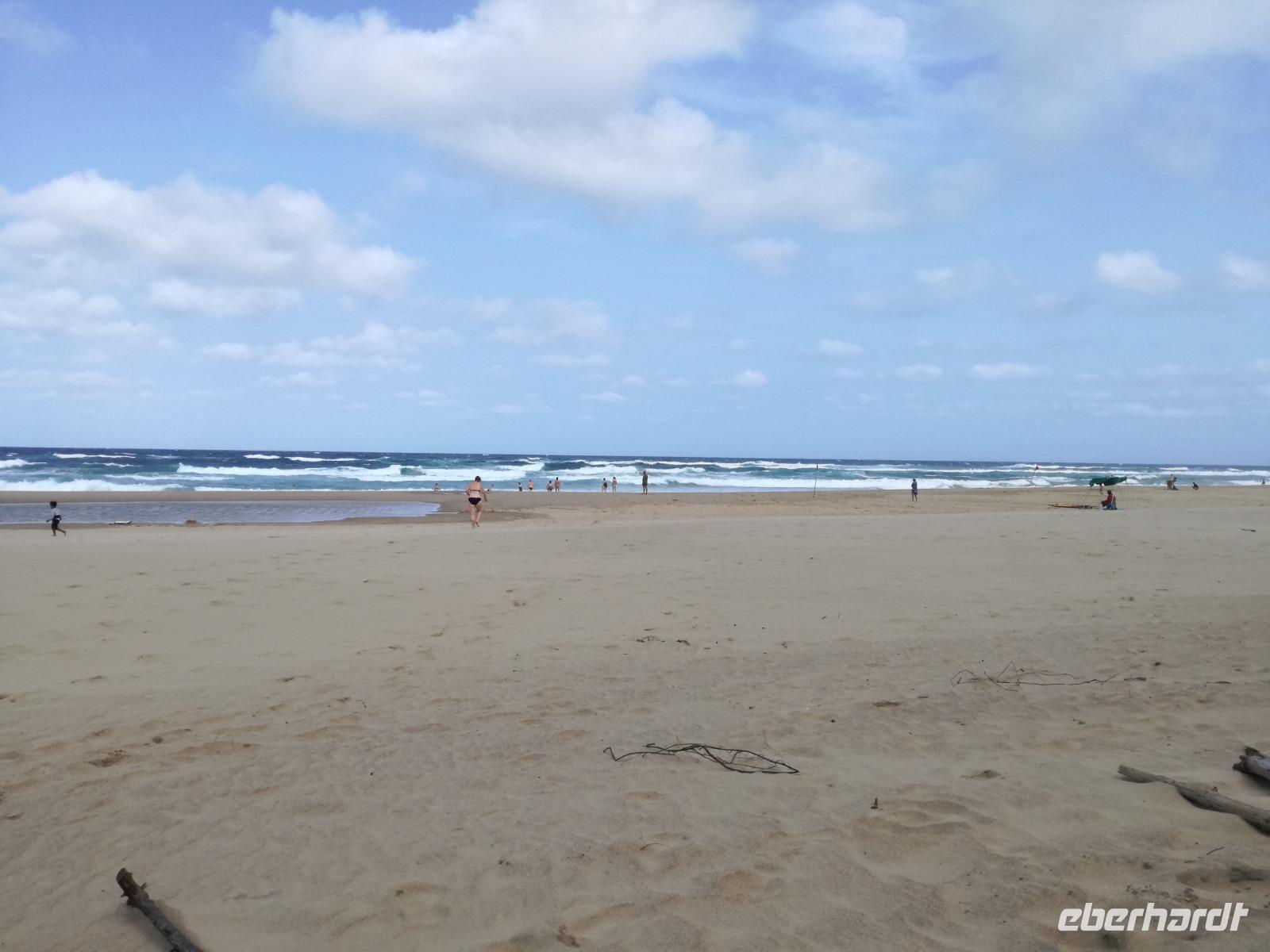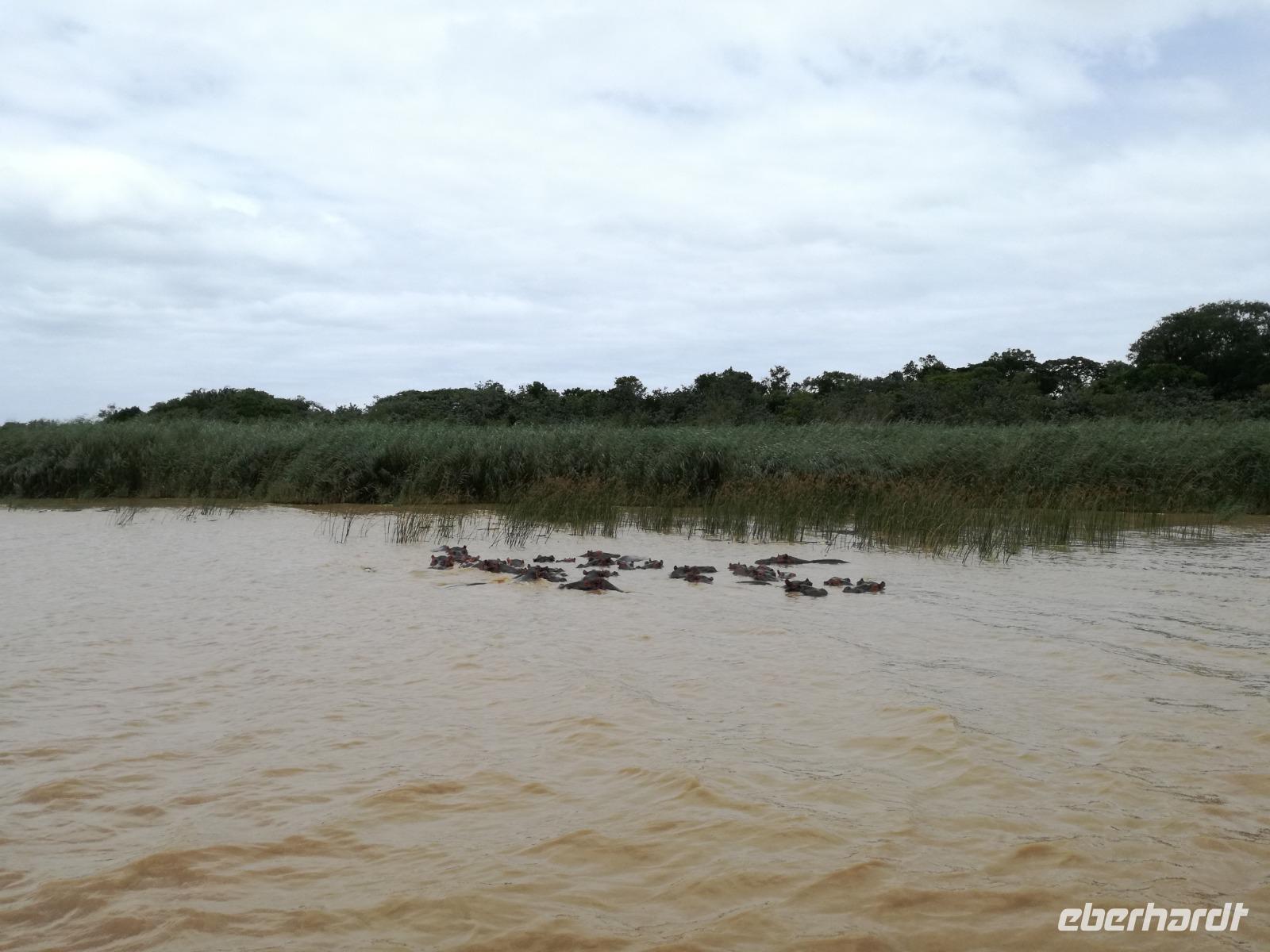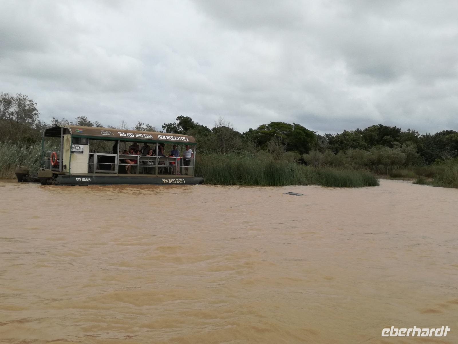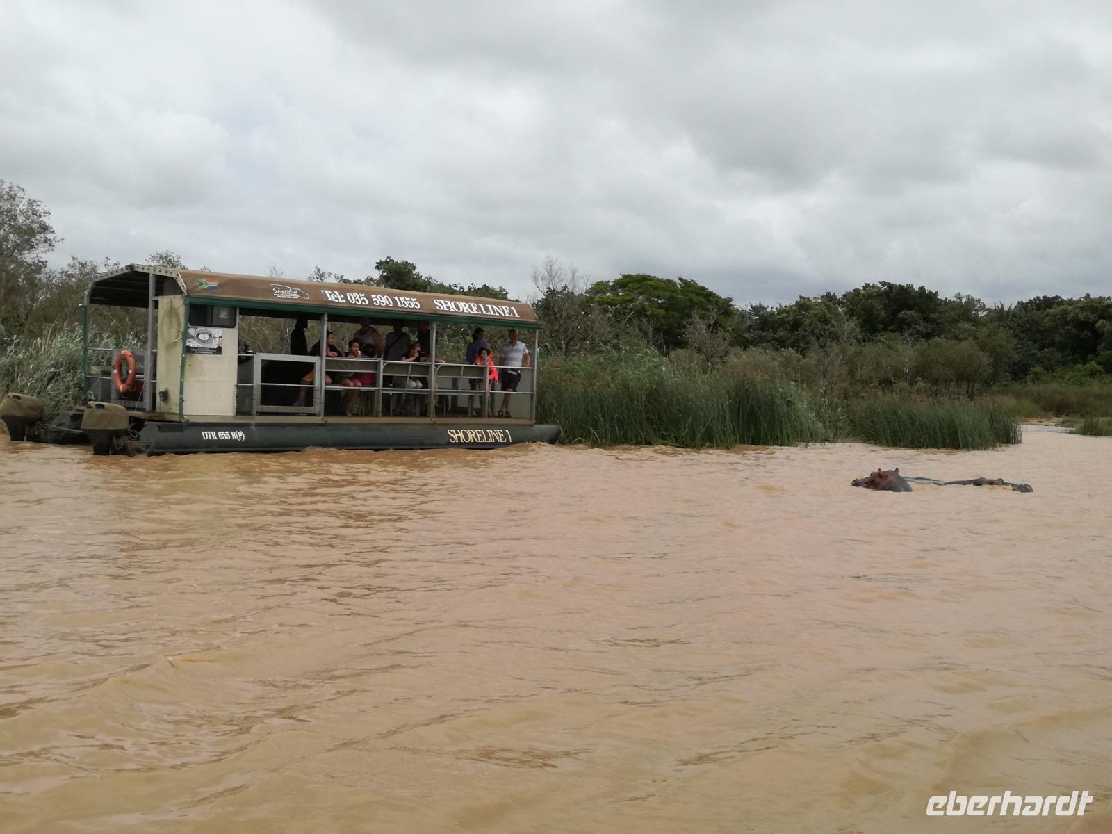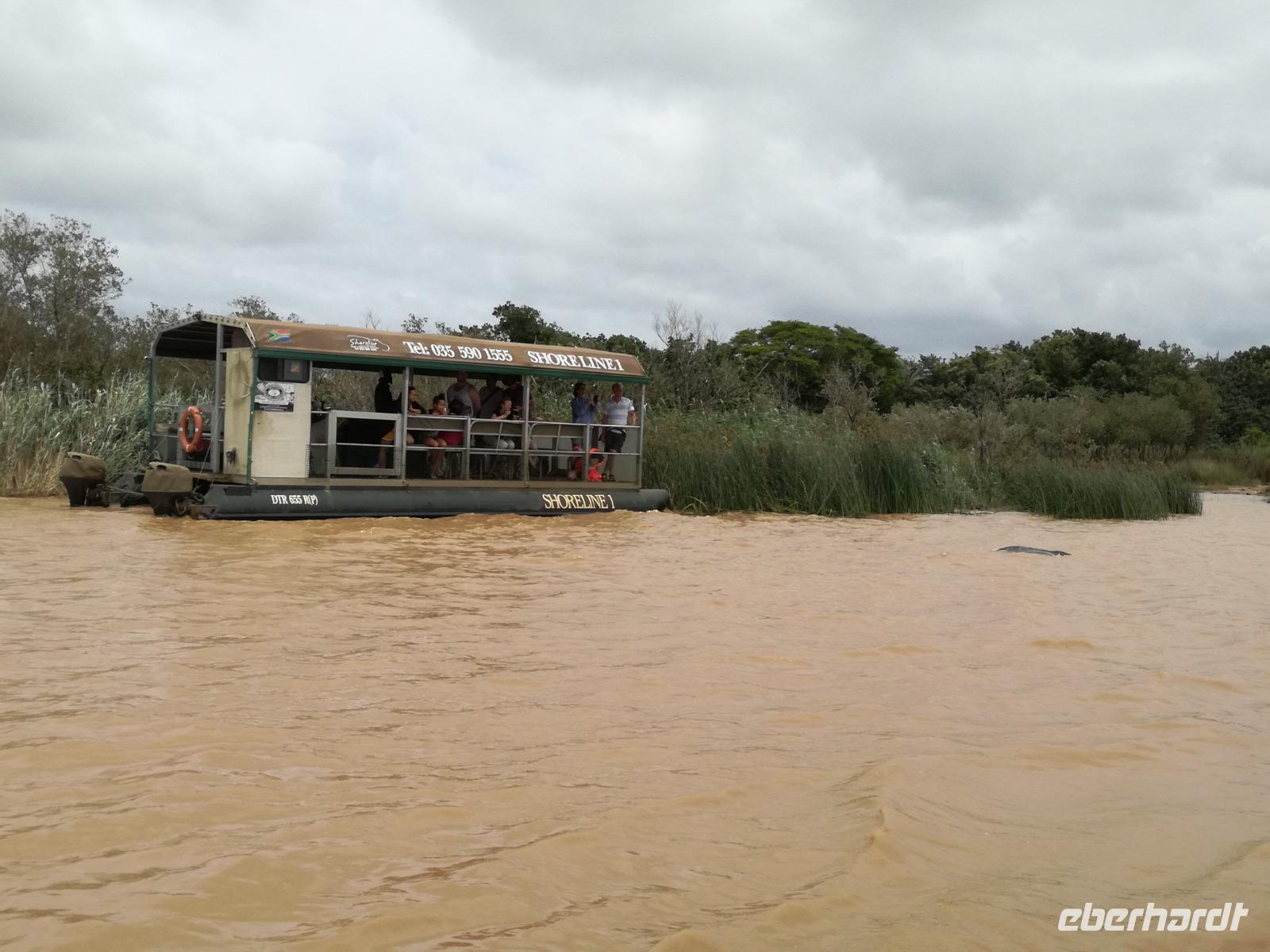Diesen Morgen konnten wir etwas länger schlafen und genossen das Frühstück in unserer romantischen Umgebung. Nach dem Frühstück brachen wir auf und spazierten bis zur Anlegestelle unseres Bootes. Unsere Bootstour sollte entlang eines Seitenarmes des St. Lucia Lakes gehen. Also shipperten wir los und bereits nach wenigen Minuten entdecken wir das erste Hippopotamus bzw. Nilpferd bzw. Flusspferd bzw. Hippo. Im weiteren Verlauf konnten wir noch weitere Gruppen von Hippos, Krokodile, Blauwangenspint, Gelbweber und auch einen Schreiseeadler. Nach gut 90 Minuten war eine wunderschöne Bootstour beendet und wir gingen zurück an Land. Hier gab es erstmal etwas Freizeit im schönen Touristenörtchen St. Lucia. Vielen nutzen die Zeit zum bummeln oder zum Essen. Wir testeten zum Beispiel frische Ananas am Stil aus der Region oder frischen Mangos an einem der vielen Straßenständen. Nach der Mittagspause fuhren wir dann zum Cape Vidal. Unsere Route führte uns durch den iSimangalisco Wetland Park. Unterwegs sehen wir weitere Tiere wie Warzenschweine, Zebras, Affen, Giraffe, Büffel oder Knus. Einen Foto-Stopp legen wir am Mfabeni Lookout ein. Sonet berichtet uns, dass der iSimangaliso Wetland Park im nördlichen KwaZulu-Natal liegt und nur über St. Lucia erreichbar ist. Der rund 40 Kilometer lange Lake St Lucia ist umgeben von Gras- und Buschland sowie Mangrovensümpfen. Angekommen am Cape Vidal heißt es auch schon relaxen am Strand oder schwimmen im Meer. Allerdings spielte das Wetter nicht sonderlich mit, da es sehr windig war. Aber wir ließen unseren Strandtag nicht vermiesen. Einige Gäste schwimmen im Meer, was nur im Bereich der roten Fahnen erlaubt ist. Ein Rettungsschwimmerteam für den Notfall ist ebenfalls anwesend. Andere hingegen spazieren am Strand entlang oder genossen die steife Brise am Strand. Am Abend ließen wir bei einem optionalen Abendessen den Tag bei frischem Fisch und Seafood im örtlichen Restaurant Ocean Basket ausklingen.